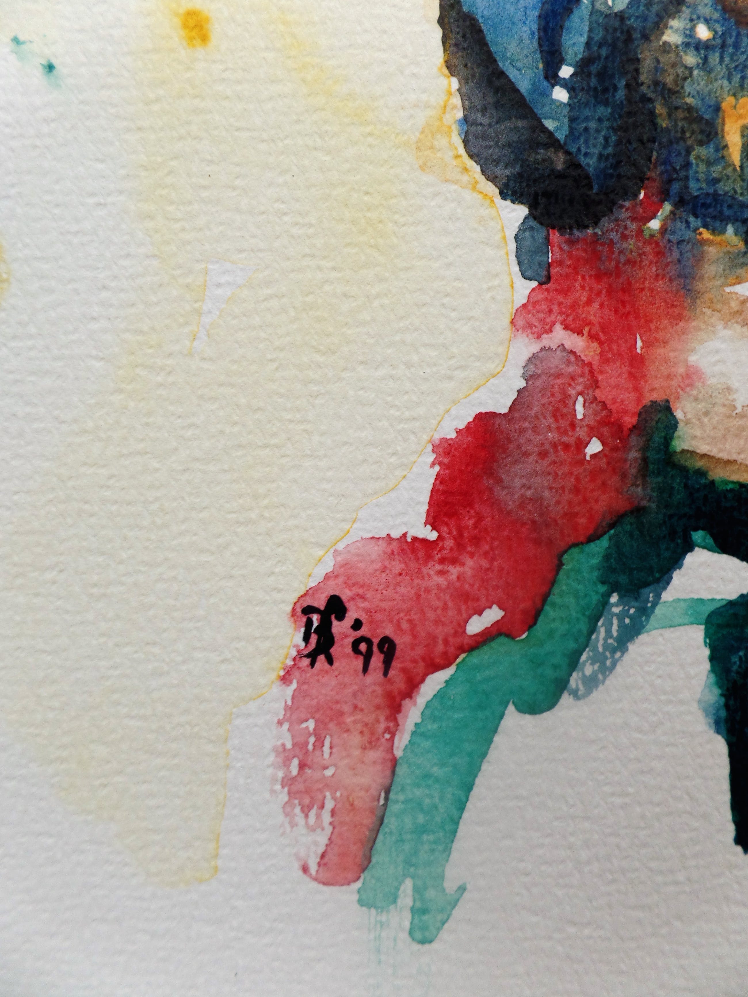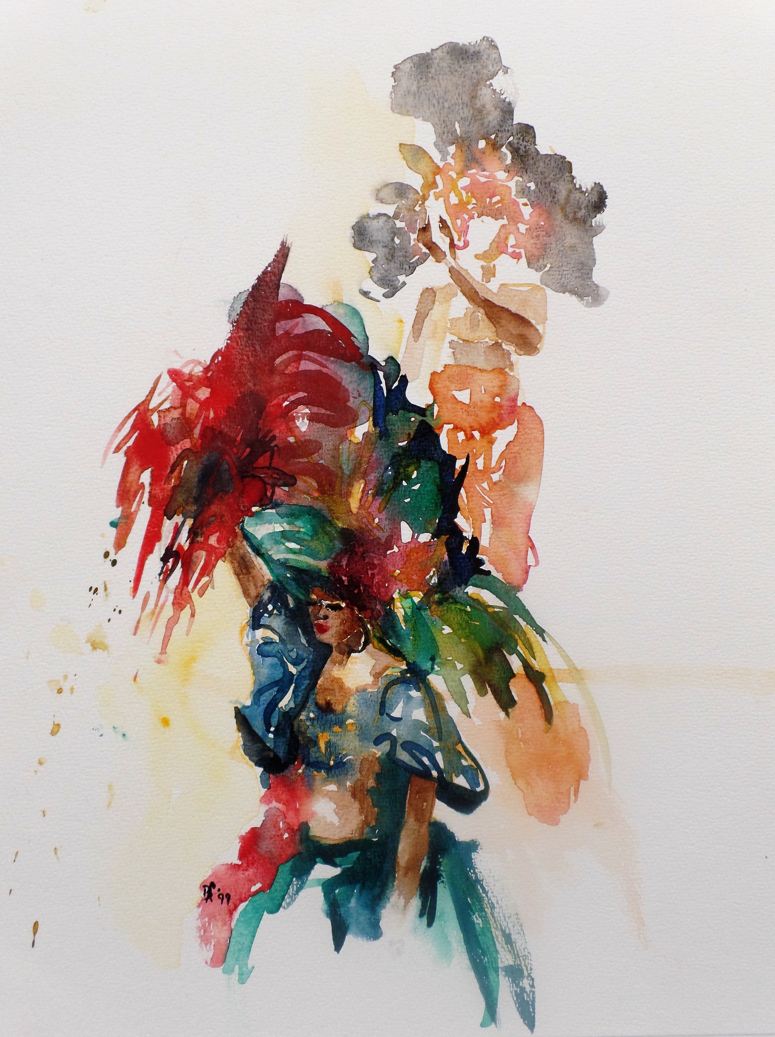 Mooi kleurrijk werk van een carnaval vierende dame.Monogram LB'99 ( Leida Blom )