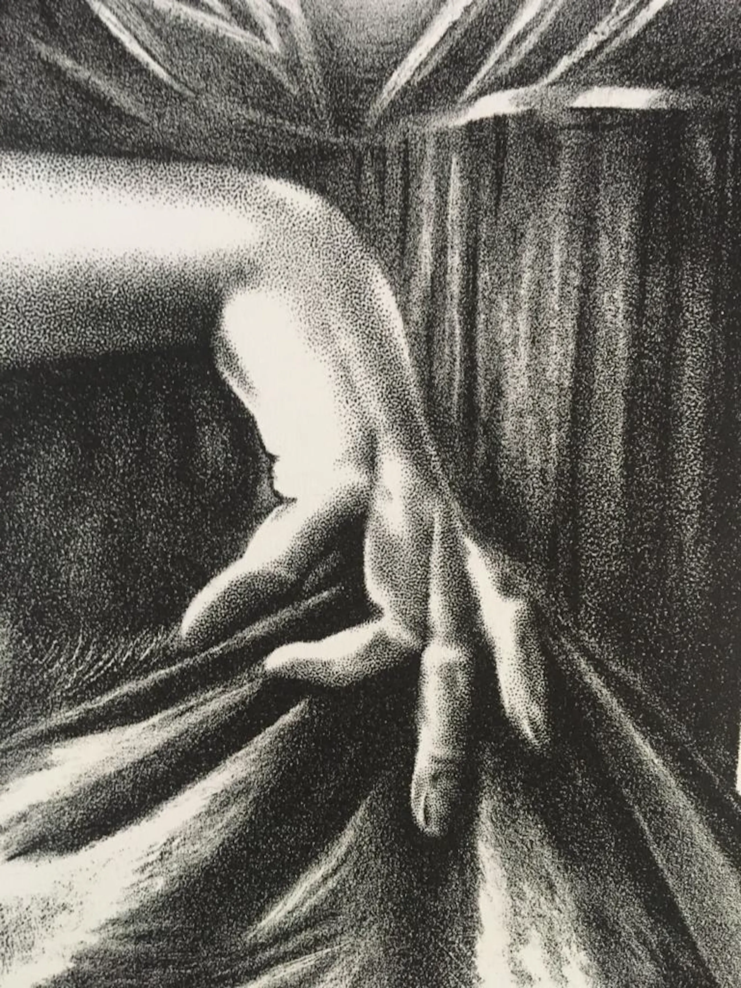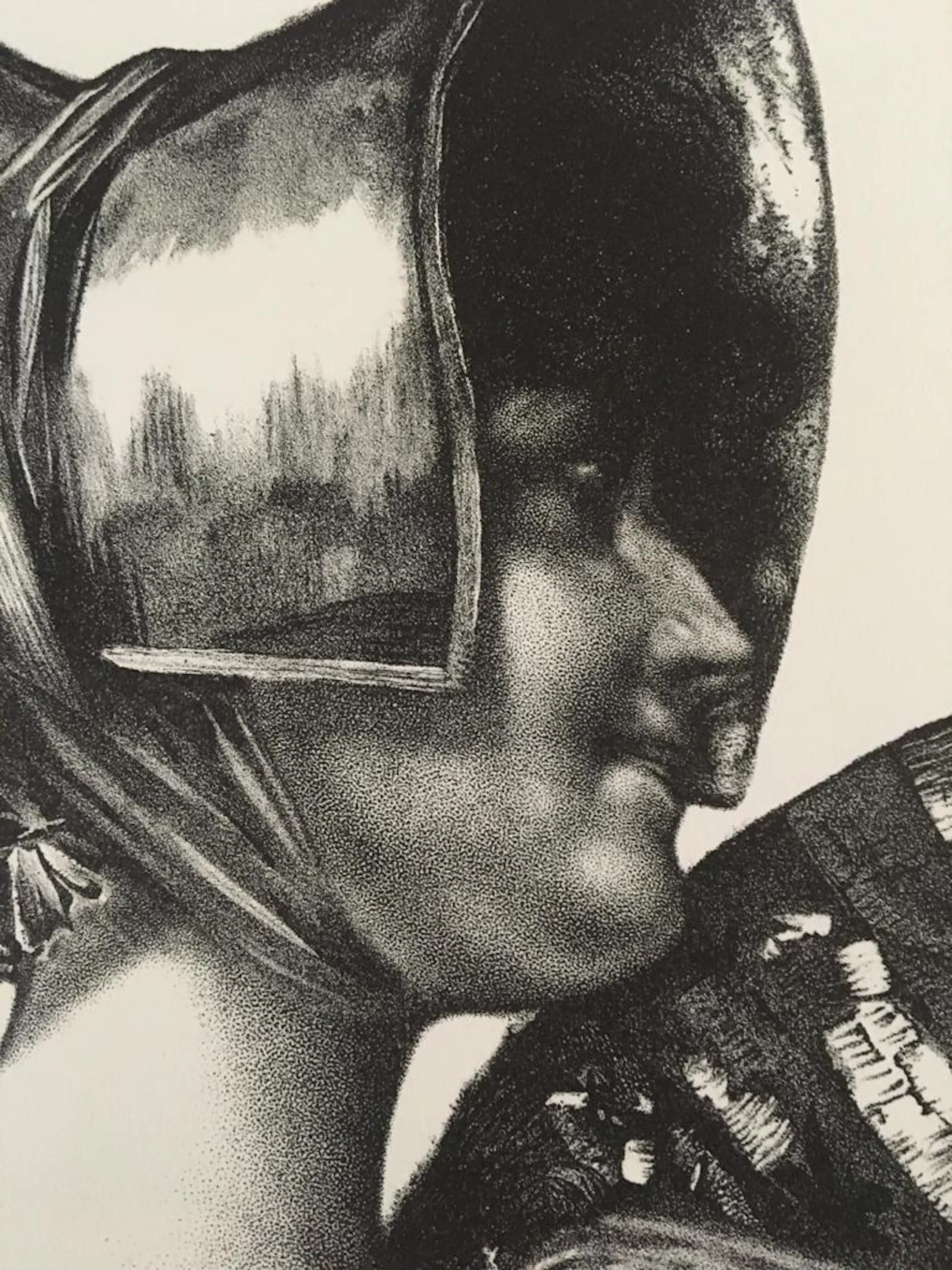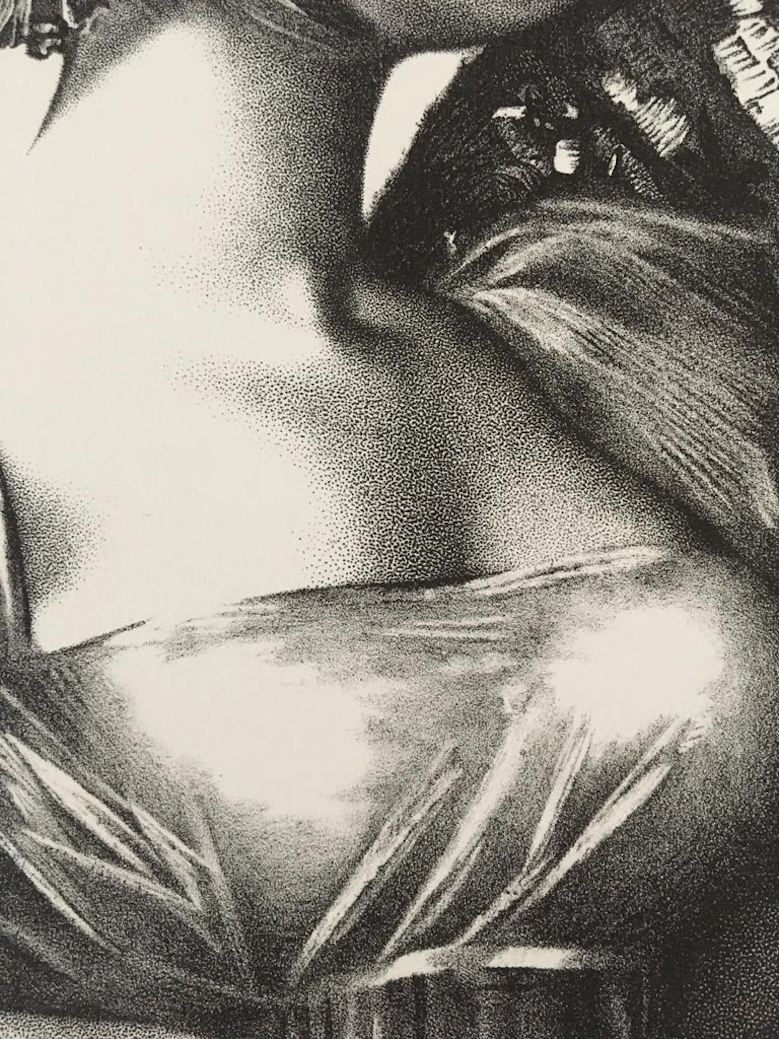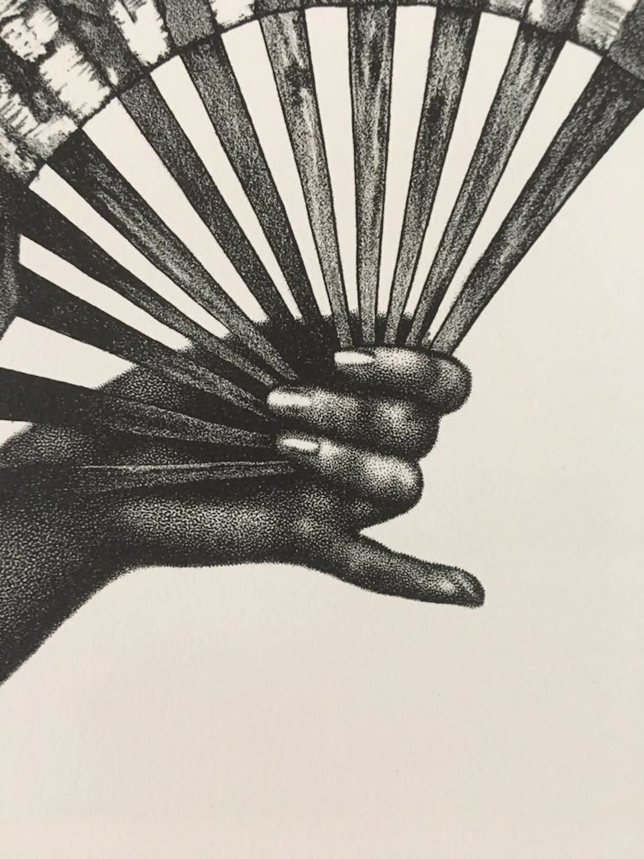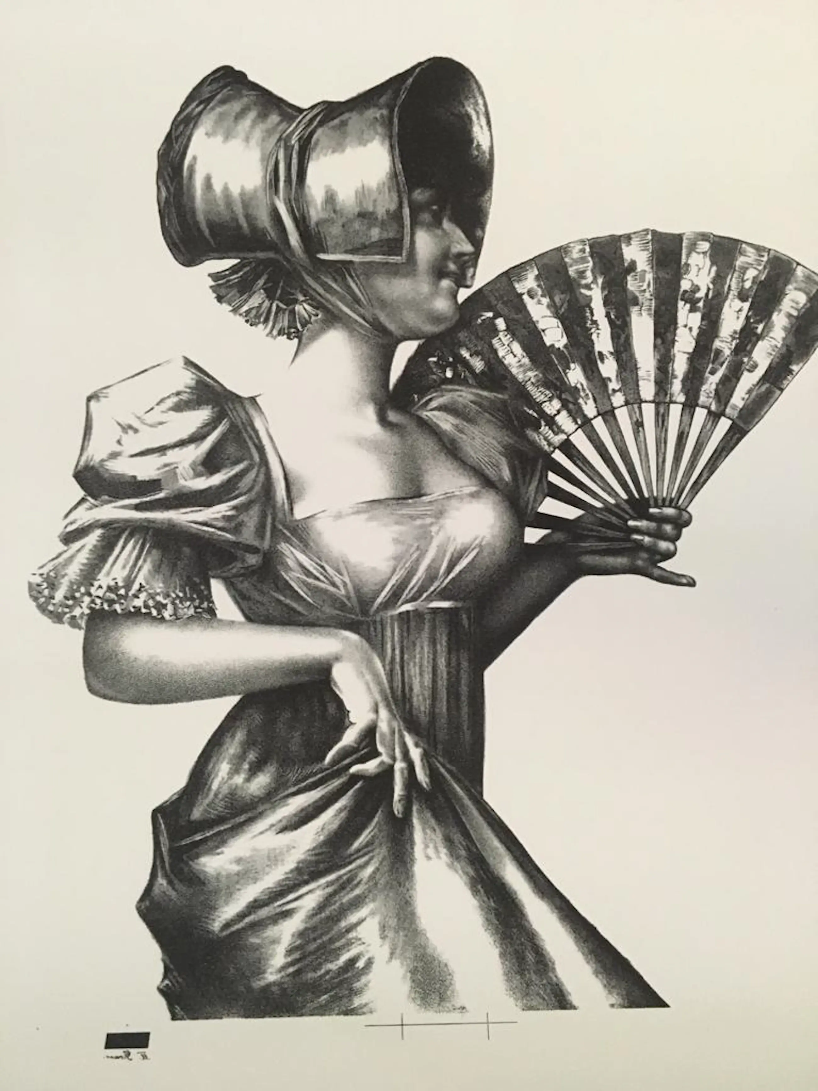 Op handgeschept papier gedrukte litho, voorstellende een charmante dame met waaier. In spiegelbeeld is links onder de tekst 'II Graces' (II Gratiën) te zien, wellicht verwijzend naar de boezem van de vrouw. Wie deze aansprekende litho heeft gemaakt danwel gedrukt, is niet bekend. Gezien de geschatte leeftijd van het papier betreft het vermoedelijk een uit het begin van deze eeuw stammende interpretatie van een klassieke voorstelling.