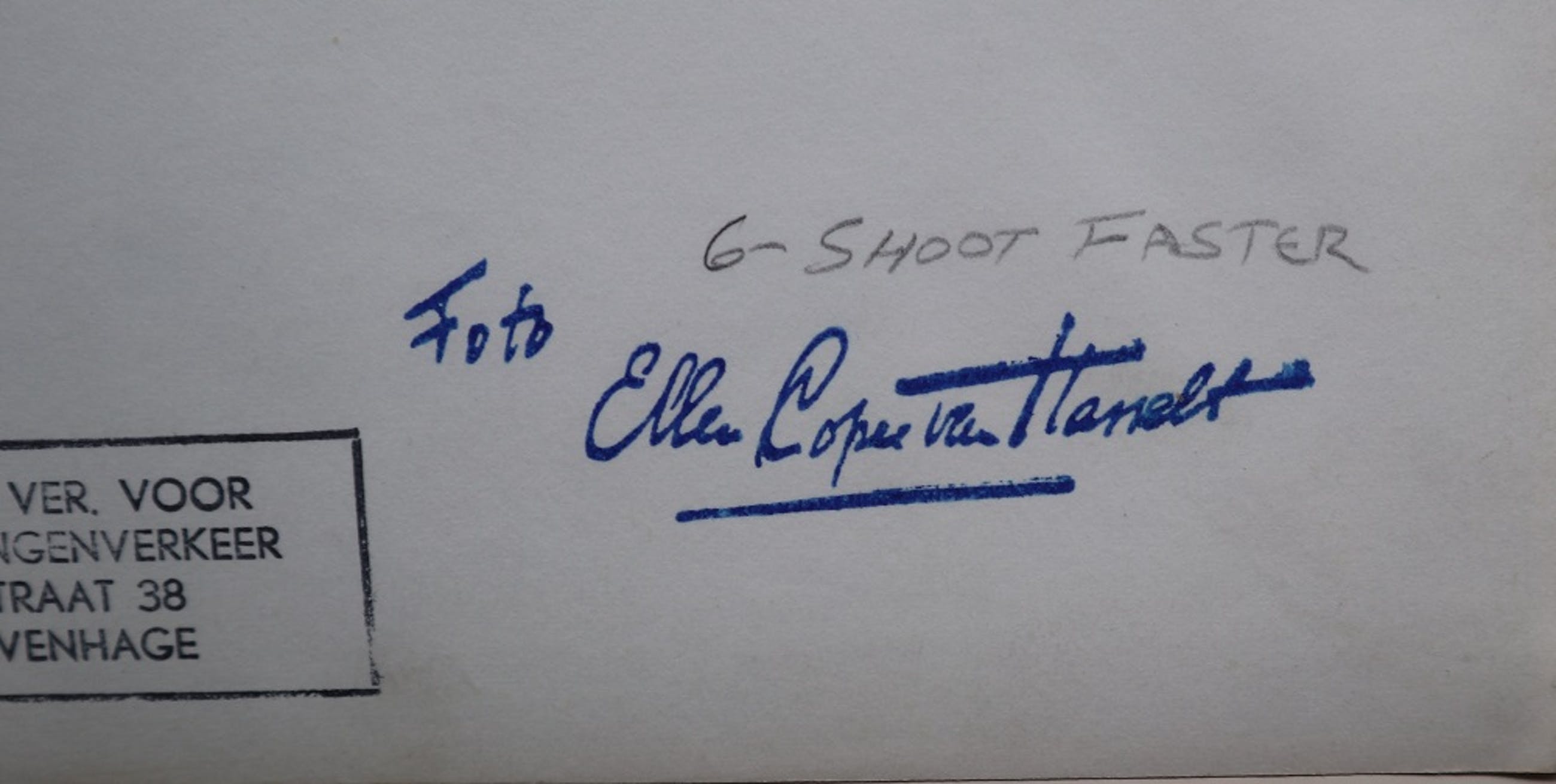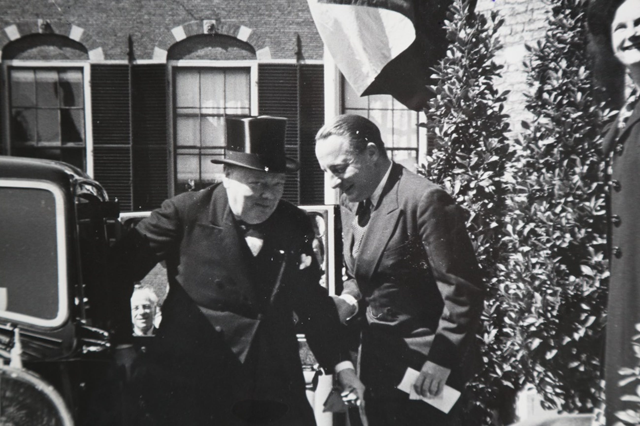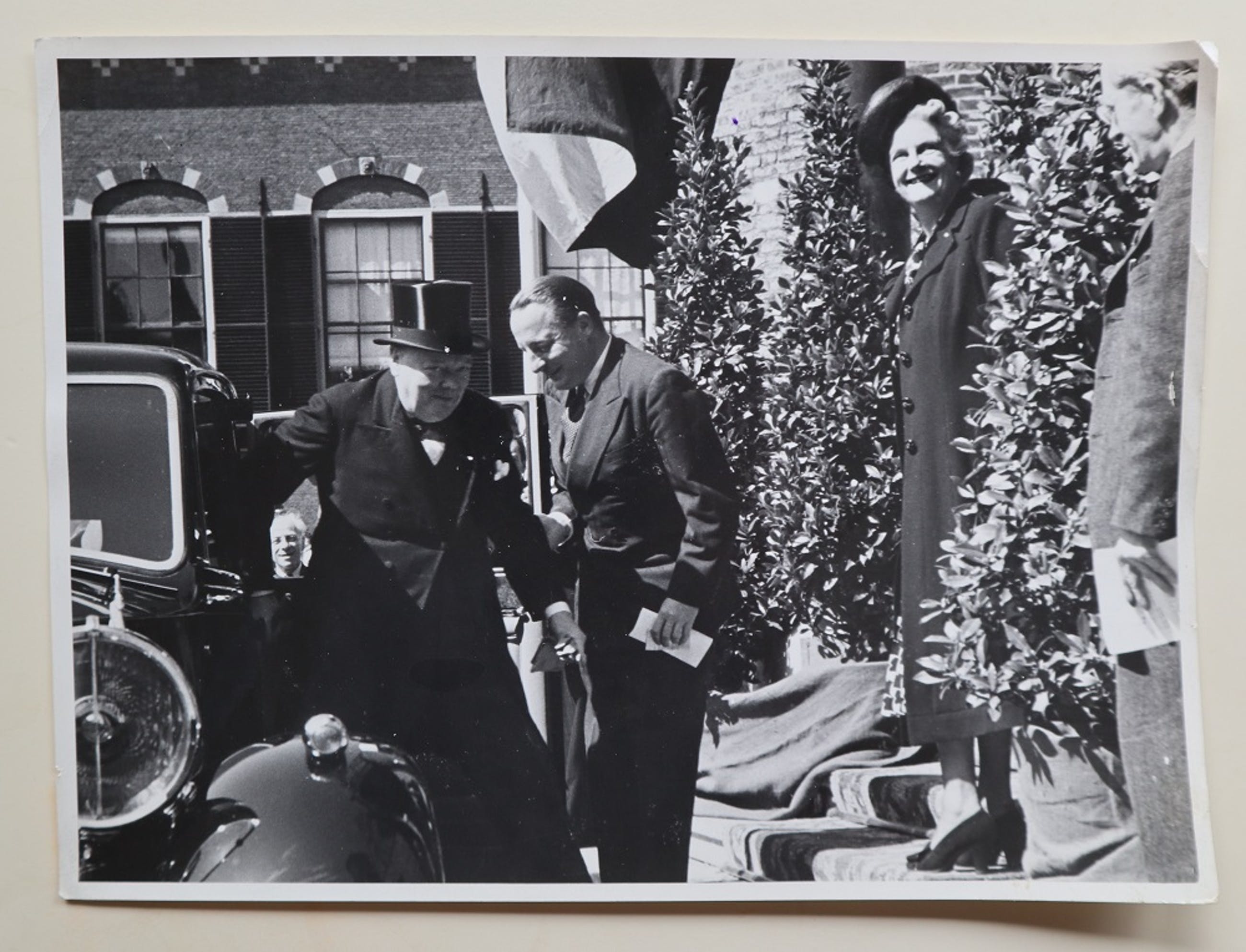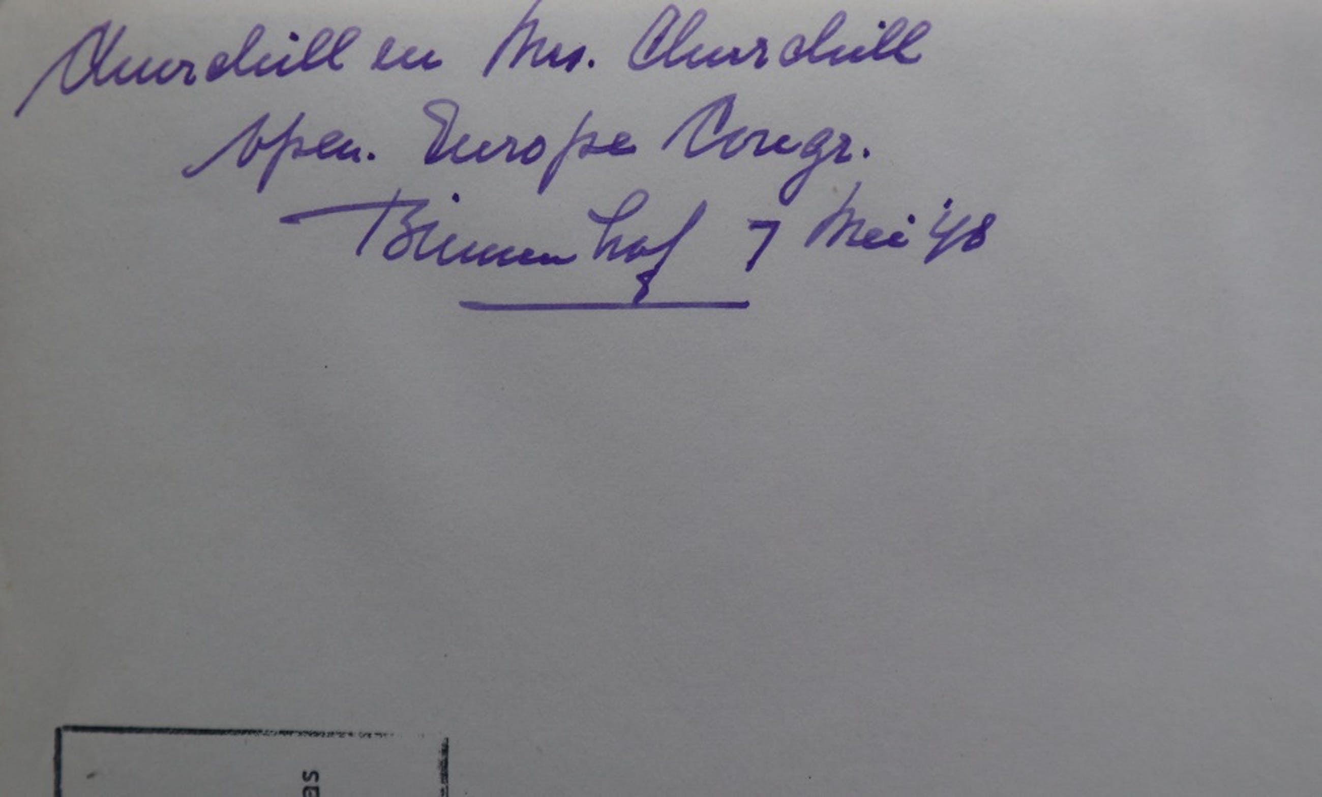 Deze bijzondere foto van Winston Churchill en zijn vrouw die een Europees congres in Den Haag bezoeken is gemaakt door Ellen Lopez van Hasselt. Aan de achterzijde gesigneerd.