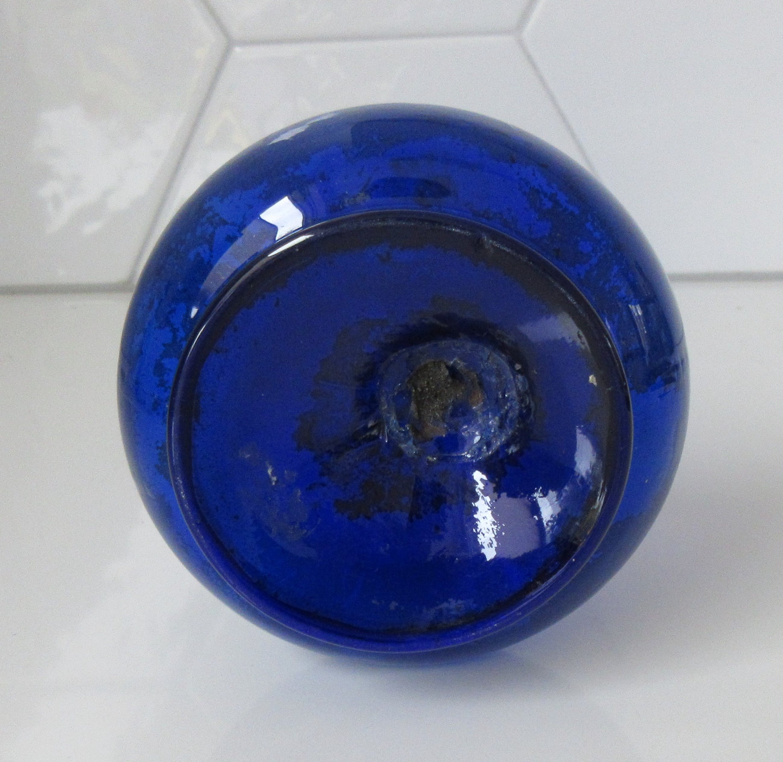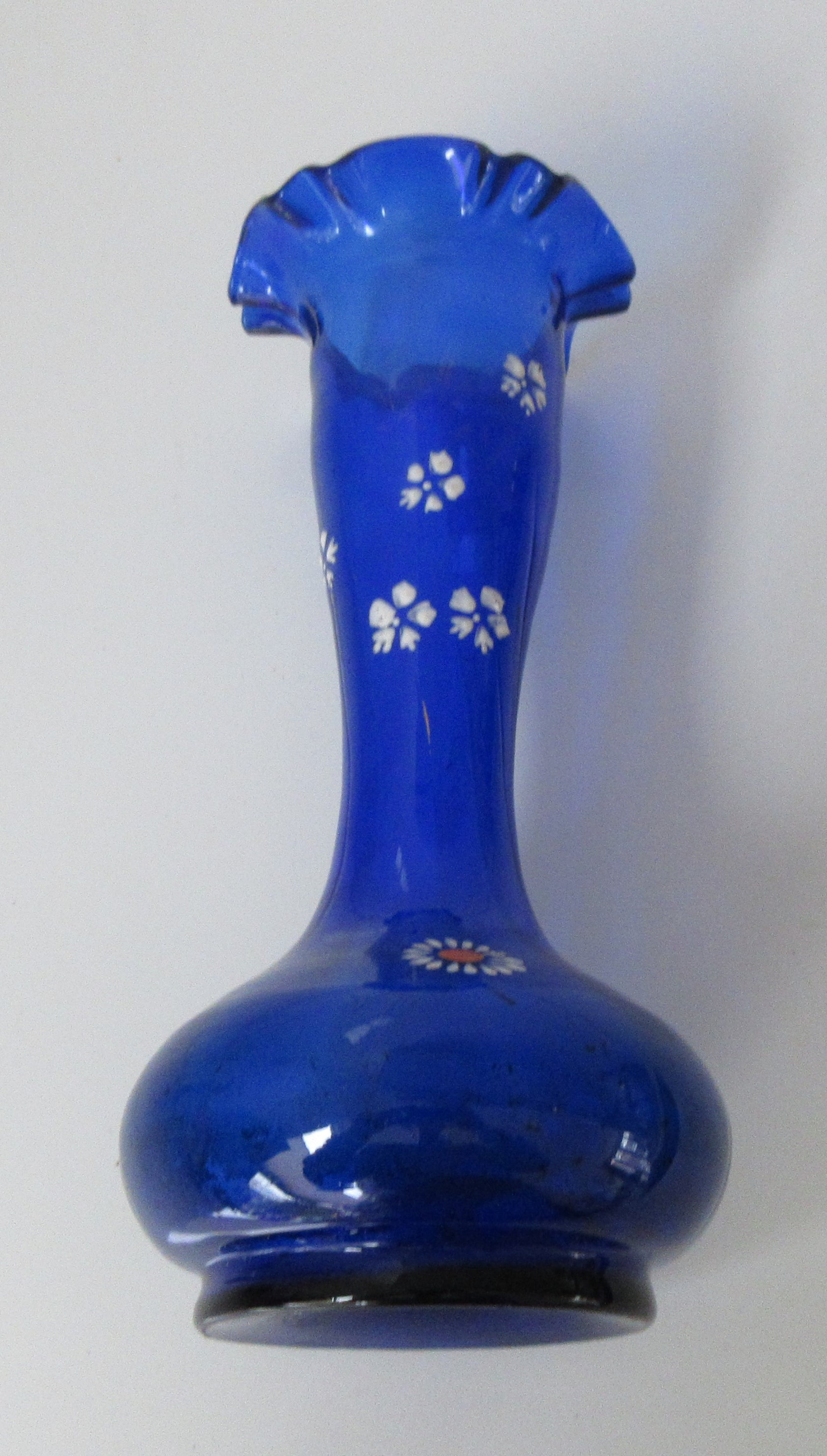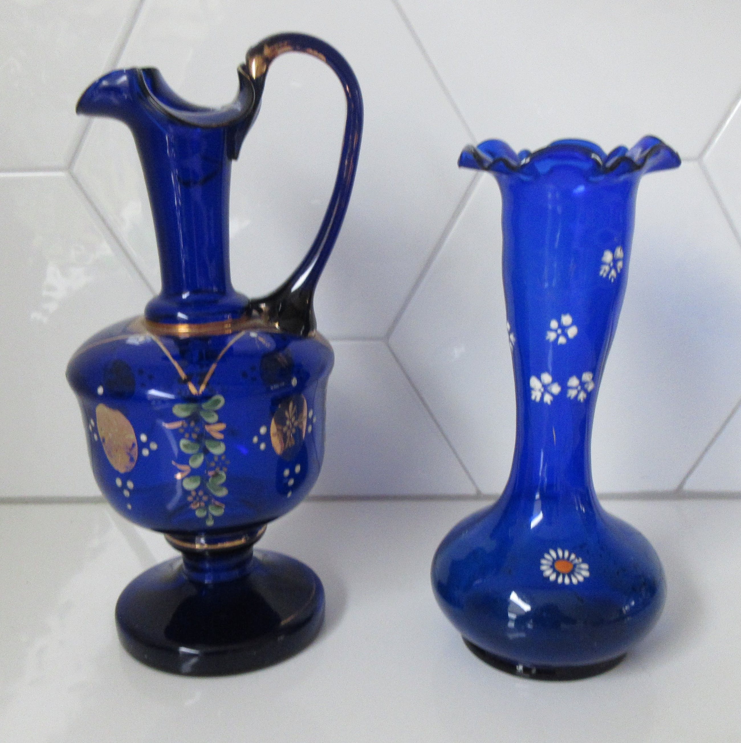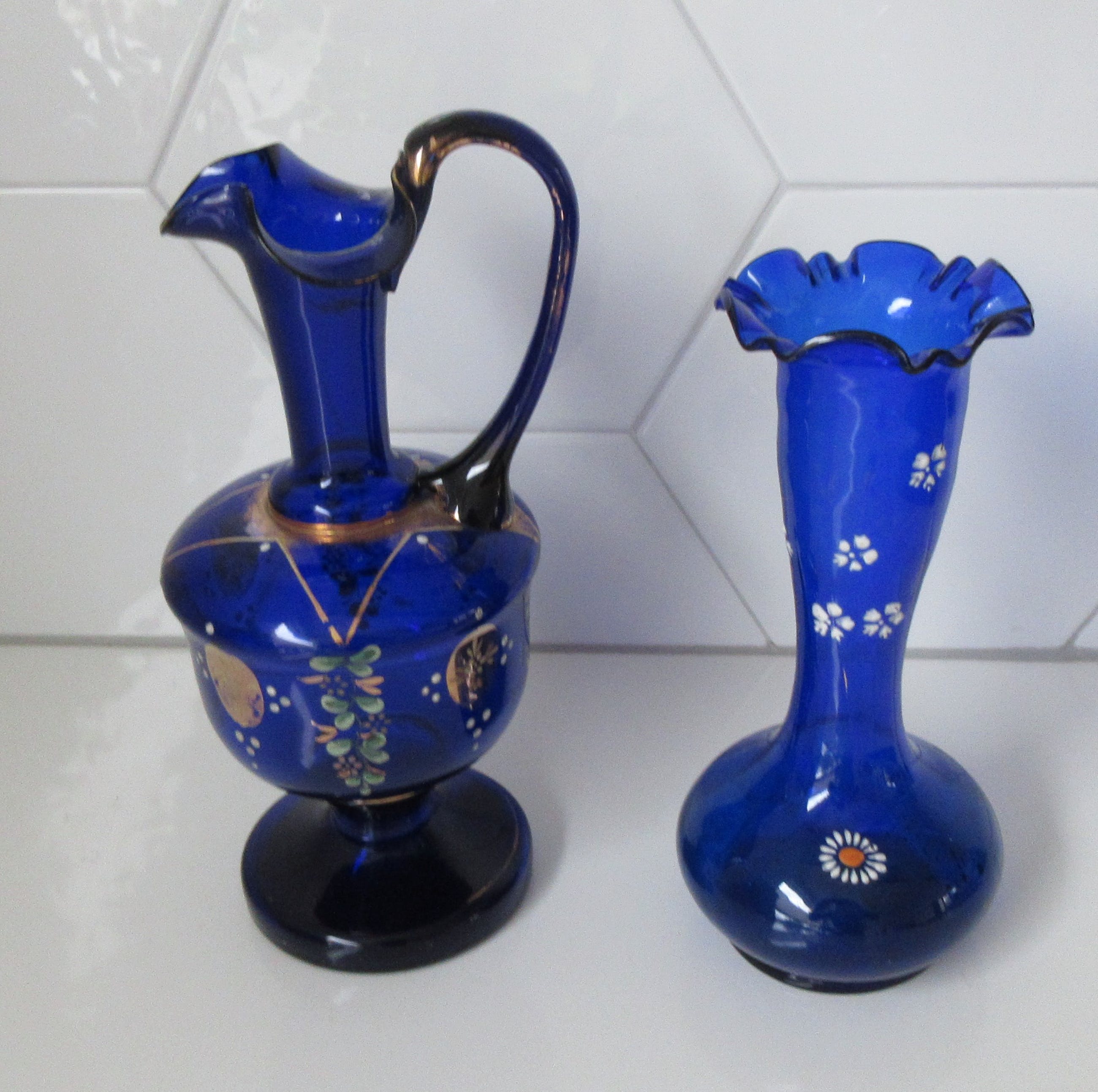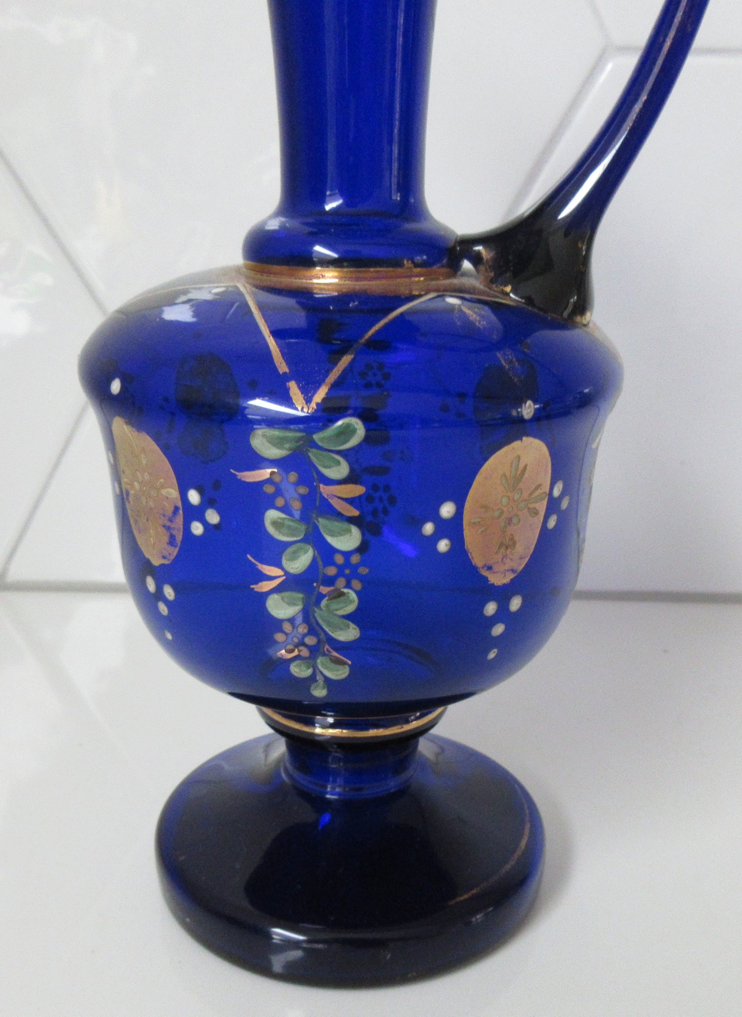 Cobalt blauwe Boheems glazen kan en vaas met handbeschilderde florale decoratie en vergulde onderdelen bij de kan. In goede gebruikte conditie. De kan heeft een chipje bovenop de rand. Beide niet gemerkt maar wel voorzien van een ruw pontilmerk op de bodem.