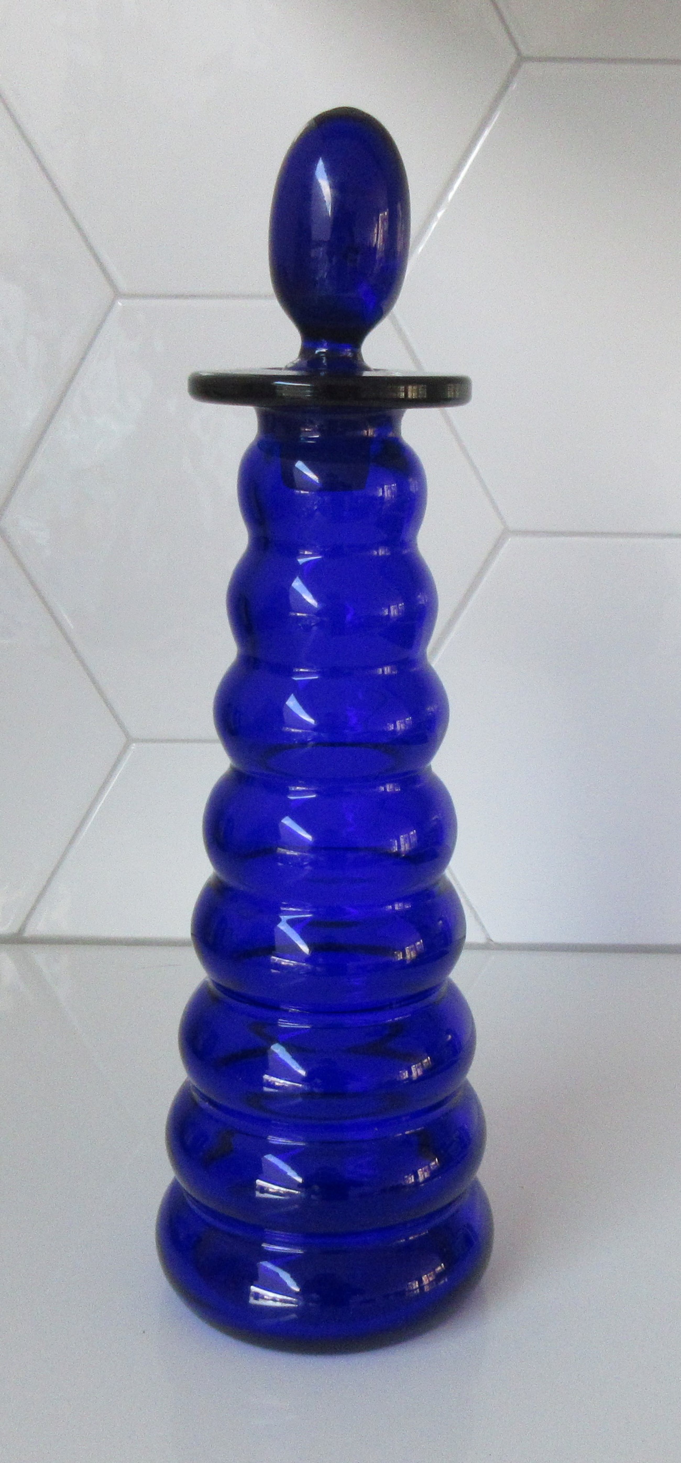 Erg mooie blauwe en turqoise glazen design karaf waarschijnlijk van Scandinavische origine. Helaas niet gemerkt, dus ontwerper en maker onbekend. In prima onbeschadigde conditie.