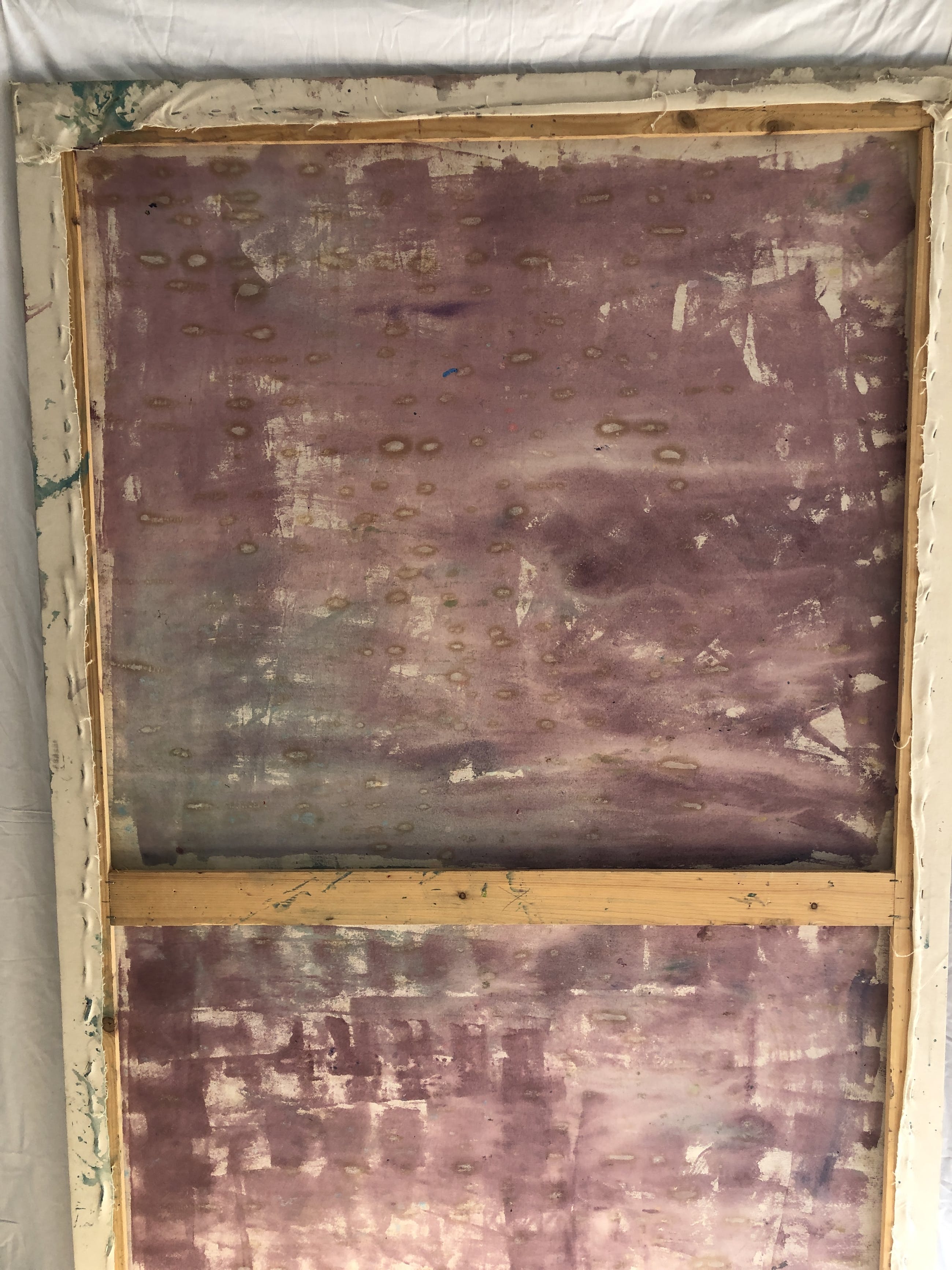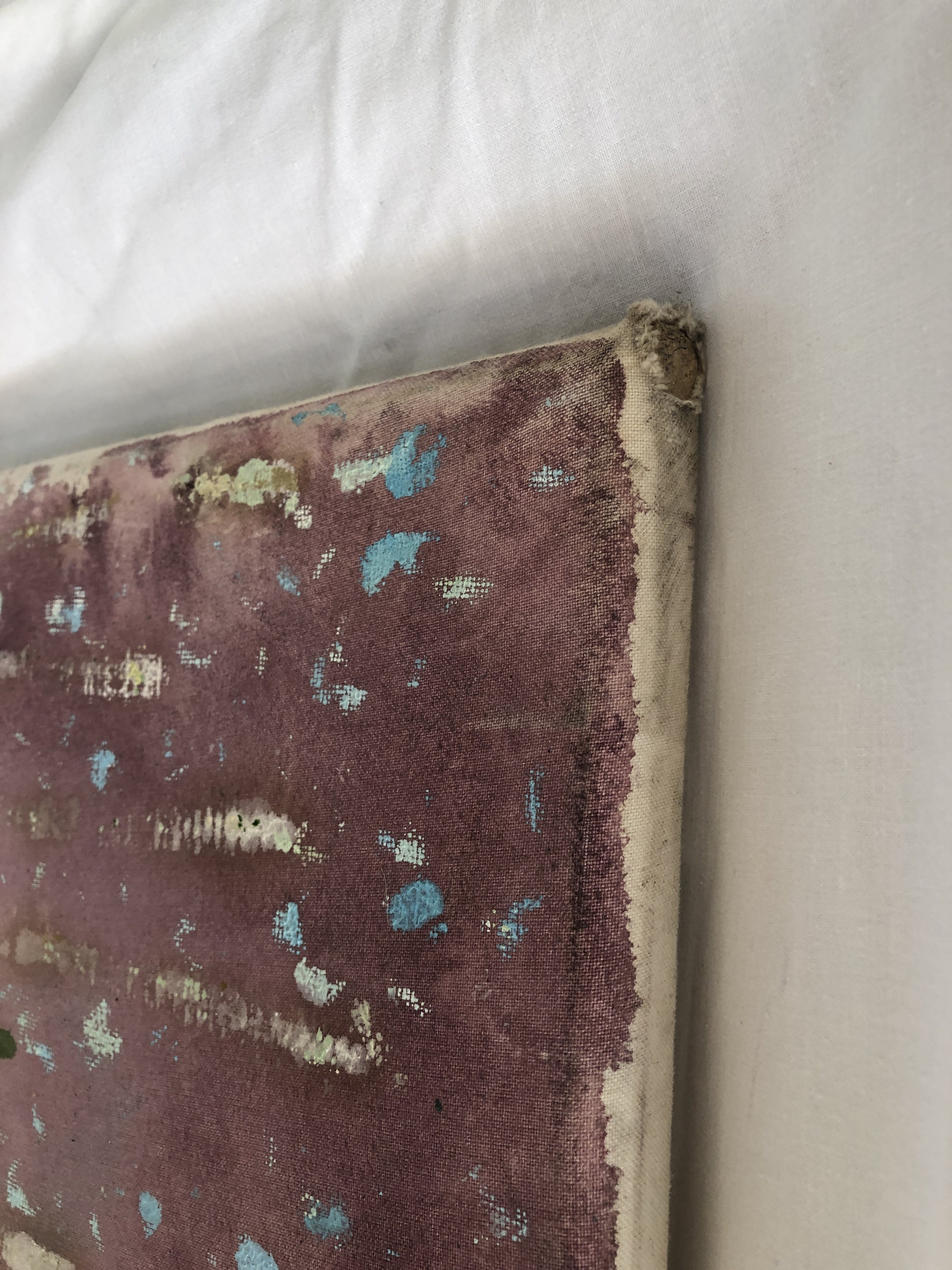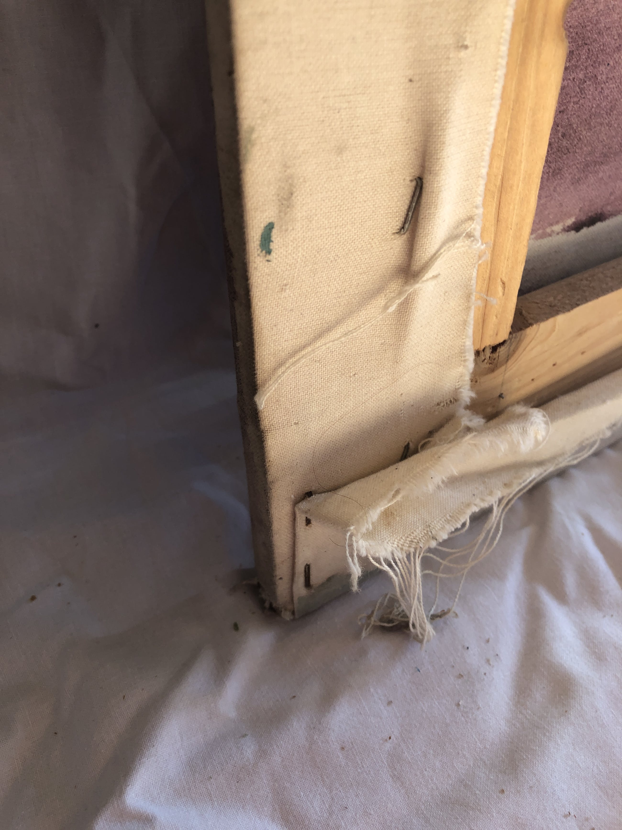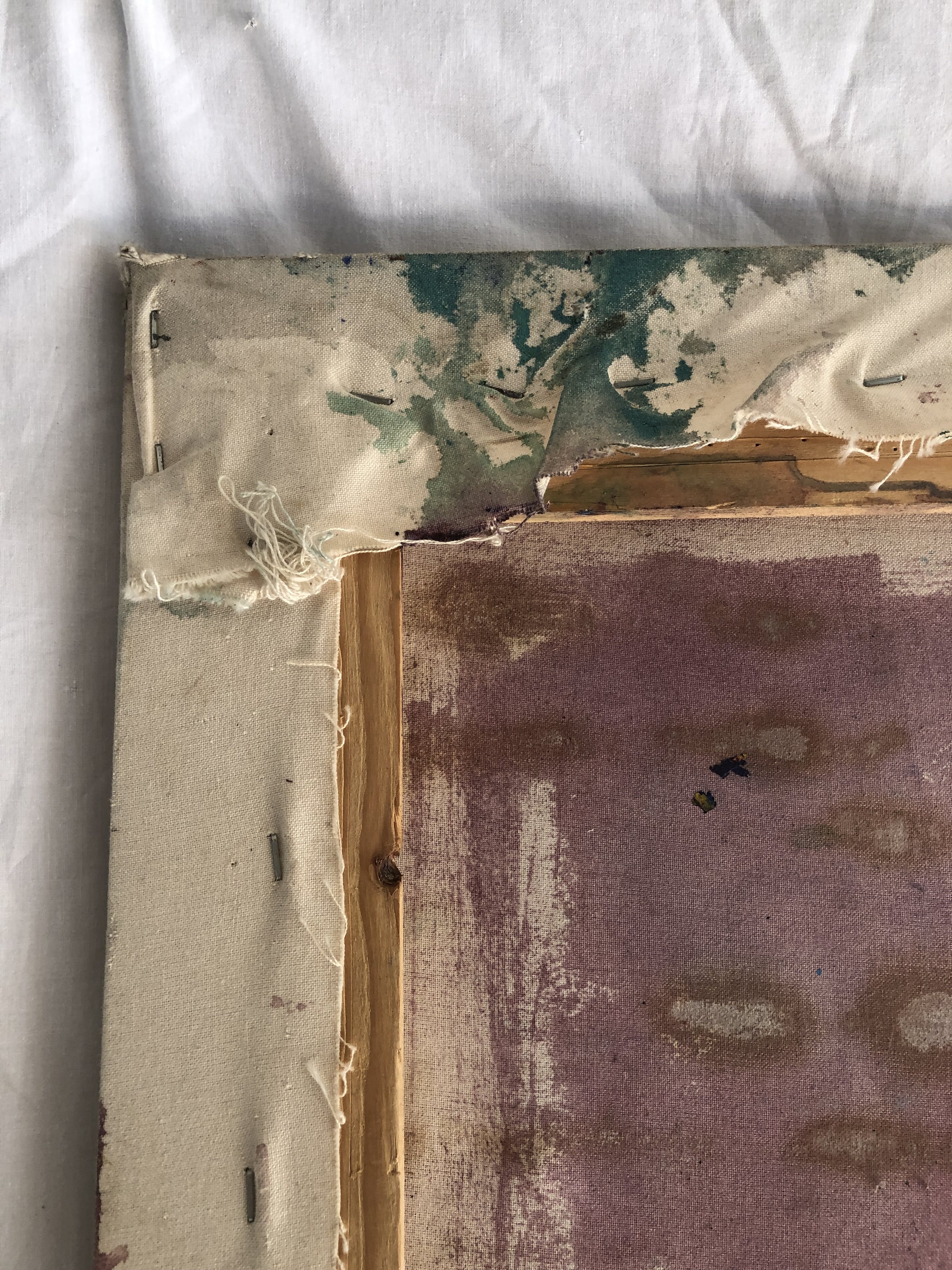 Het doek is op de hoeken beschadigd, waarschijnlijk door het op de vloer staan.