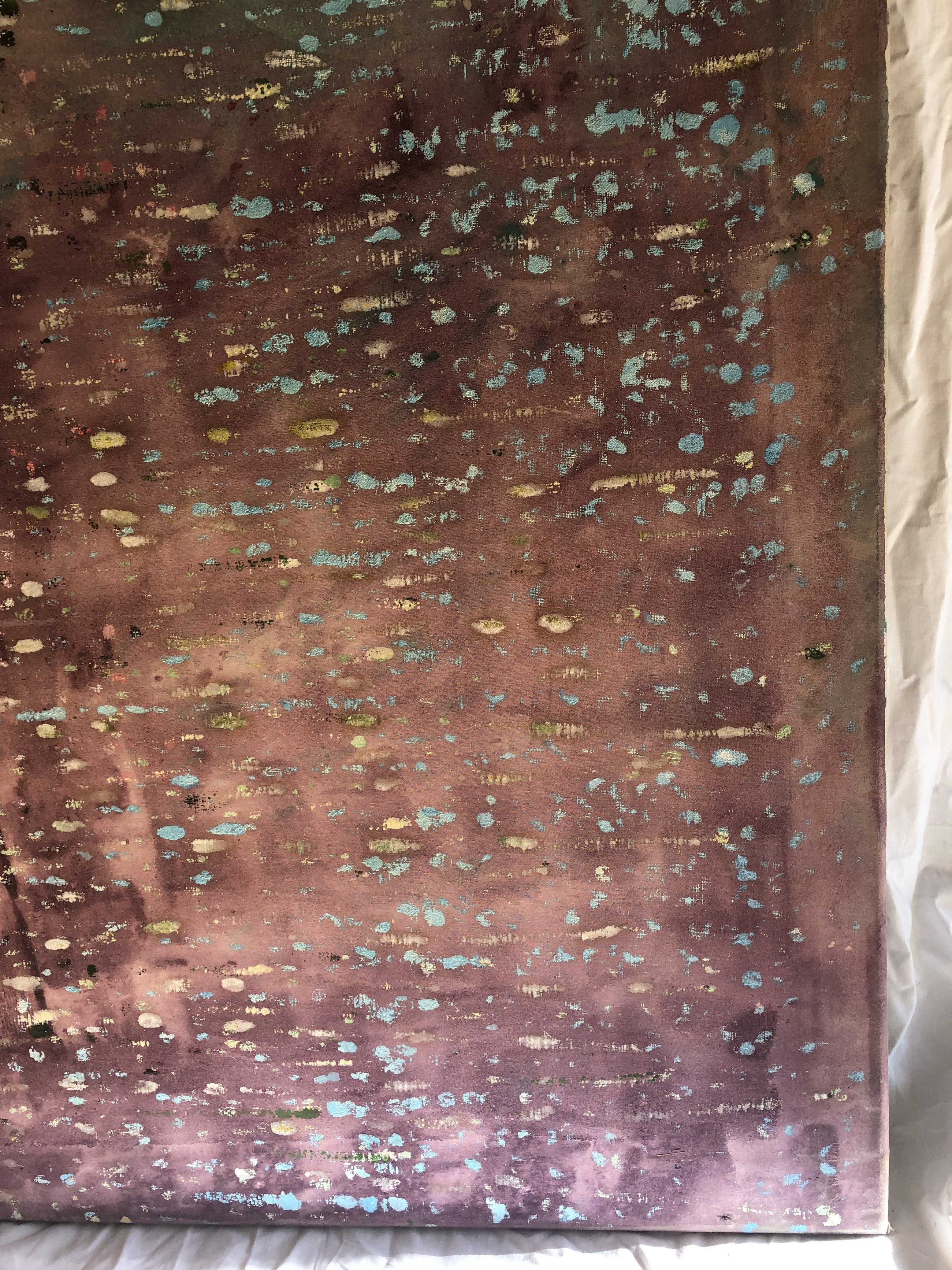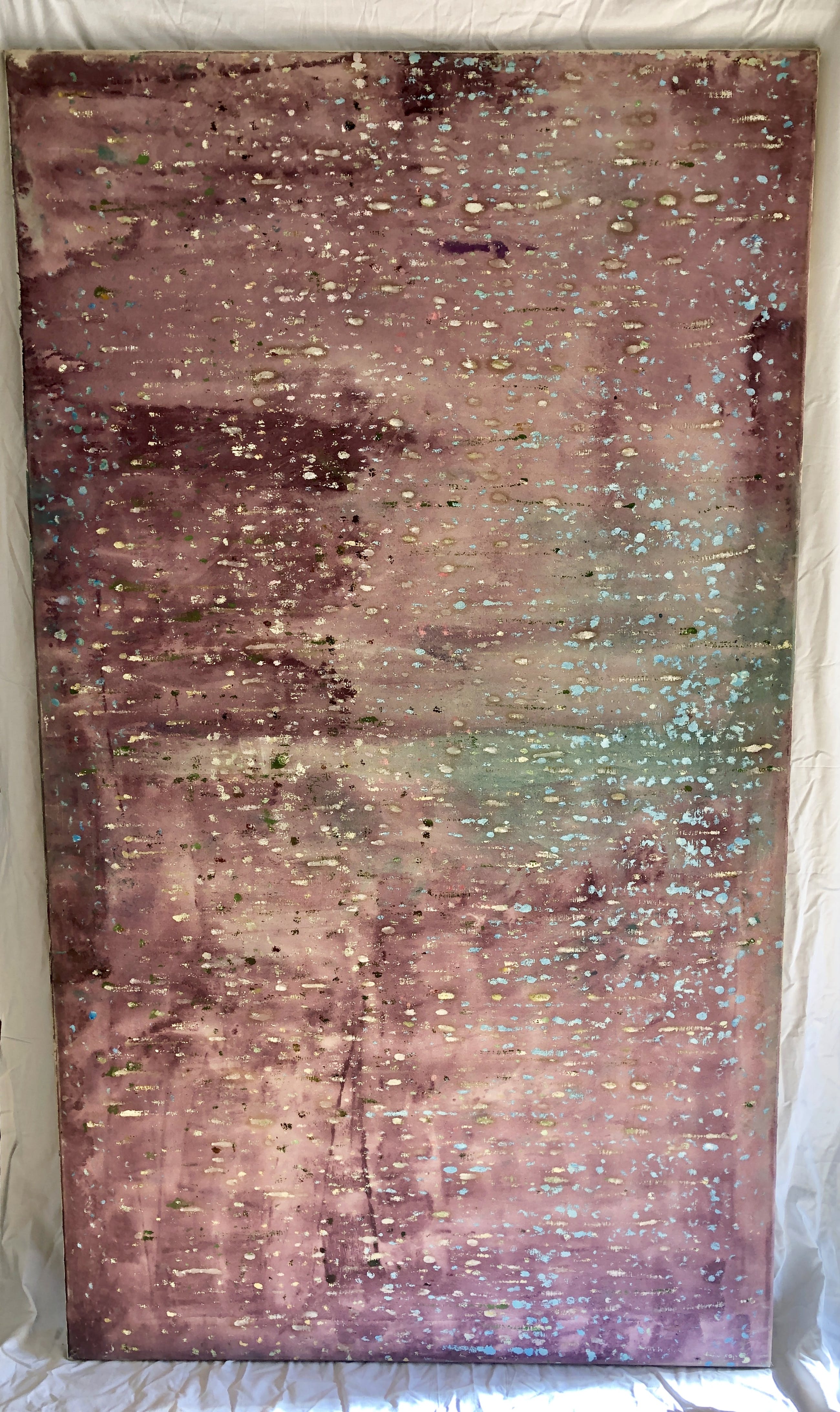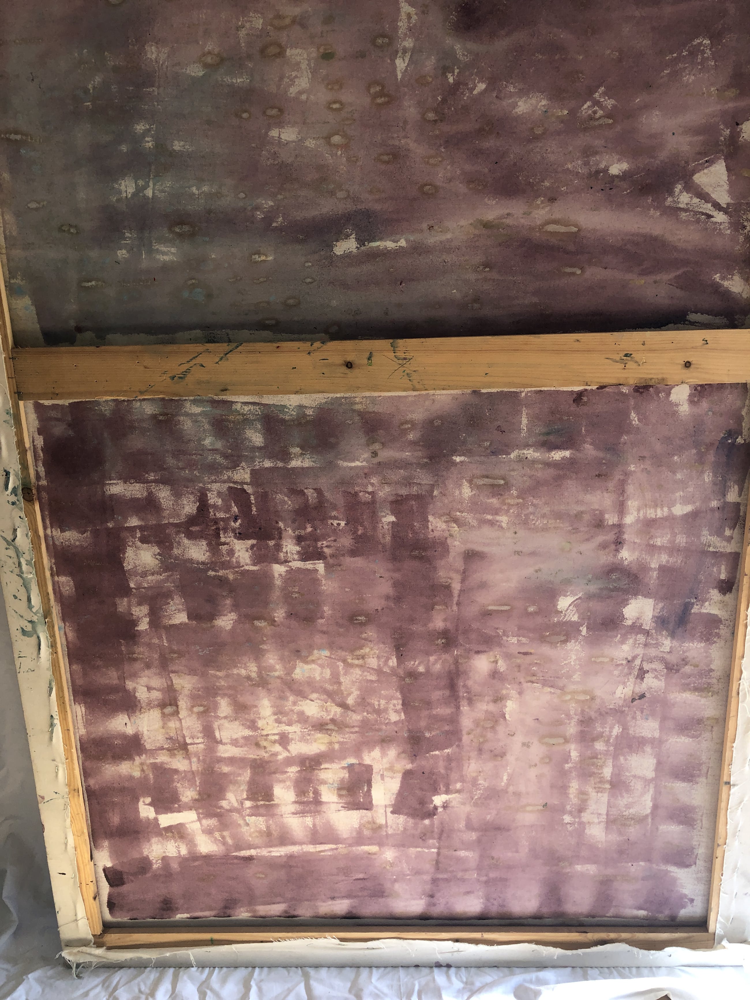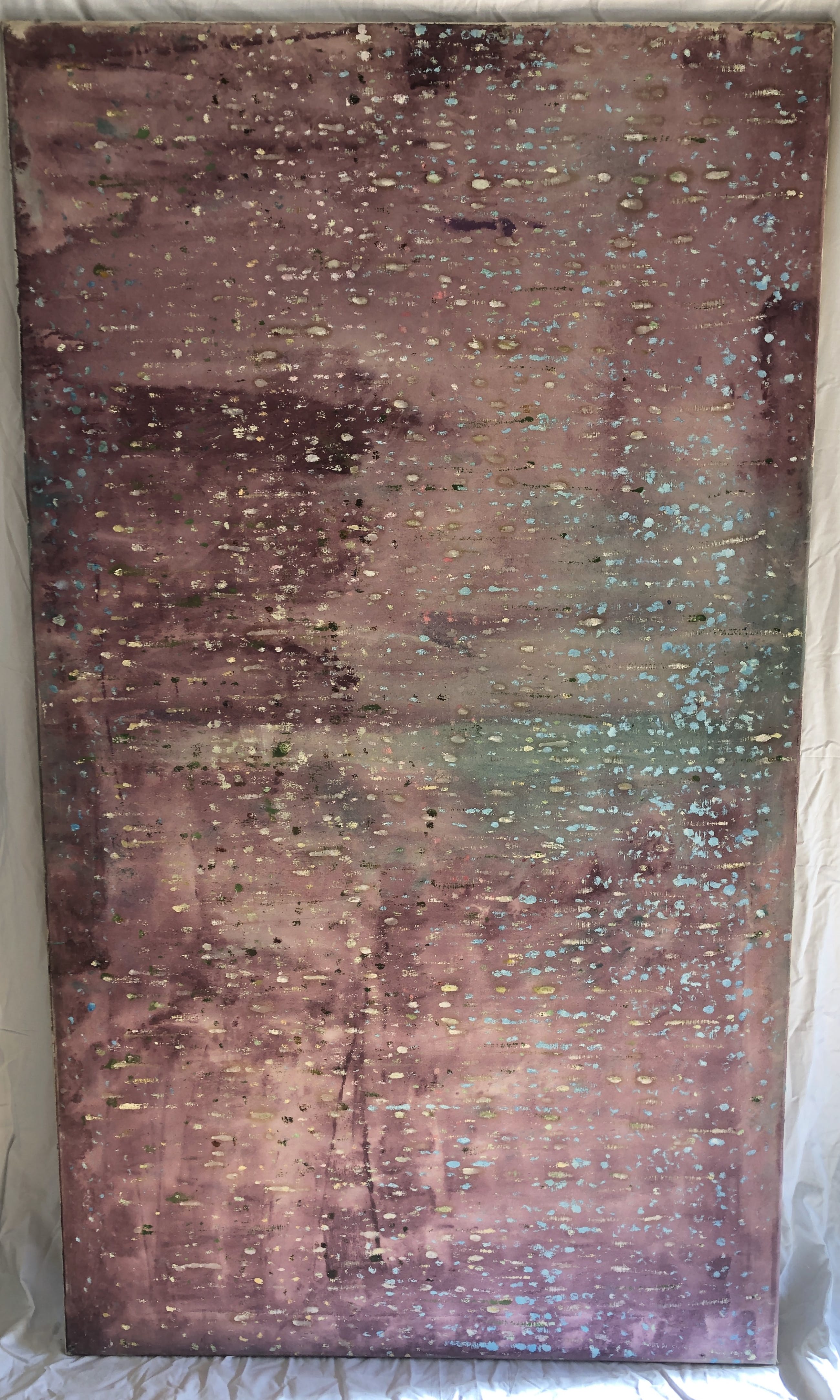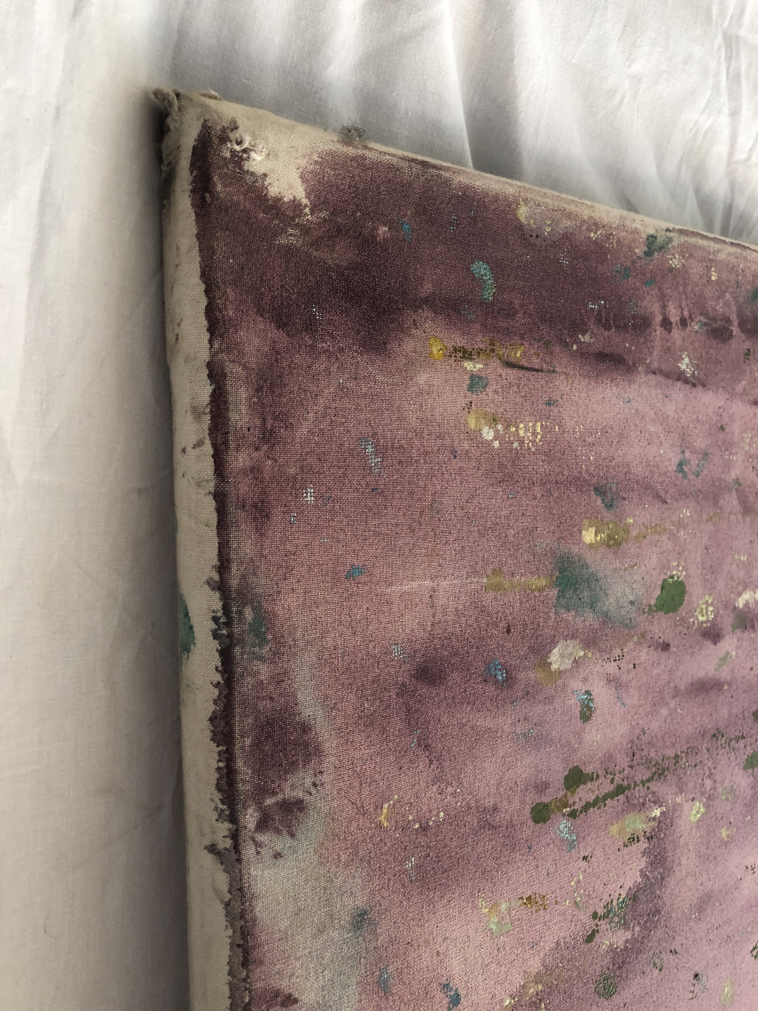 Het doek is op de hoeken beschadigd, waarschijnlijk door het op de vloer staan.