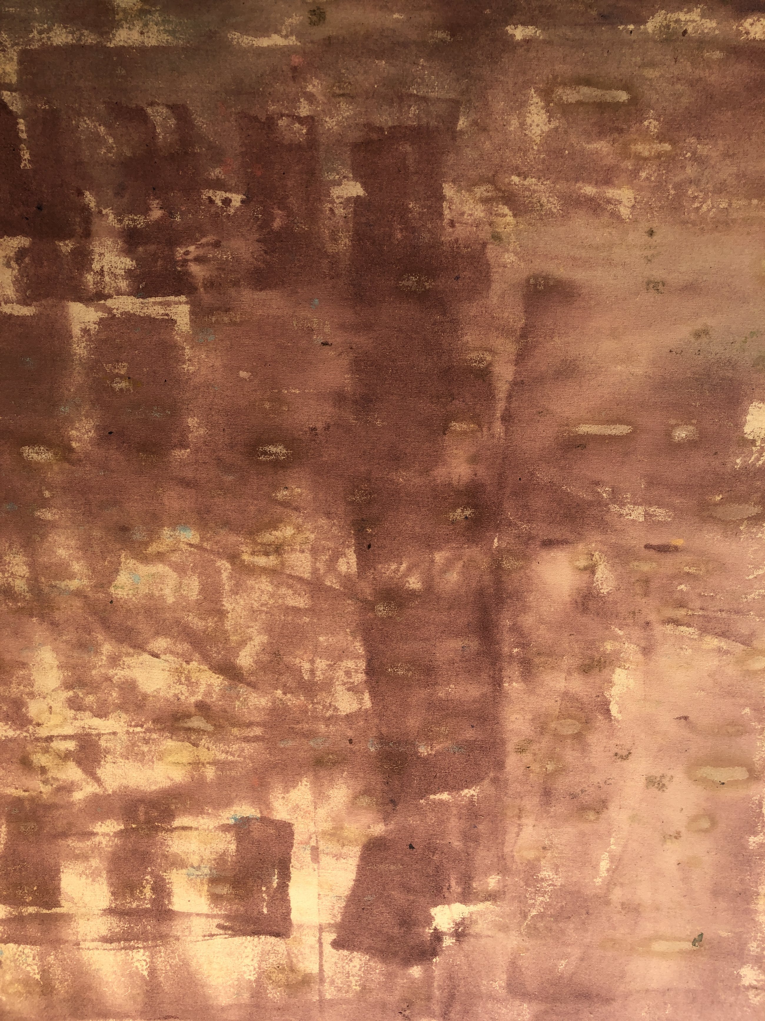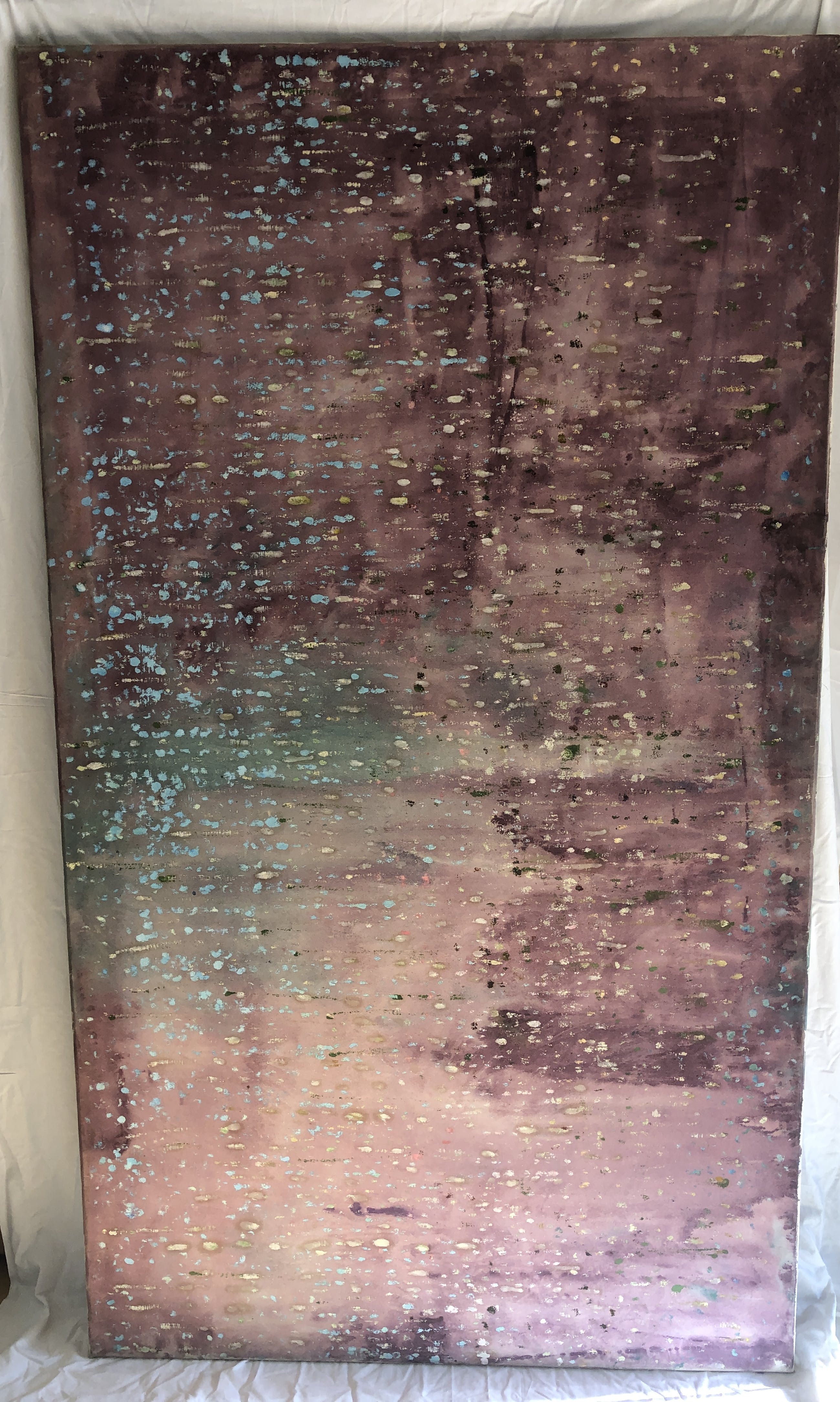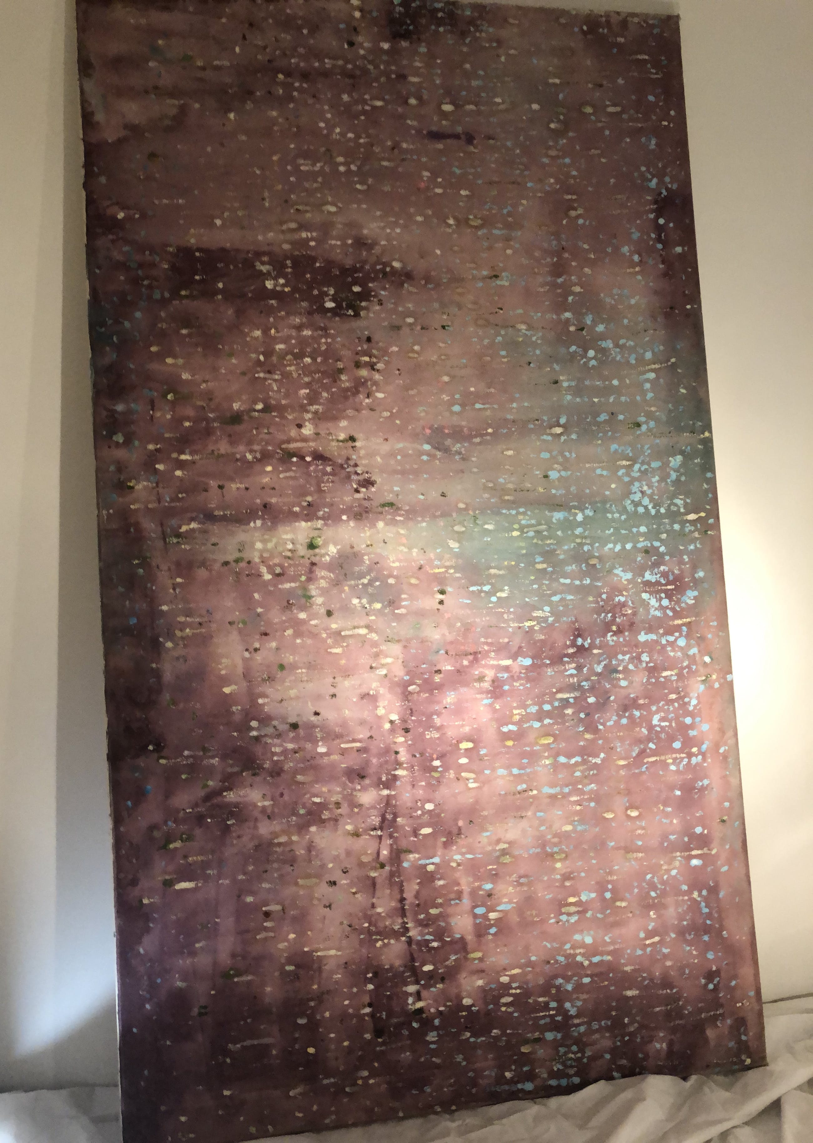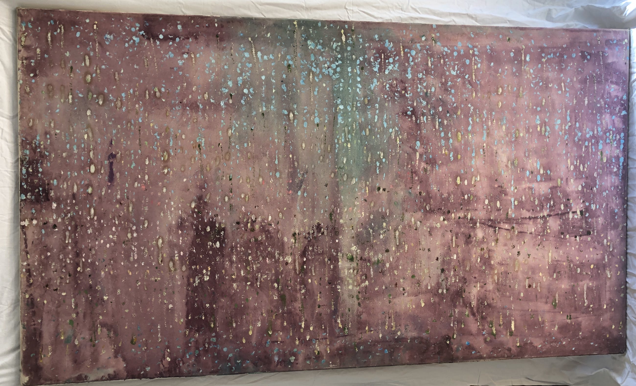 Het doek is op de hoeken beschadigd, waarschijnlijk door het op de vloer staan.