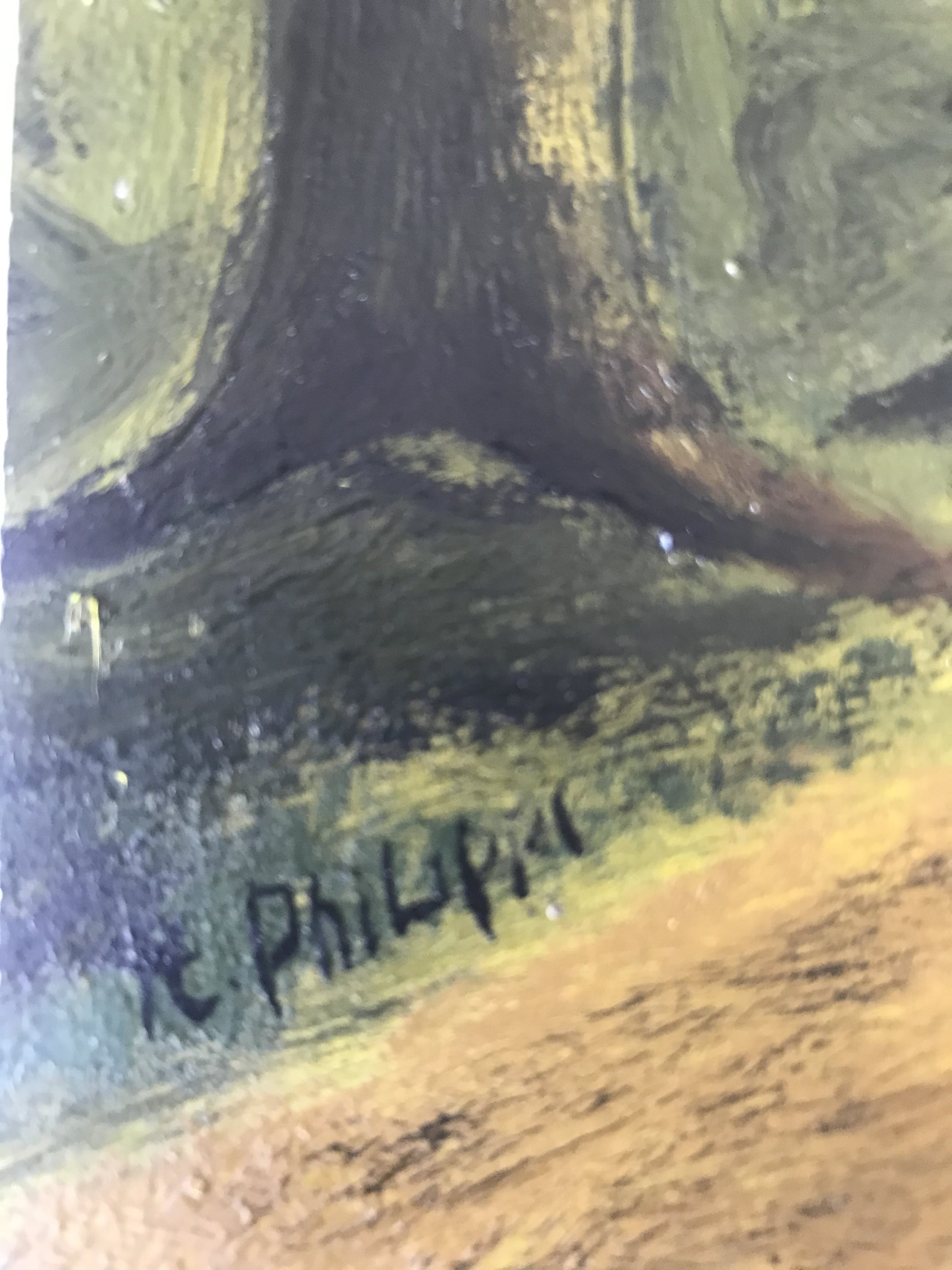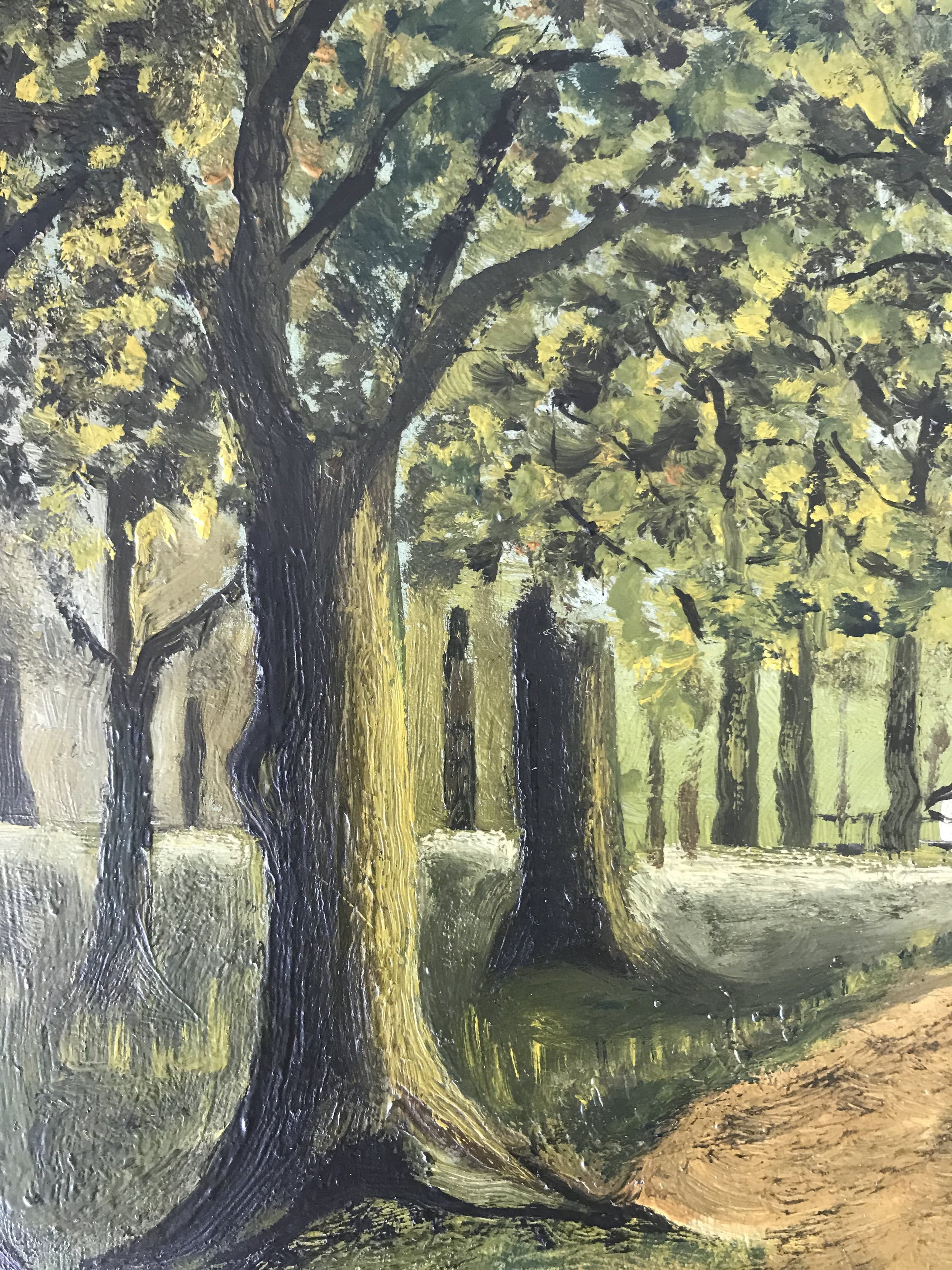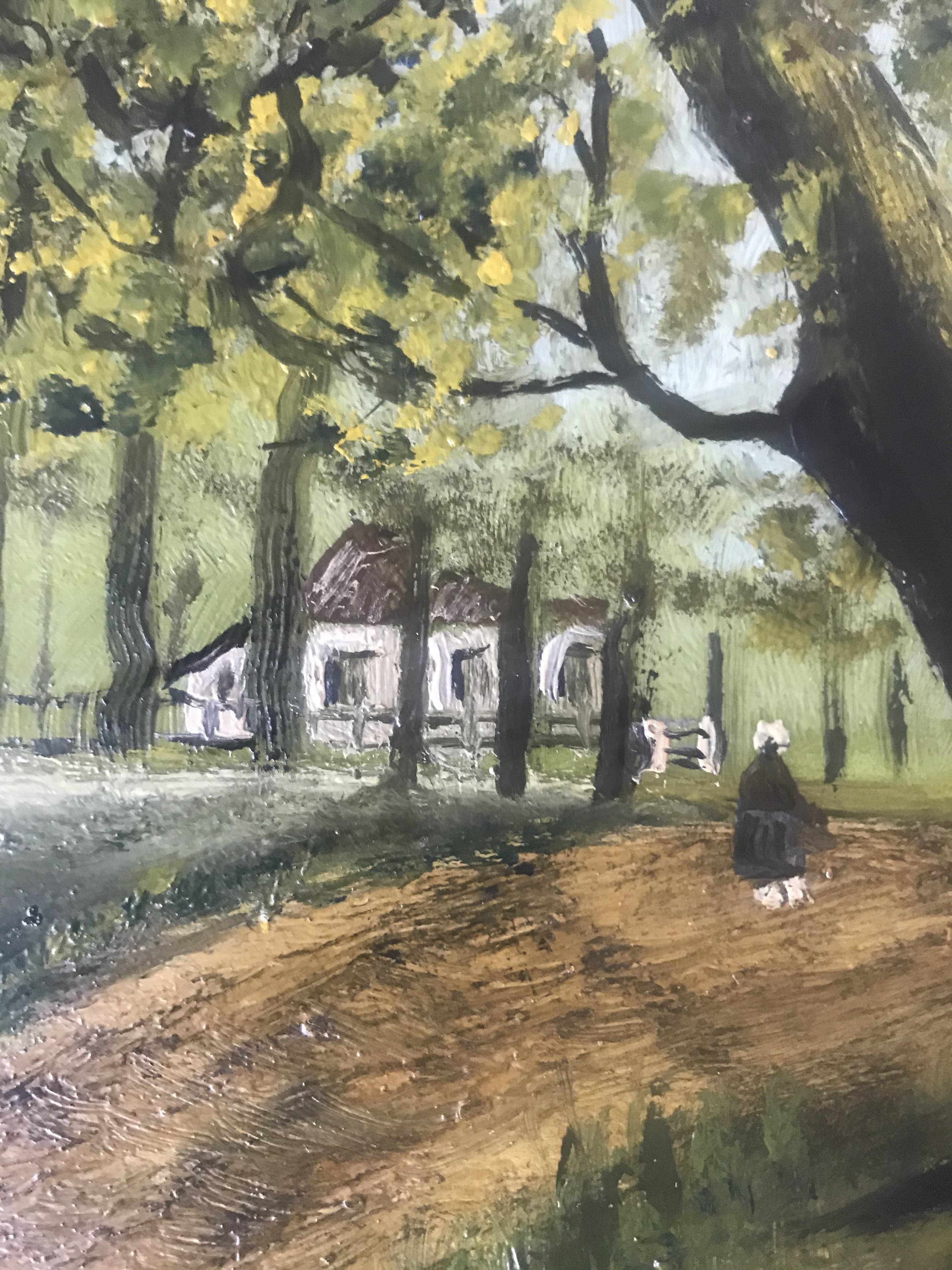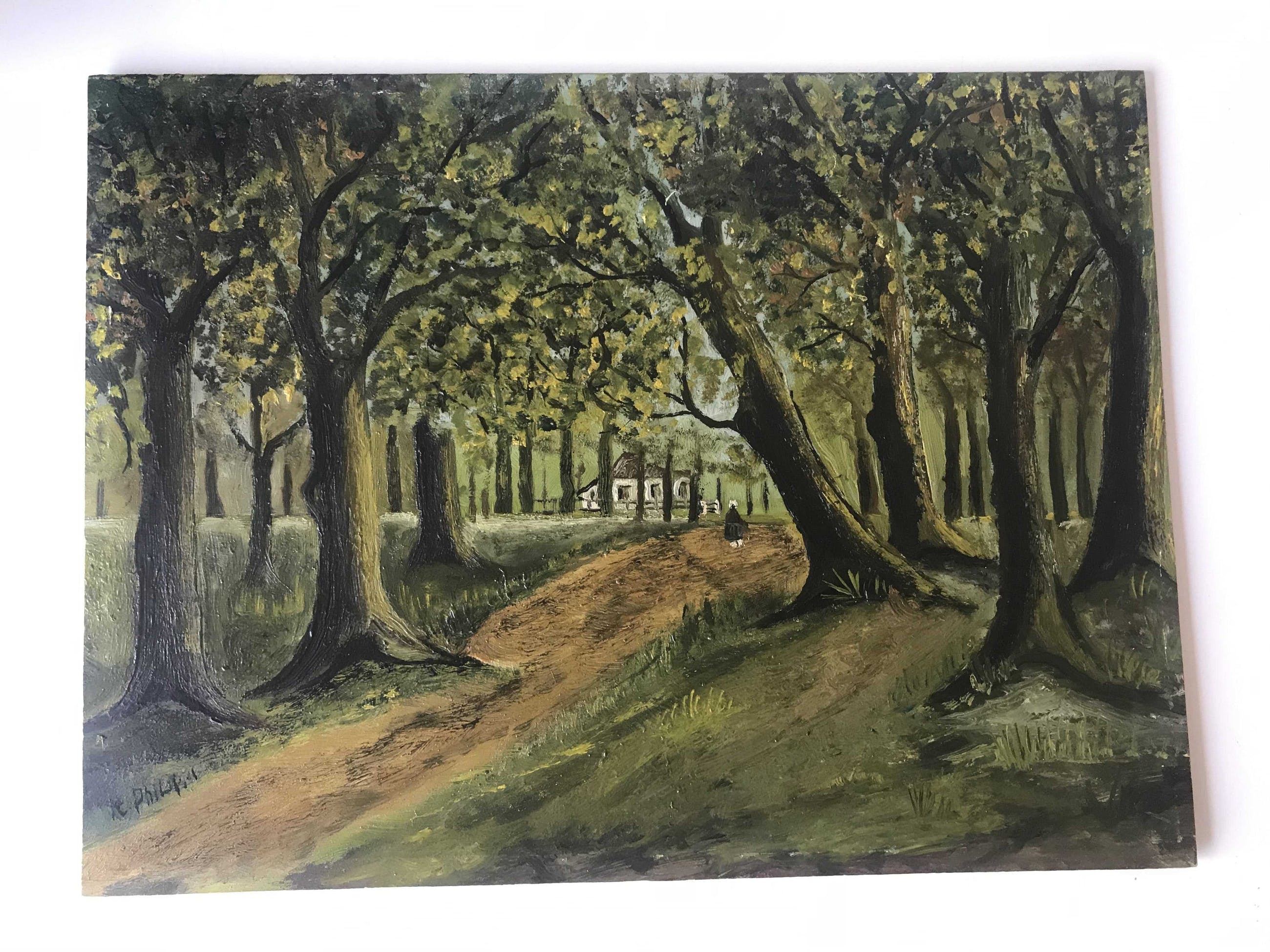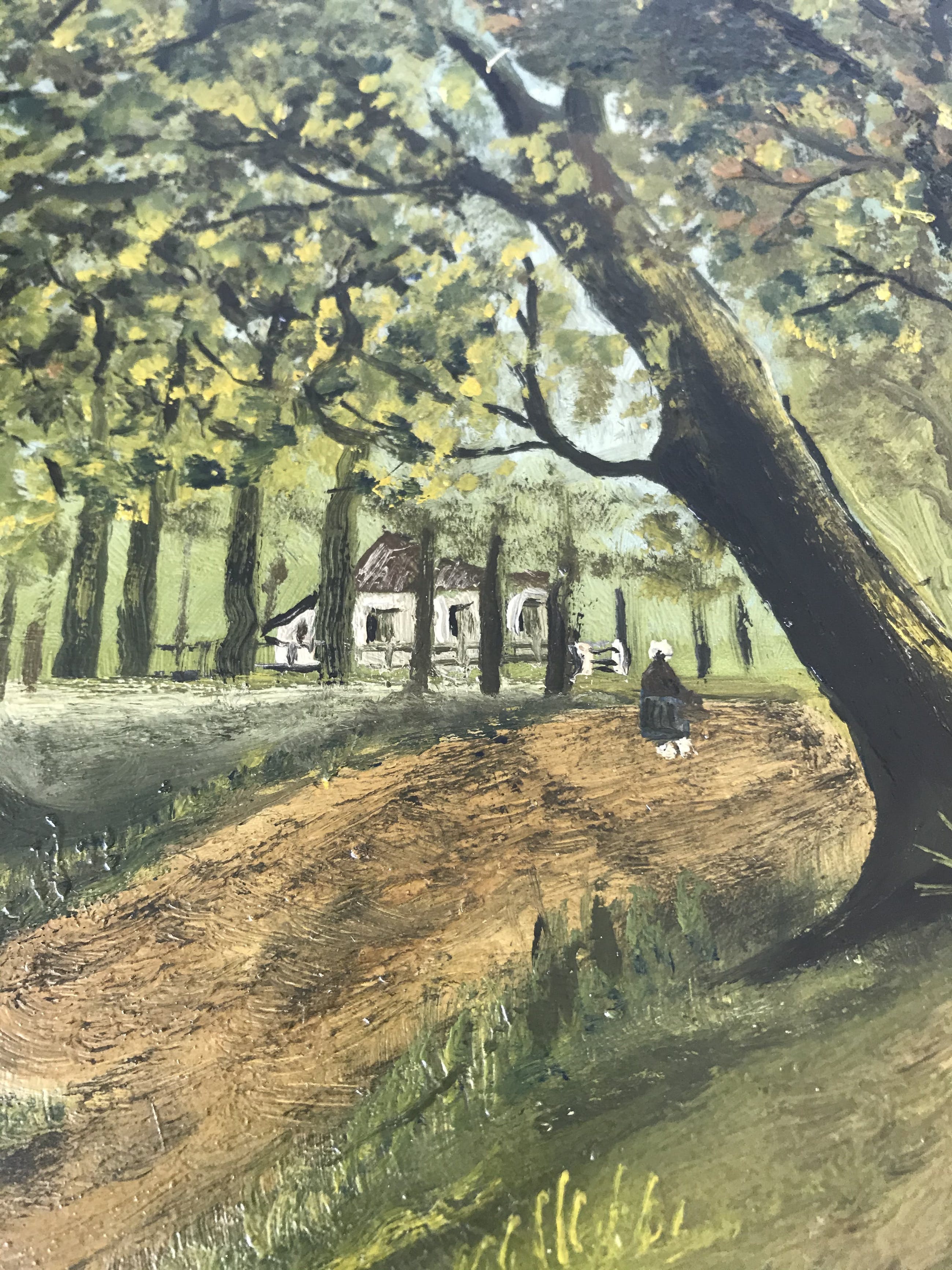 Prachtig bos tafereel van een figuur op een bospad met een cottage aan het eind van het pad. Helder van kleur met een vakkundig geschilderde dieptewerking.