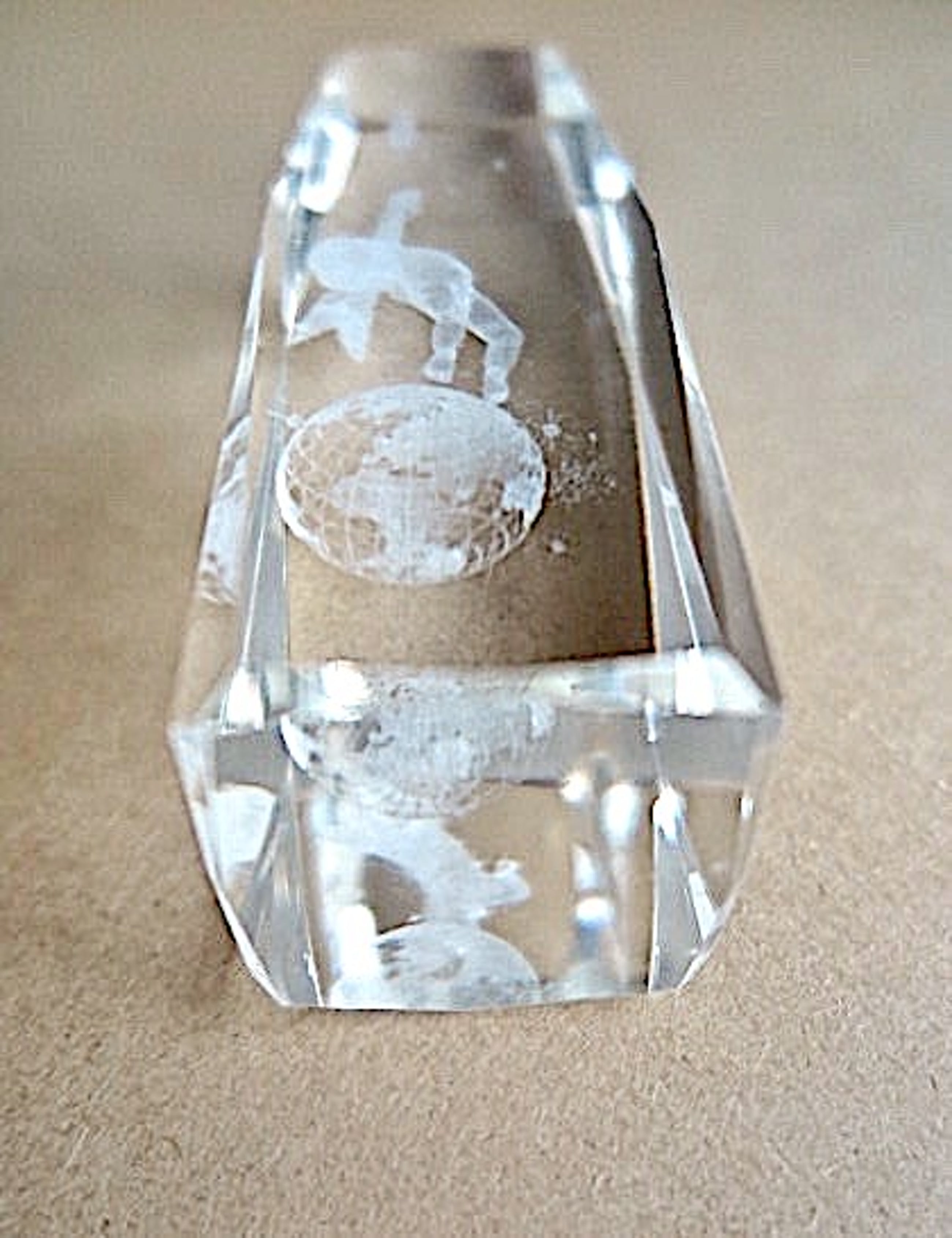 Fraaie 3D lasergravure in diamant geslepen kristal.                                                                                       Slijpvlakken op alle hoeken en boven- en onderkant.                                                                                                       Een echte lichtvanger.