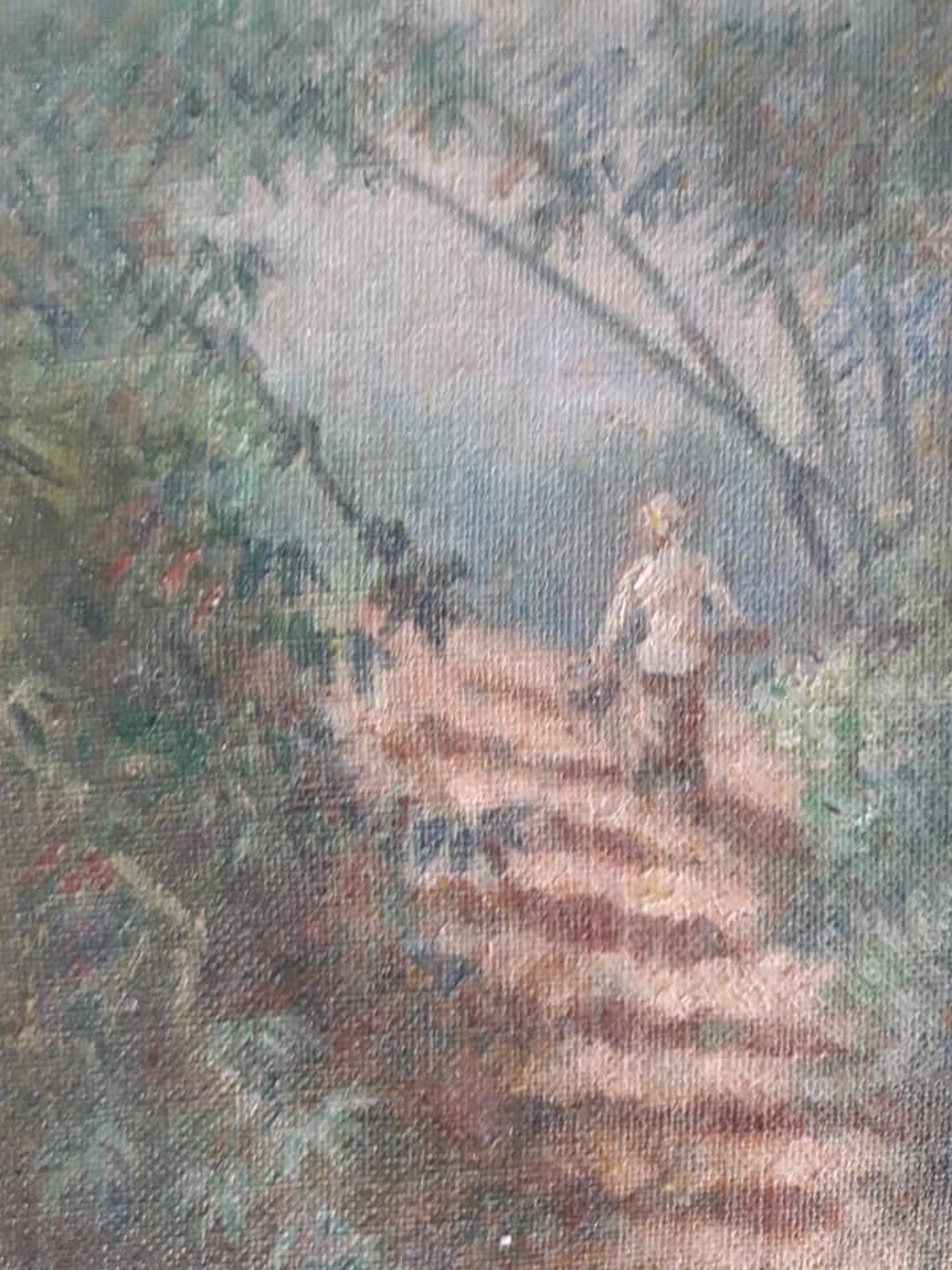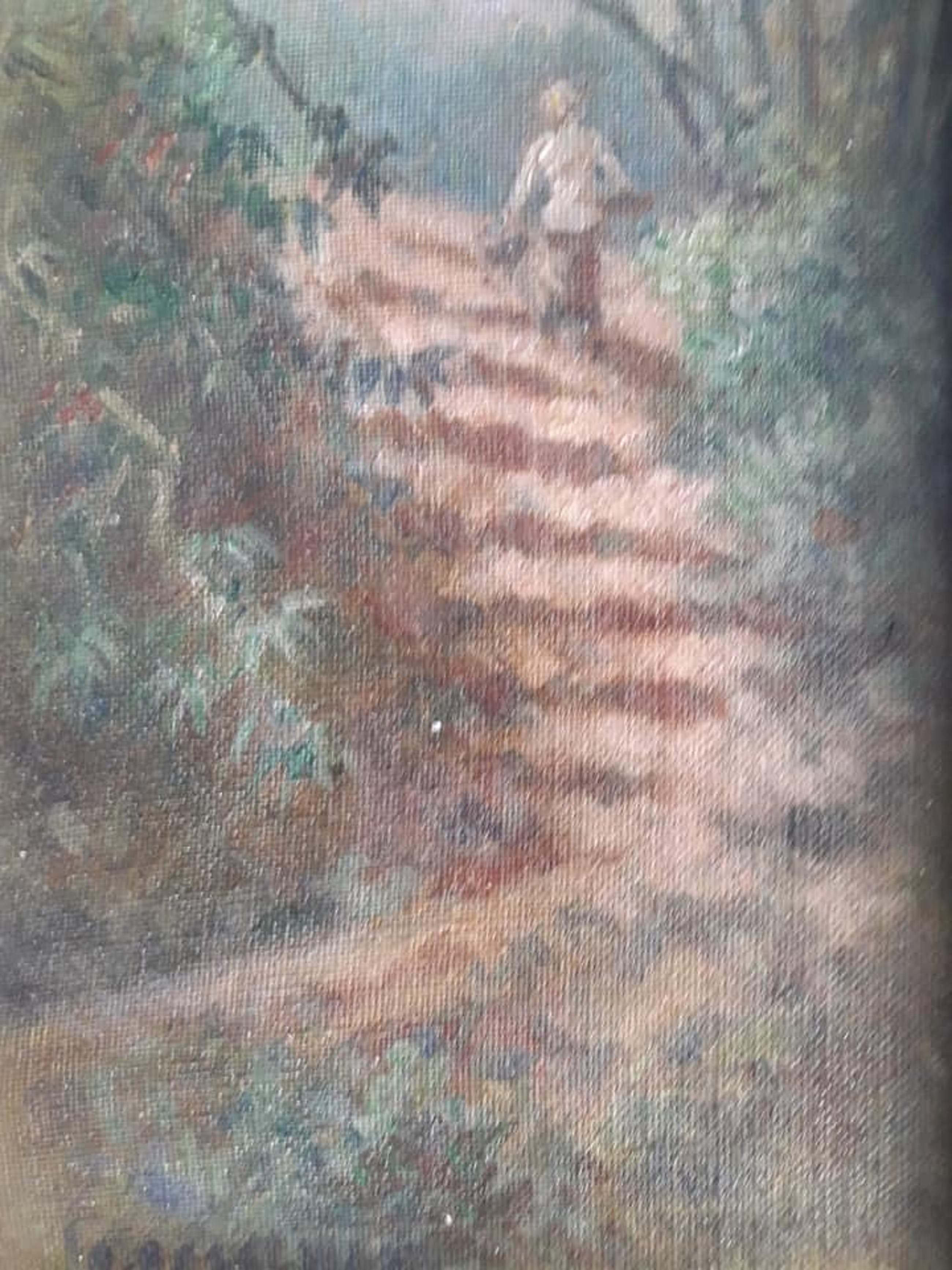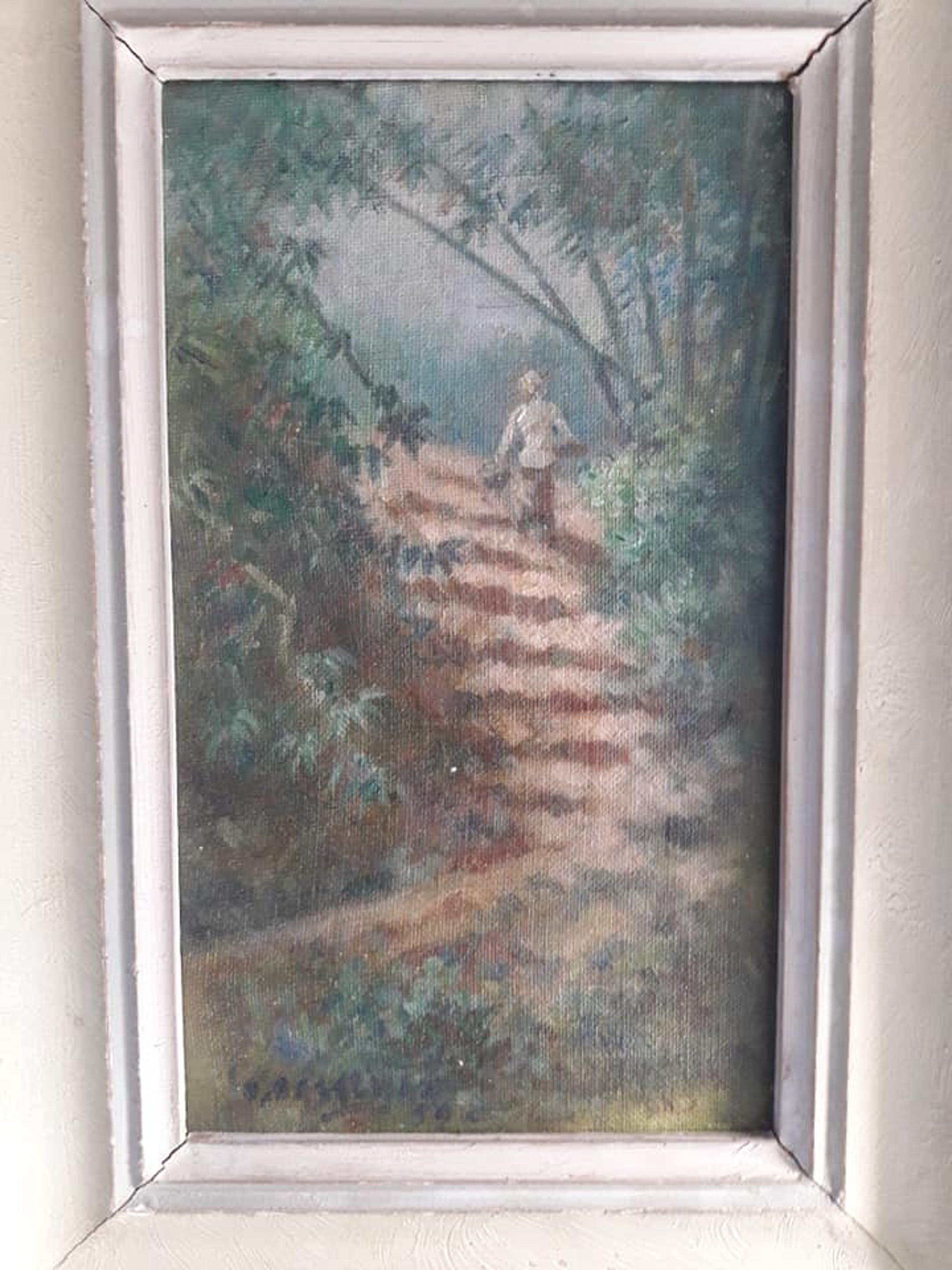 Leuk oud werkje dat oosters aandoet. Wellicht indonsie? Het is gesigneerd maar dat is door mij niet te ontcijferen. Doordat het gemaroufleerd is, is de ouderdom moeilijk in te schatten. Het zou ook zomaar nog voor-oorlogs kunnen zijn.