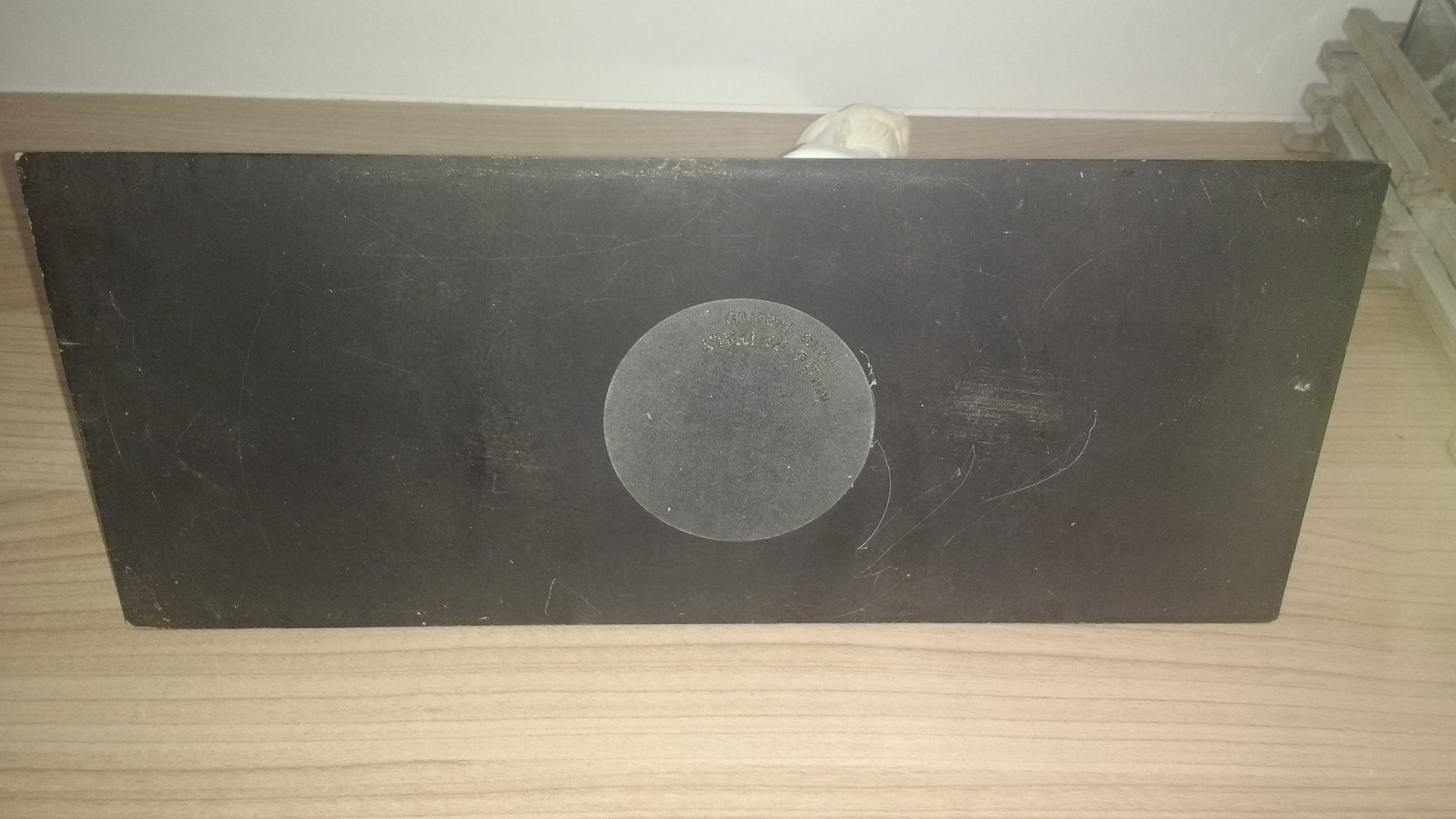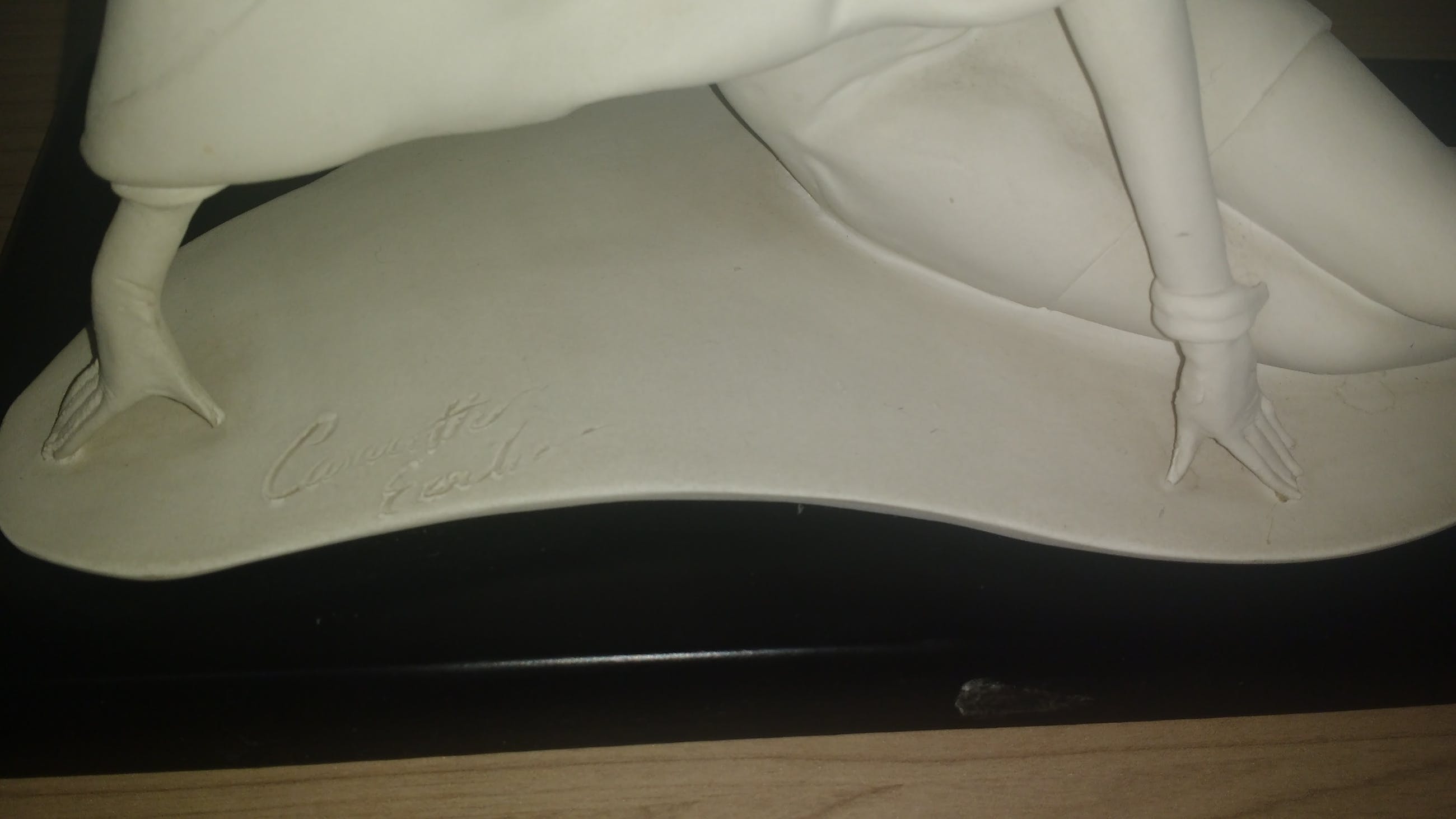 De naam is quasi onleesbaar Emilie (?) Casarotte (?) met achterzijde dan nog initialen ADVGemaakt van (?) steen wellicht.  Retro beeldje maar door de eenvoud heel origineel als sierstuk