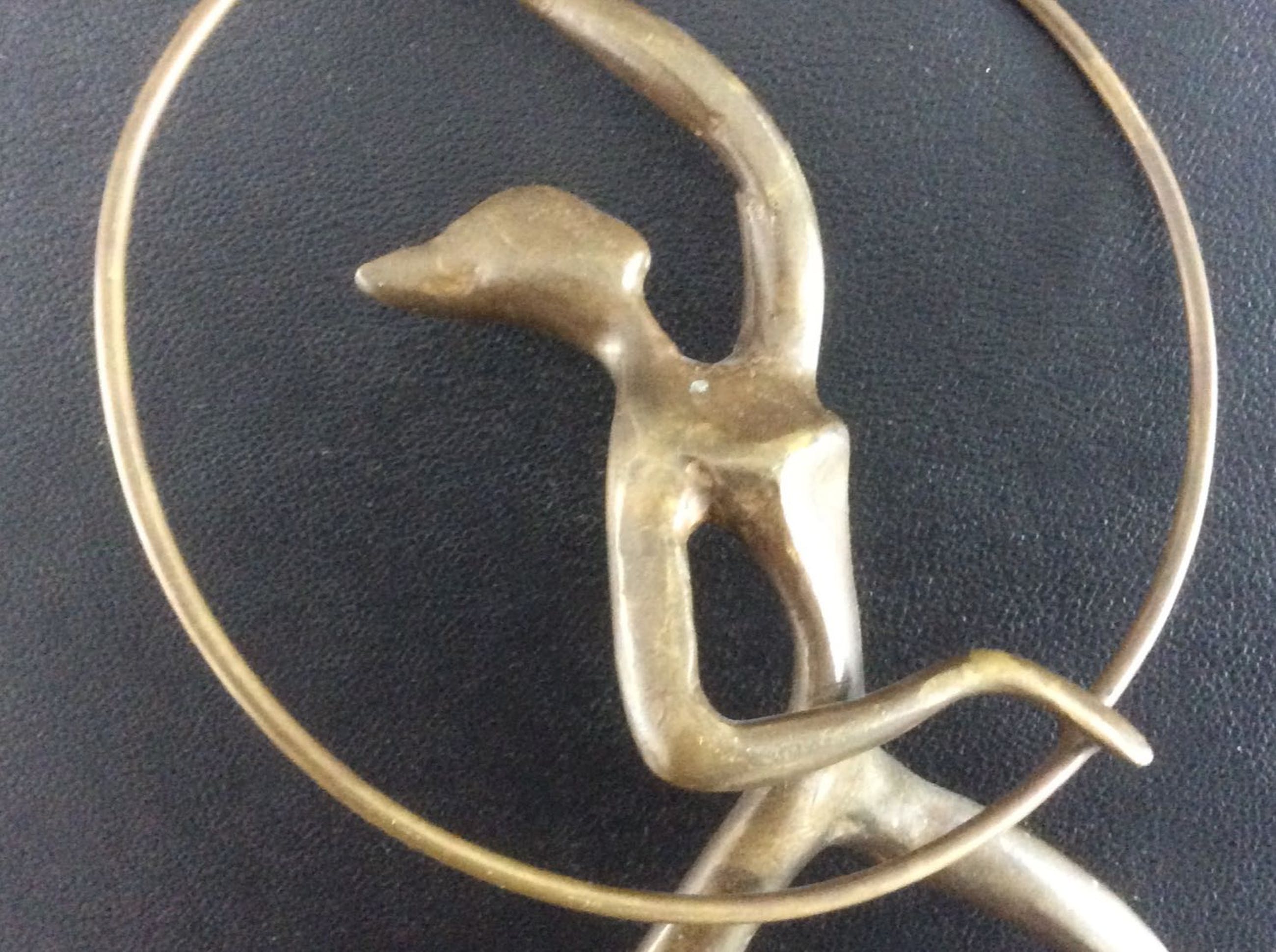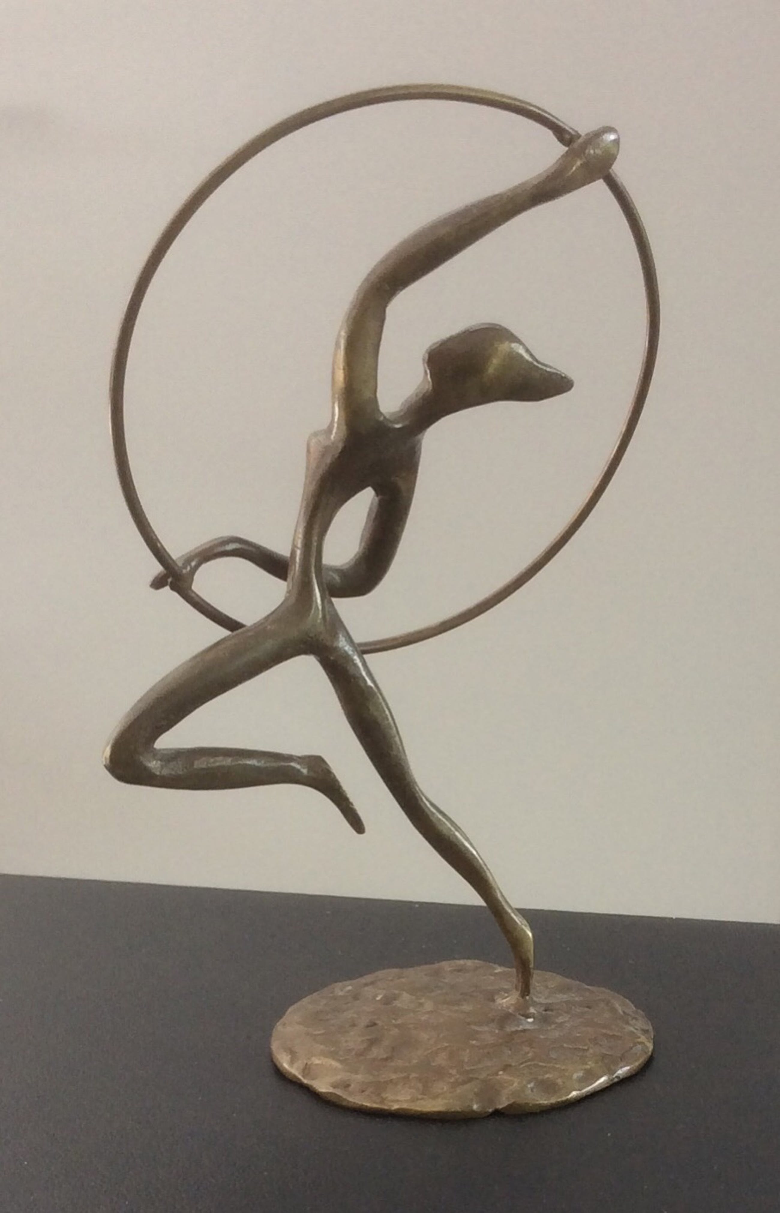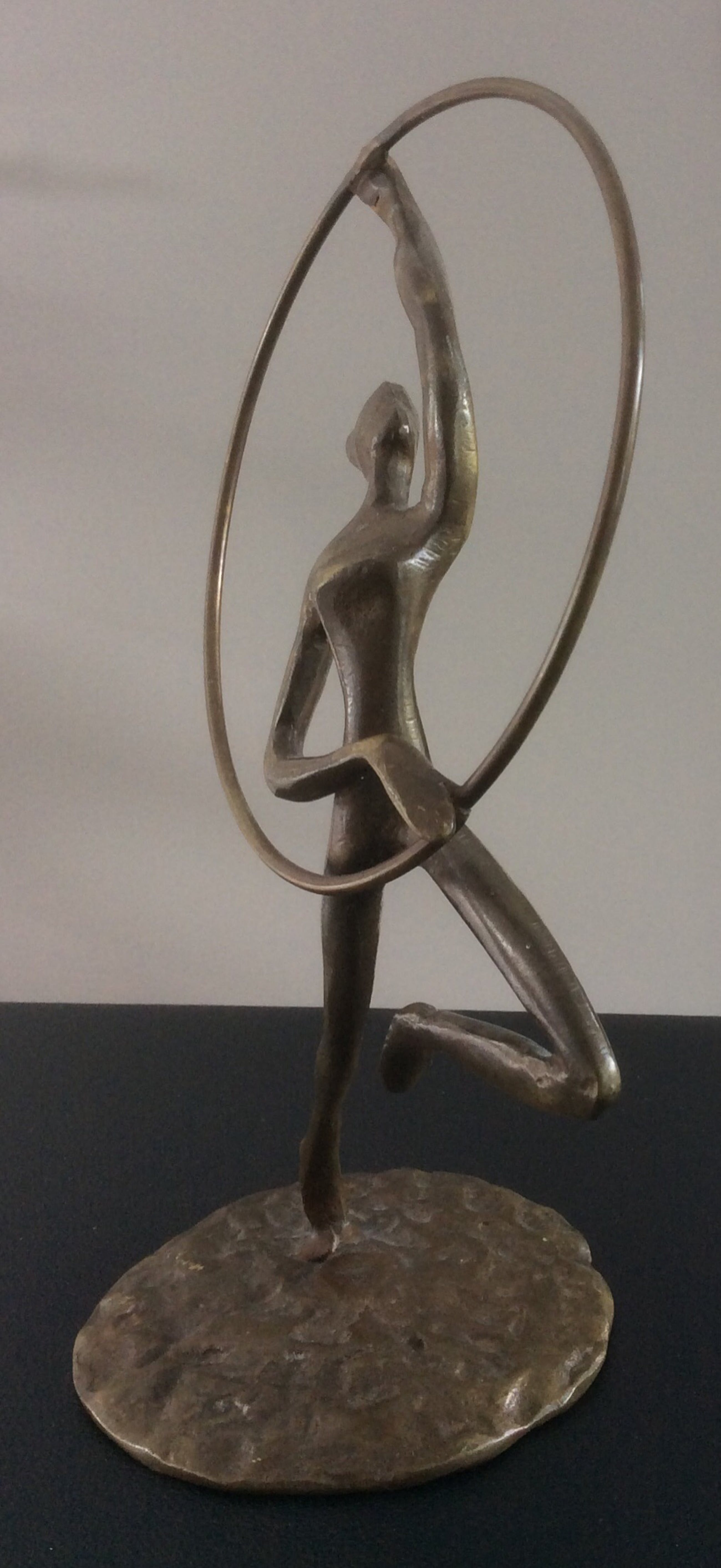 Een sierlijke danseres of turnster met hoepel. Op cirkelvormige voetplaat. Met een mooi patin.