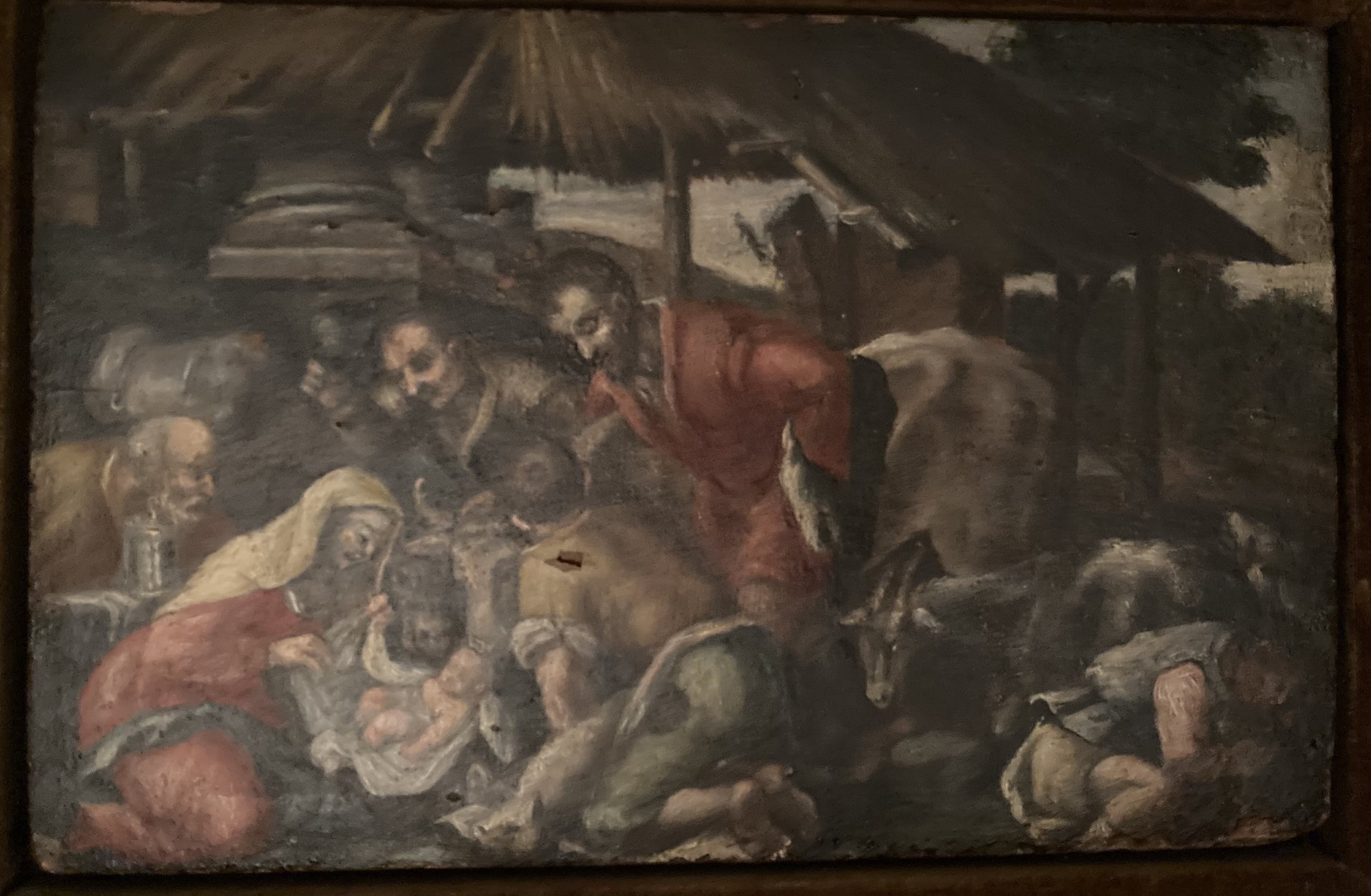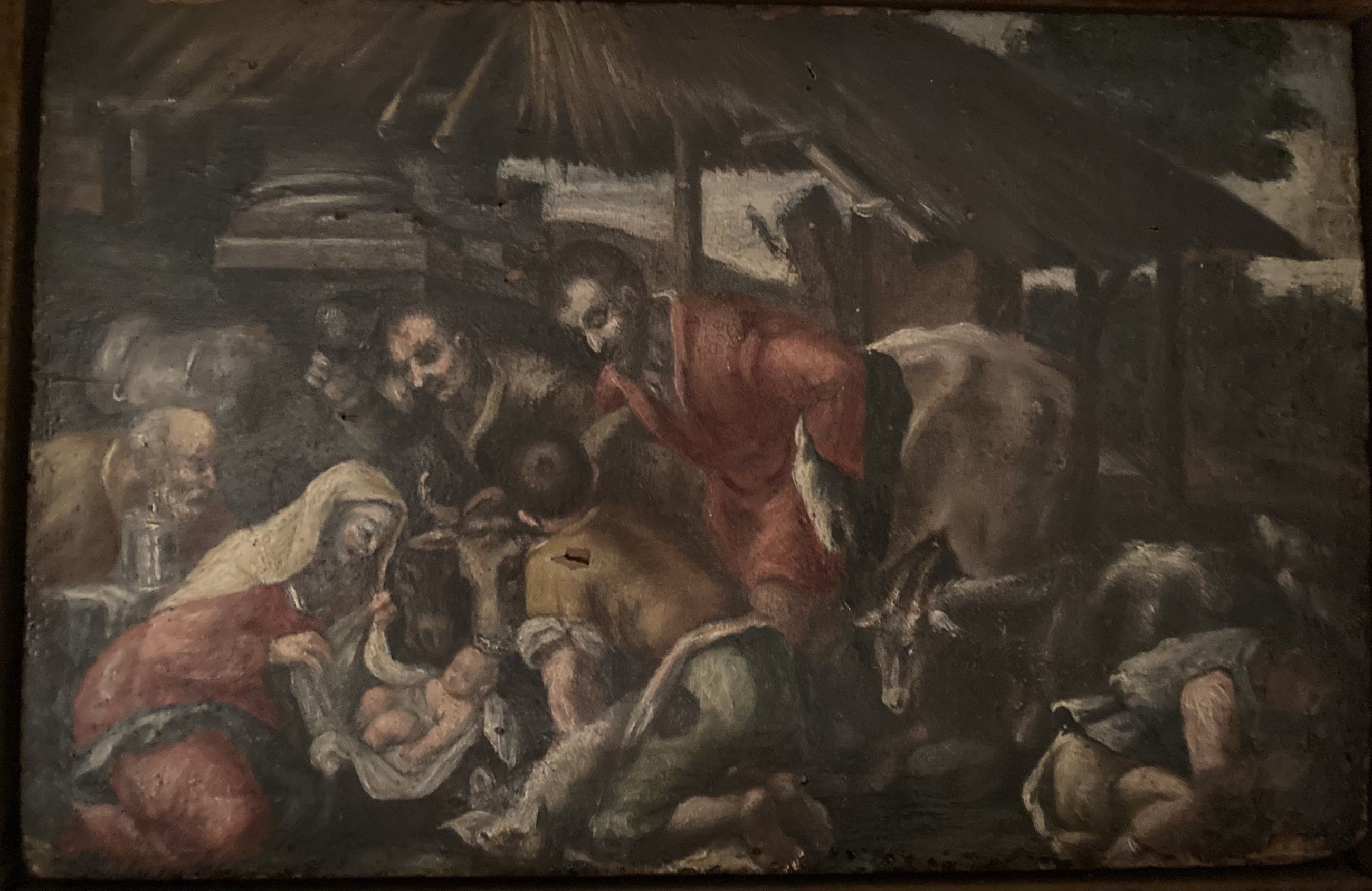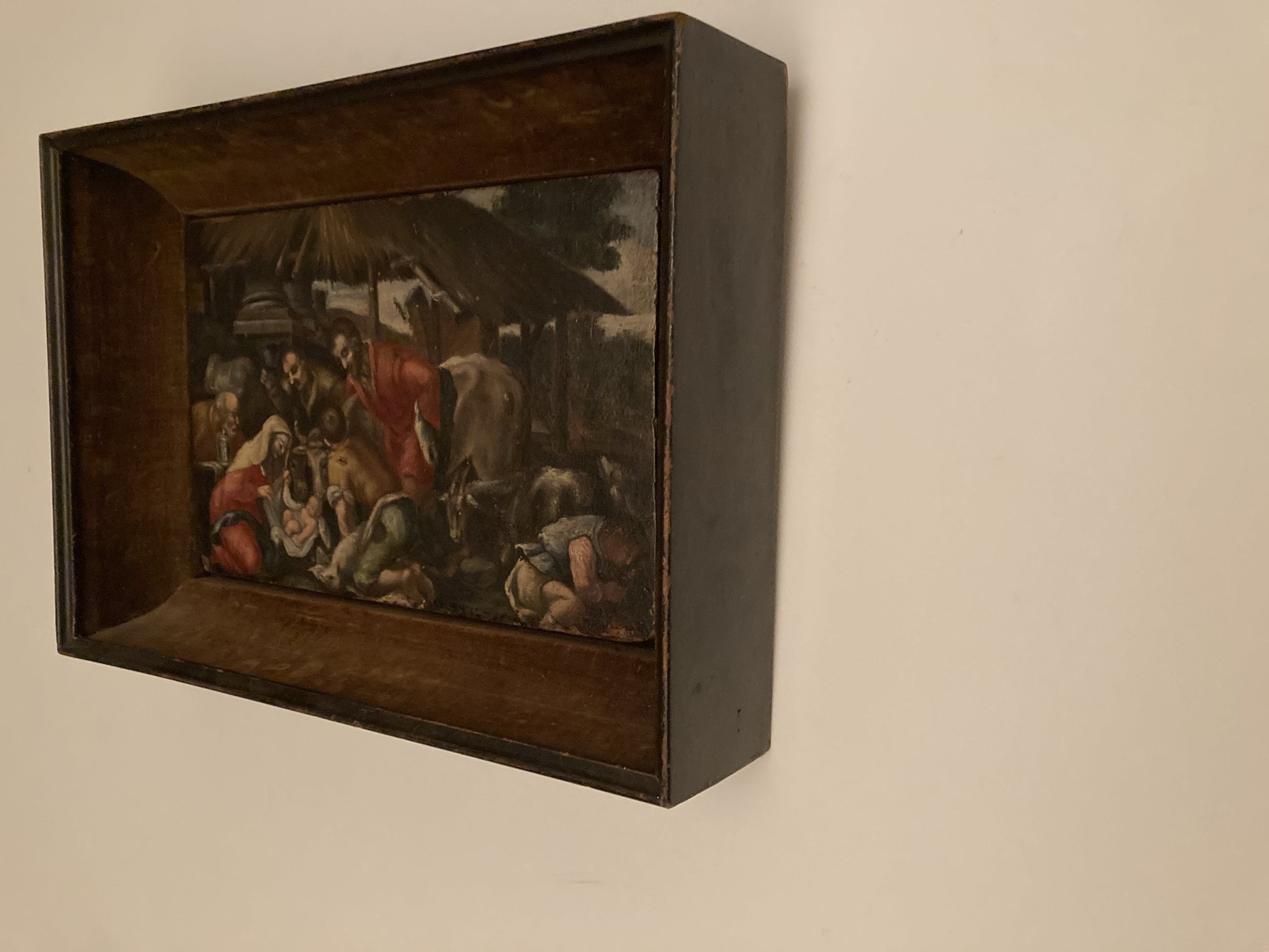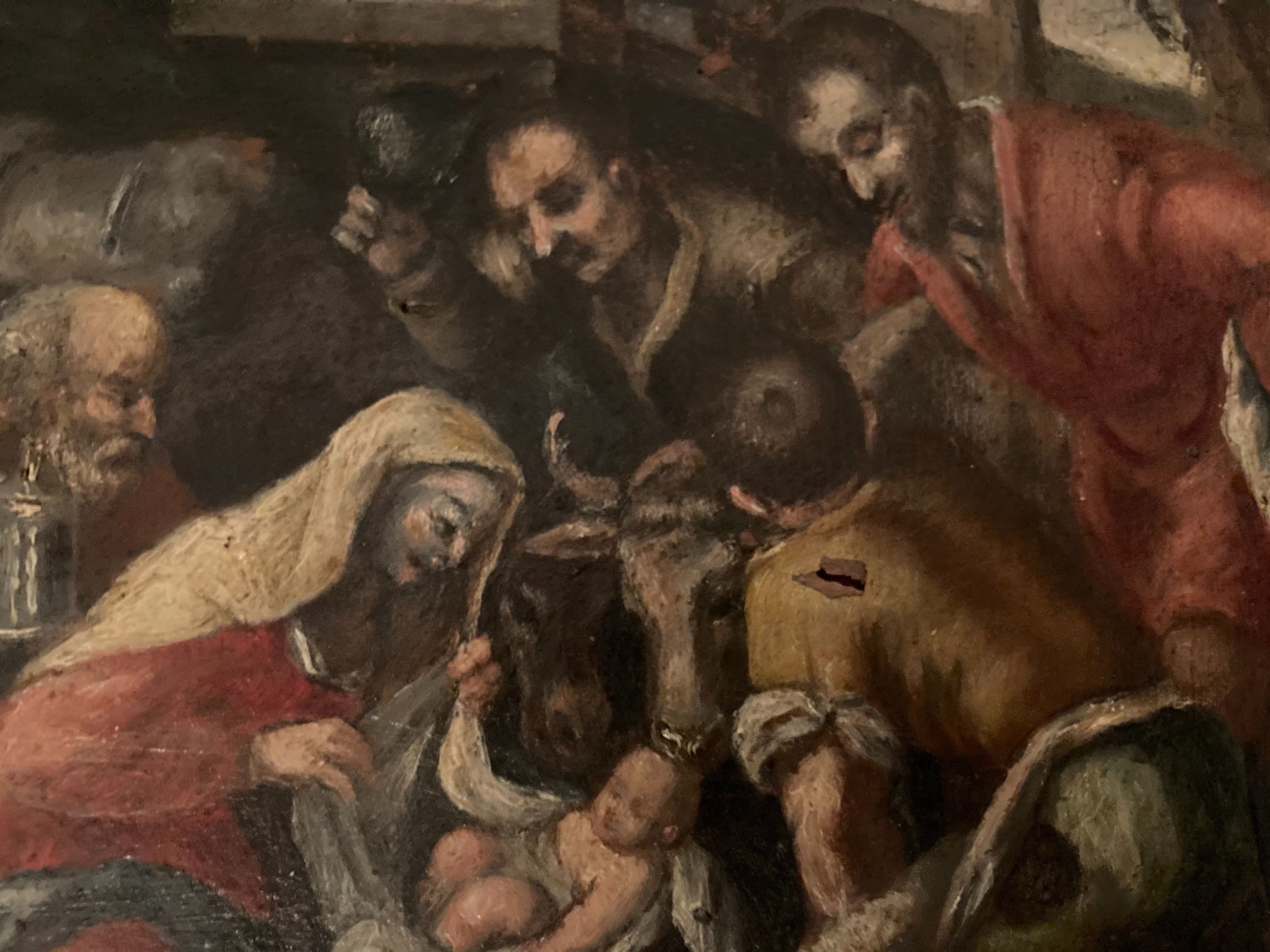 Een prachtig kerstvoorstelling van de aanbidding der herders olieverf op paneel.
