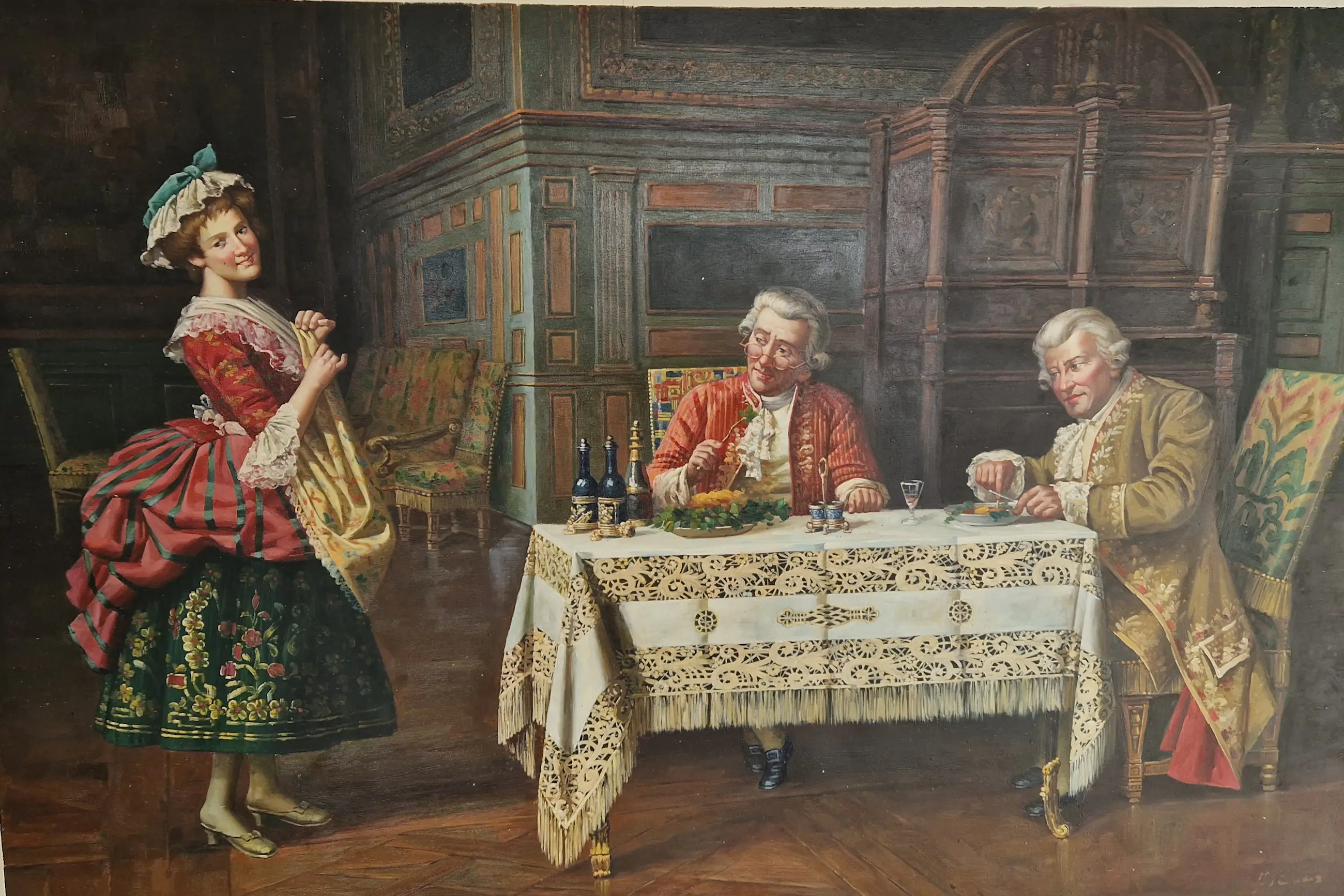 Een scène uit het dagelijks leven! Het schilderij toont twee mannen die aan het eten zijn, terwijl een vrouw naast de tafel staat en toekijkt. Het tafereel is intiem en levendig, en je kunt de gezelligheid en warmte van het moment voelen. De details van de gerechten op tafel en het interieur van de kamer zijn prachtig vastgelegd, van het servies en bestek tot de flessen op tafel. Dit prachtige doek geeft de eenvoudige geneugten van het leven weer en of je nu een liefhebber bent van het leven uit vervlogen tijden of gewoon een waardering hebt voor klassieke schilderkunst, dit schilderij gaat een aanwinst zijn in uw woning!
