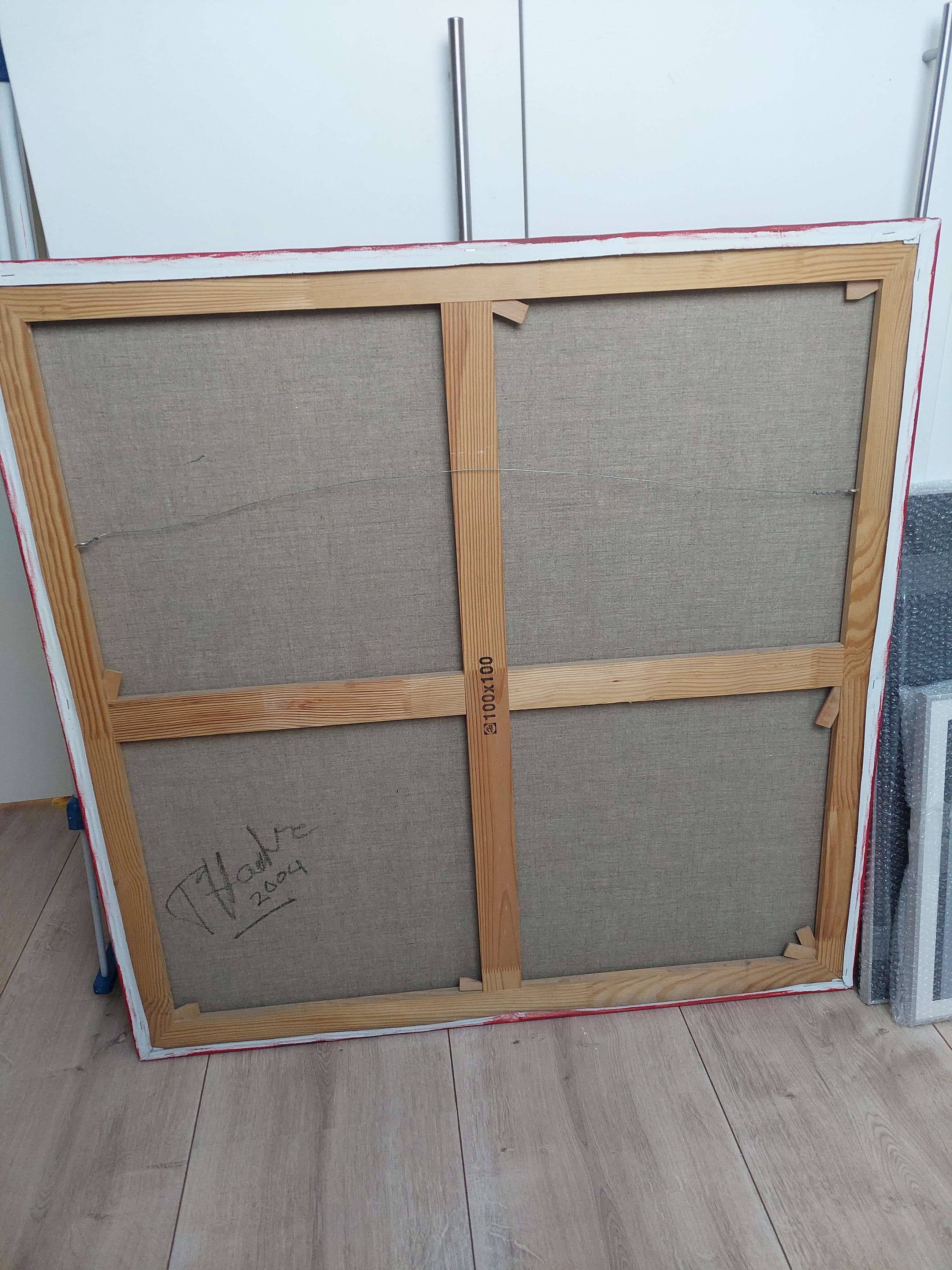 Olieverf op doek 100 x 100 Signatuur voor mij niet te ontcijferen.Prachtig gedetailleerde mus op dieprode achtergrond. Het verloop naar lichtrood op het doek komt door invallend licht. | |