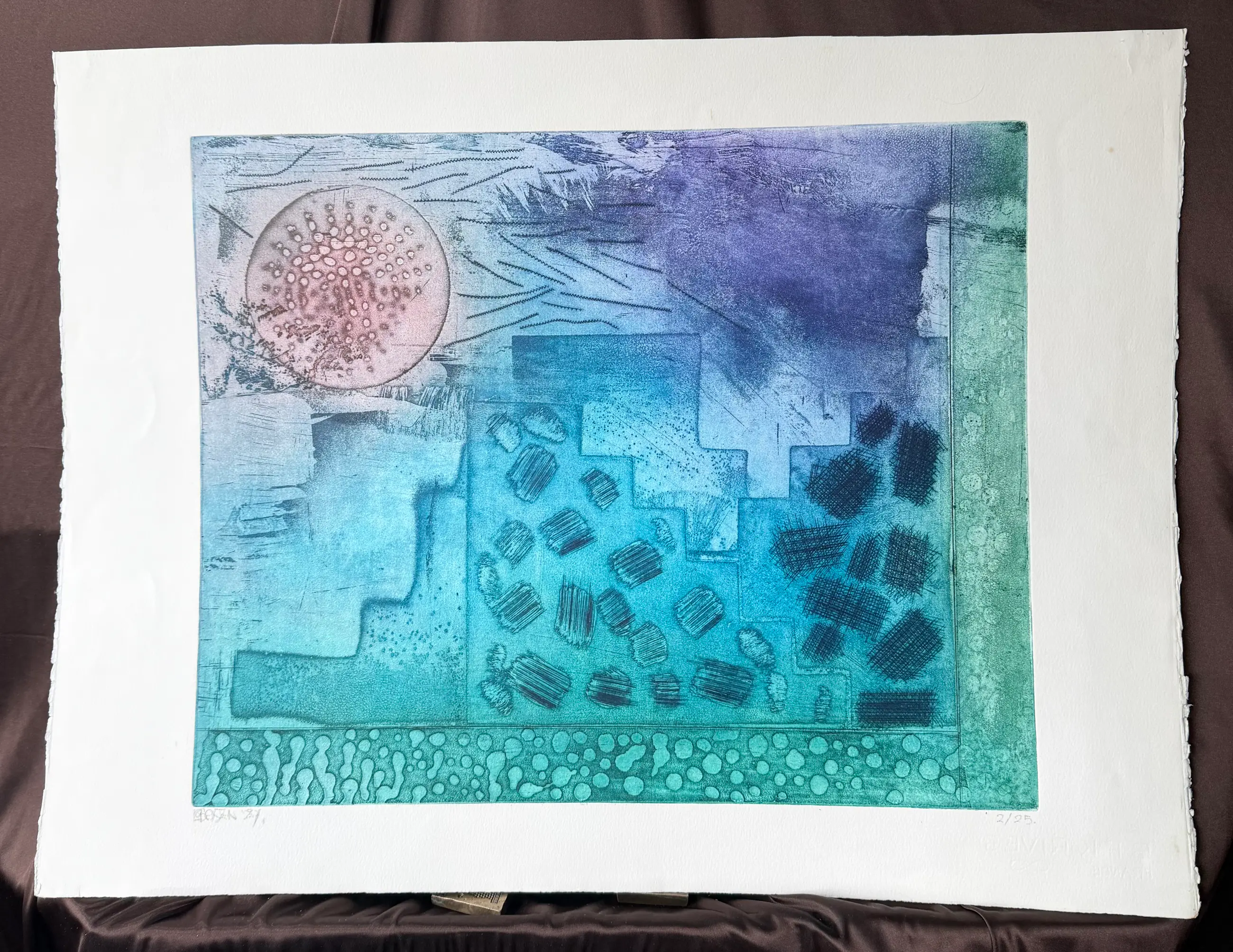 Mooi, kleurrijk werk waarvan ik de naam van de kunstenaar helaas niet kan ontcijferen. Verkregen in een pakket kunstwerken op een veiling. Mag voor een klein prijsje naar de liefhebber.