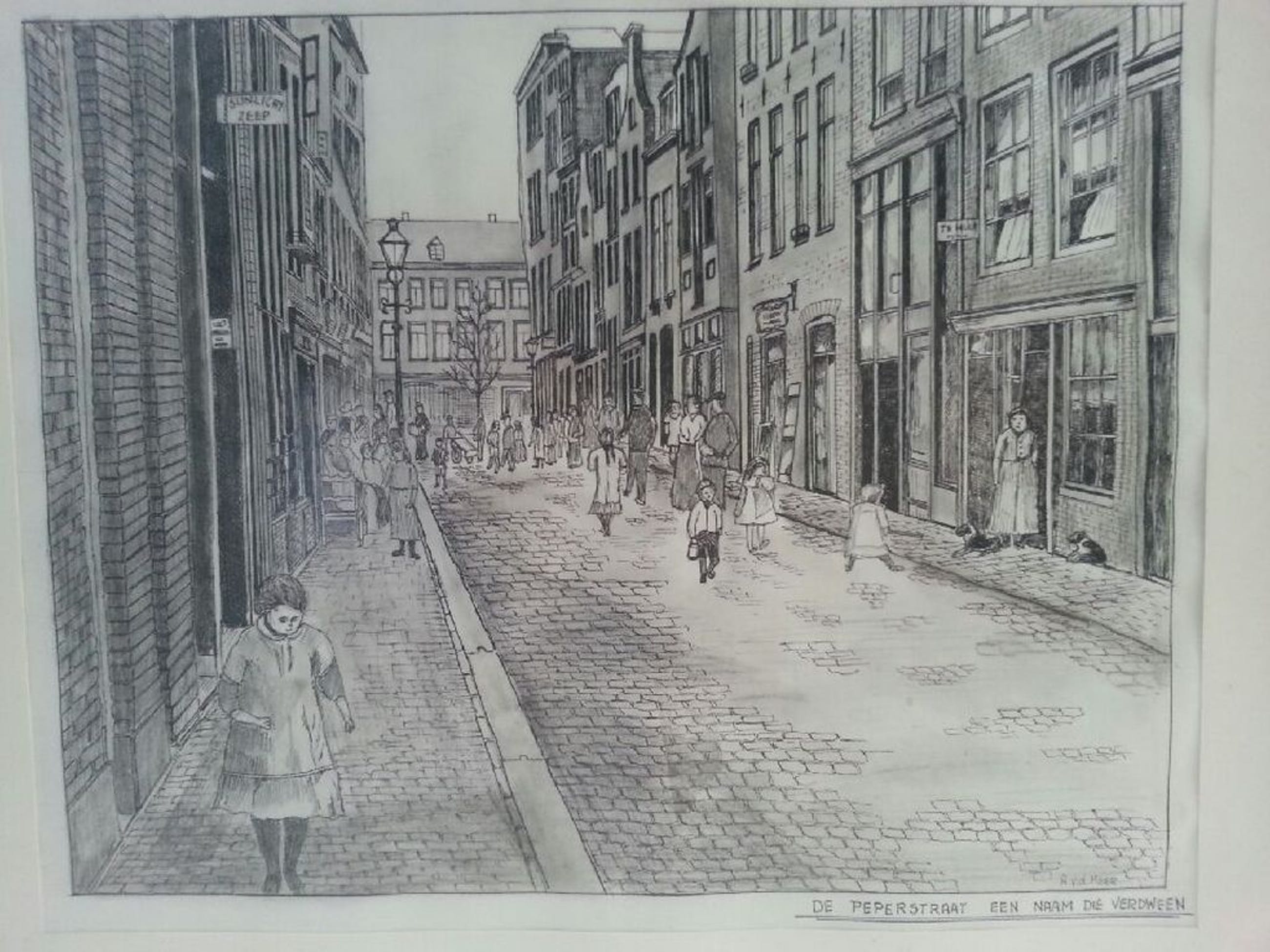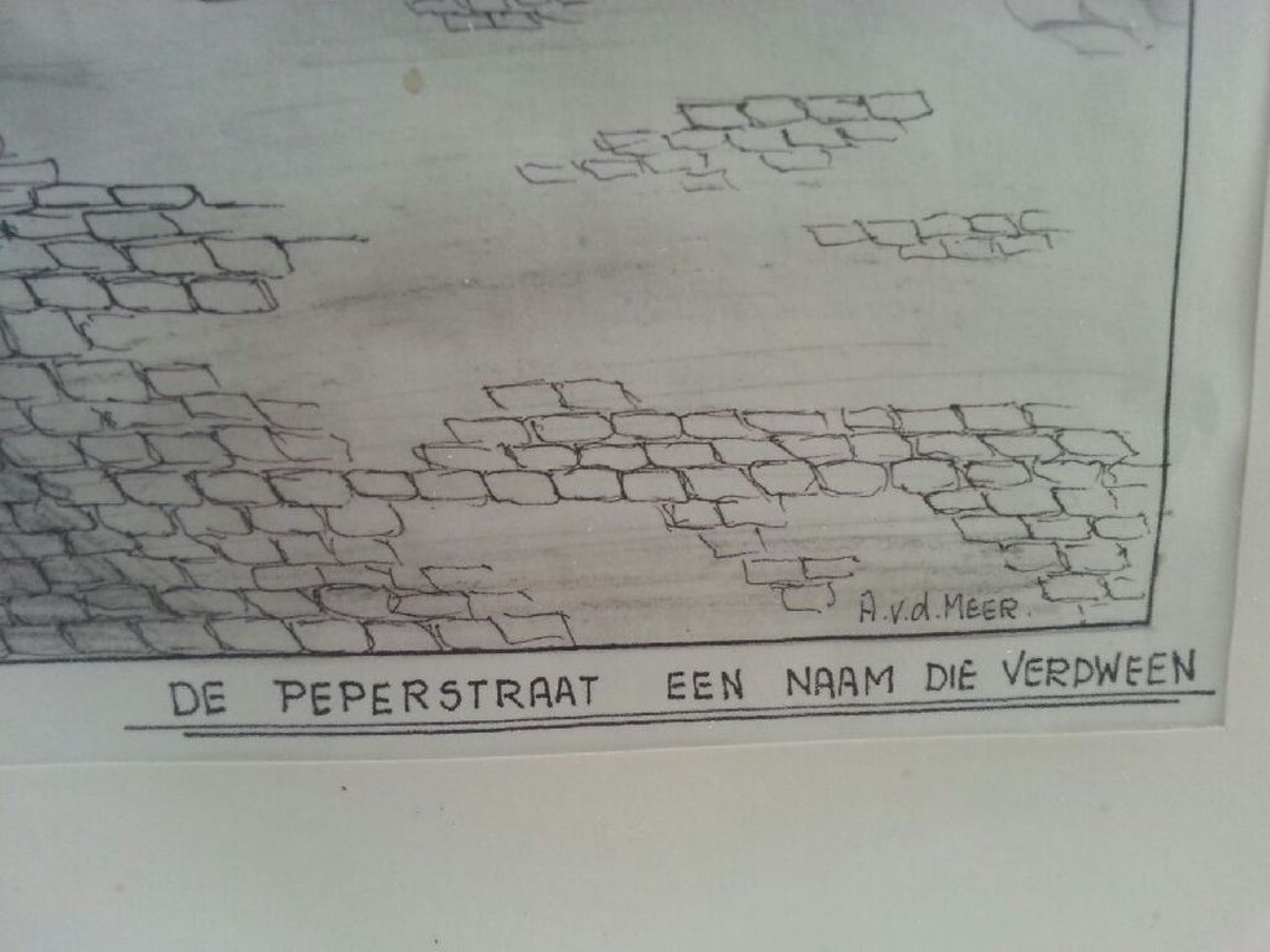 Tekening van A van der Meer, genaamd "de peperstraat, een naam die verdween".