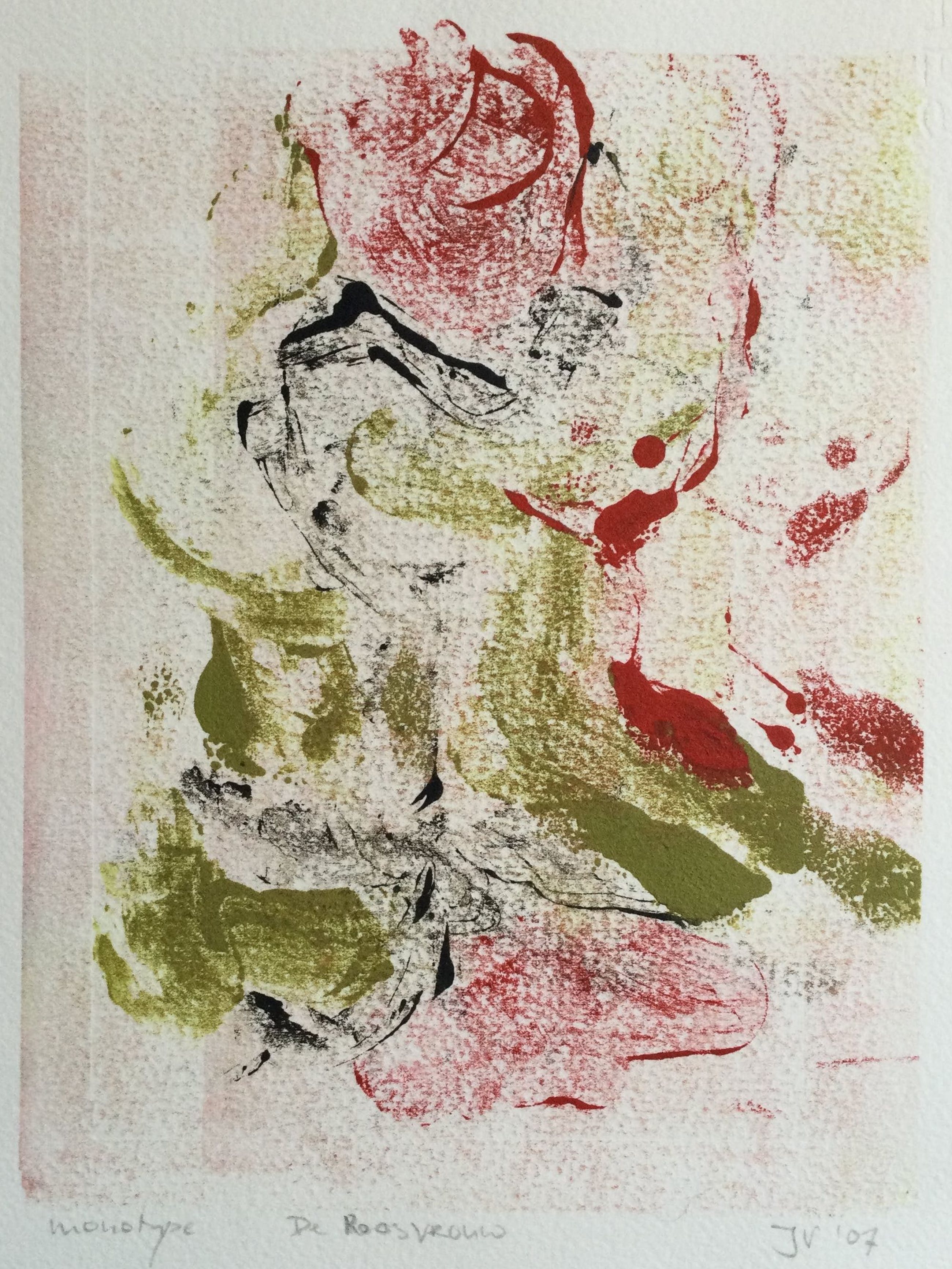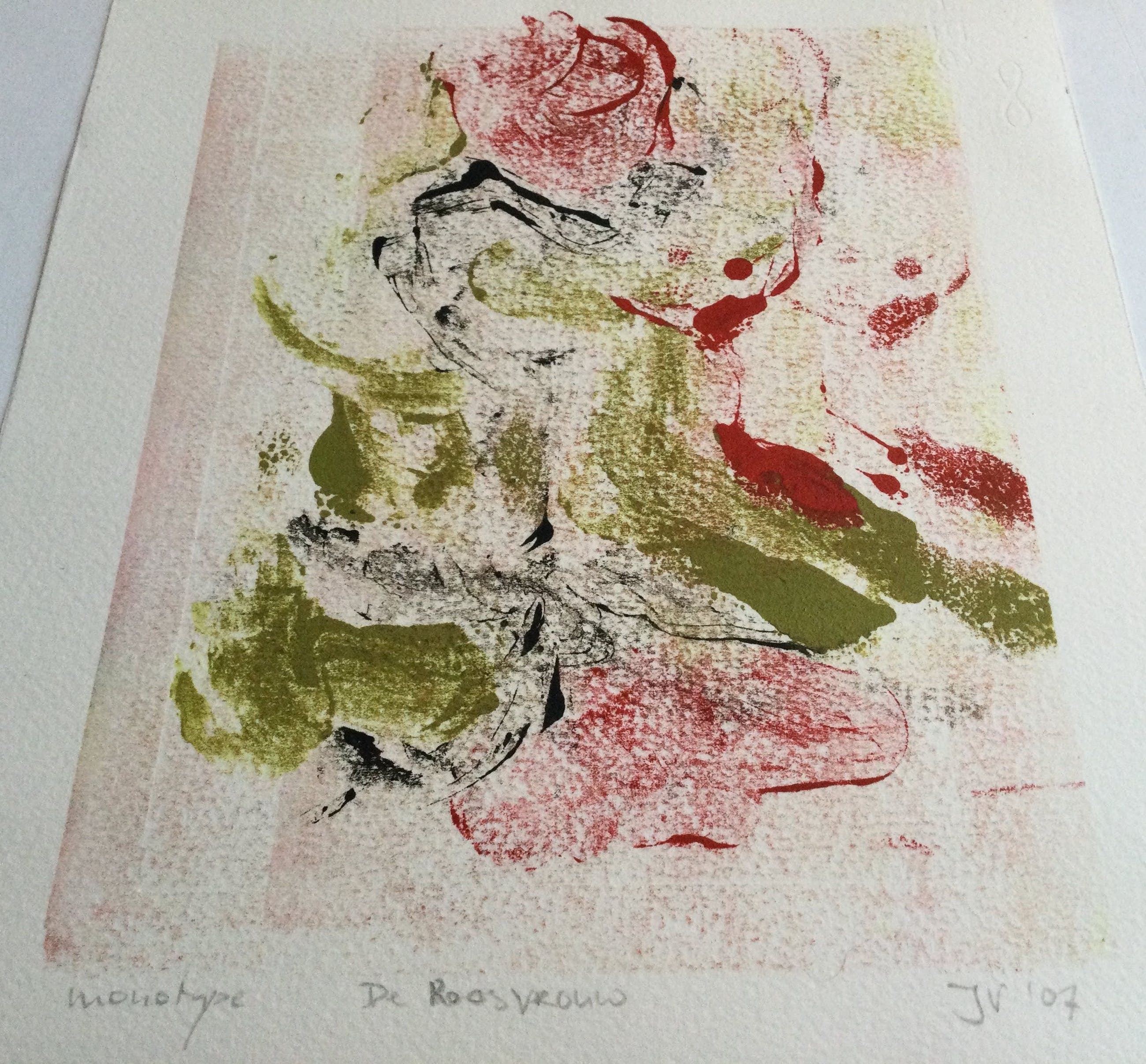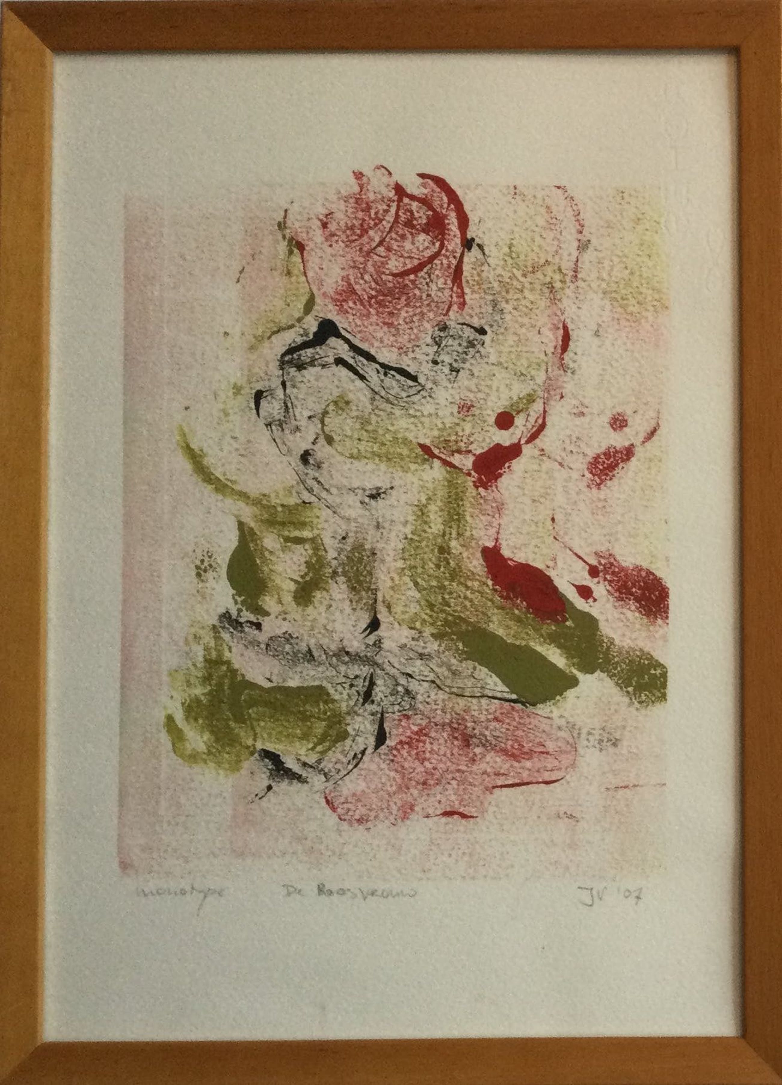 Sierlijk en mysterieus tegelijkertijd, dat is de indruk die dit werk (monotype) oproept. Titel: De Roosvrouw Jaar: 2007 Techniek: monotype Met potlood gesigneerd en gedateerd "JV '07" Het werk zit in een beuken (blank) houten foto wissellijst Foto's maken deel uit van de beschrijving.