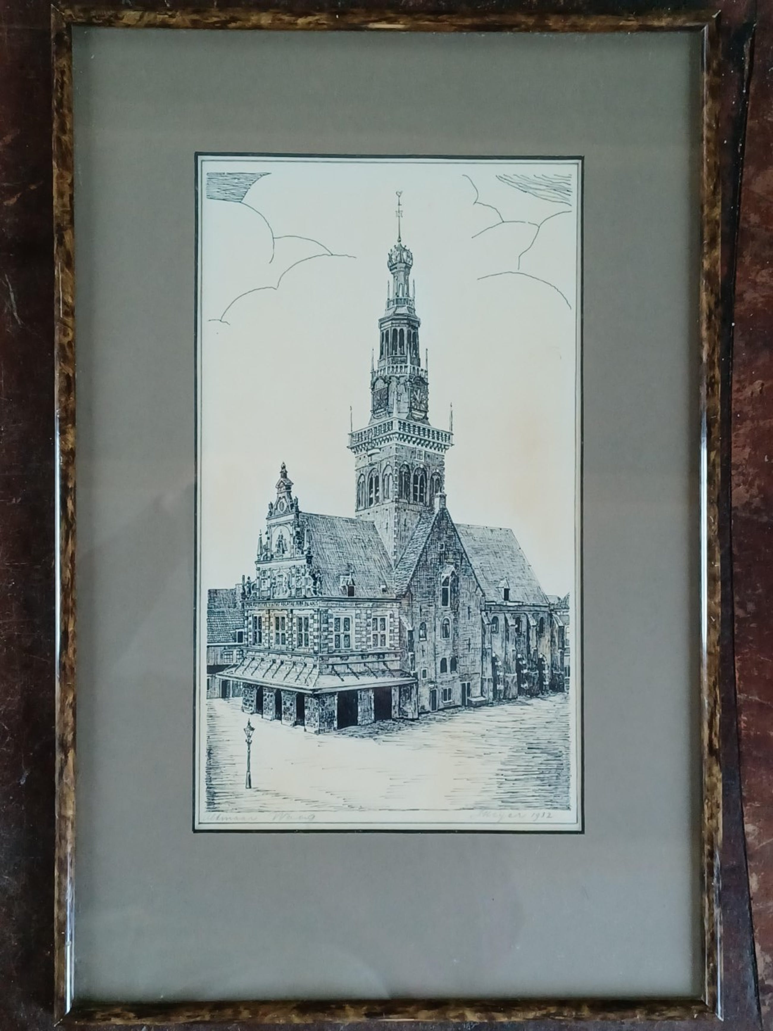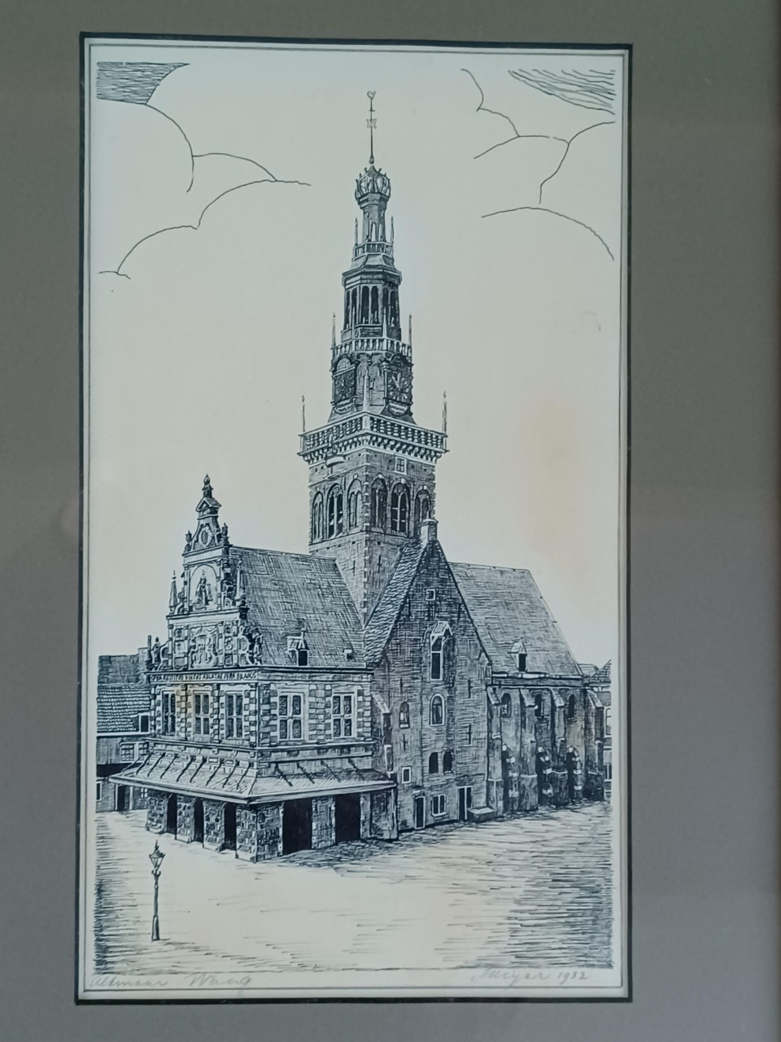Pentekening van J Meyer uit 1932. De Waag te Alkmaar. Er zijn meerdere kunstenaars met deze naam. Het is door mij niet vast te stellen om welke J Meyer het hier gaat. Mooi strak werk, wordt zeer goed verpakt verzonden.