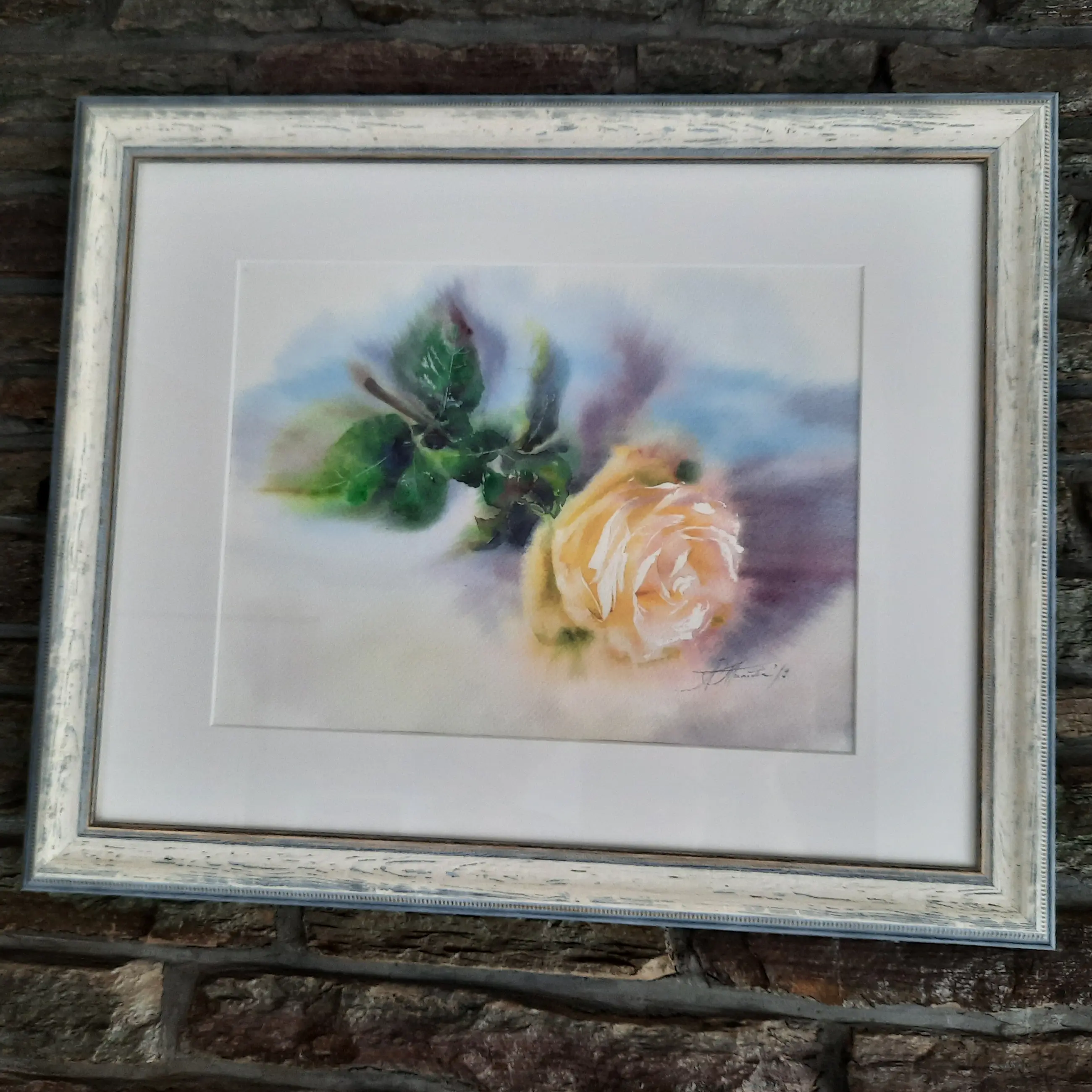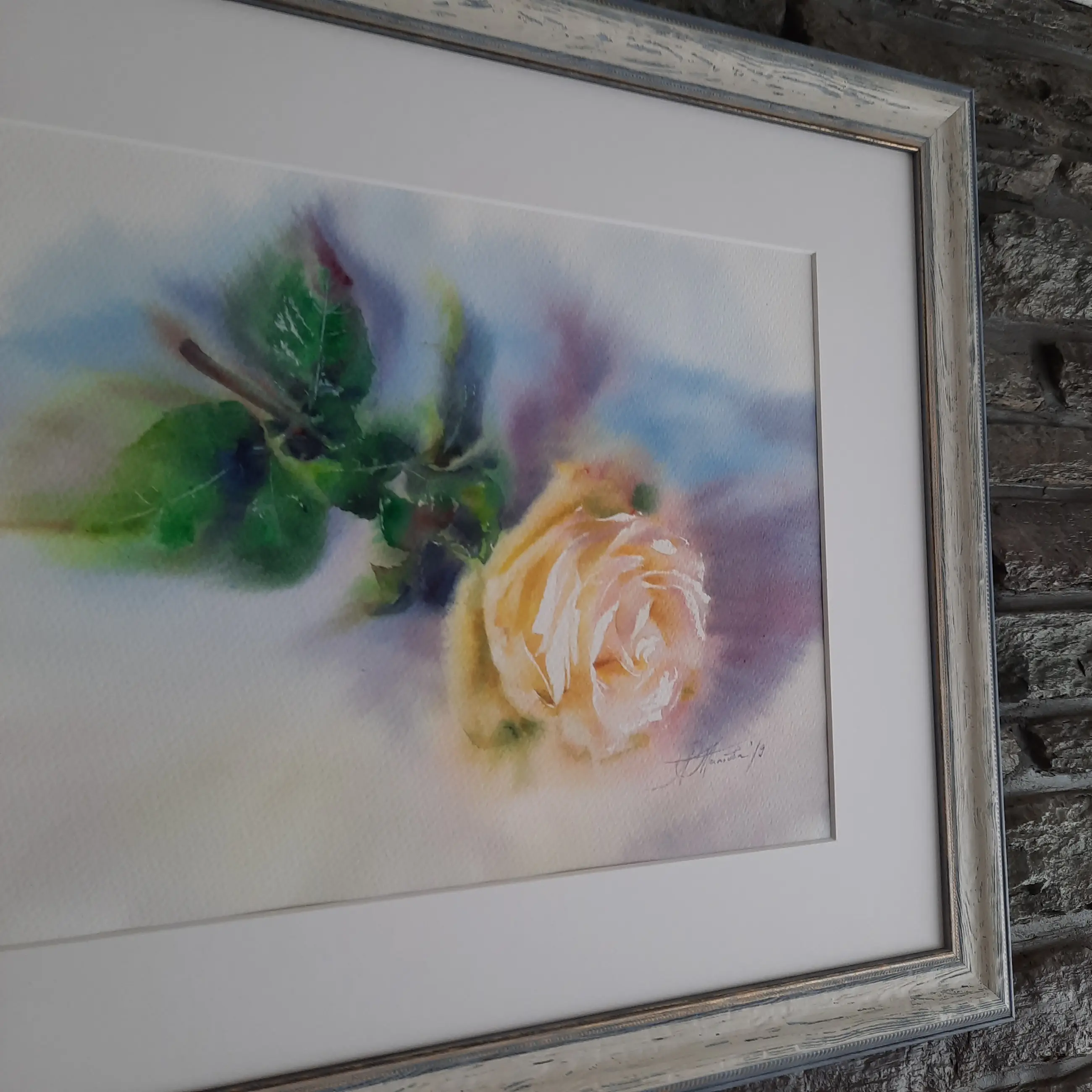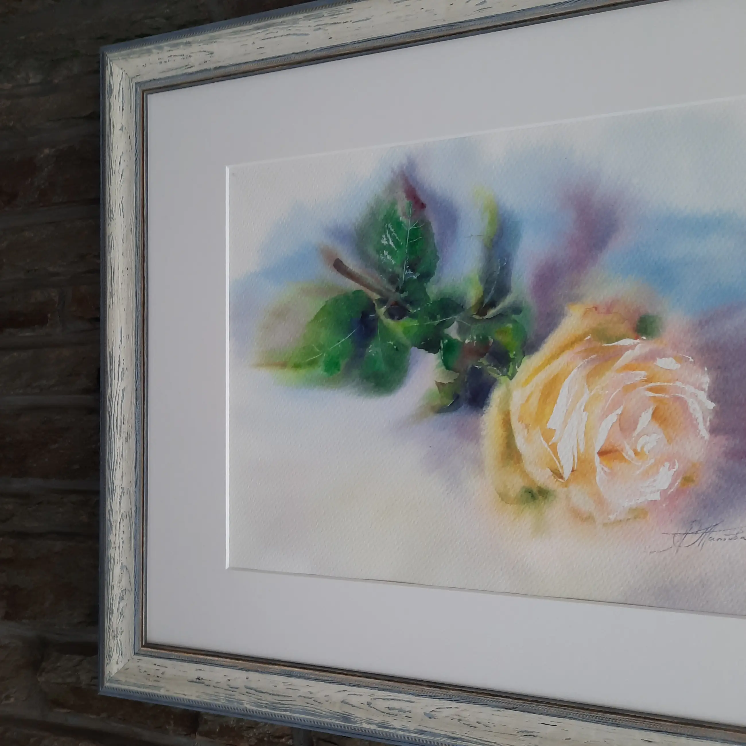 Deze betoverende aquarel van een zachtgele roos, afkomstig uit onze Nederlandse kunstgalerij (NL Art Eindhoven), is een meesterwerk van verfijning.