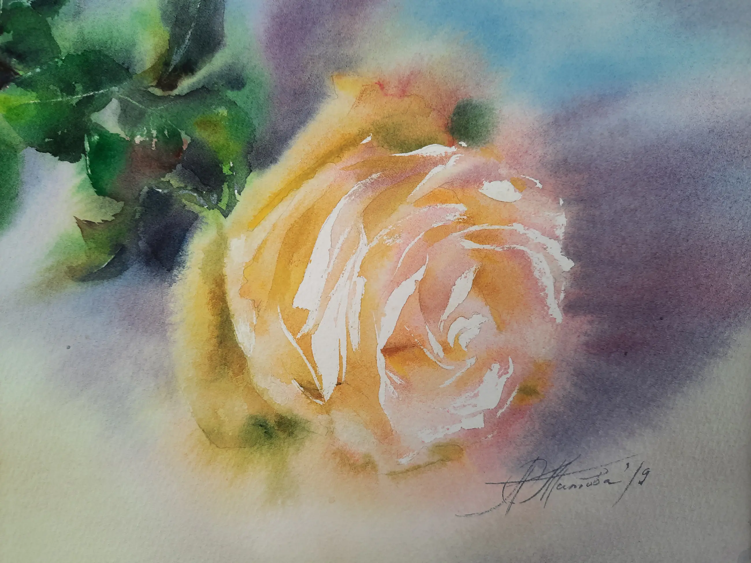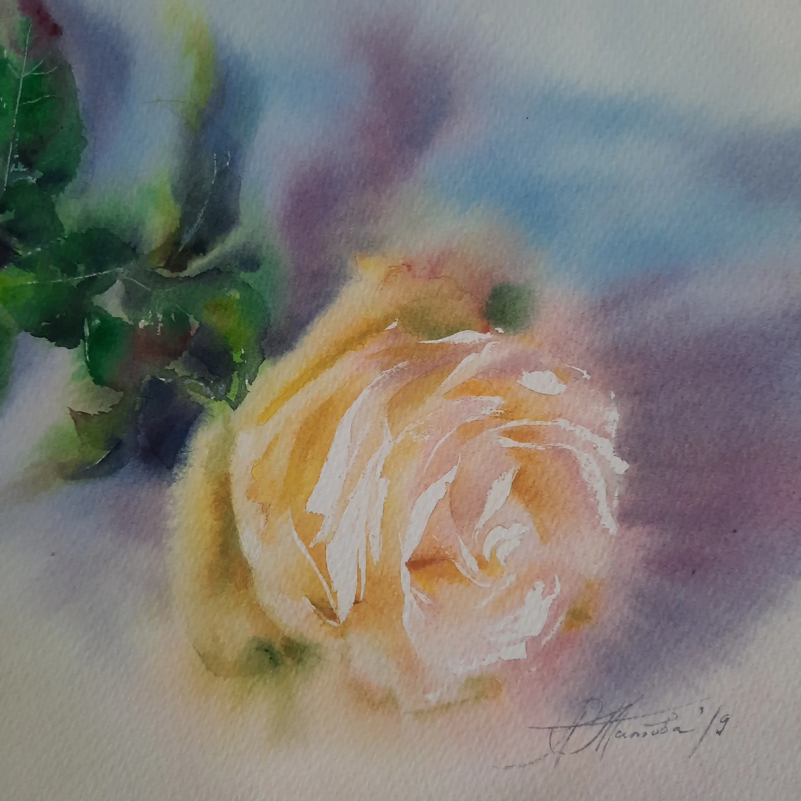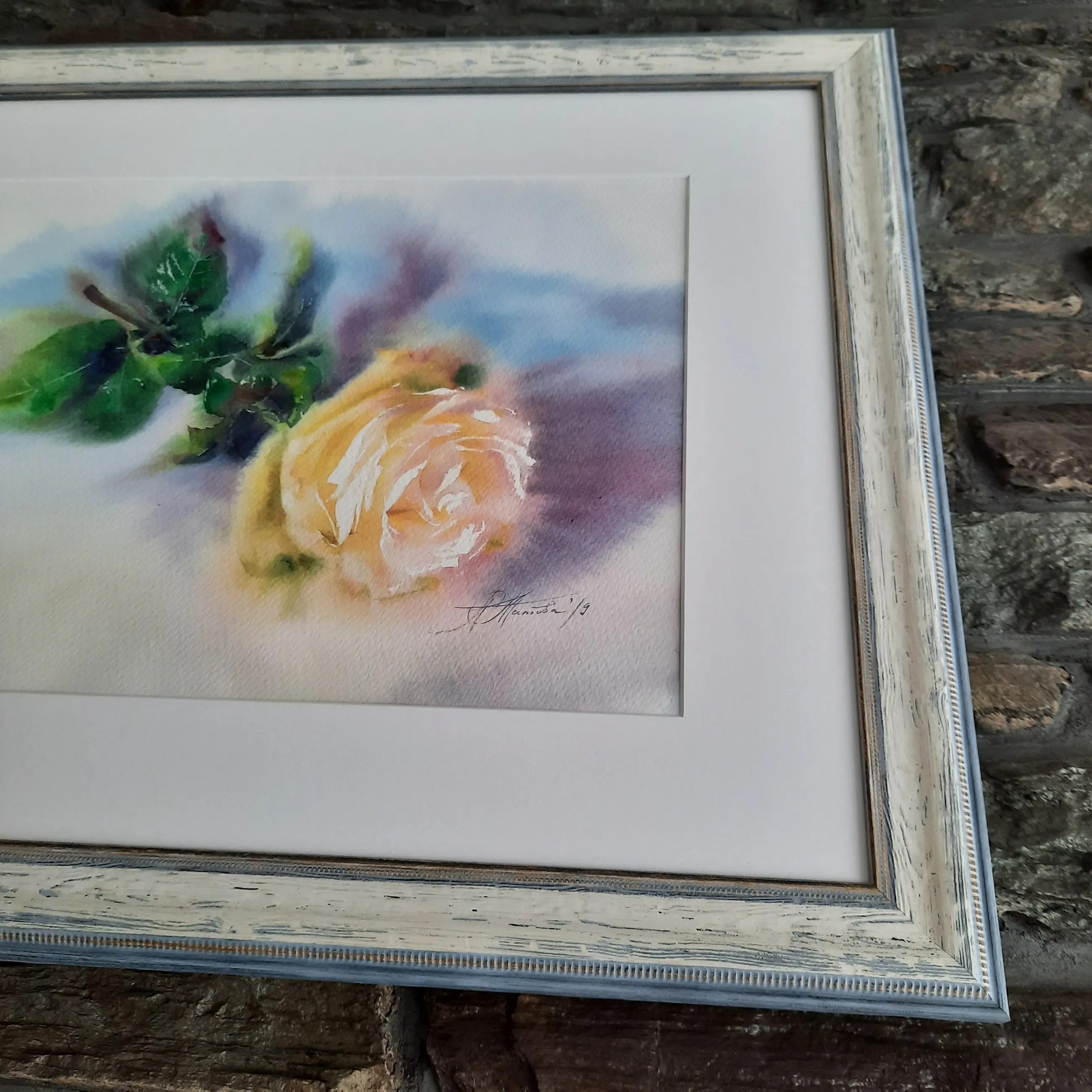 Deze betoverende aquarel van een zachtgele roos, afkomstig uit onze Nederlandse kunstgalerij (NL Art Eindhoven), is een meesterwerk van verfijning.