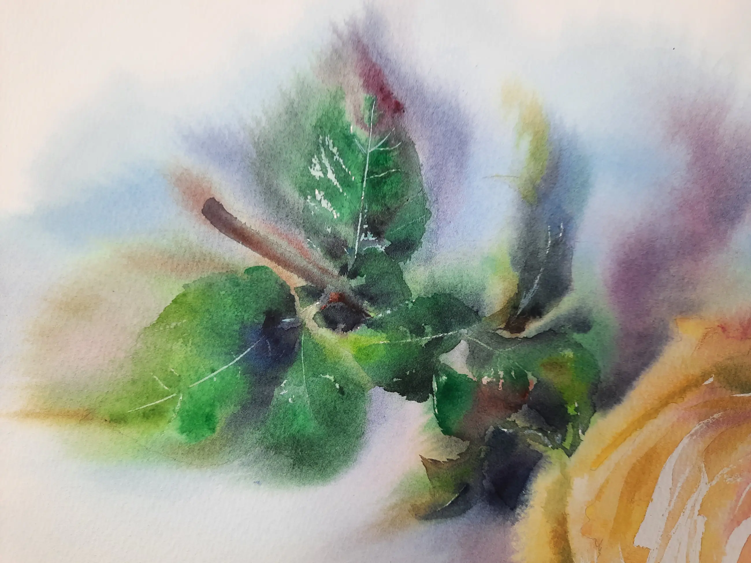 De kunstenaar beheerst de aquareltechniek volledig, met een vakkundig gevoel voor kleurgebruik dat de delicate overgangen van warm geel naar subtiele schaduwen en levendig groen tot leven brengt.