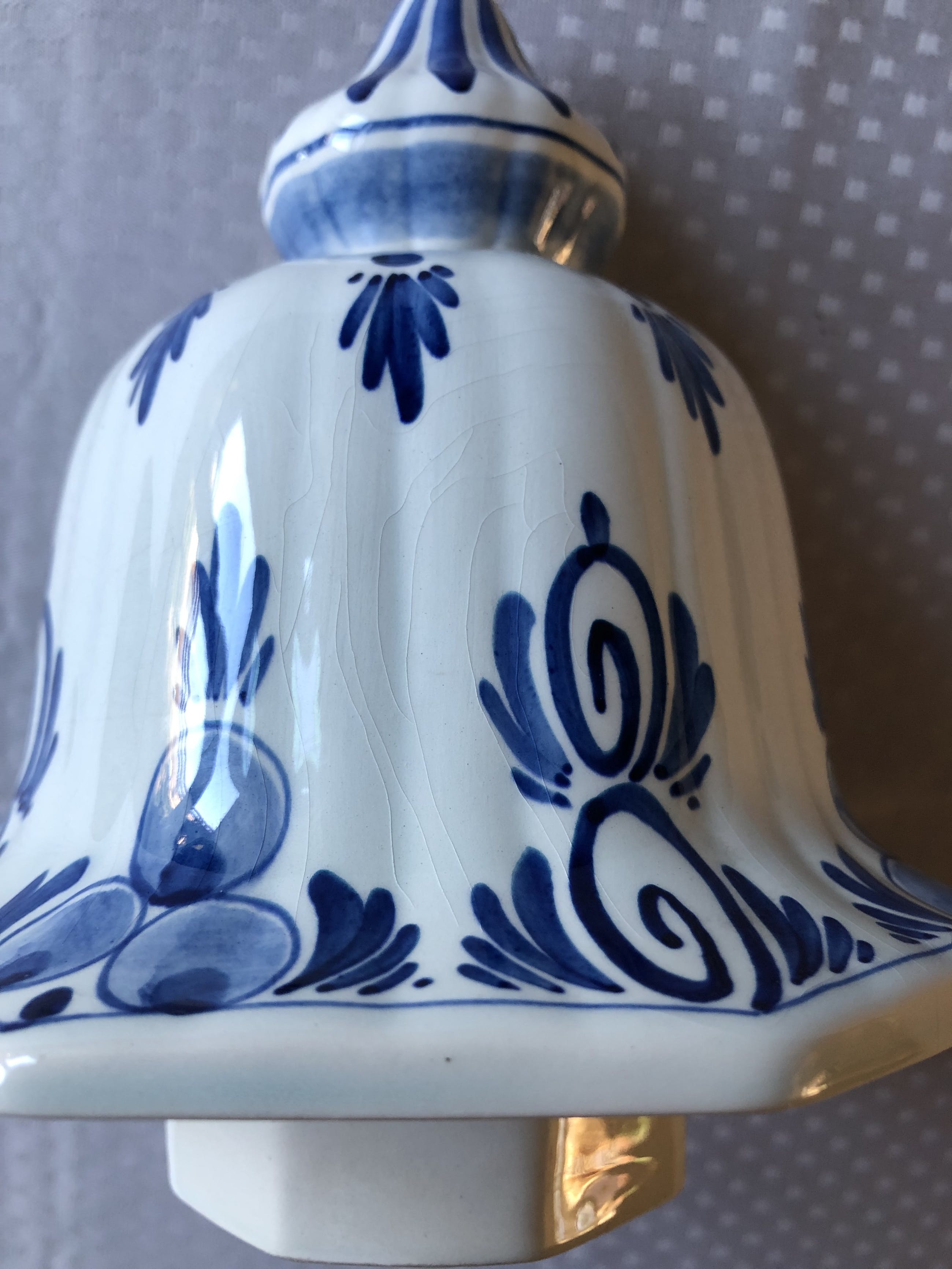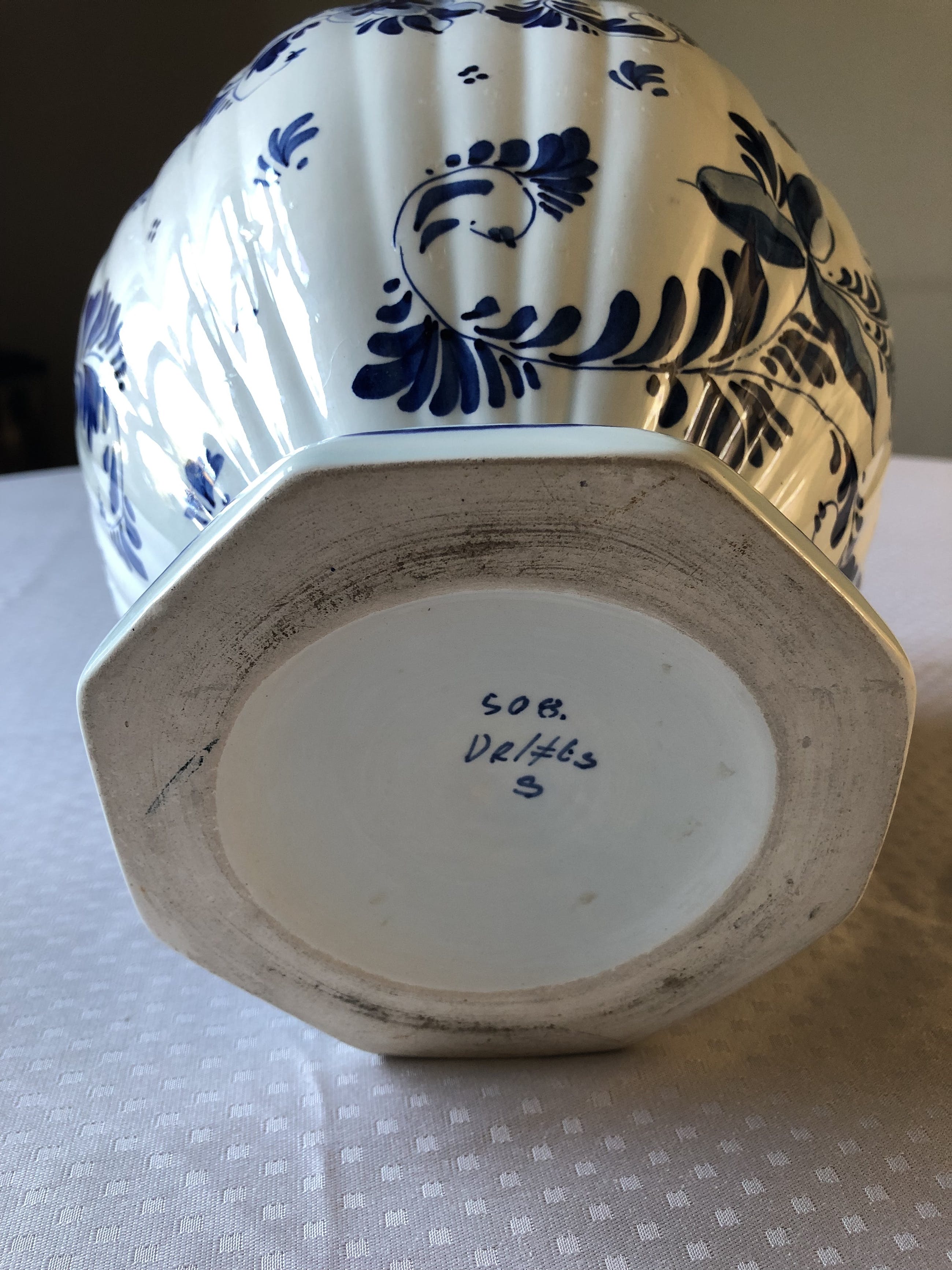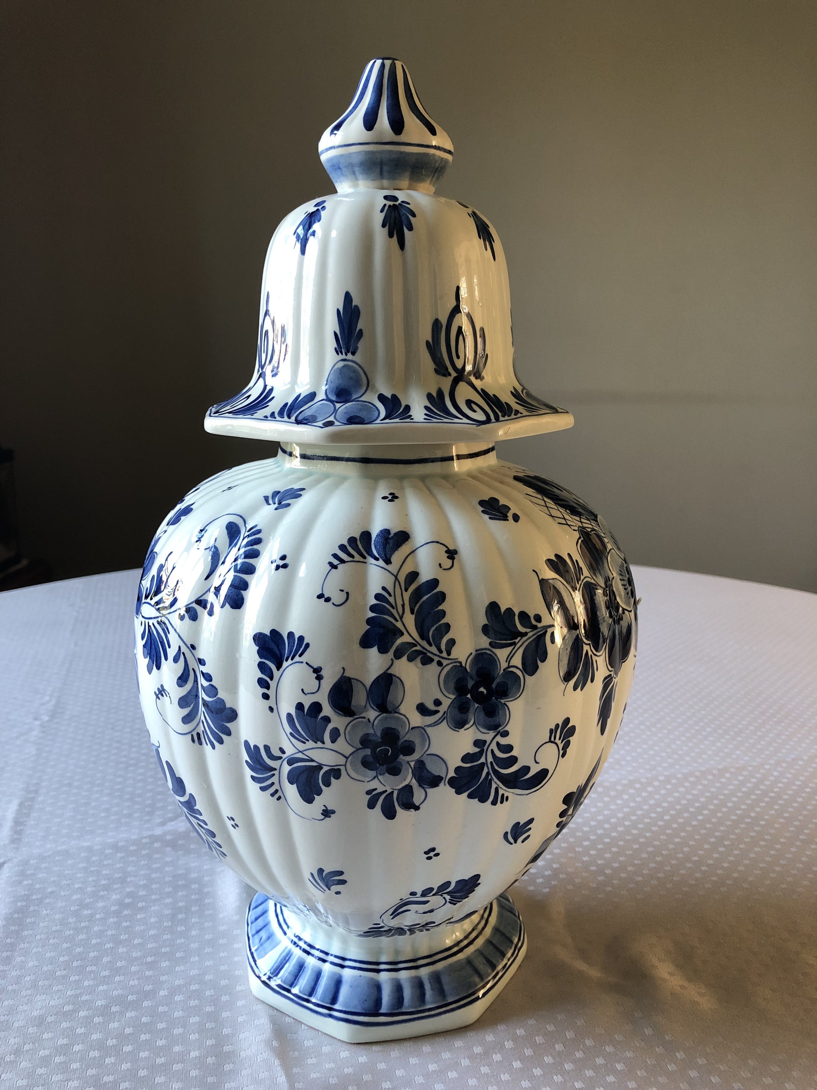 Delfts Blauwe dekselpot of dekselvaas. Geribbeld en gesierd met traditioneel bloemenmotief.