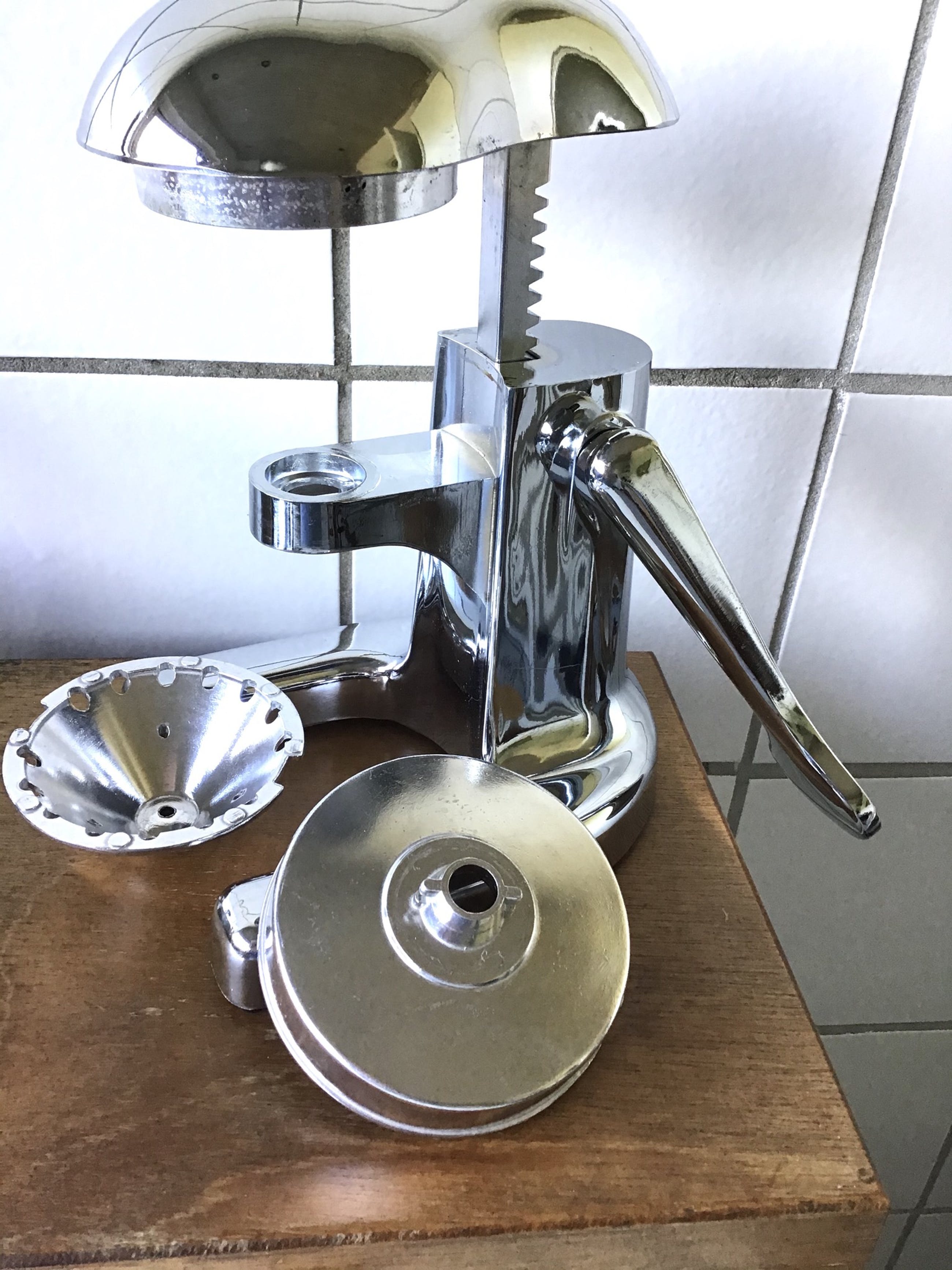 Zware chroom sinaasappel pers Tevens geschikt voor Citroenen en en grapefruits Design ontwerp jaren 60-70 Afmetingen ca18x19cm De losse onderdelen zijn heel makkelijk te reinigen. Een sieraad in de keuken Conditie uitstekend Wordt aangetekend verzonden