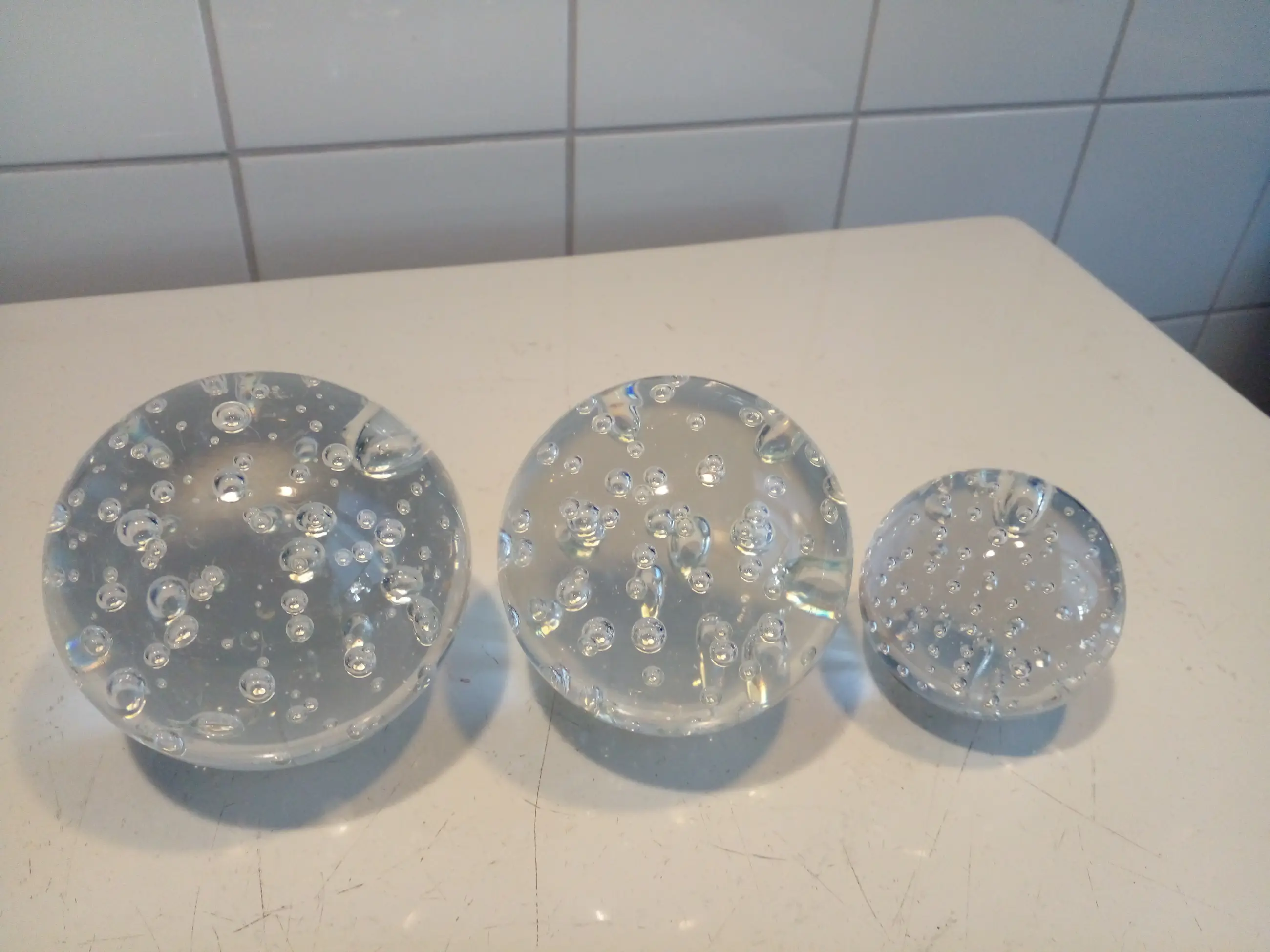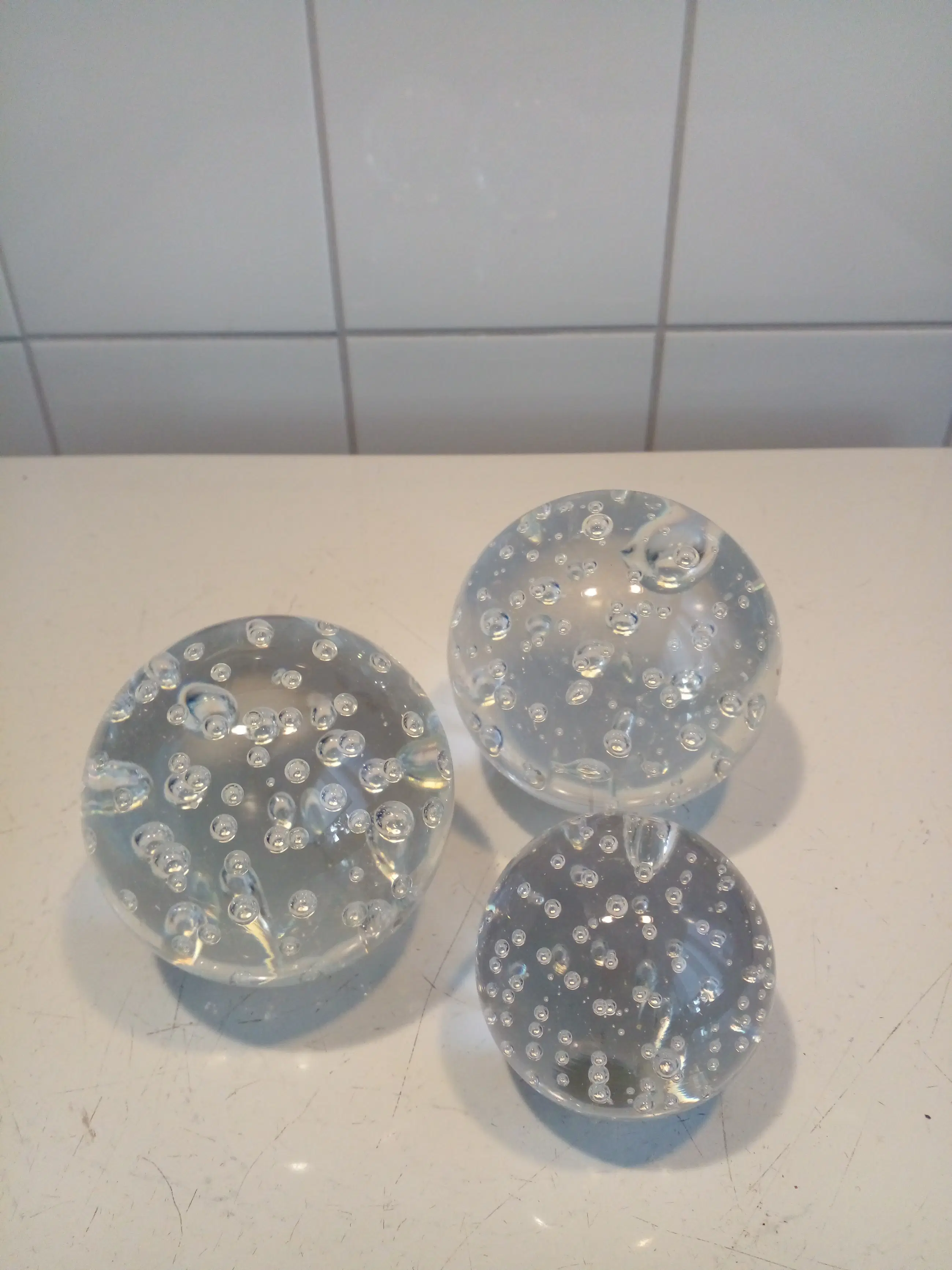 Design & Glas Type kunstwerk Glas Ingelijst Niet Ingelijst Afmetingen 9 x 9 cm Info Glaskunst set van drie objecten van groot naar klein. De grootste gemeten. Met luchtbellen erin. Kunstenaar onbekend