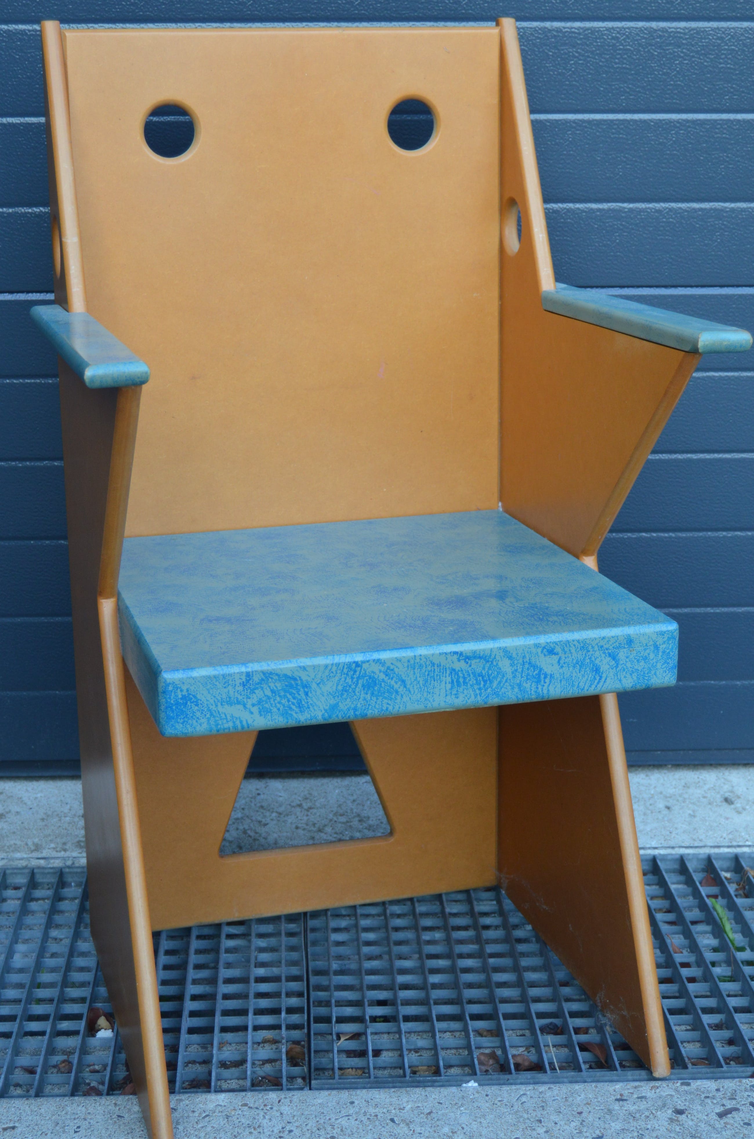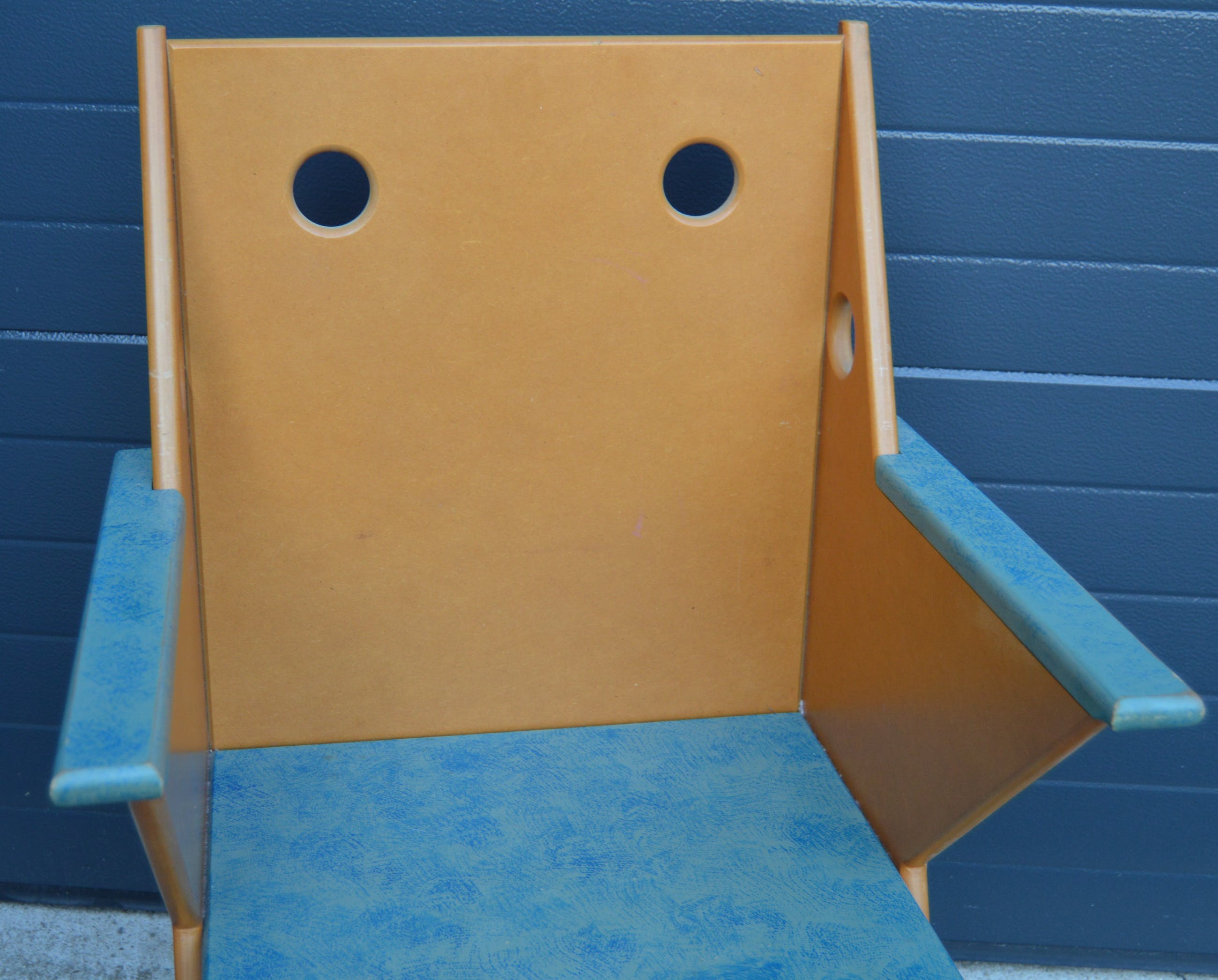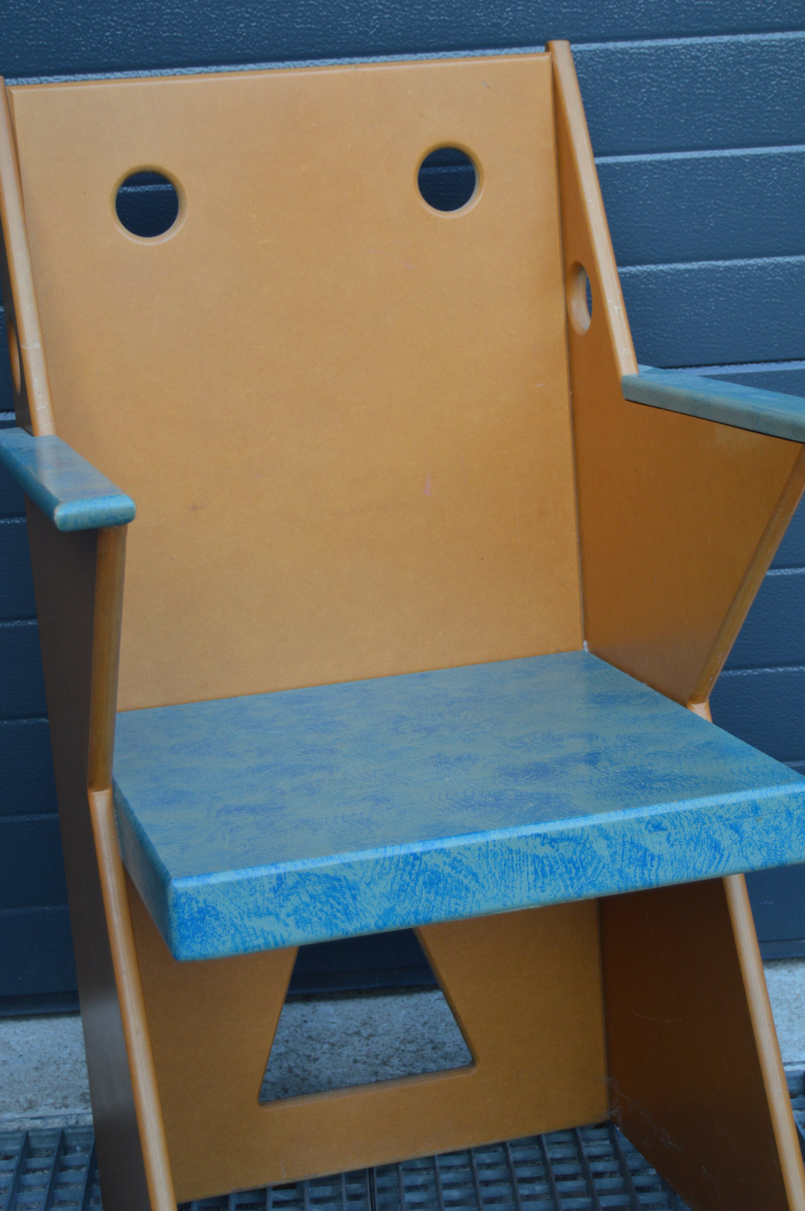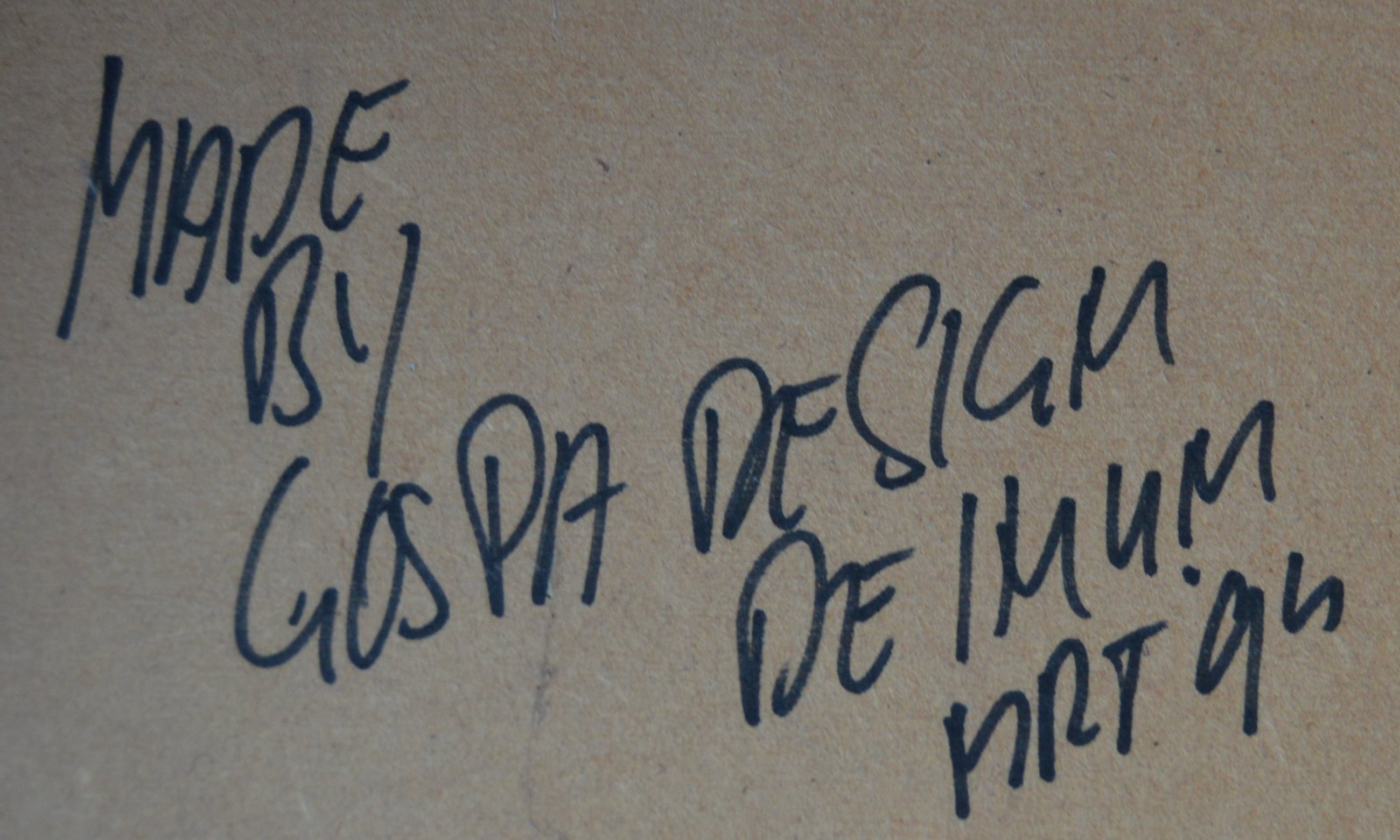 Prachtig strak vormgegeven stoel. Afmtingen rugzijde; Hoog; 96 cm. Breed; 48 cm. Zitting; 45 x 45 cm. Armleuning; lang 49 cm. Zithoogte; 45 cm. Onderzijde zitting vermeld; GOSPA DESIGN DE IMUM. Gedateerd; maart '94.