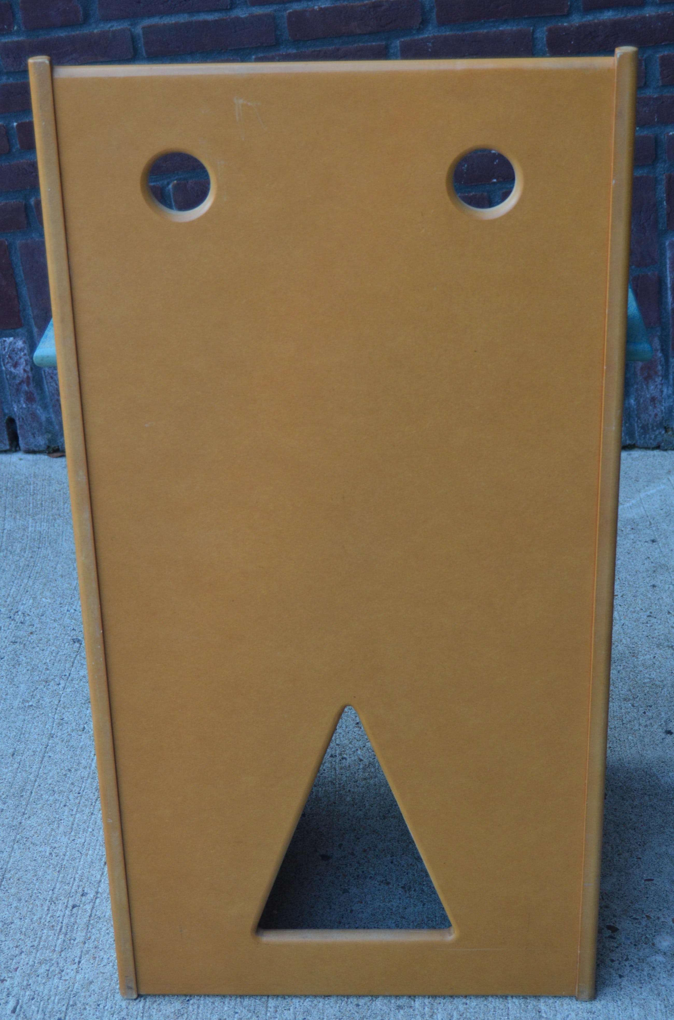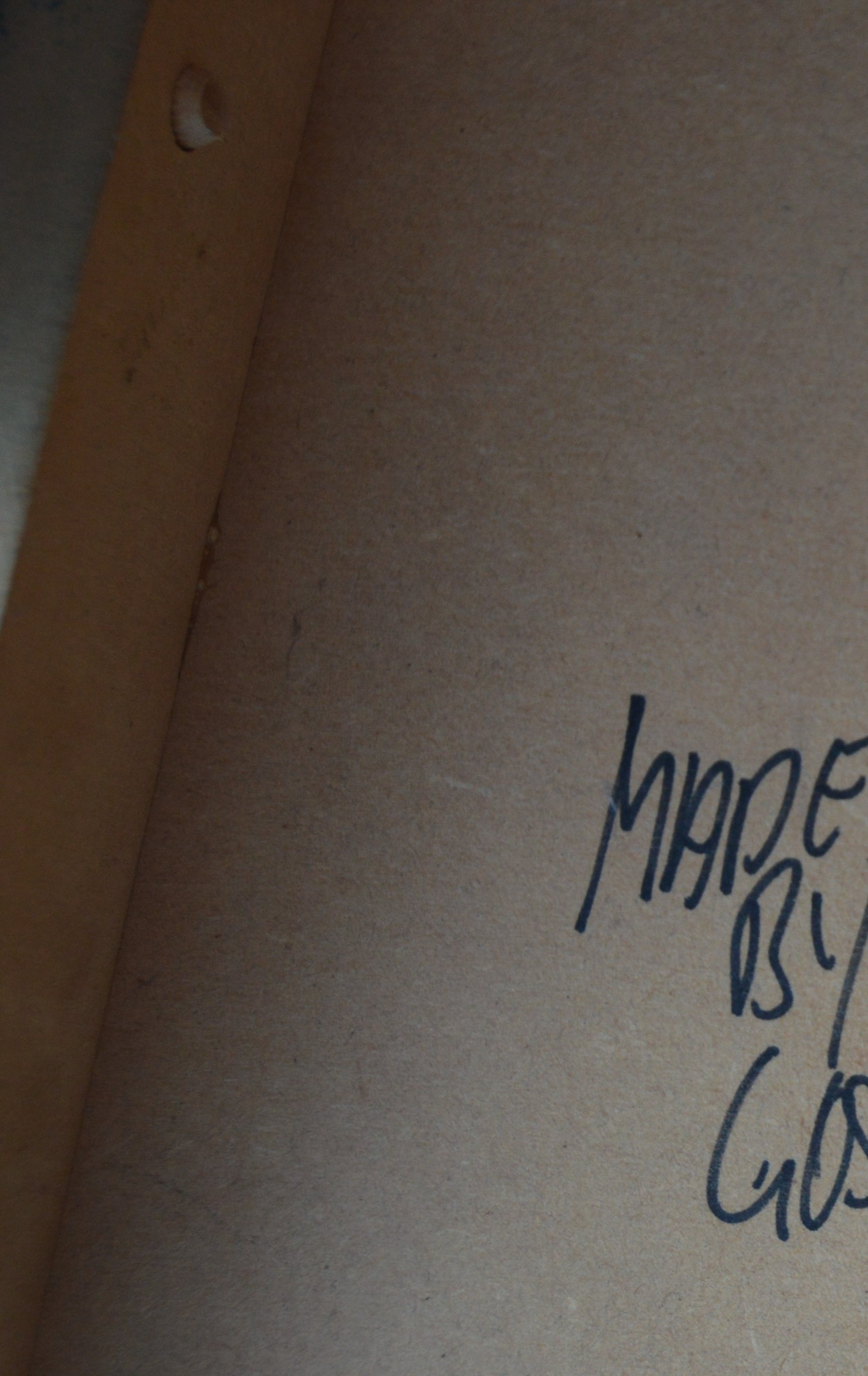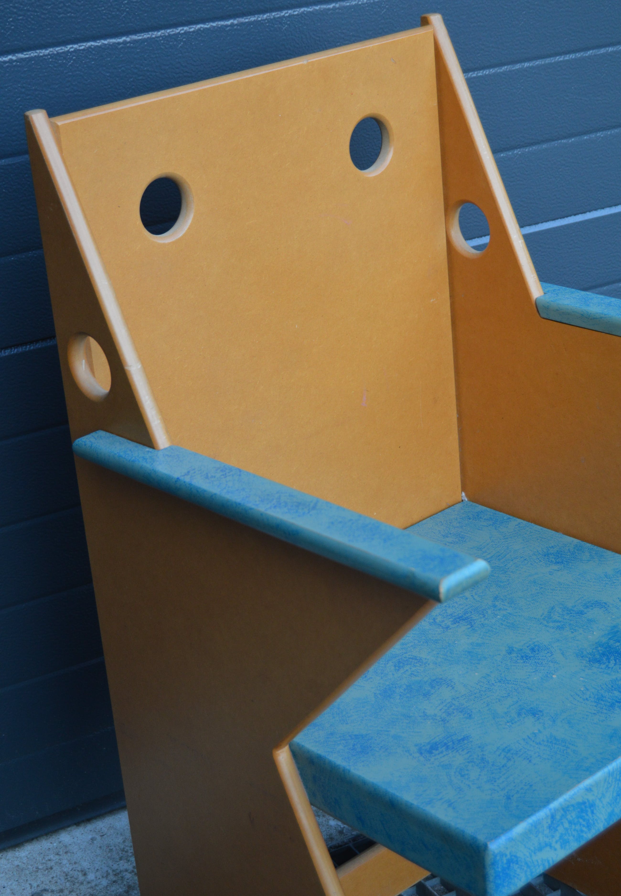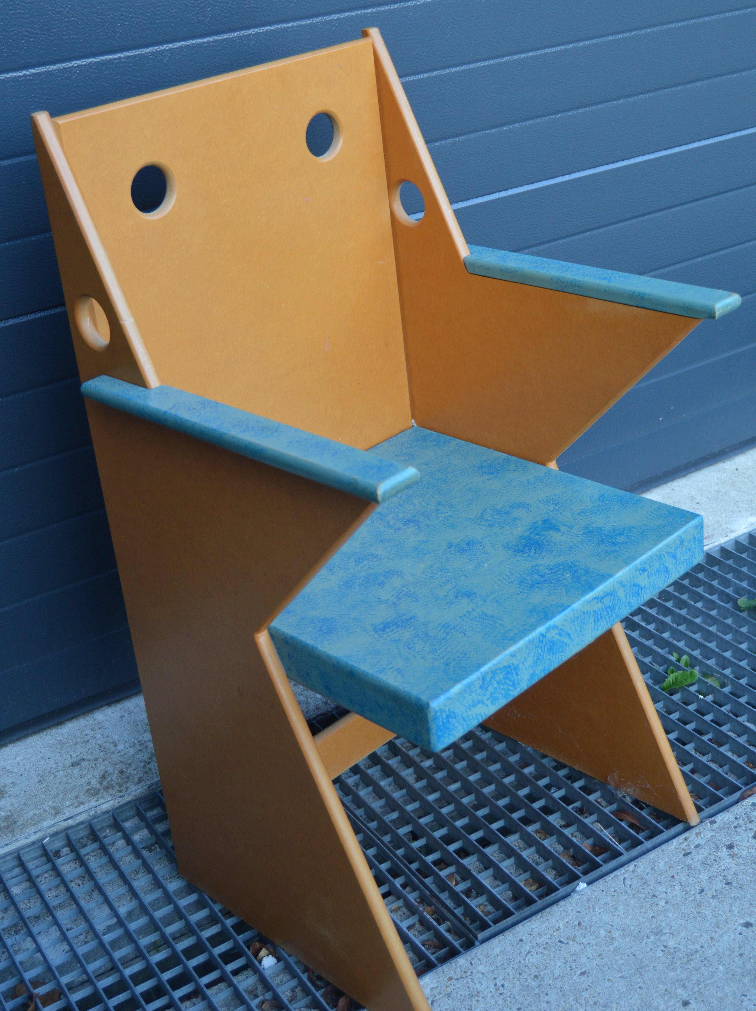 Prachtig strak vormgegeven stoel. Afmtingen rugzijde; Hoog; 96 cm. Breed; 48 cm. Zitting; 45 x 45 cm. Armleuning; lang 49 cm. Zithoogte; 45 cm. Onderzijde zitting vermeld; GOSPA DESIGN DE IMUM. Gedateerd; maart '94.