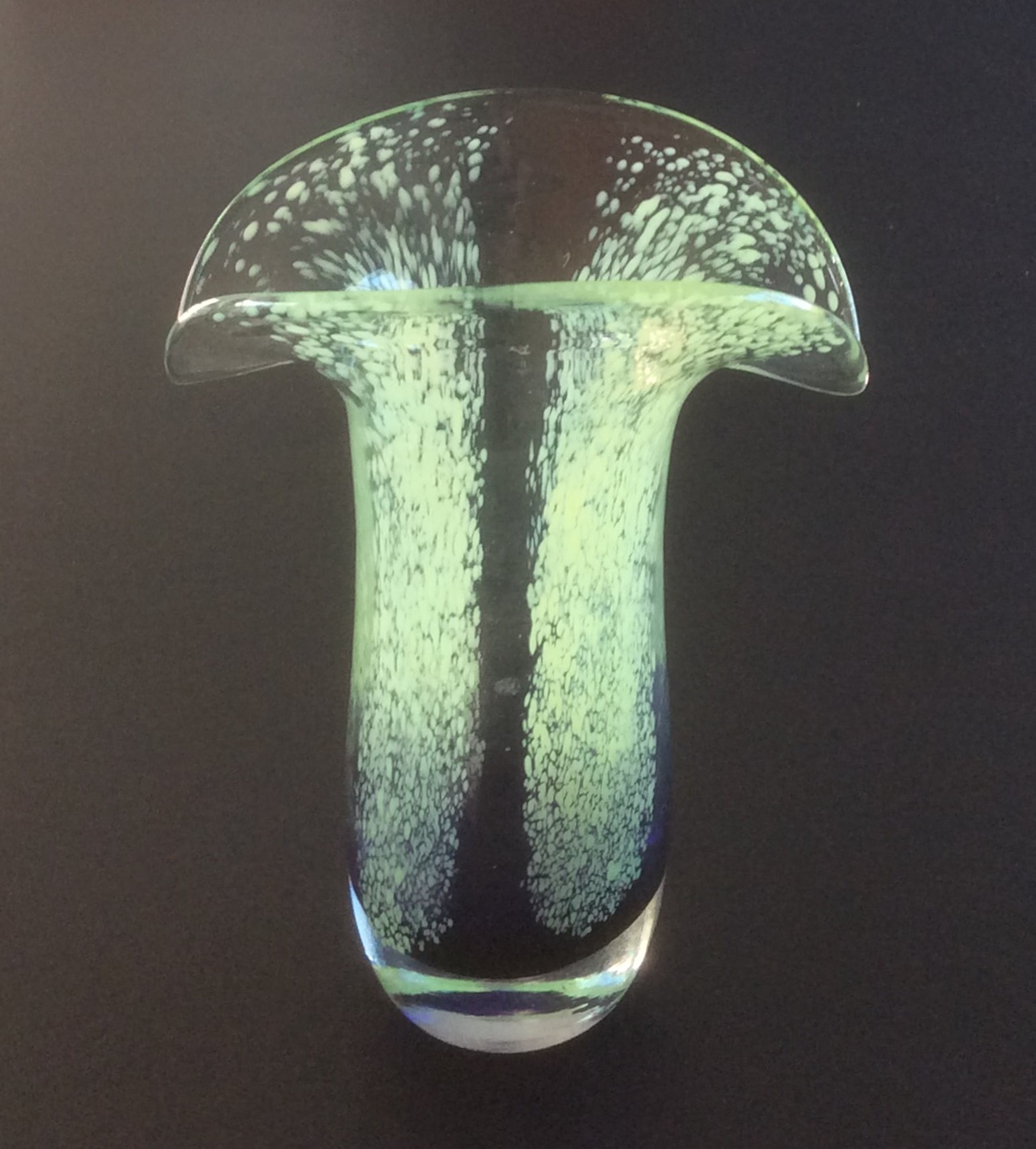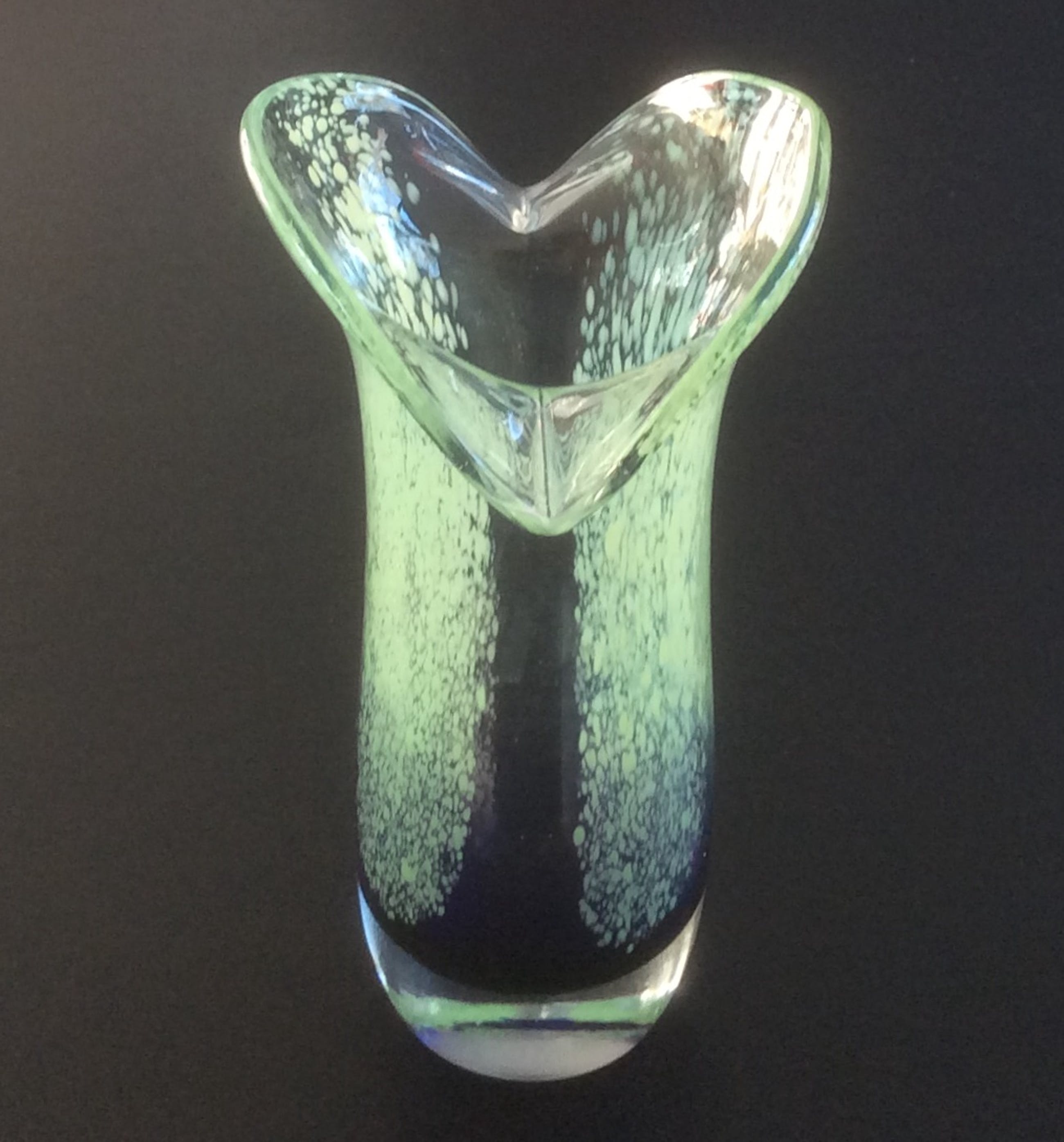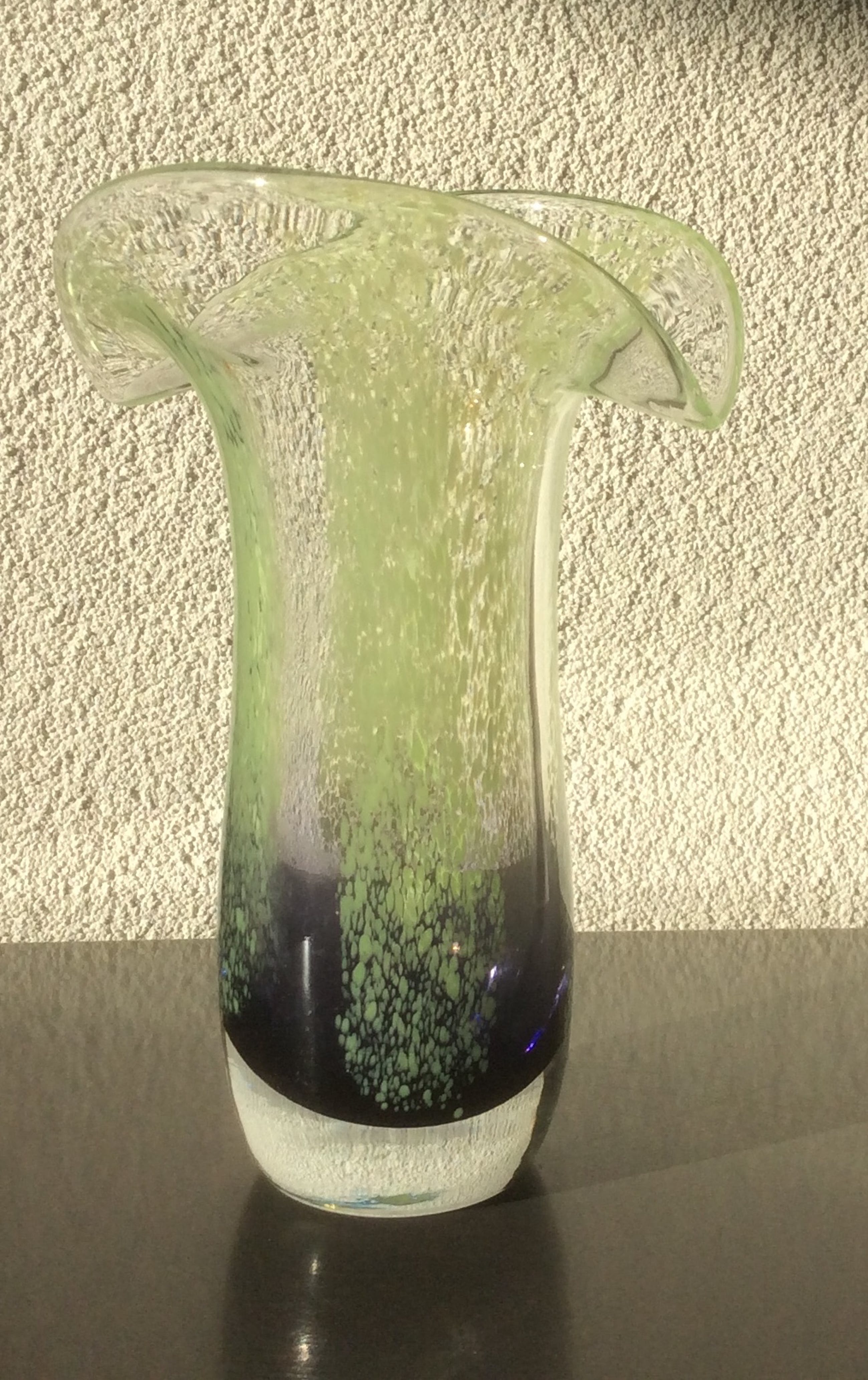 De handgemaakte designvaas heeft een murano-achtige uitstraling.