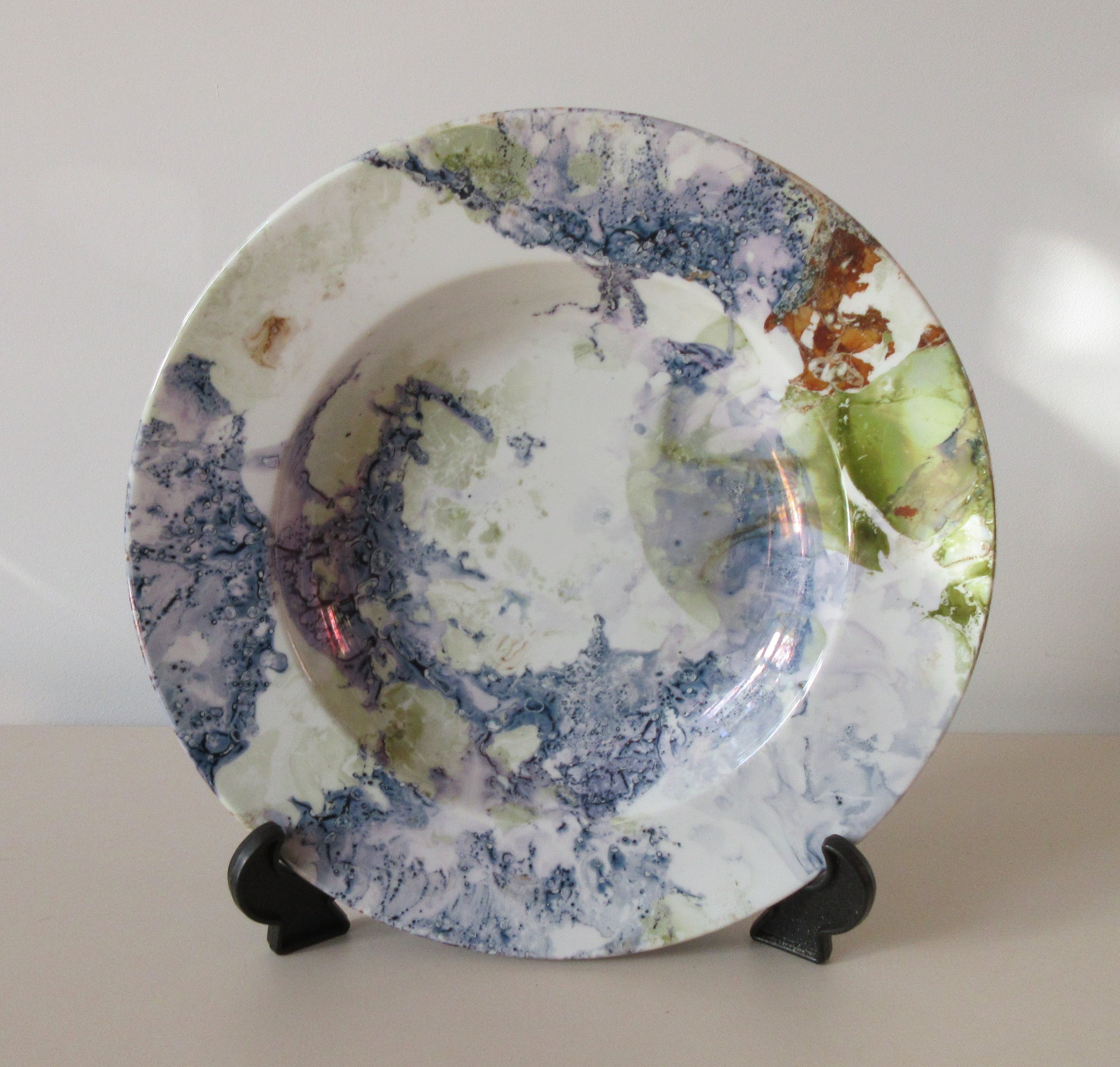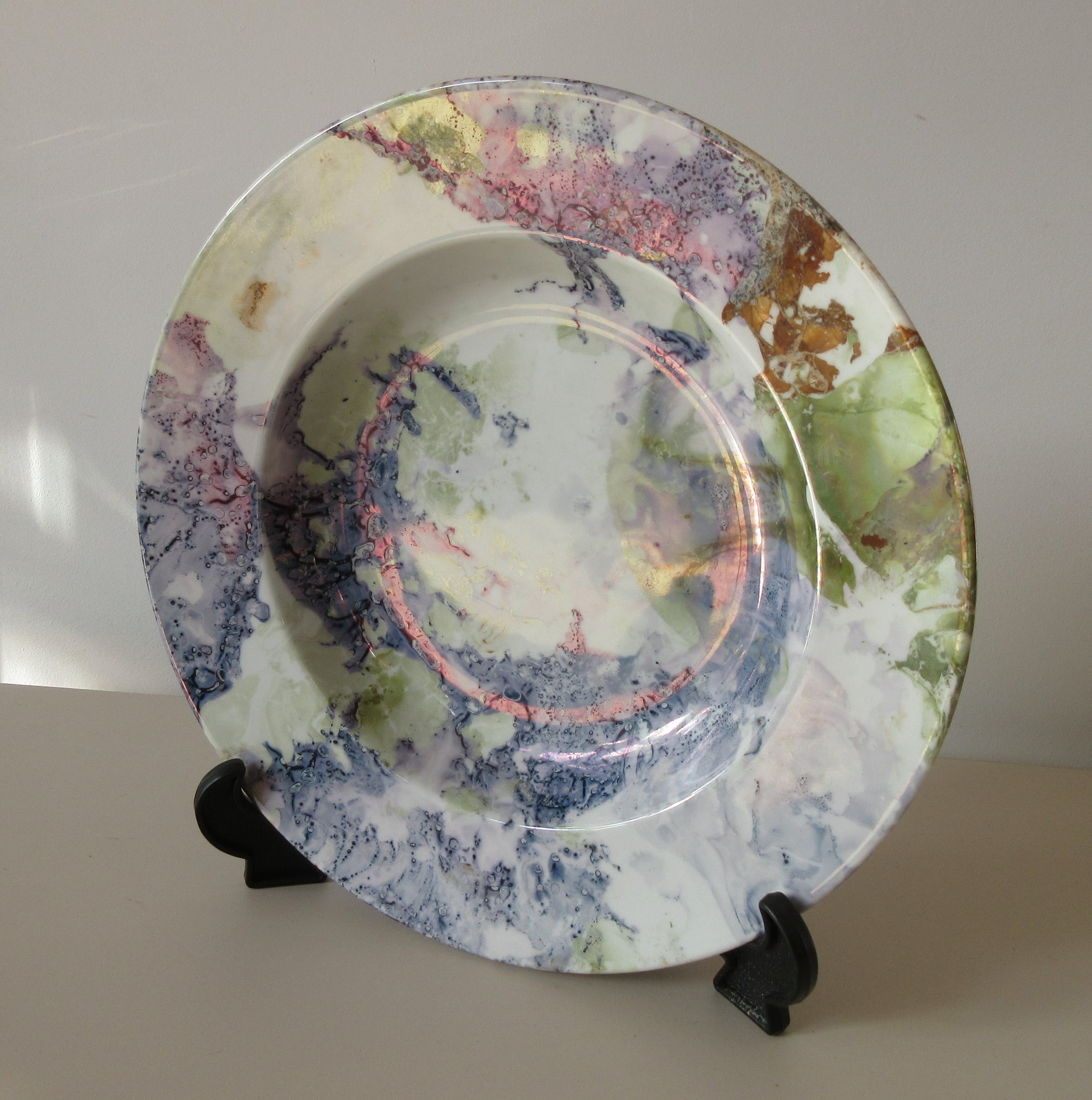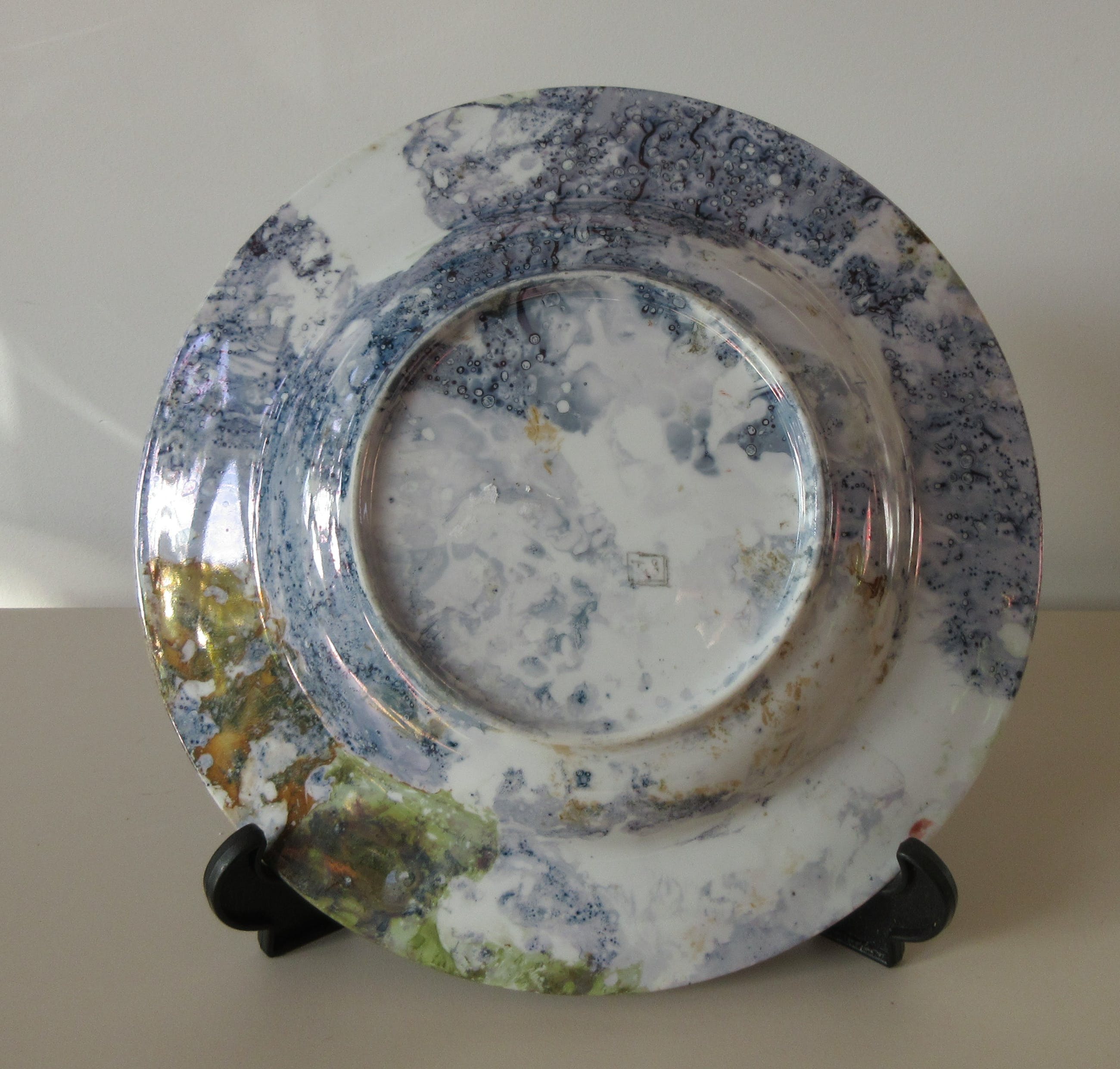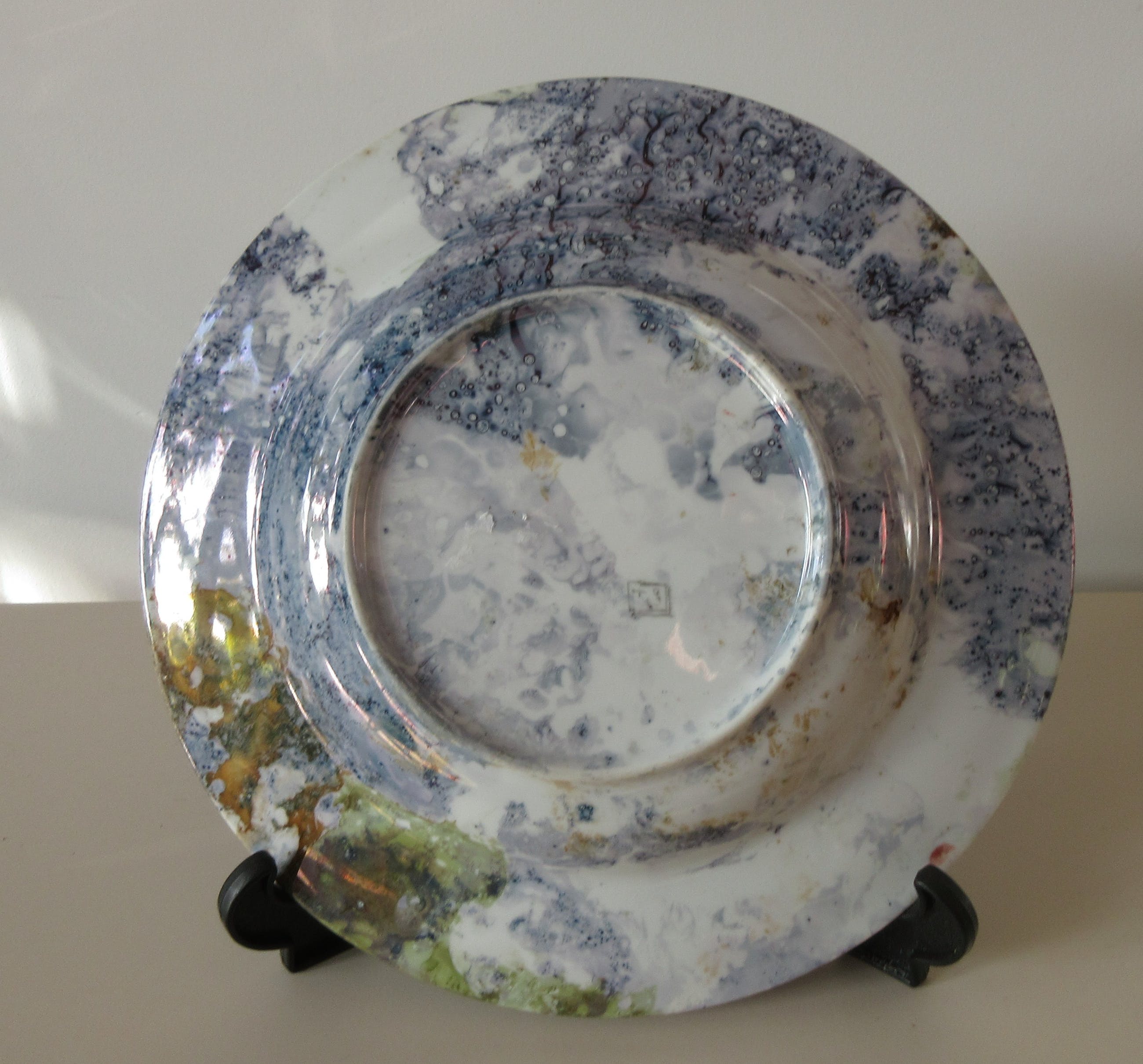 Diep Aziatisch Porseleinen bord met gemarmerd lustglazuren decoratie. Het bord heeft prachtige kleuren zoals brons groen, roestbruin, lila en zee blauw. Het bord is onbeschadigd en gemerkt aan de achterzijde.