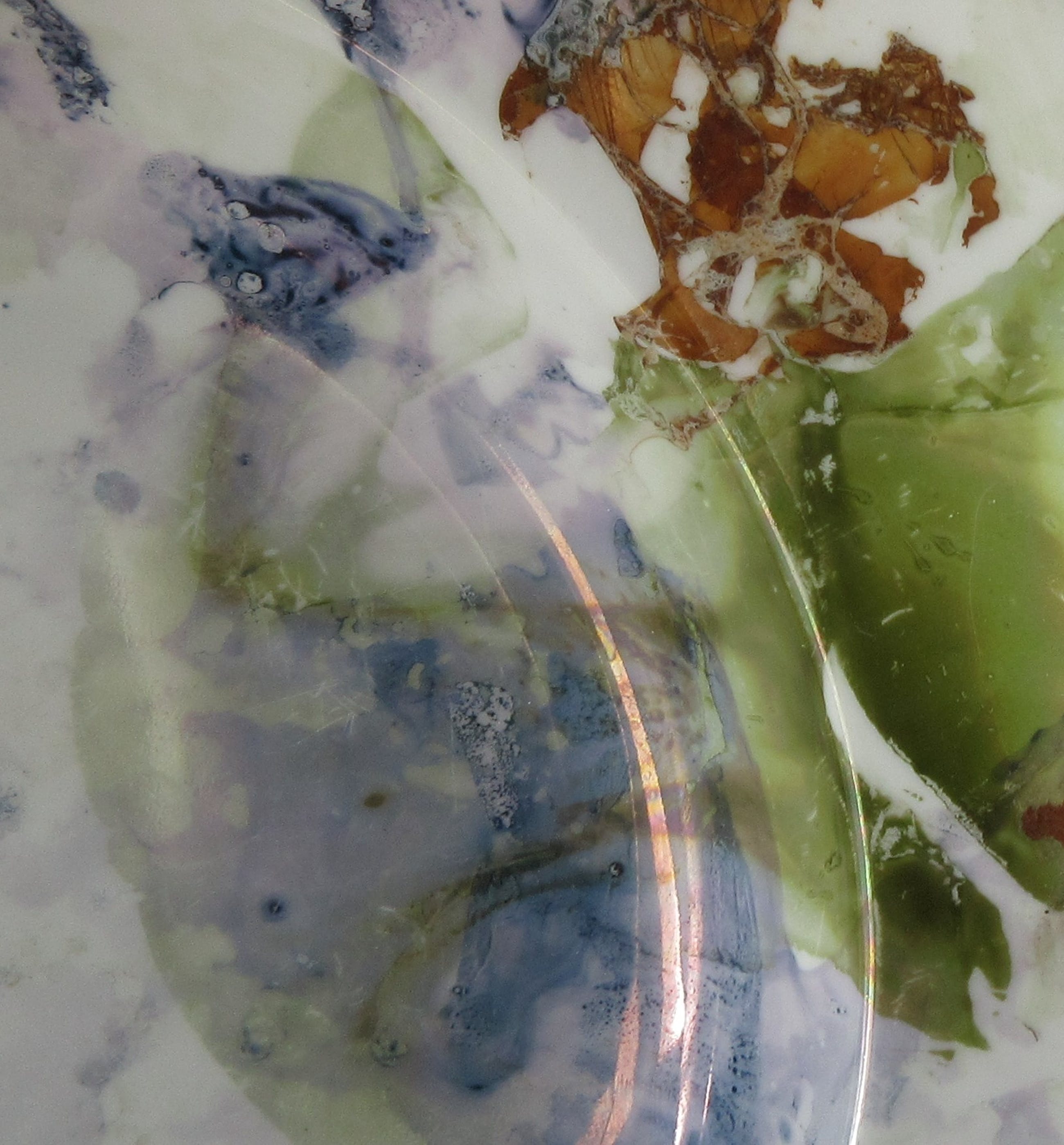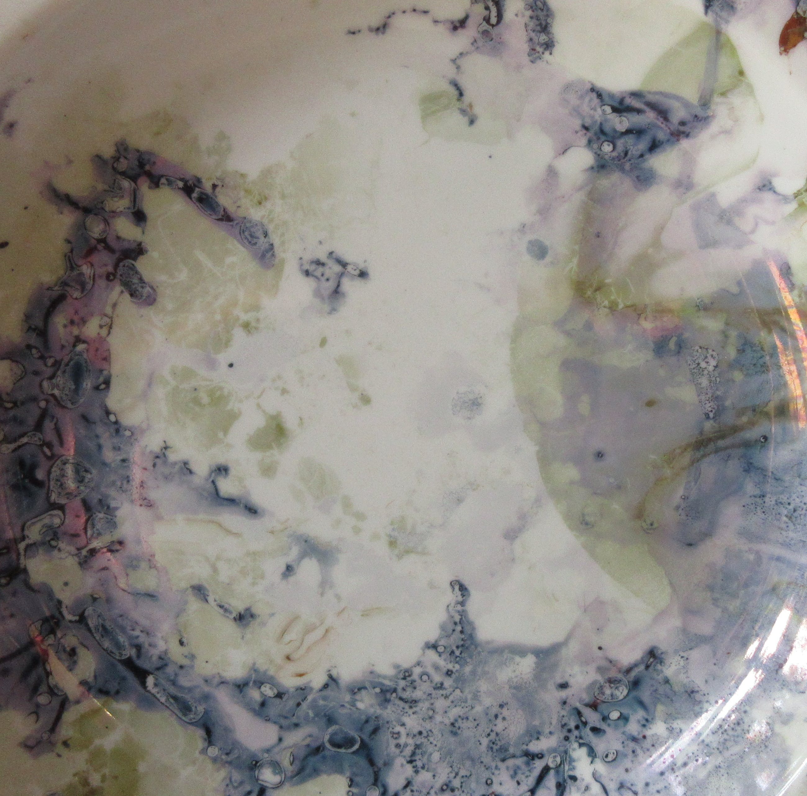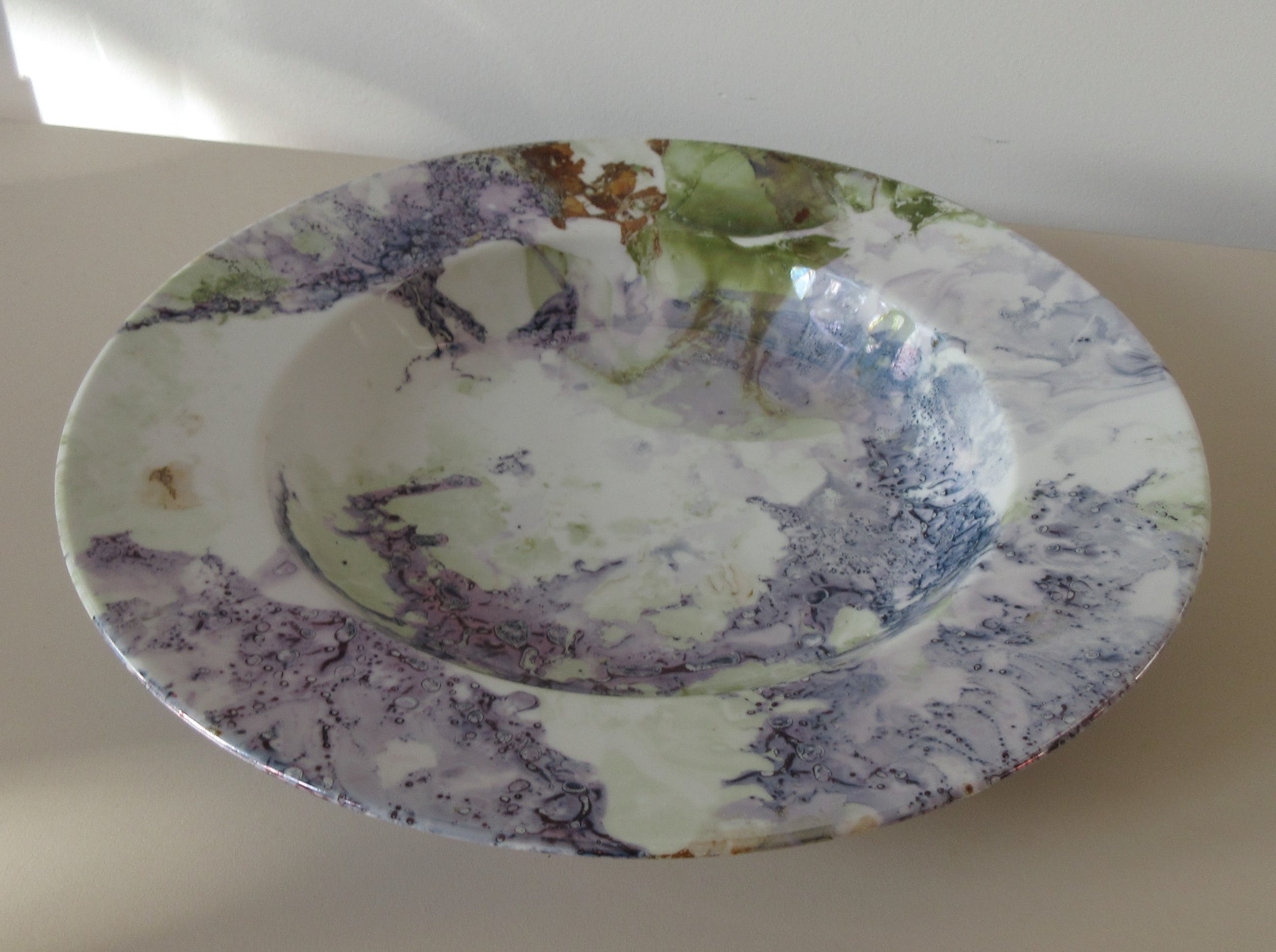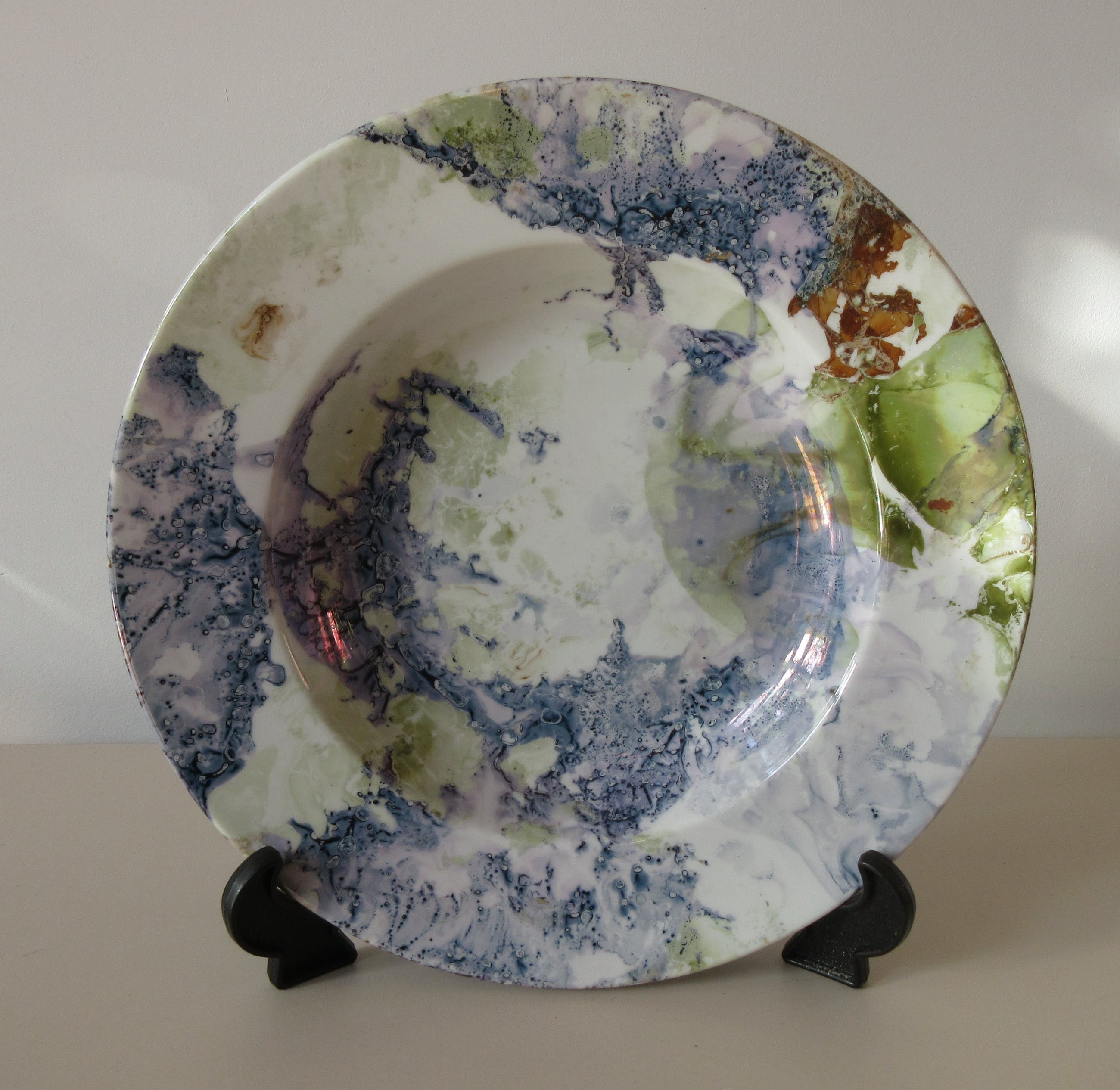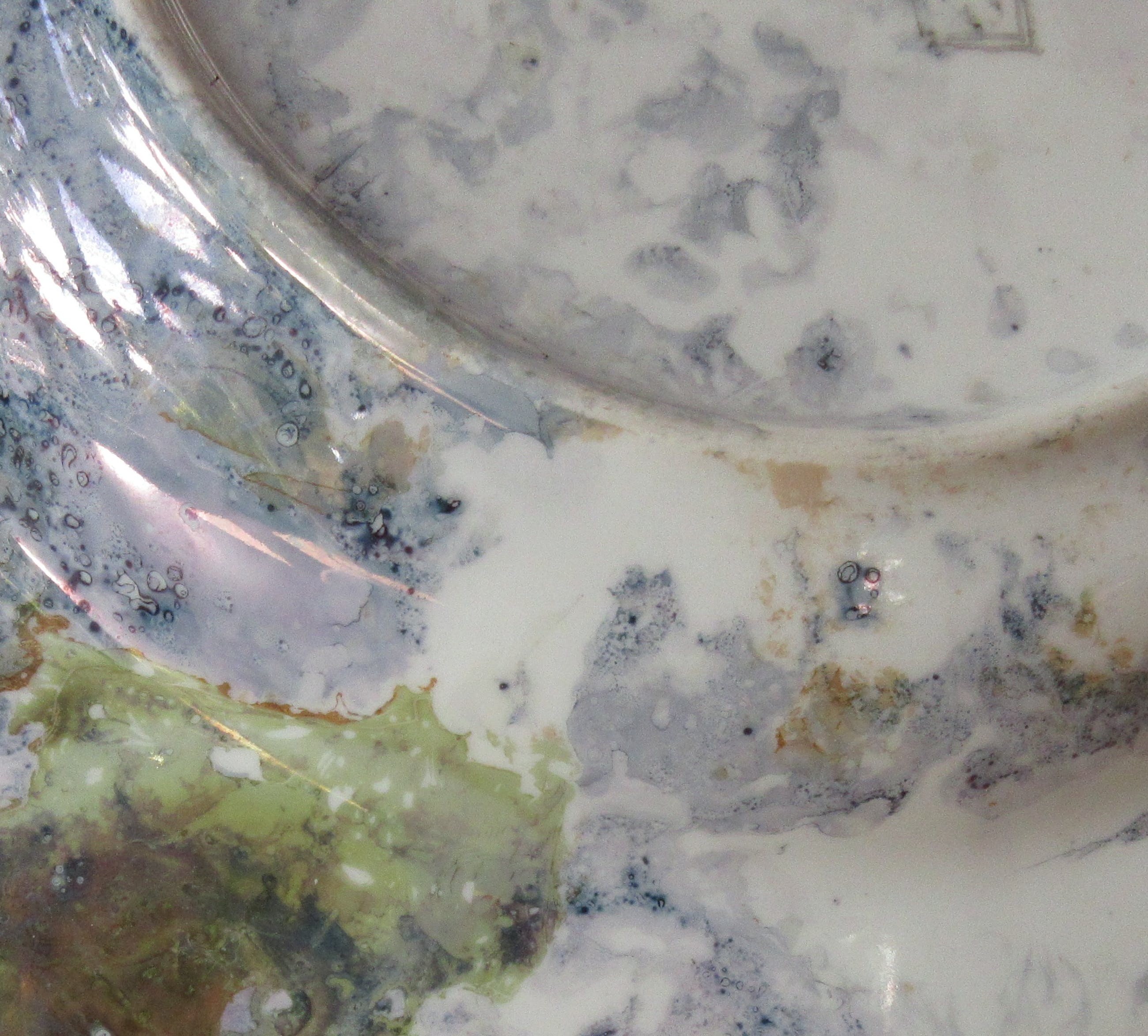 Diep Aziatisch Porseleinen bord met gemarmerd lustglazuren decoratie. Het bord heeft prachtige kleuren zoals brons groen, roestbruin, lila en zee blauw. Het bord is onbeschadigd en gemerkt aan de achterzijde.