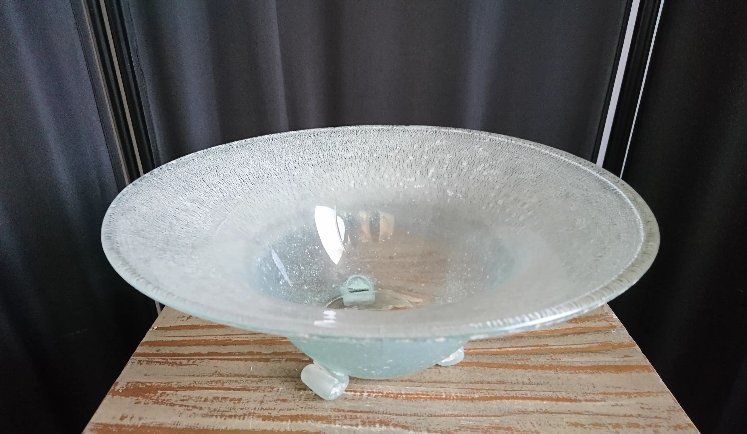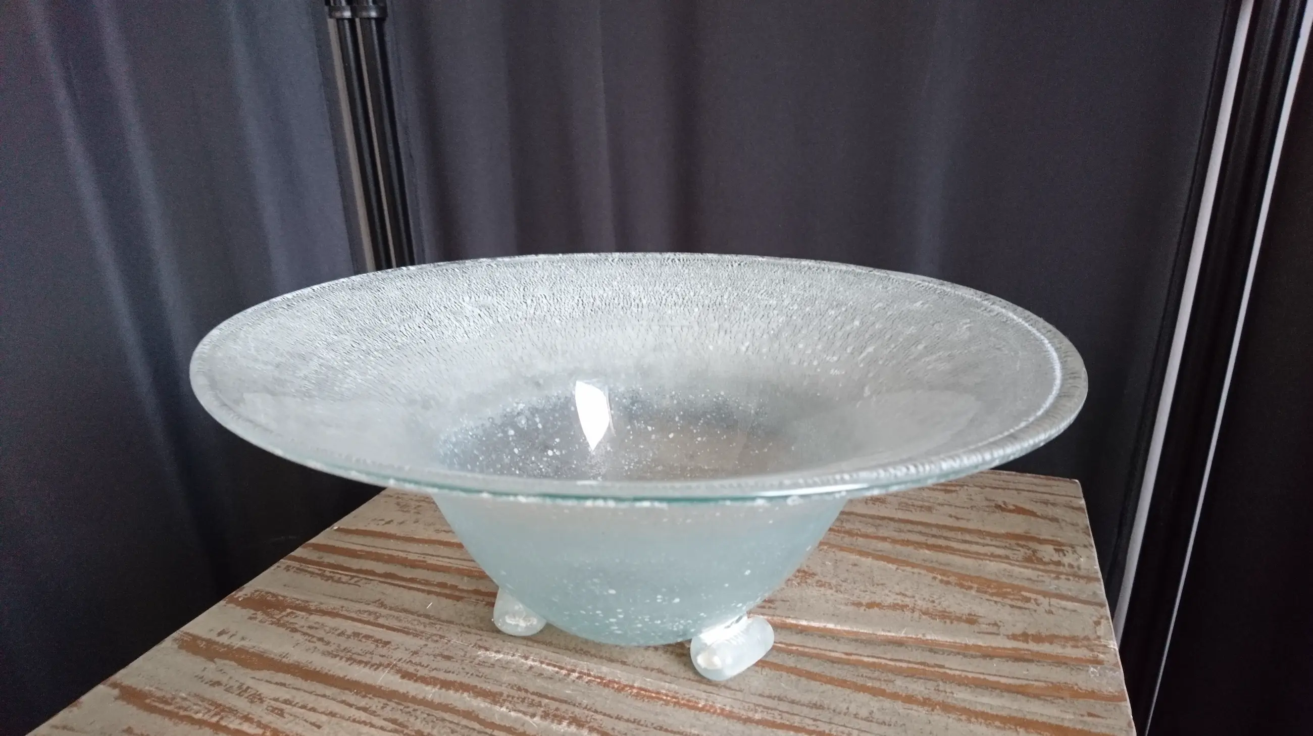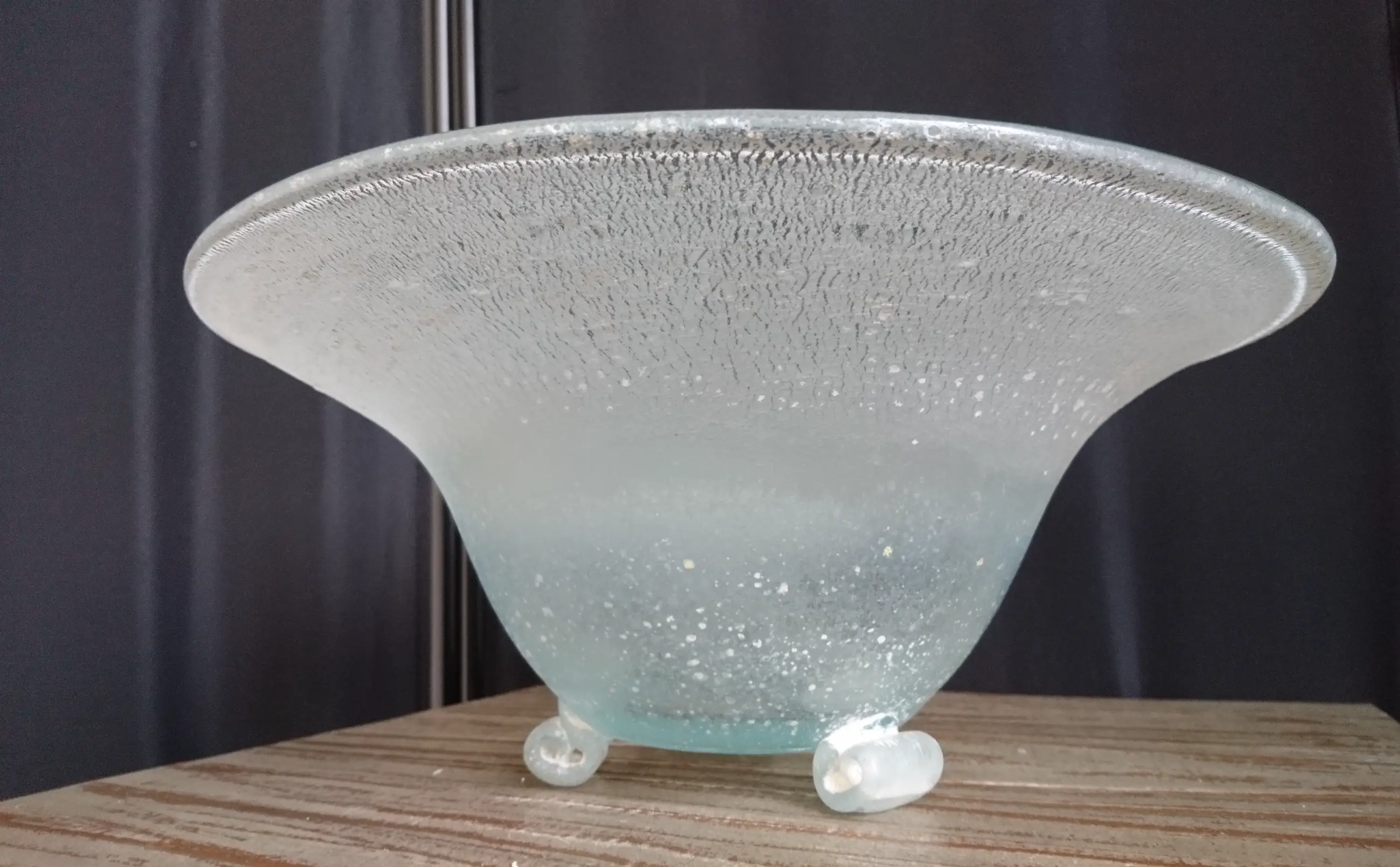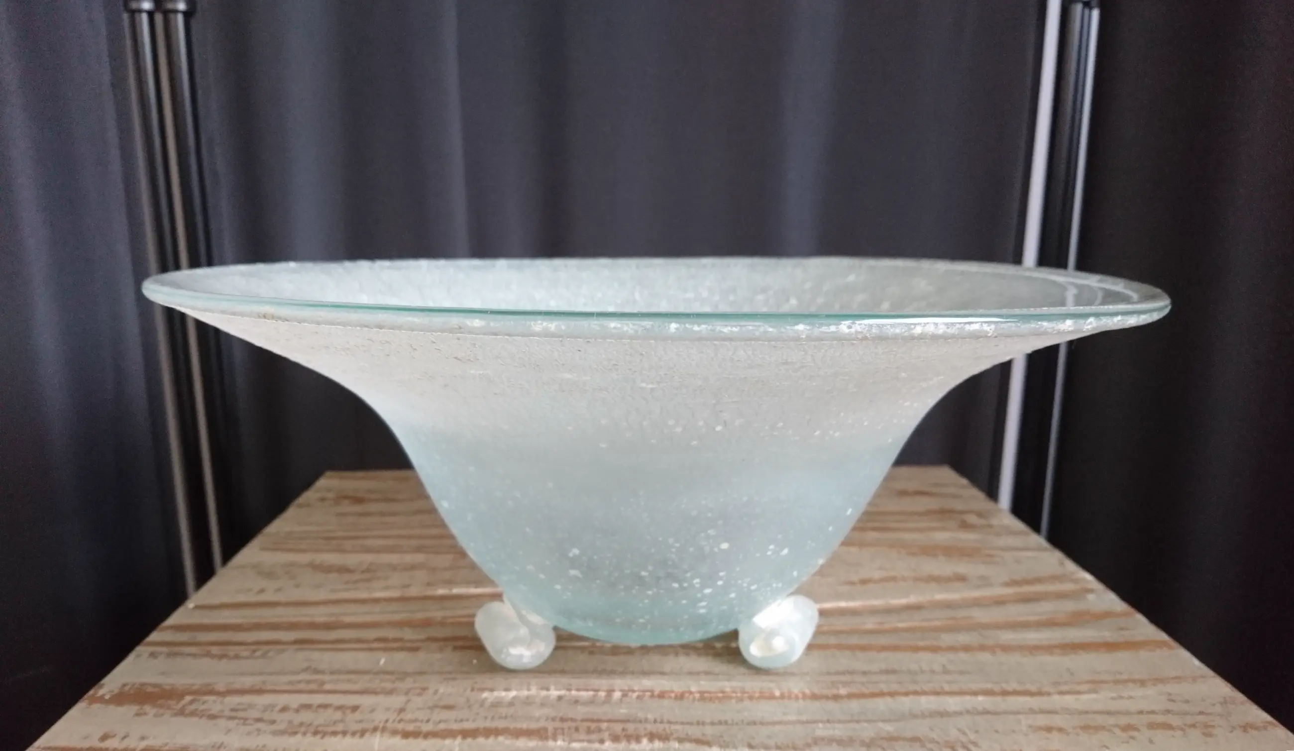 Diepe tincraquelé schaal op drie pootjes. Geen breuken/chips. In het midden van de schaal een ongepolijste pontil. Dit is geen beschadiging. (zie de foto´s)
