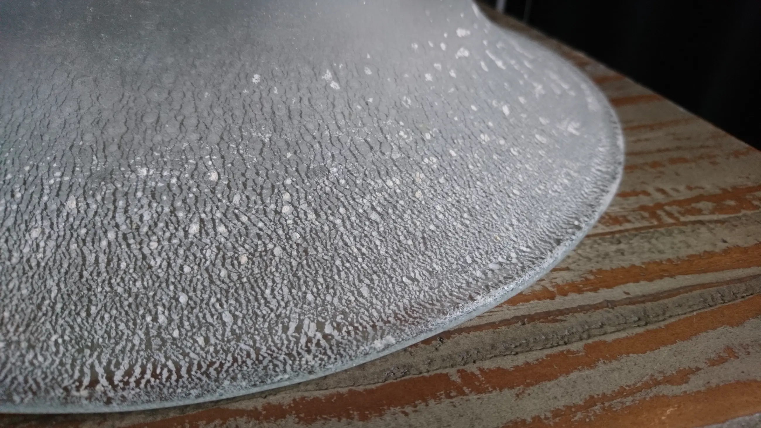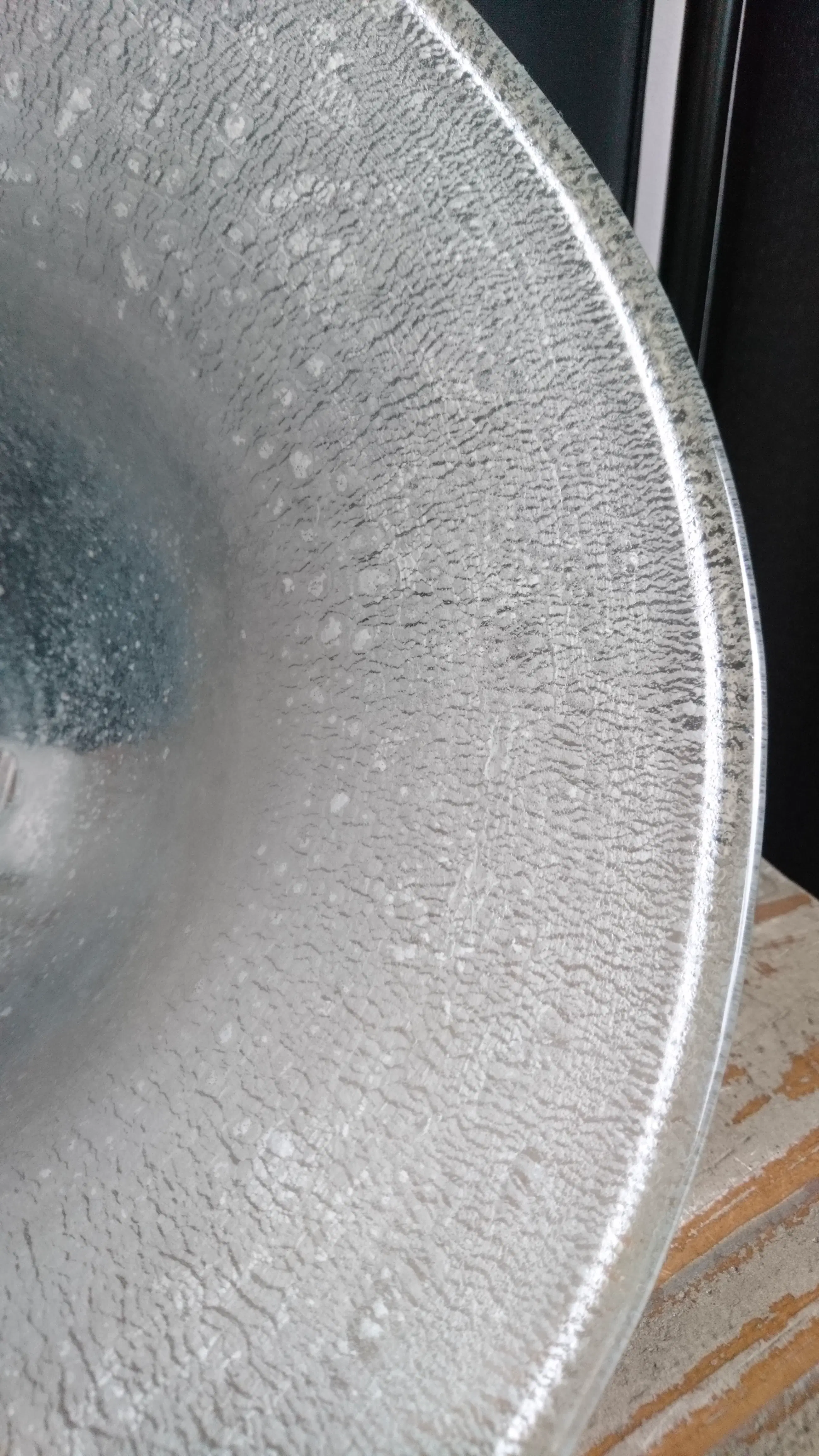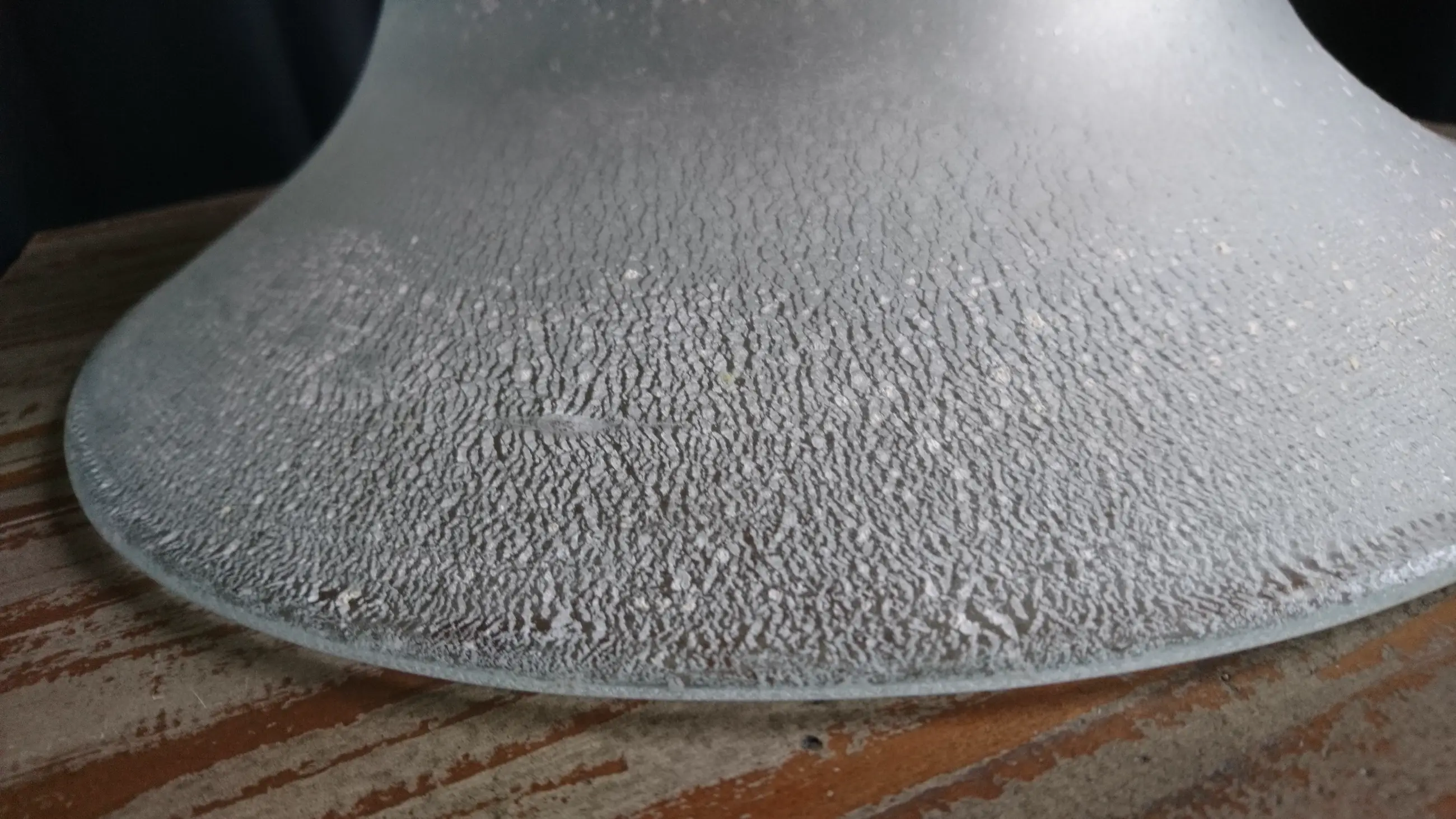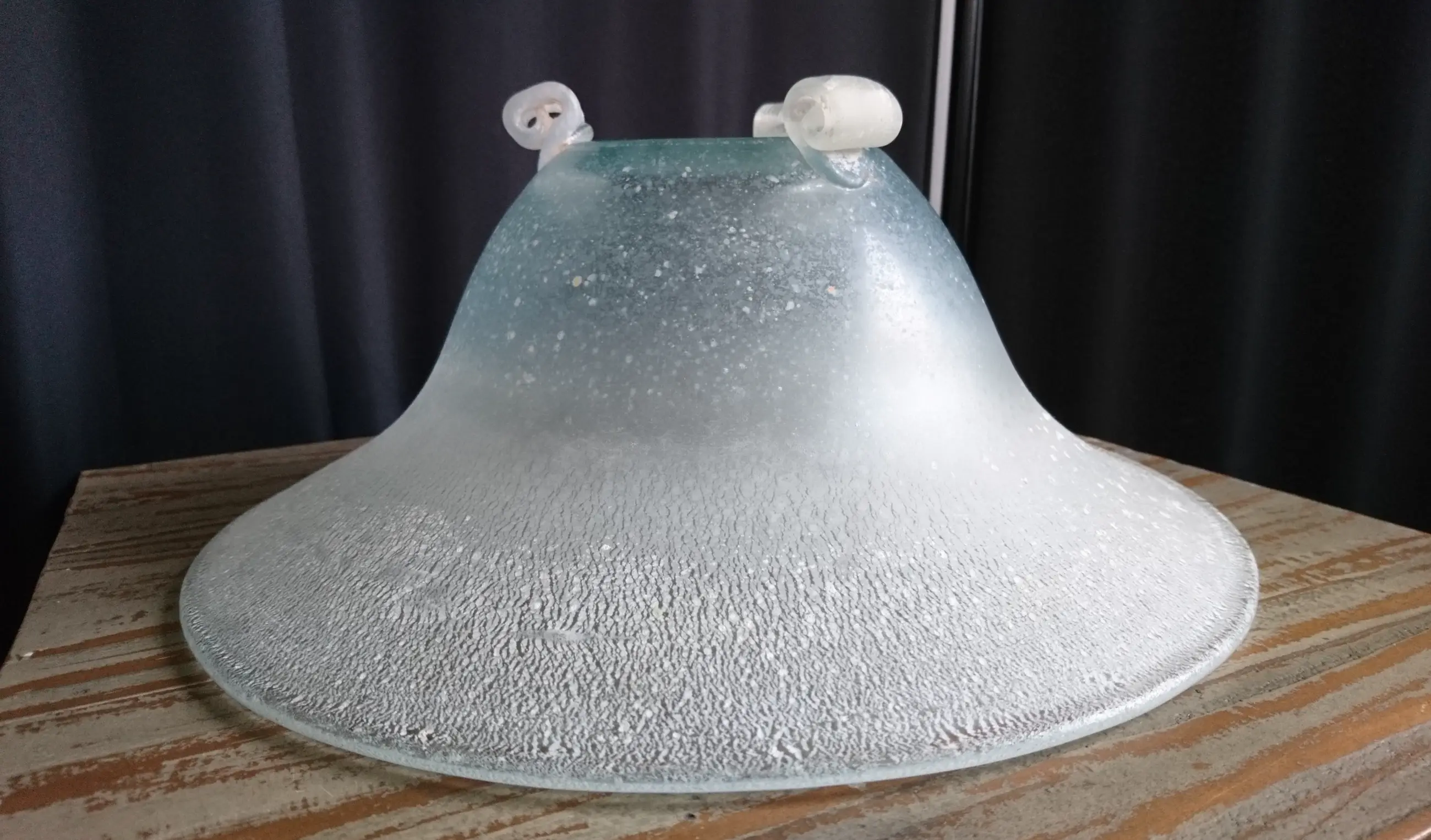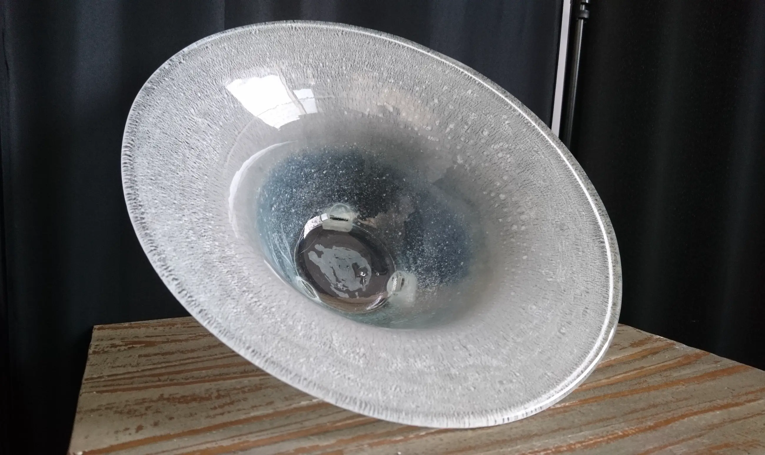 Diepe tincraquelé schaal op drie pootjes. Geen breuken/chips. In het midden van de schaal een ongepolijste pontil. Dit is geen beschadiging. (zie de foto´s)