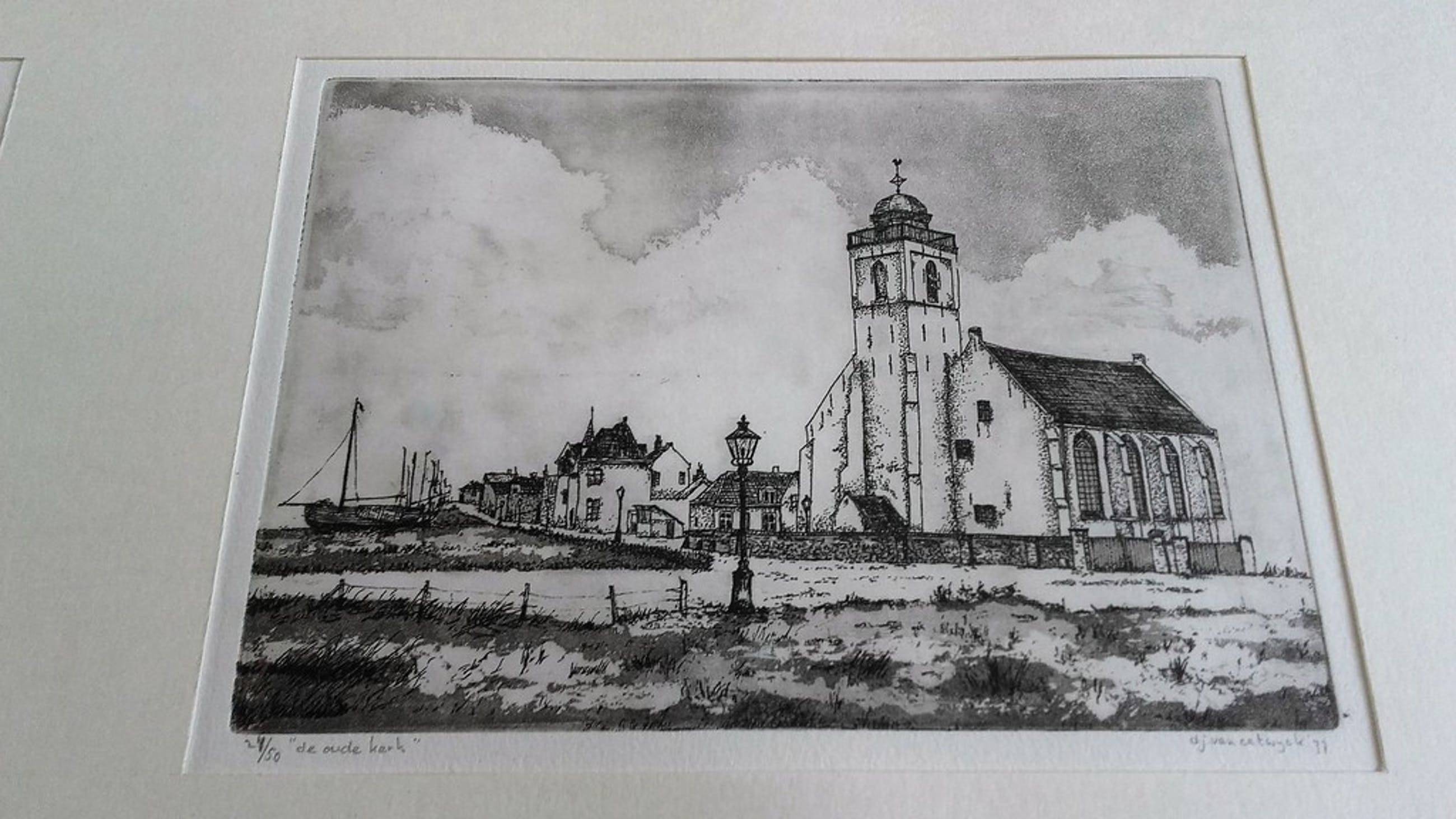 D.J. van Catwijck, een drieluik in een houten lijst. Gesigneerd en gedateerd 77. Voorstellingen: Schelpenvisser, oplage 21/50. De oude kerk, oplage 24/50. Bomschuit, oplage 19/40. Afm totaal: 82.5 cm bij 32.5 cm. afm etsen: 19 cm bij 14 cm. Conditie, in zeer goede staat. Inclusief, glasplaat en ophangmogelijkheid. Wordt zorgvuldig ingepakt, met doos en noppenplastic.