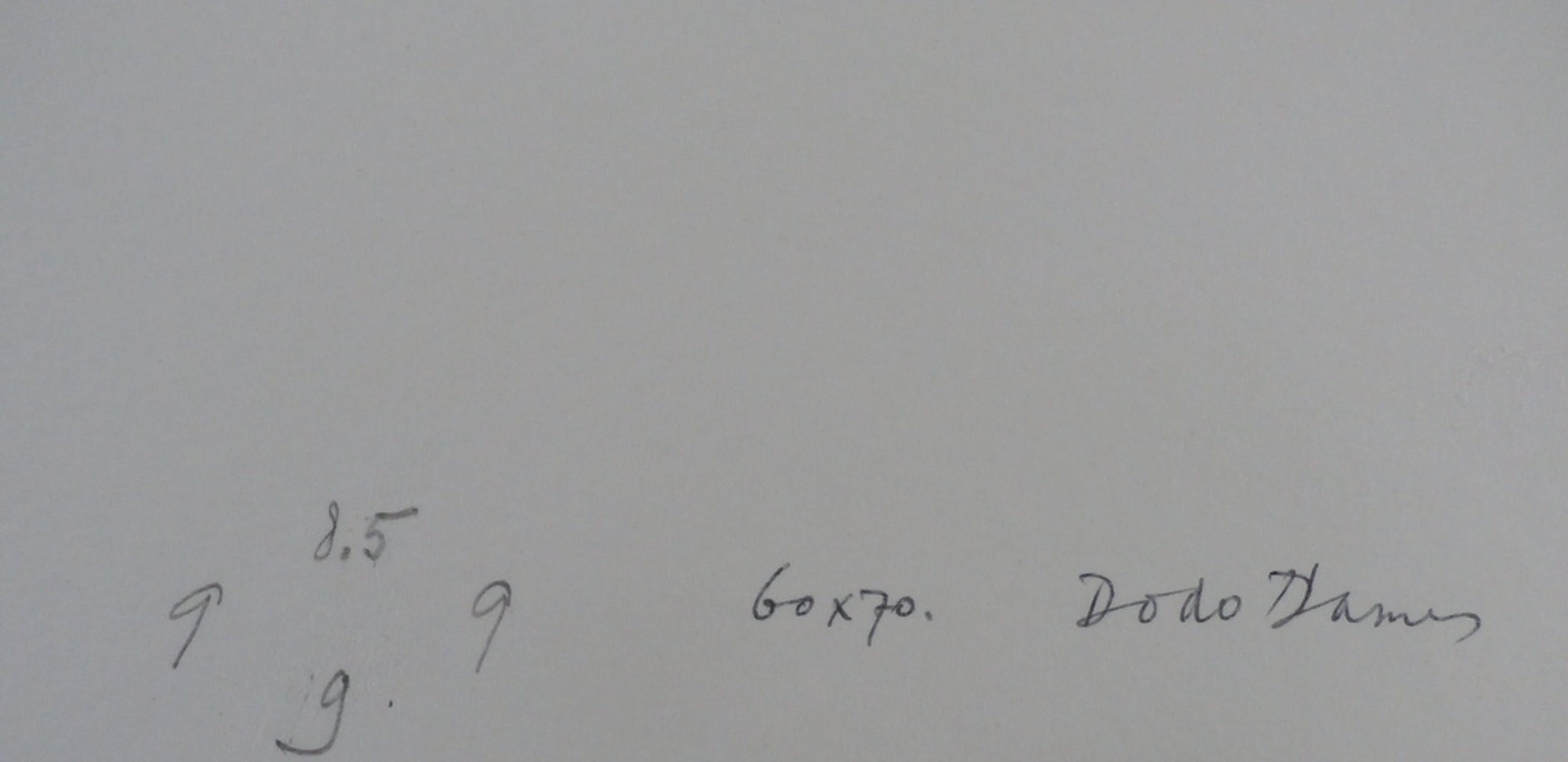 Ets van een voor mij onbekende kunstenaar. Rechtsonder staat "Dodo"en de titel: Dames. Afmetingen blad: H65 x b50 cm. Afmetingen voorstelling: H50 x b40. Conditie: in goede staat. Er zitten wat plakresten op de achterzijde van een vorige inlijsting. Het werk komt uit de ABN AMRO collectie.