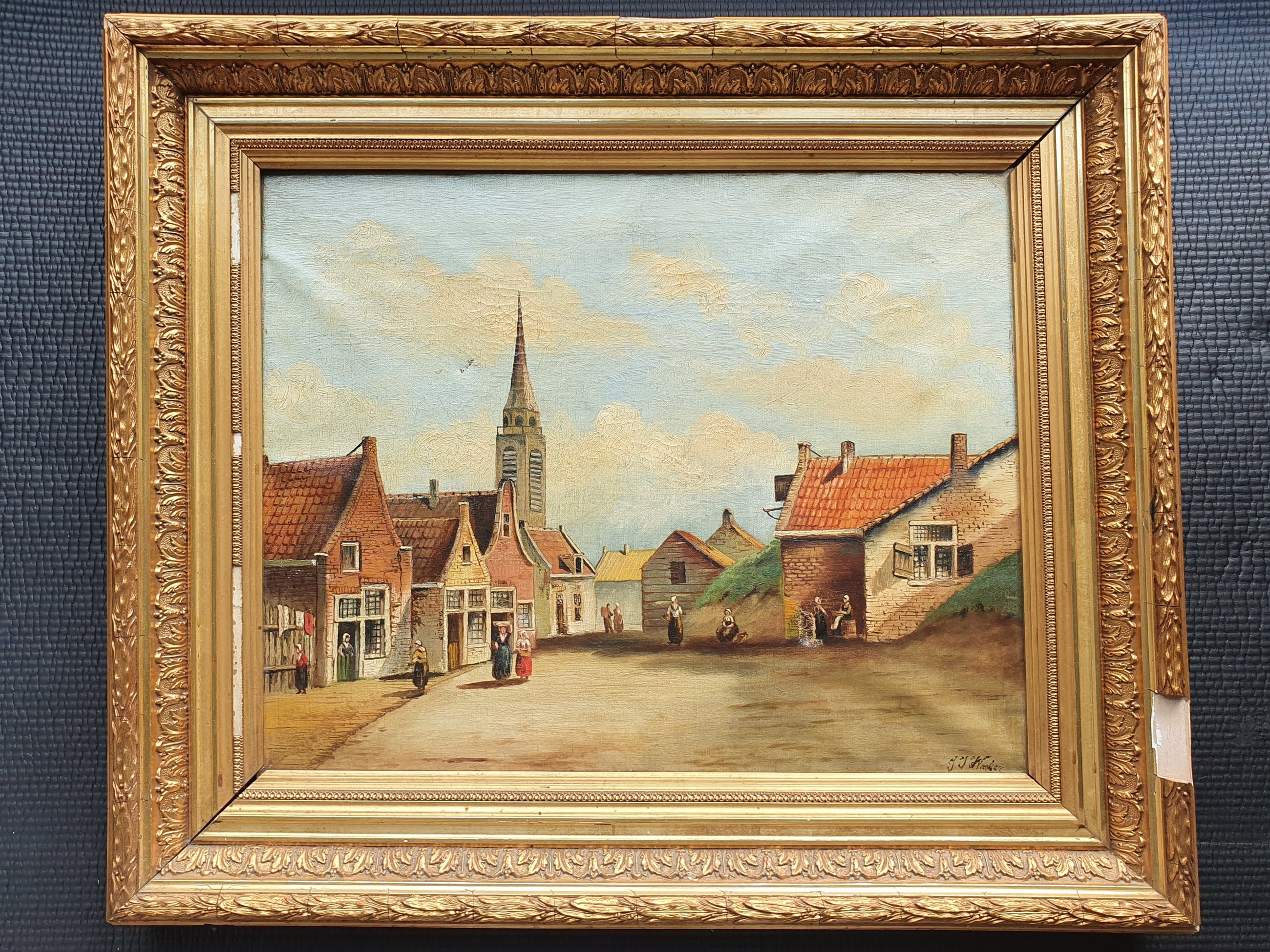 Oud schilderij met mooie lijst maar helaas met meerdere zware beschadigingen.