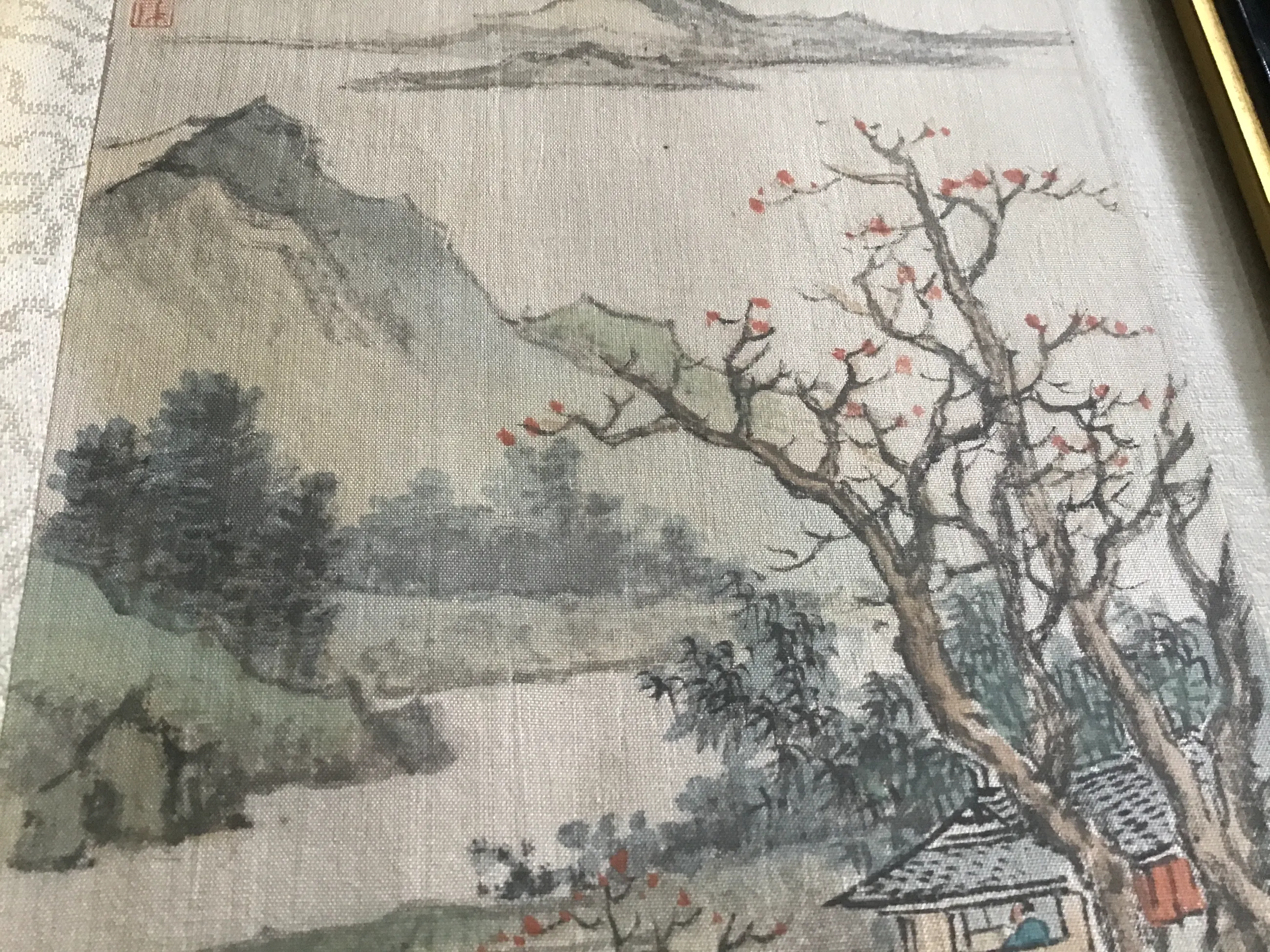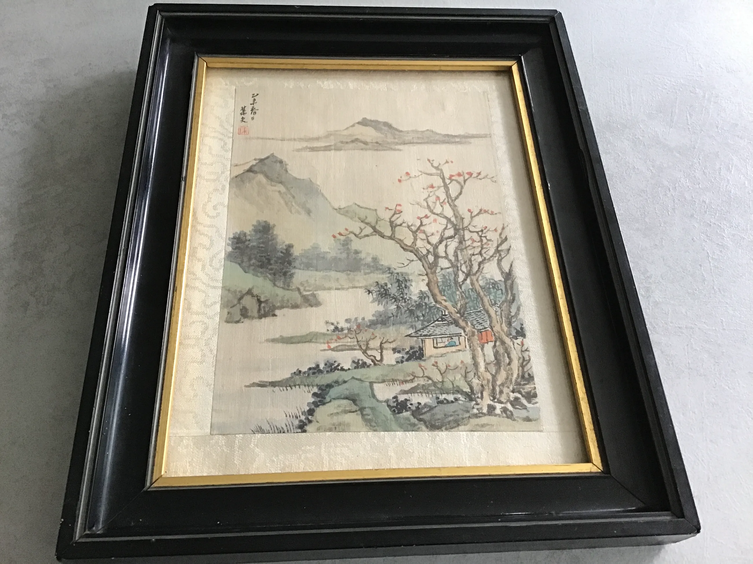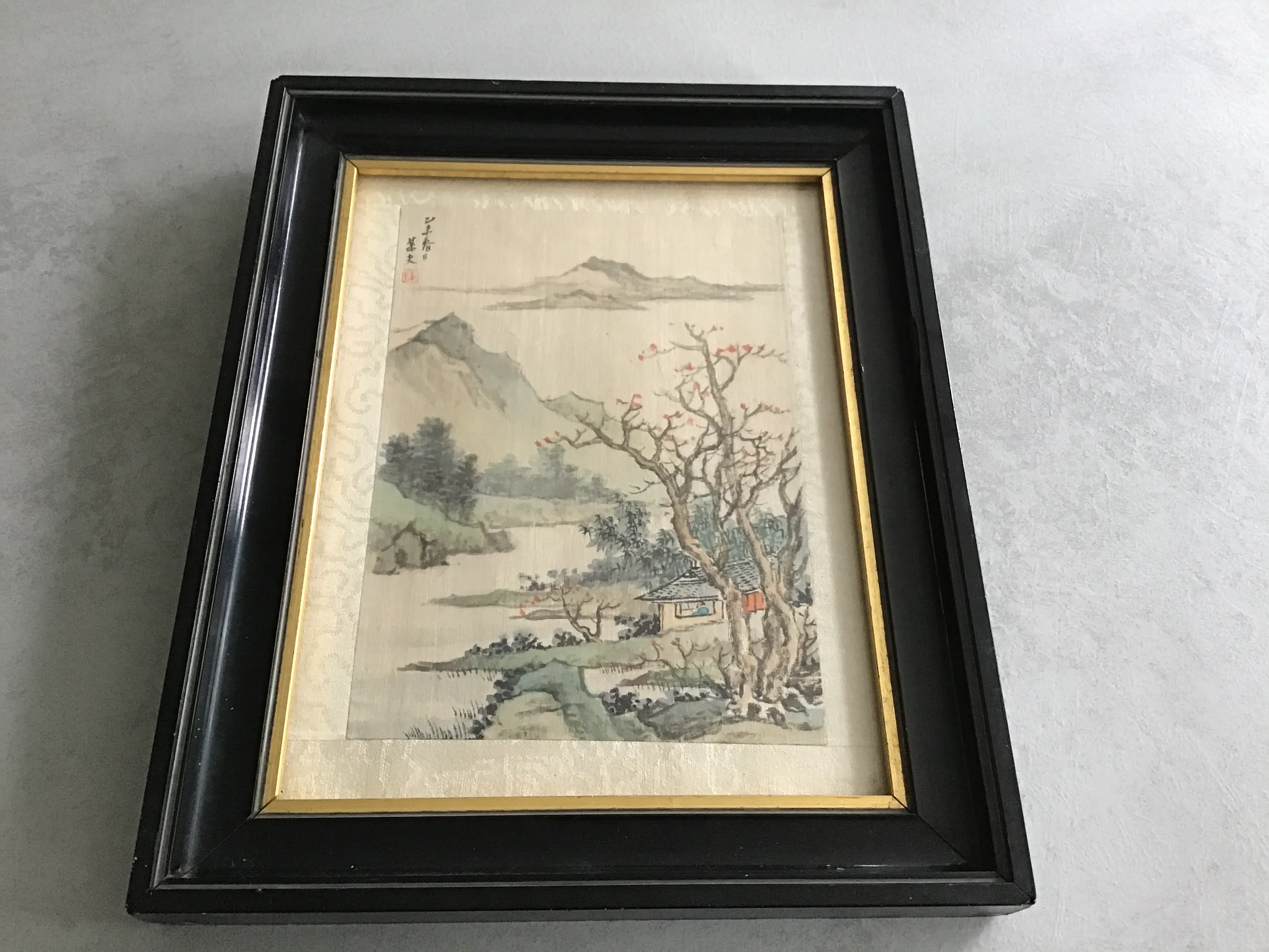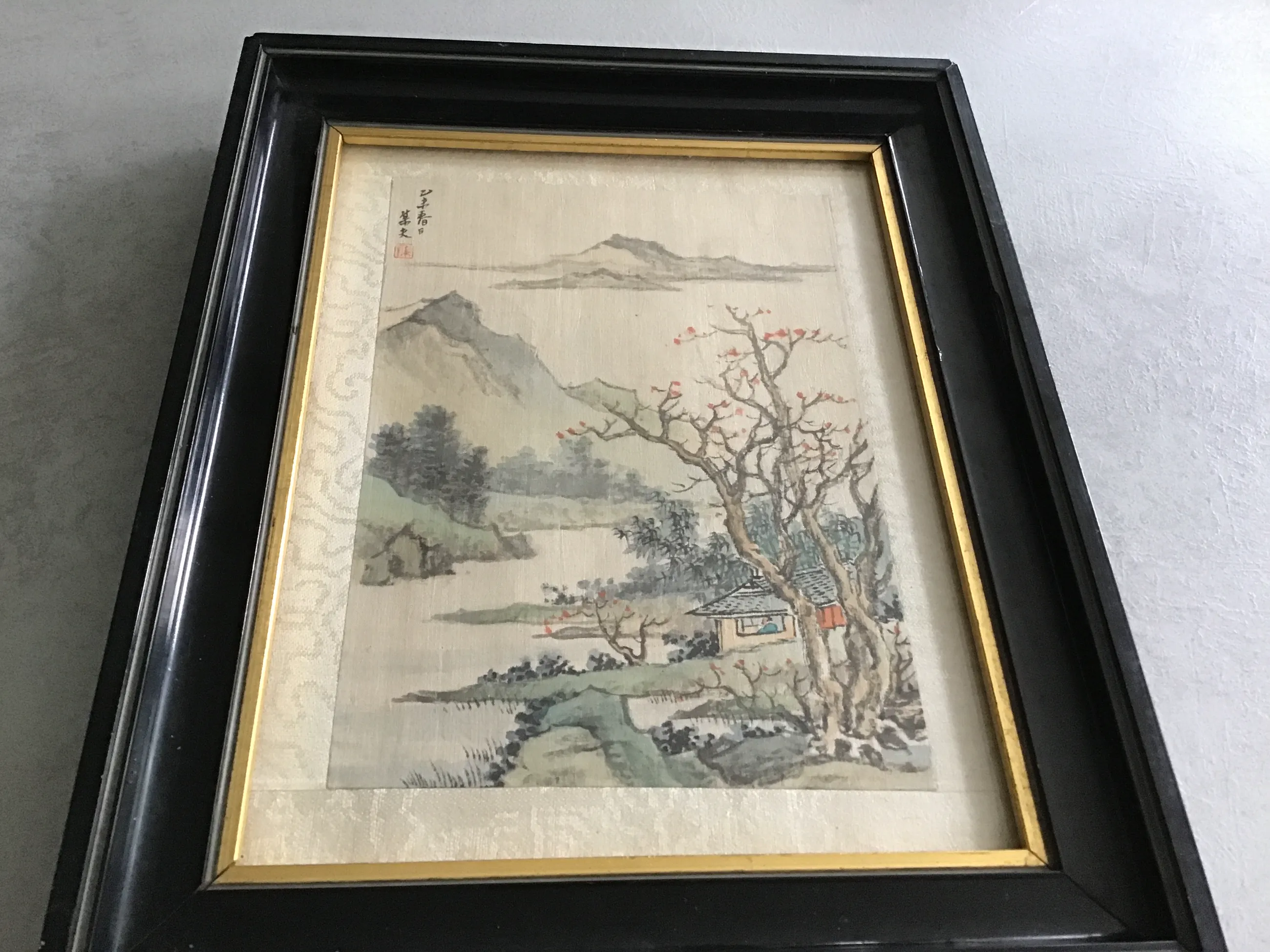 Mooi Chinees schilderij op zijn geschilderd. Erg in detail. Mooie huisje, bergen, bos en meertje als afbeelding. Gesigneerd. Mooie lijst Geschat op begin jaren 30 In goede staat.
