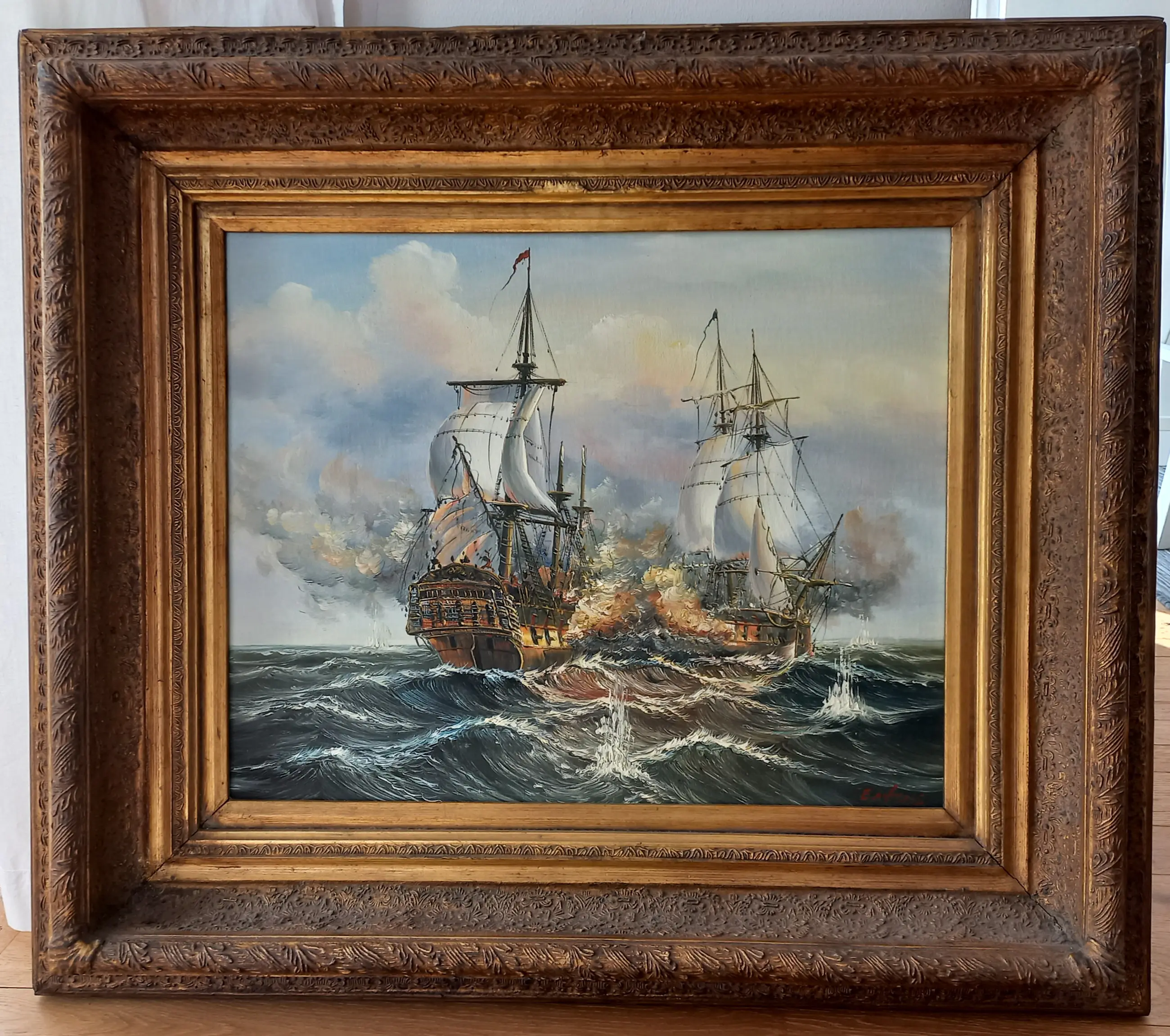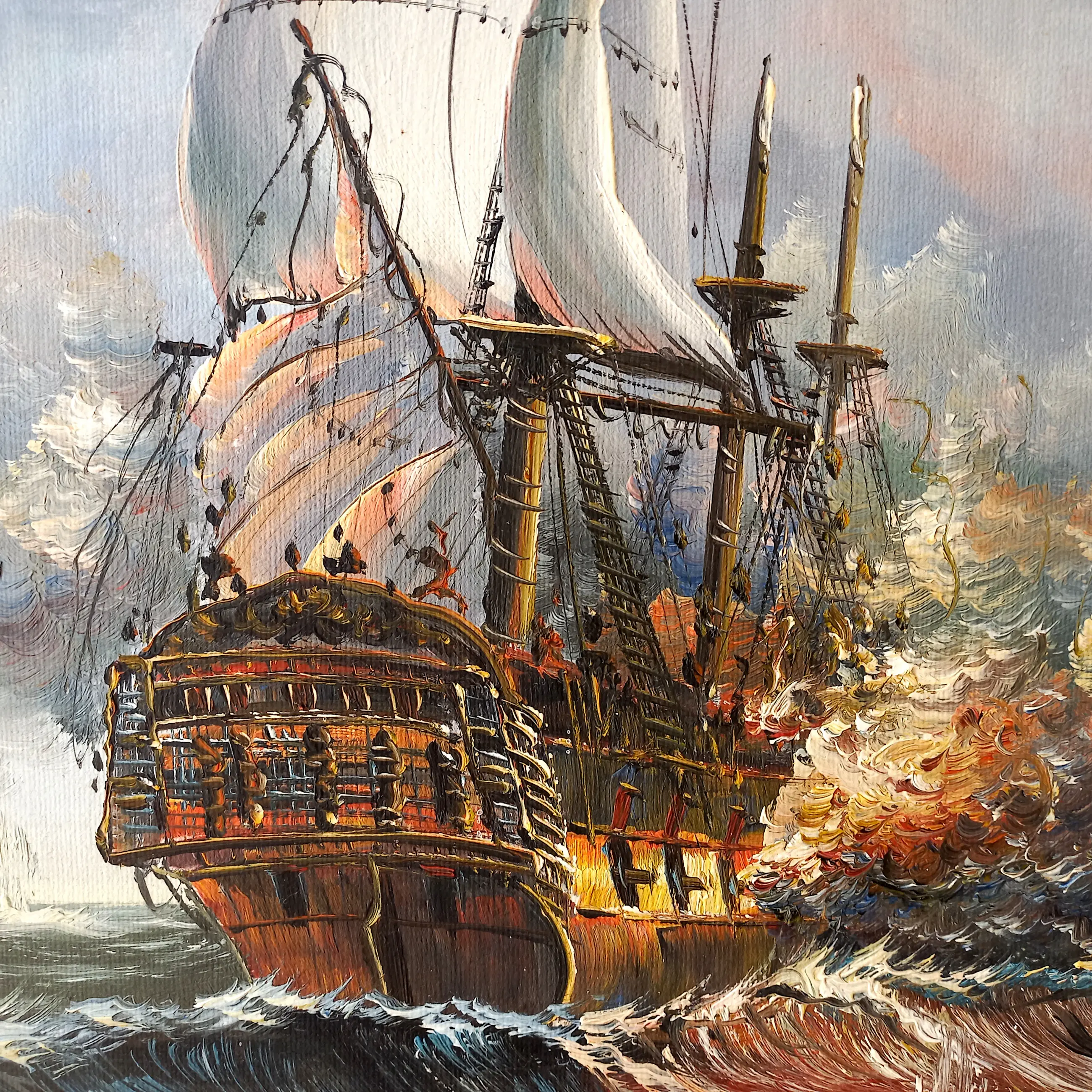 Indrukwekkend en sfeervol maritiem schilderij met een dramatische voorstelling van twee historische zeilschepen verwikkeld in een hevige zeeslag. De kunstenaar heeft het moment van impact prachtig vastgelegd: woelige golven, bolstaande zeilen en rookpluimen zorgen voor een krachtige en dynamische compositie.