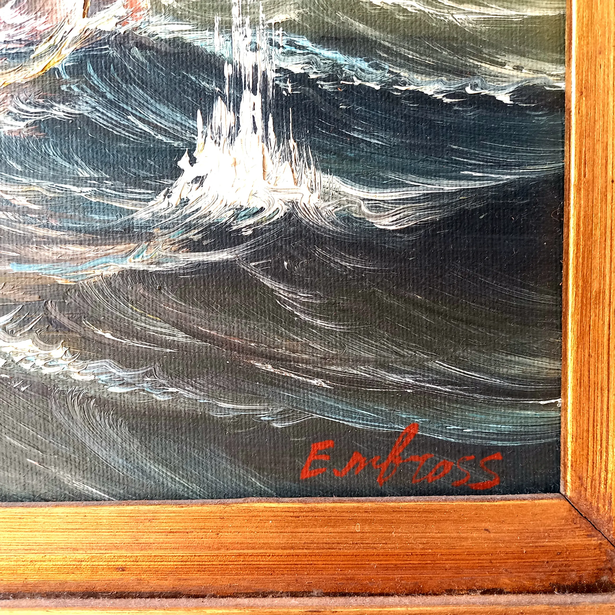 De verfstreek is levendig en expressief, met veel aandacht voor detail in zowel de schepen als de beweging van het water. Dit geeft het werk een sterke visuele impact en maakt het tot een echte blikvanger.