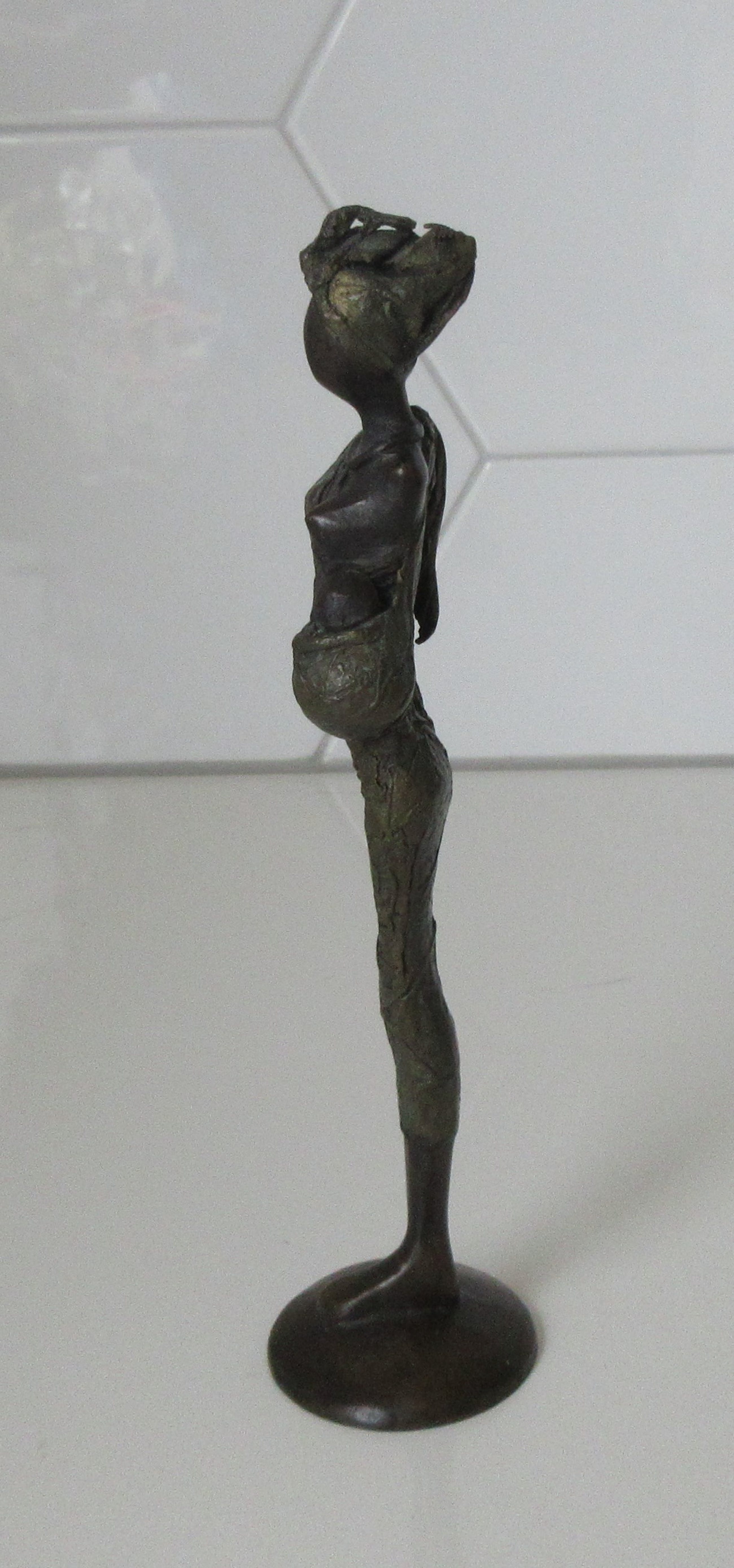 De beeldjes zijn alle drie gesigneerd met GA aan de onderkant. De doeken van de vrouwen zijn zeer gedetailleerd. Afmetingen beeld vrouw met hoofdtooi; 21,5 cm hoog en gewicht: ca. 310 gram Afmetingen beeld vrouw met baby; 19 cm hoog en gewicht: 275 gram Afmetingen beeld vrouw met pan of schaal; 20 cm hoog en gewicht ca. 270 gram