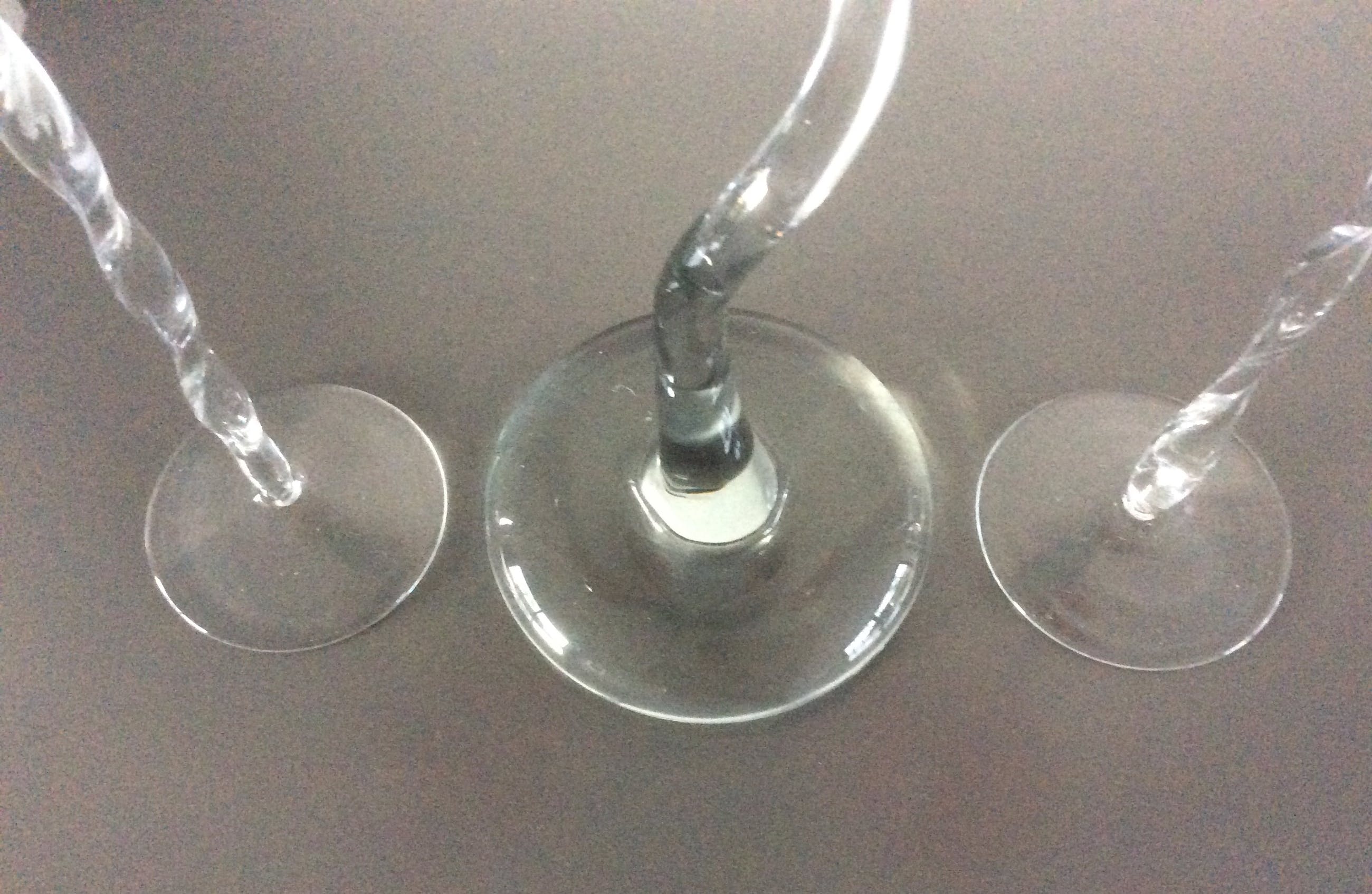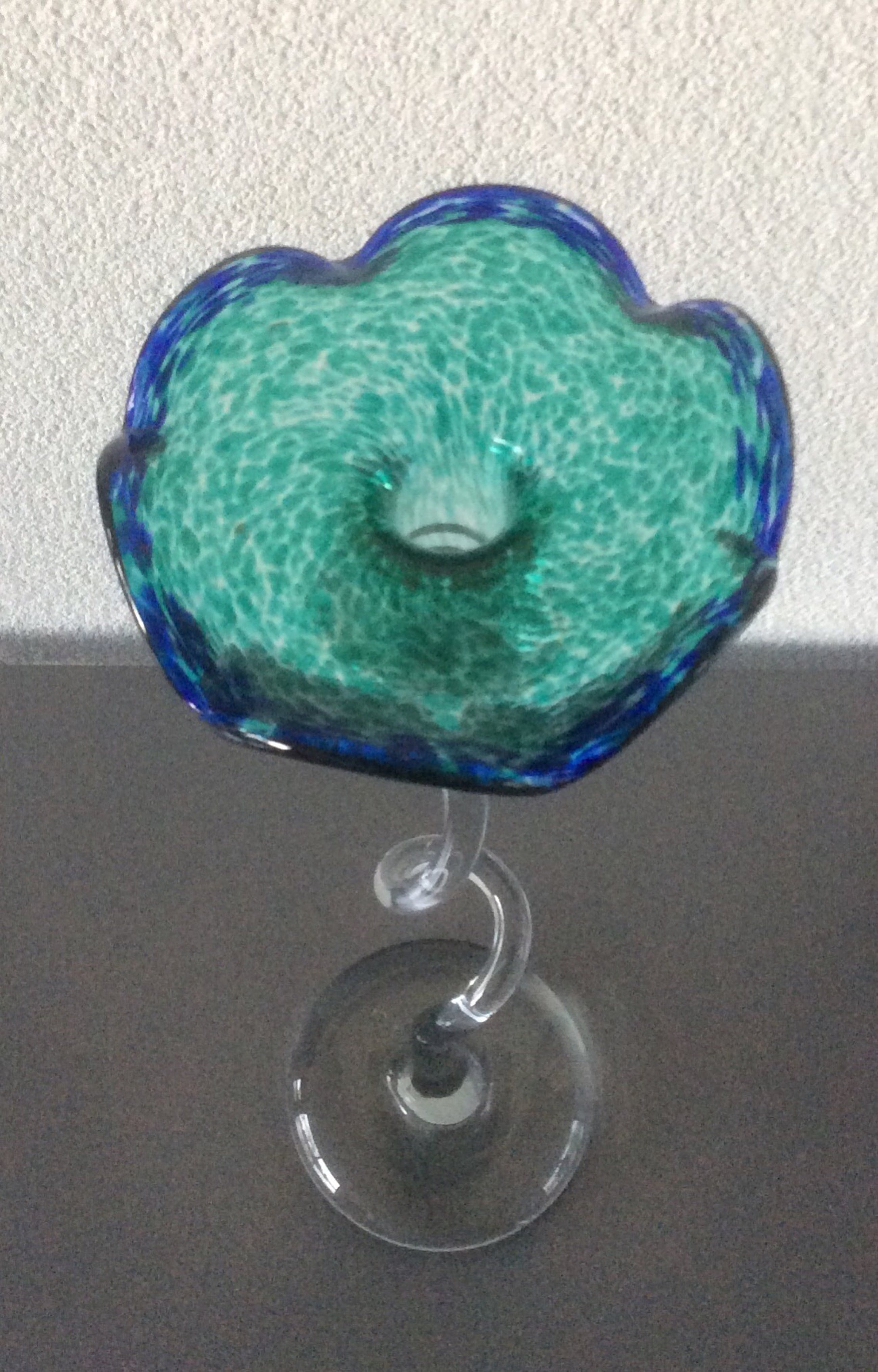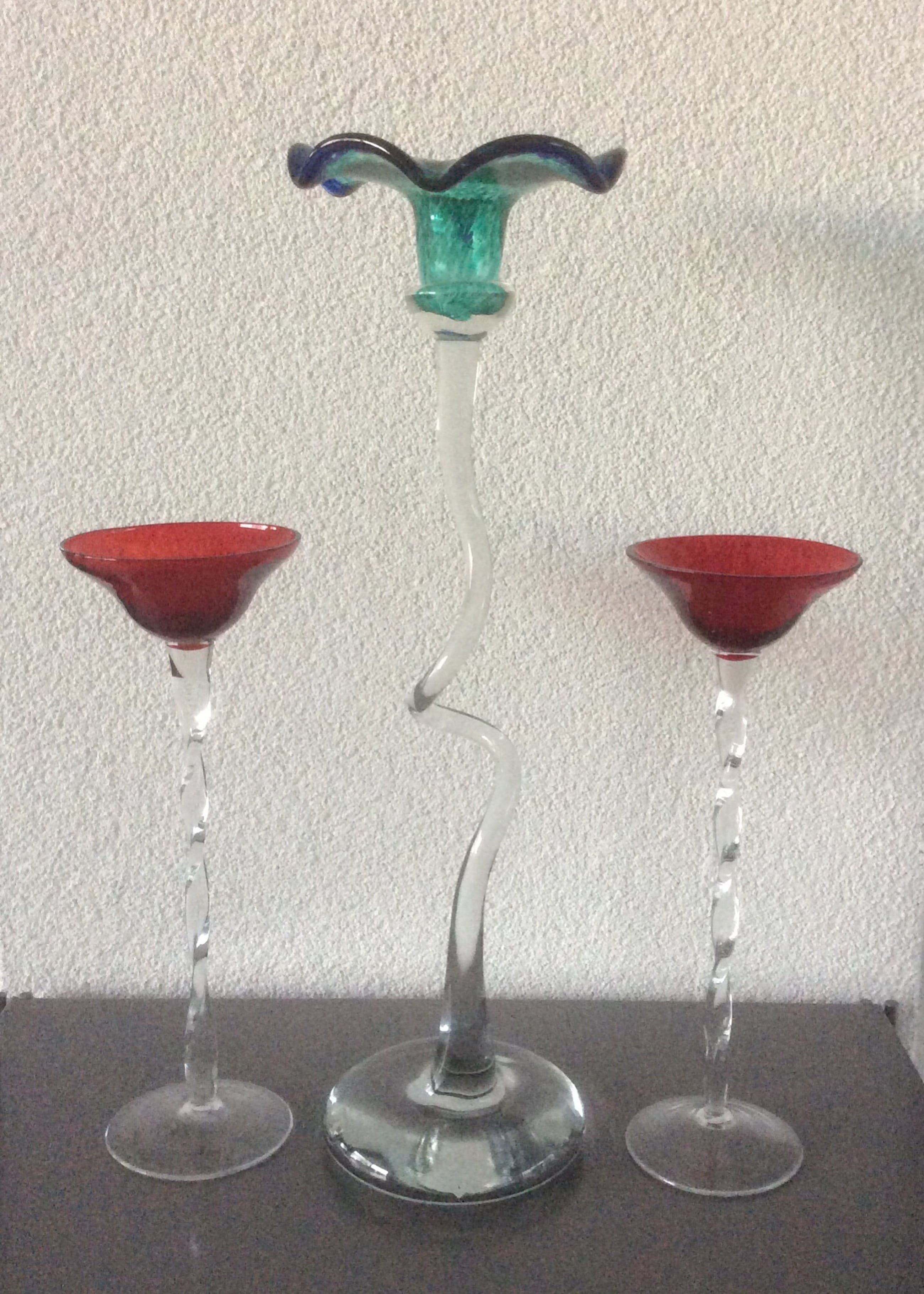 De drie objecten zijn handgemaakt. De grote met blauw-groen spetterglazen kelk met zware voet en slingerbeen weegt 855 gram en is 39,5 cm hoog. De twee objecten met rode kelk hebben een gedraaid been. Ze zijn 25 cm hoog en wegen samen 265 gram. Alle drie zonder enig gebrek.