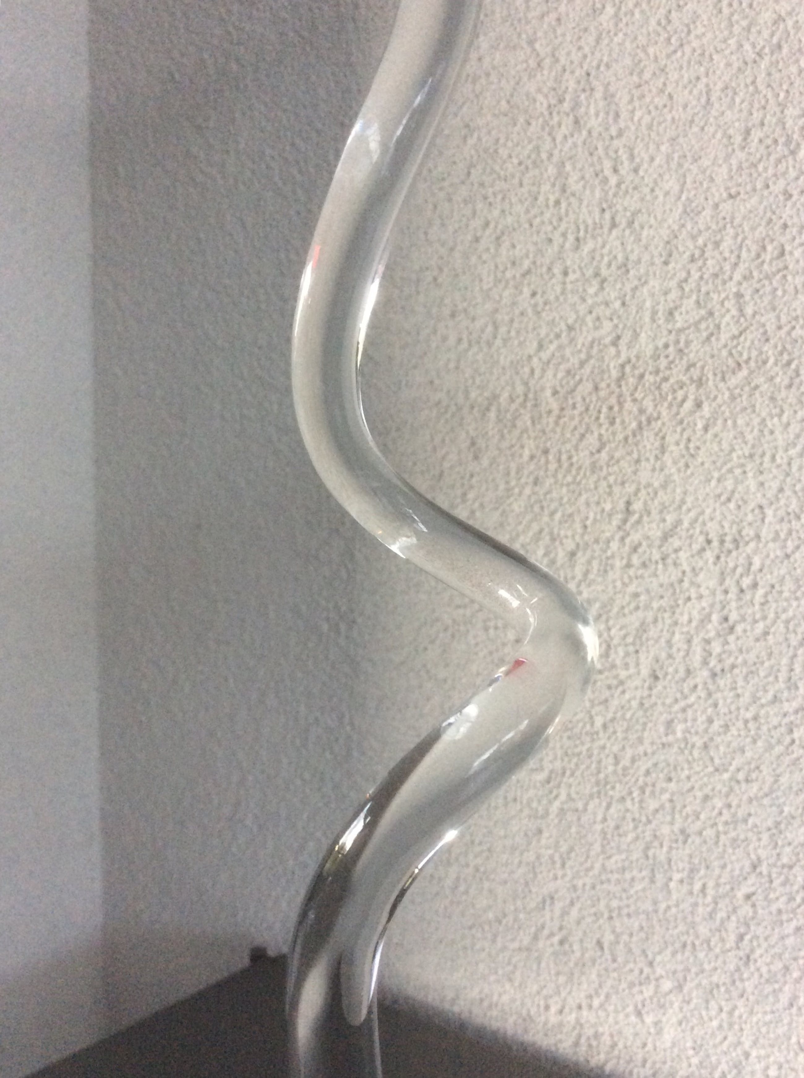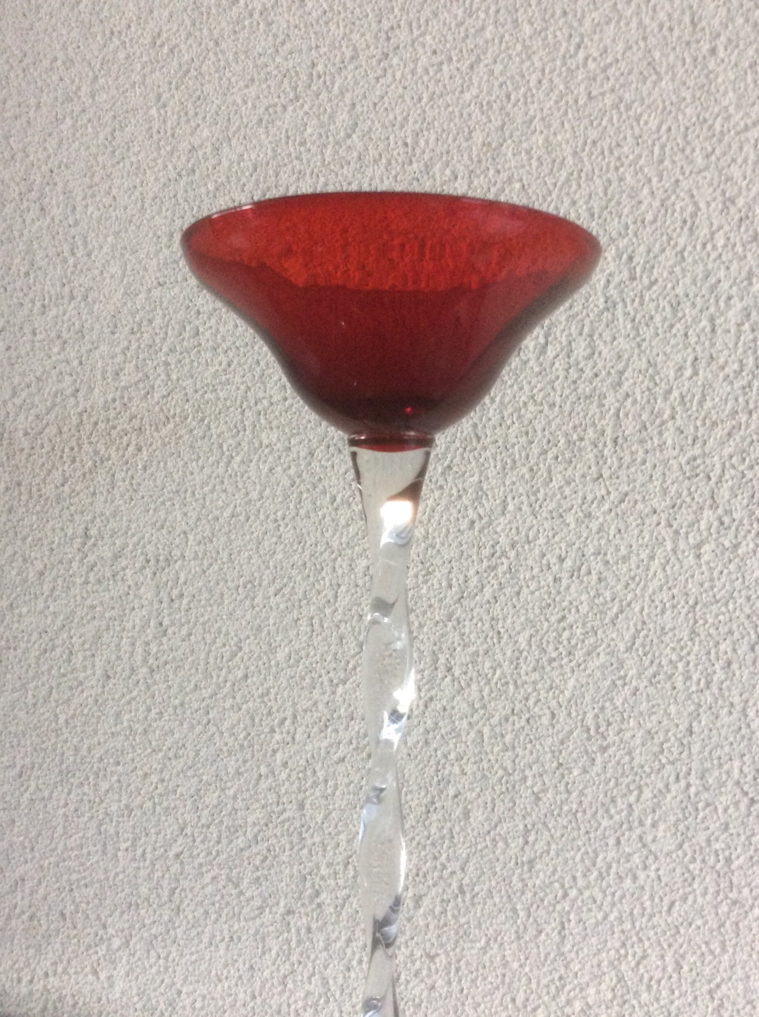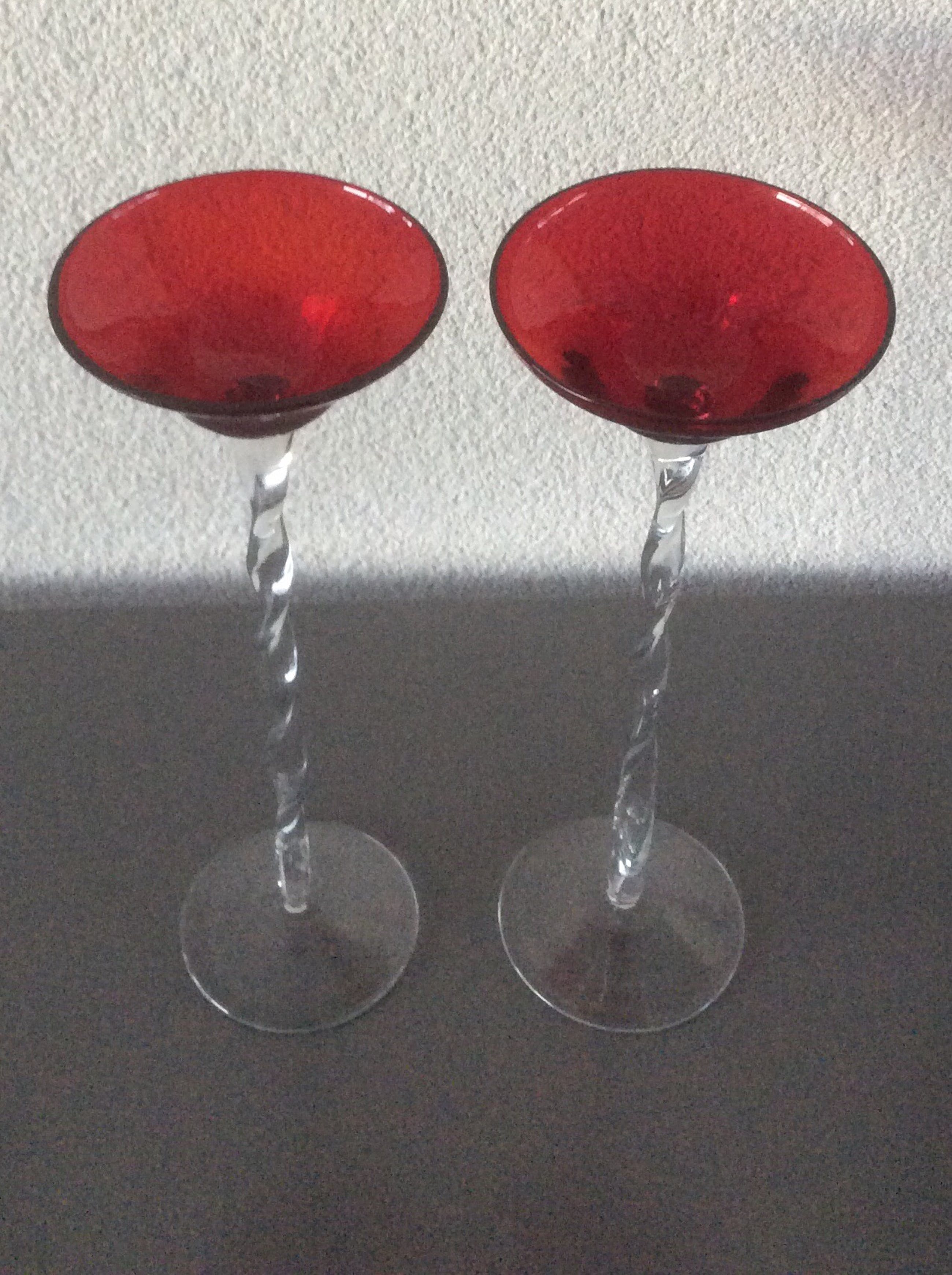De drie objecten zijn handgemaakt. De grote met blauw-groen spetterglazen kelk met zware voet en slingerbeen weegt 855 gram en is 39,5 cm hoog. De twee objecten met rode kelk hebben een gedraaid been. Ze zijn 25 cm hoog en wegen samen 265 gram. Alle drie zonder enig gebrek.