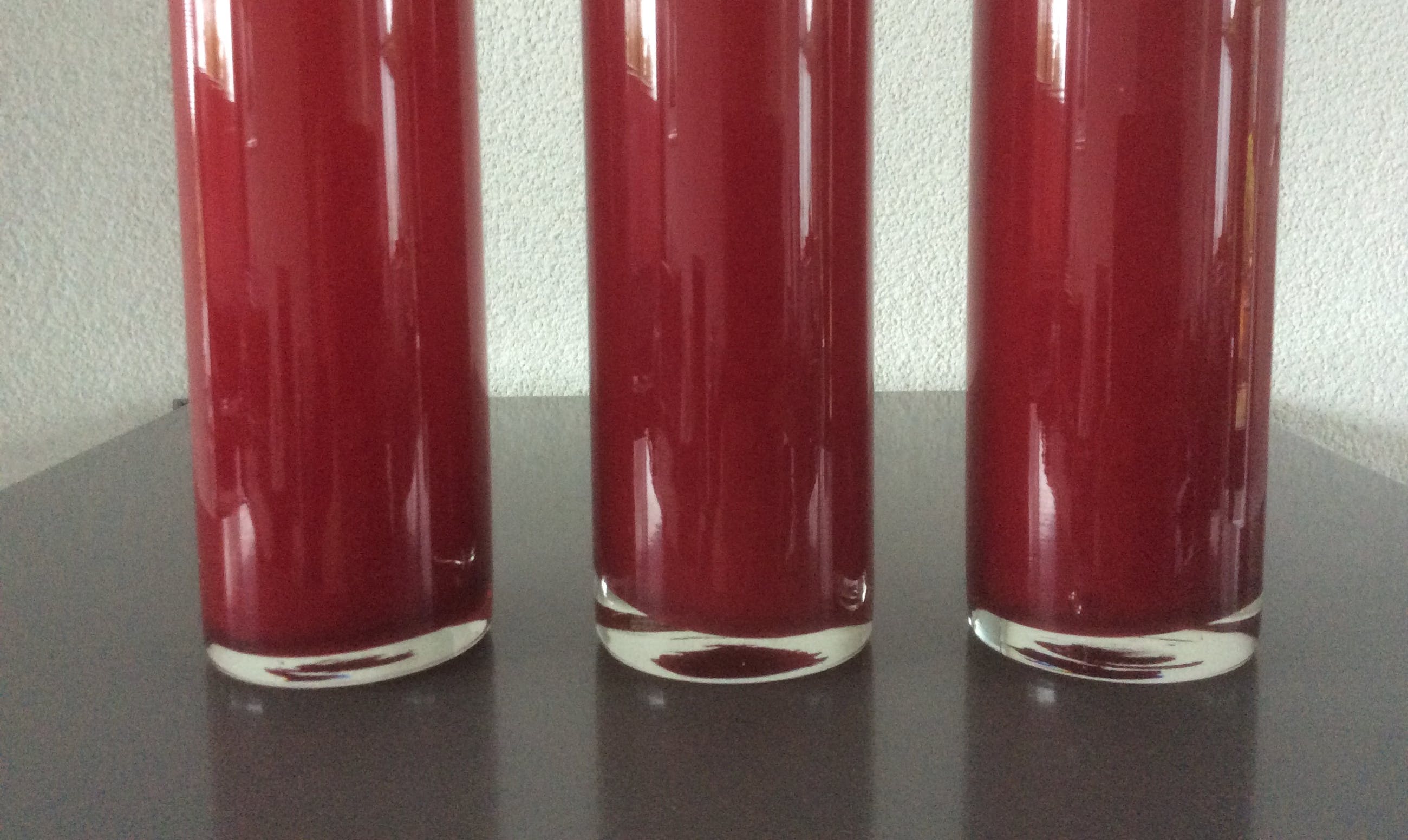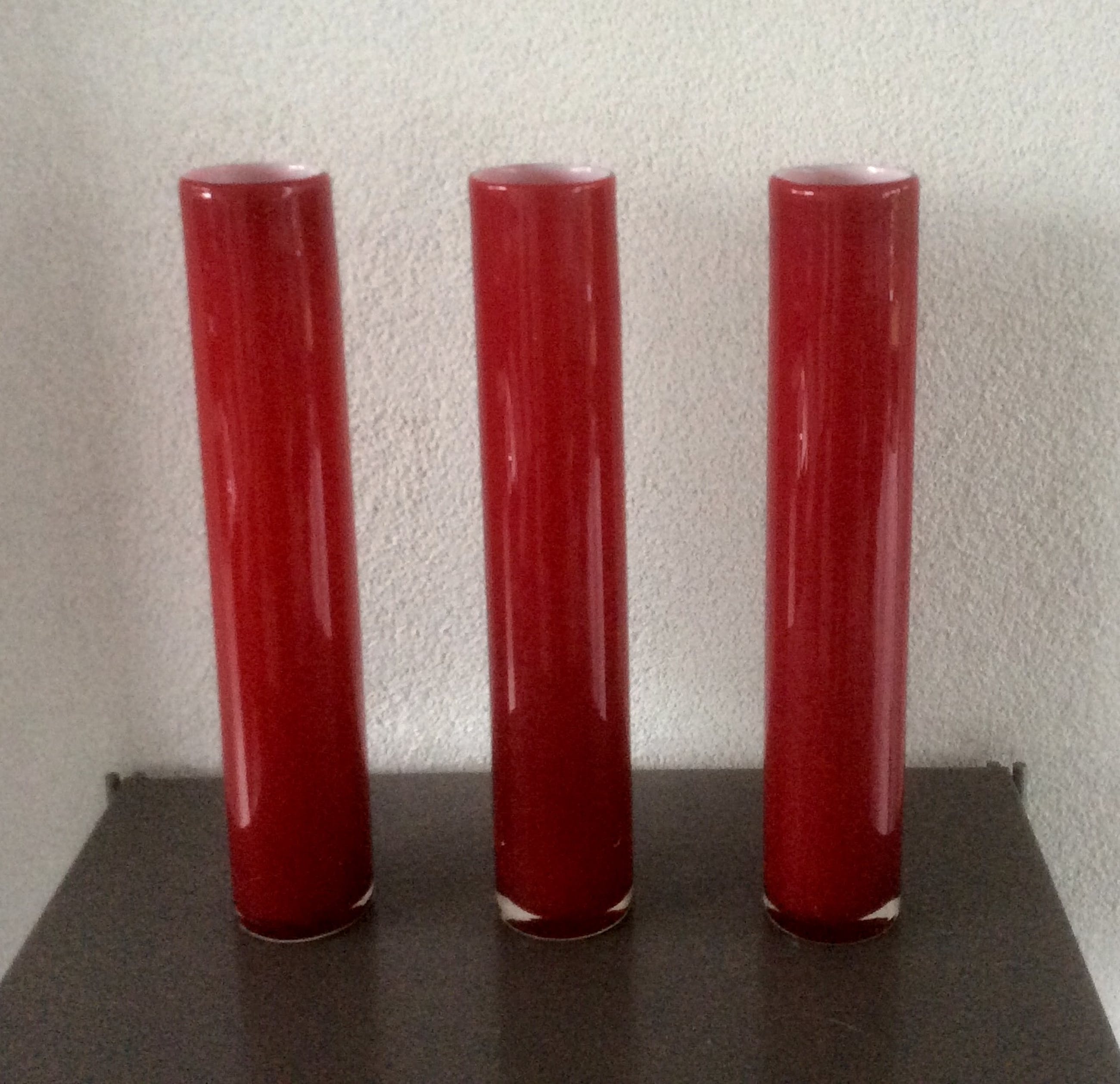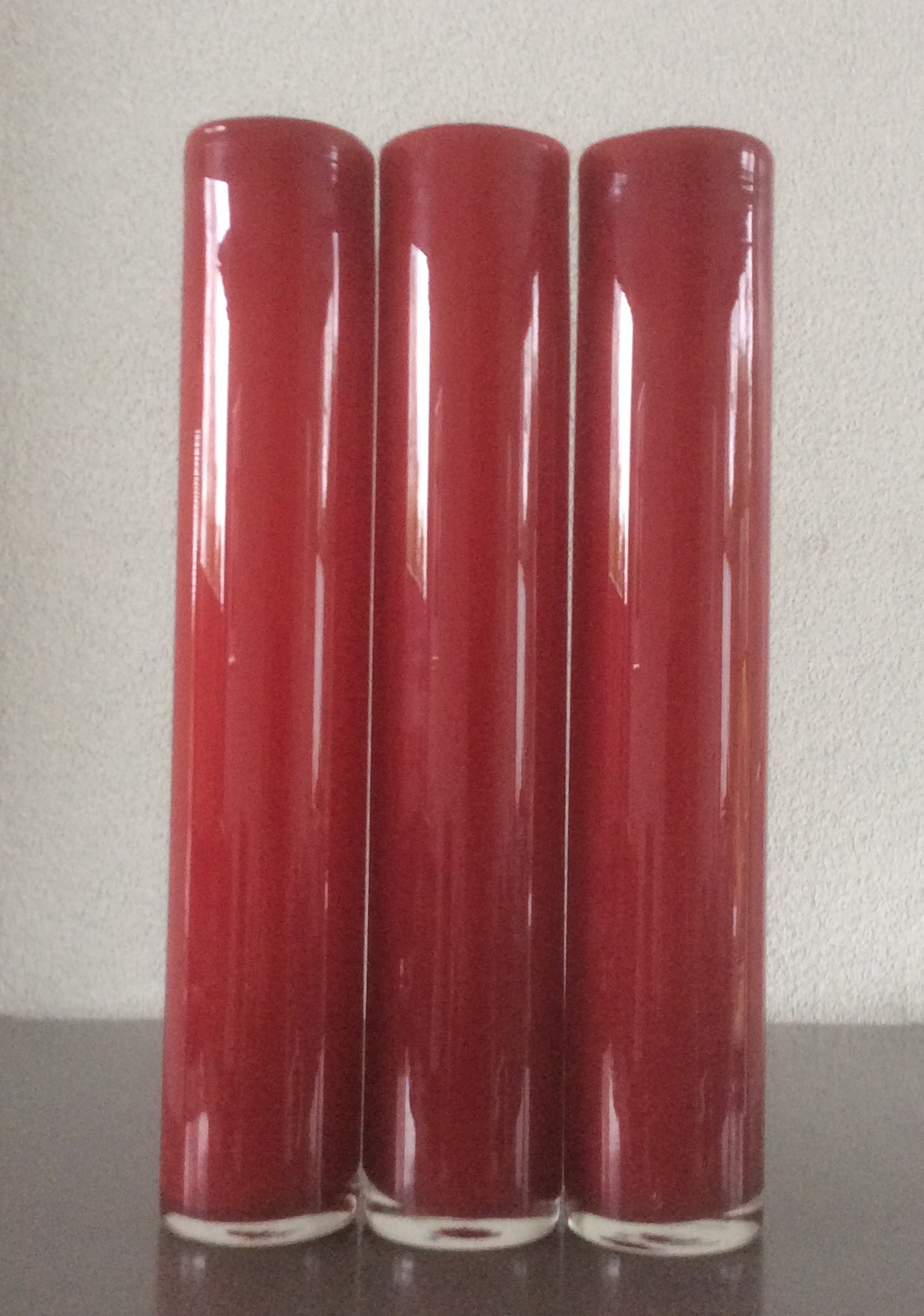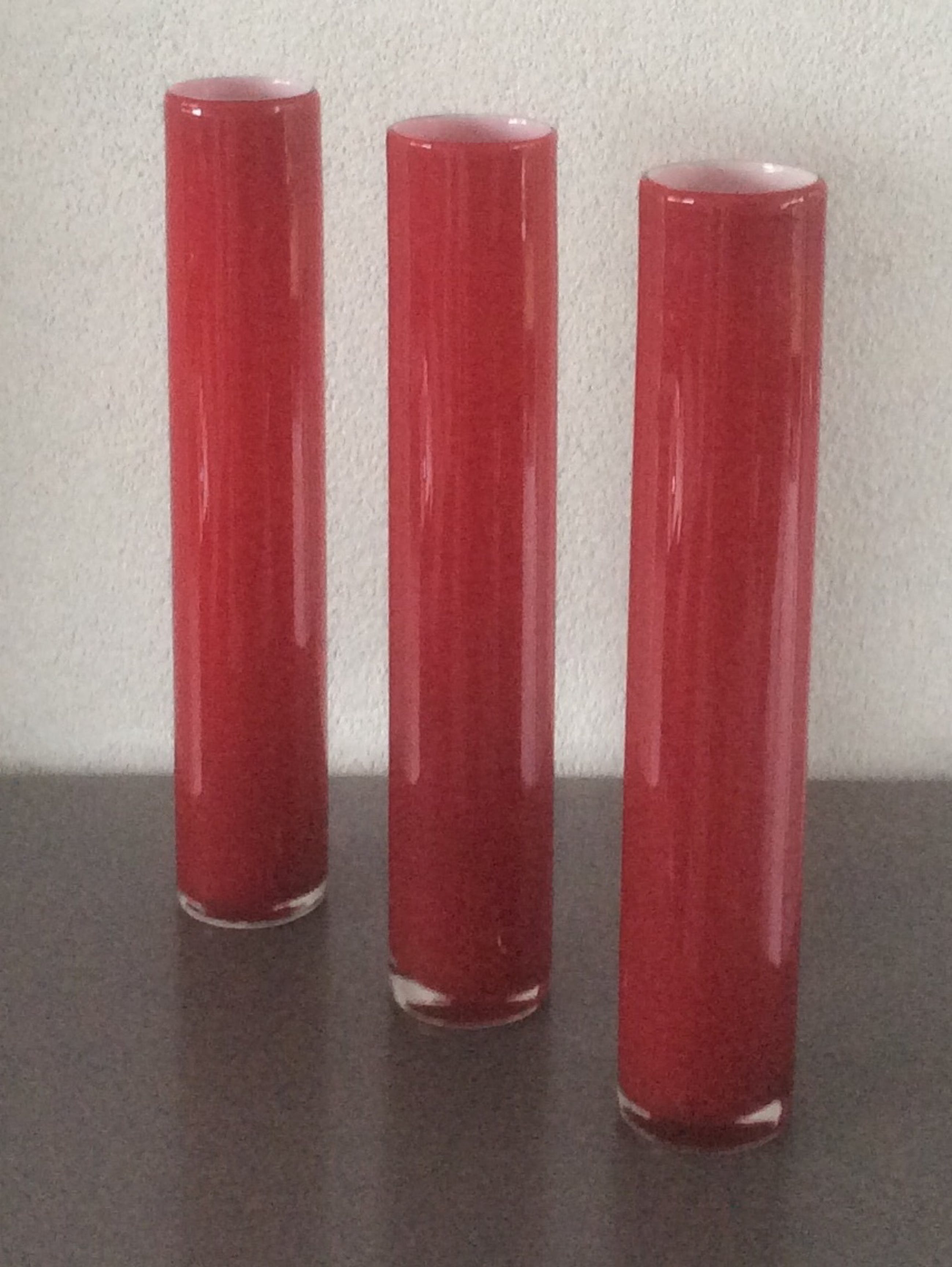 Drie puntgave decoratieve objecten. Rood van buiten, wit van binnen en doorzichtig aan de onderzijde.
