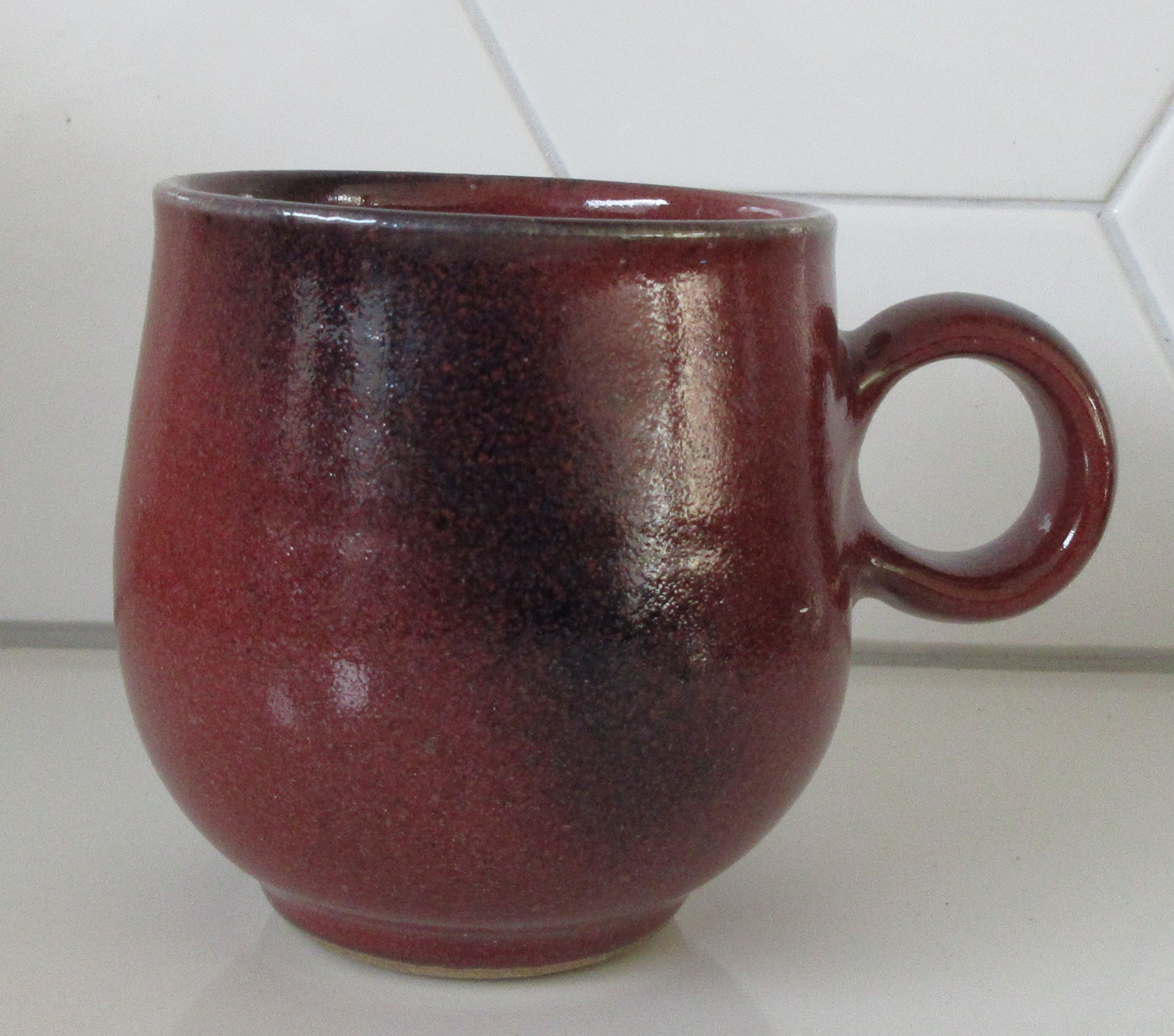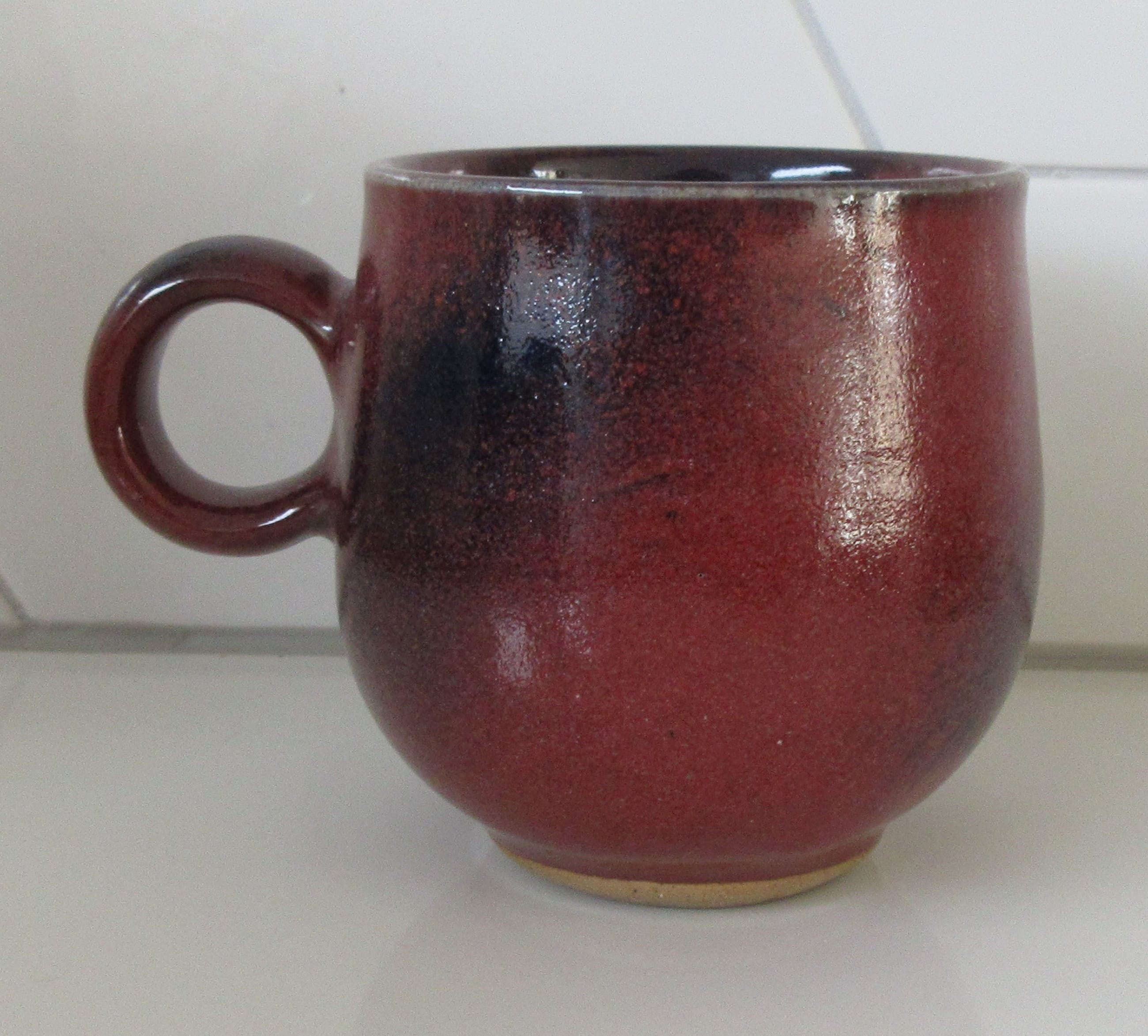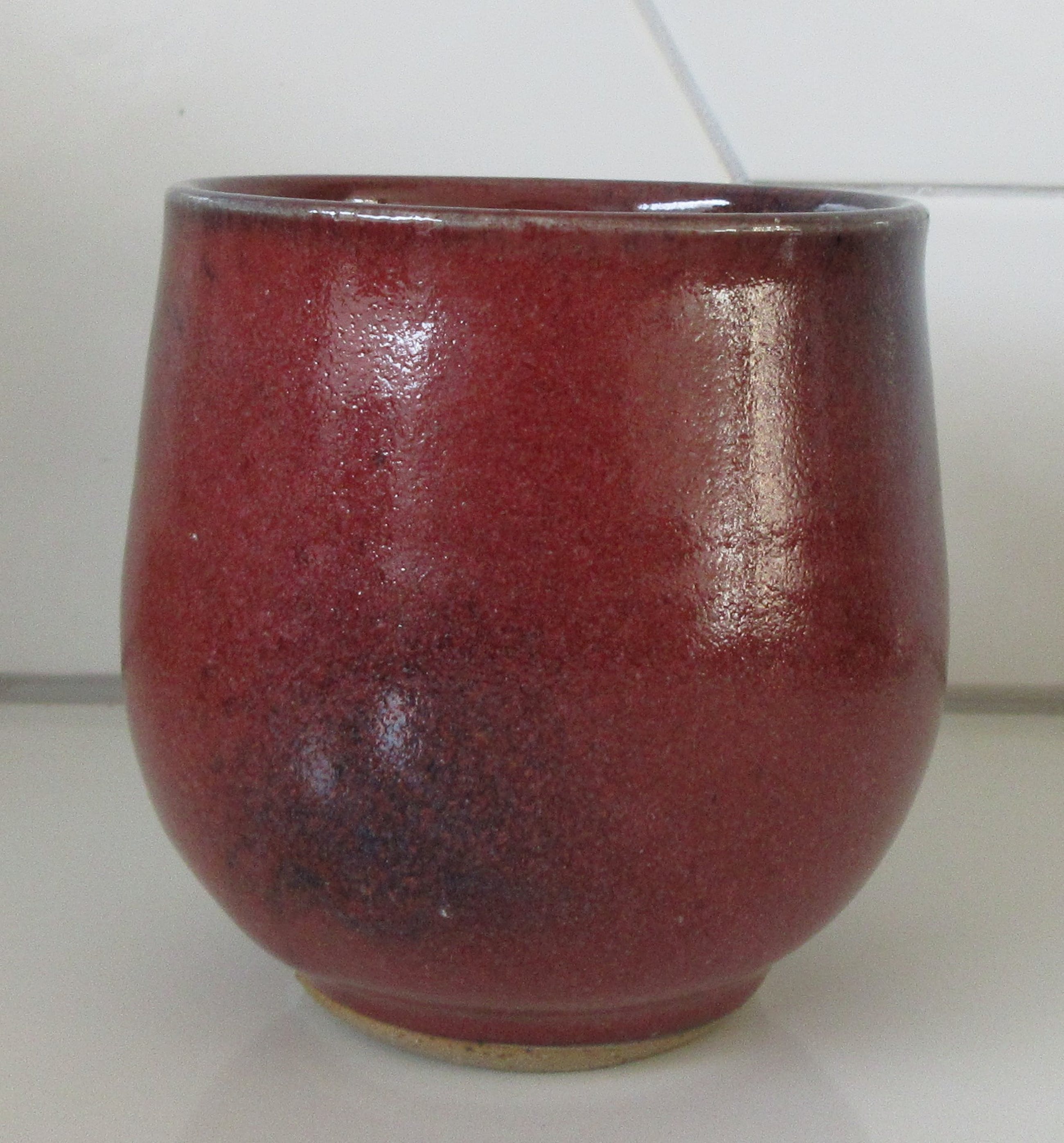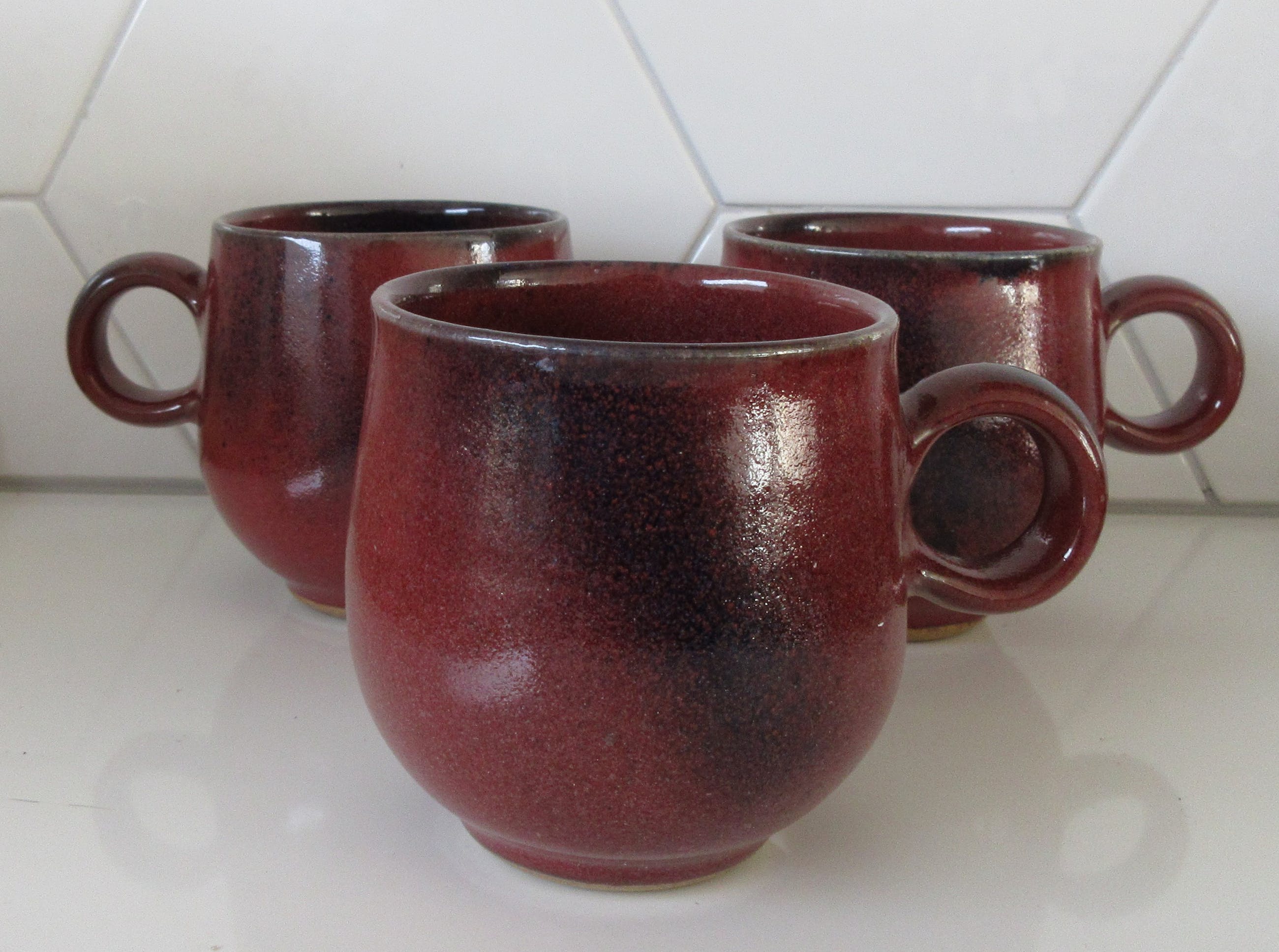 Drie steengoed koffiebekers met Sang de Boeuf glazuur gesigneerd HSMP. Kermiast of kunstenaar onbekend. Alle drie de mokken zijn in prima conditie.