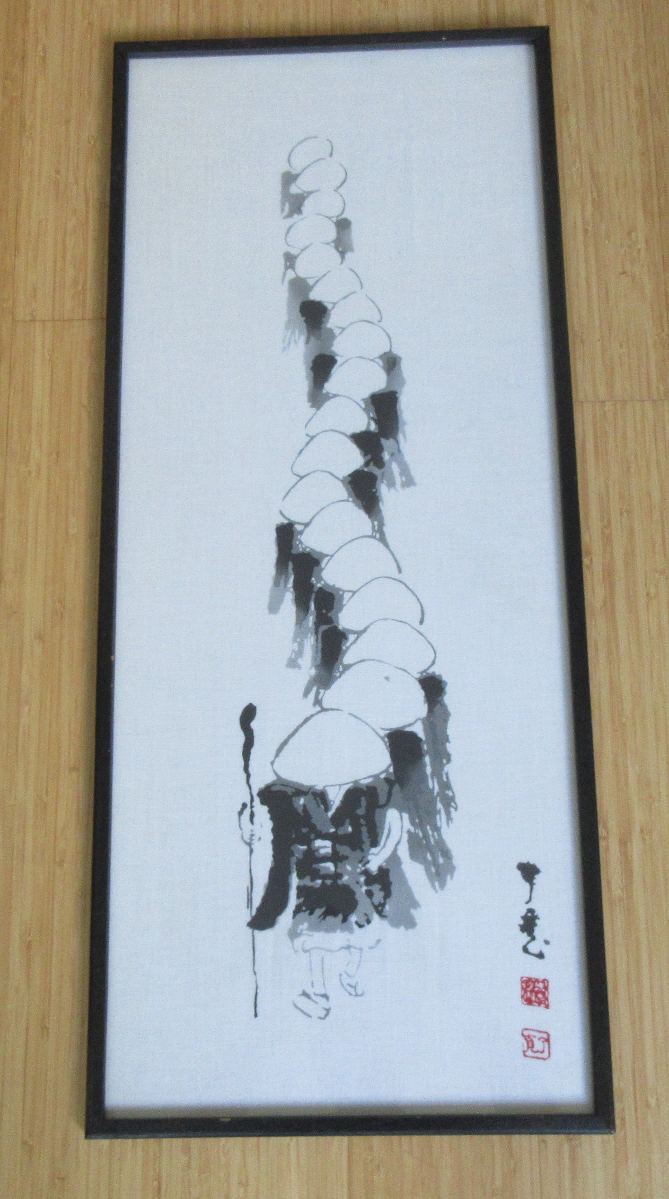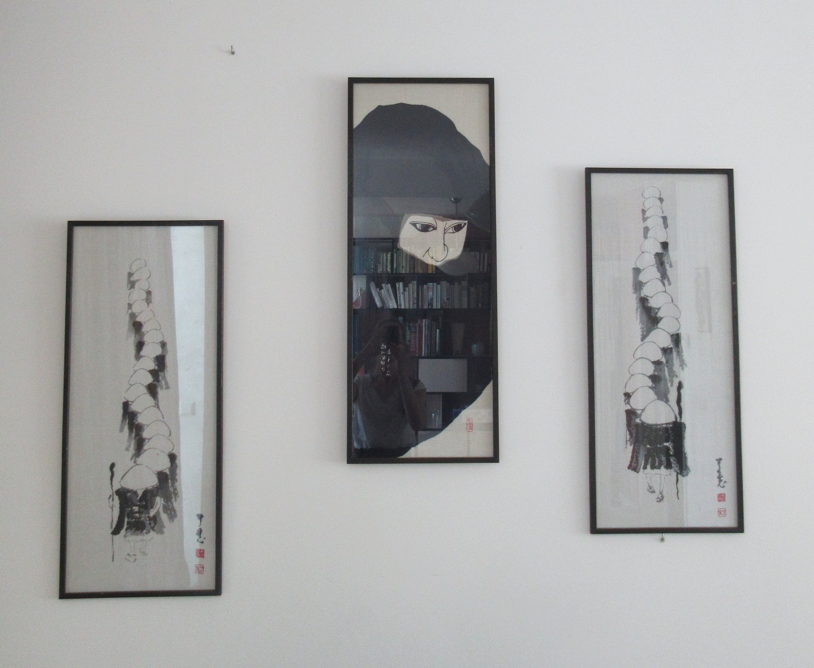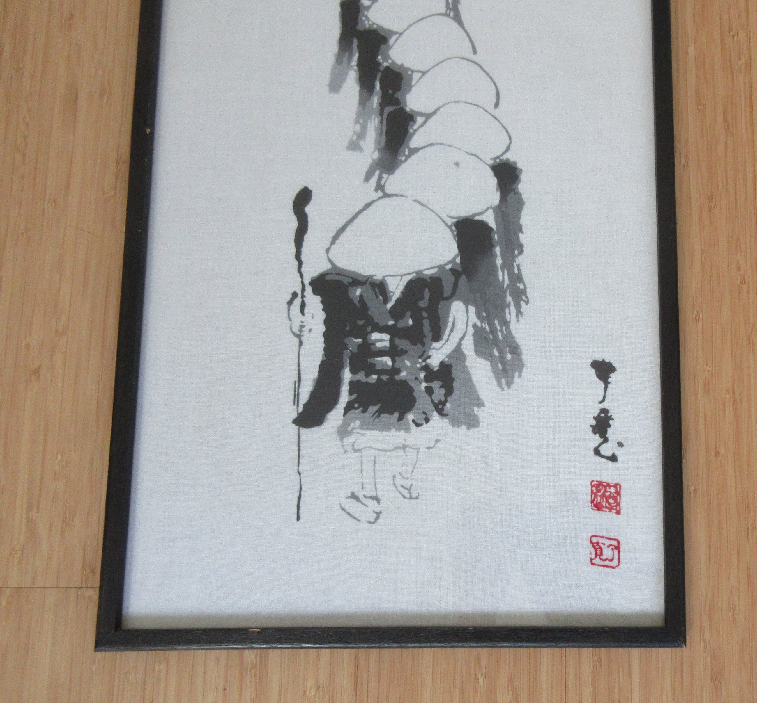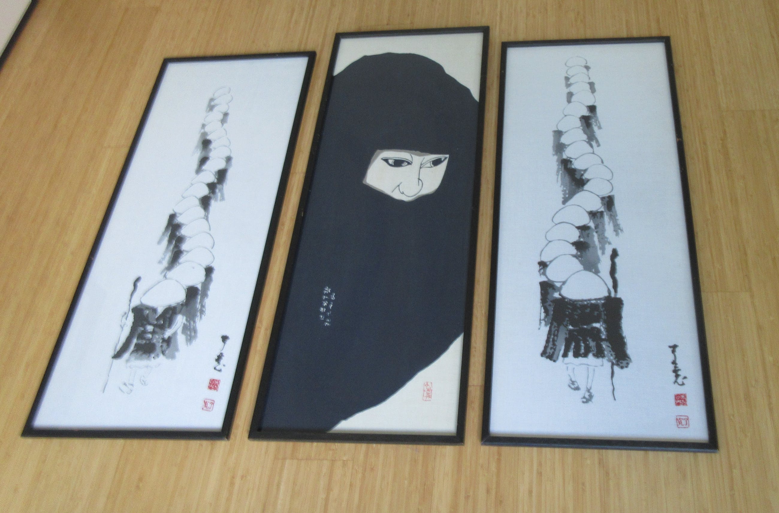 Een Japans drieluik van zijde schilderijen van figuren mogelijk monniken lopend met een stok (1e en 3e werk) en van een gesluierde vrouwengezicht (middelste werk). De werken zijn abstract uitgevoerd, vooral het 2e werk is erg mooi vanwege het diepe blauw gebruikt is. De werken zijn voorzien van zwart gelakte houten lijsten en een glazen plaat. Alle drie de werken zijn gesigneerd die van het 1e en 3e werk zijn hetzelfde. Het middelste werk is iets langer dan de andere twee en is ook in het werk gesigneerd. Helaas is de kunstenaar voor mij onbekend.