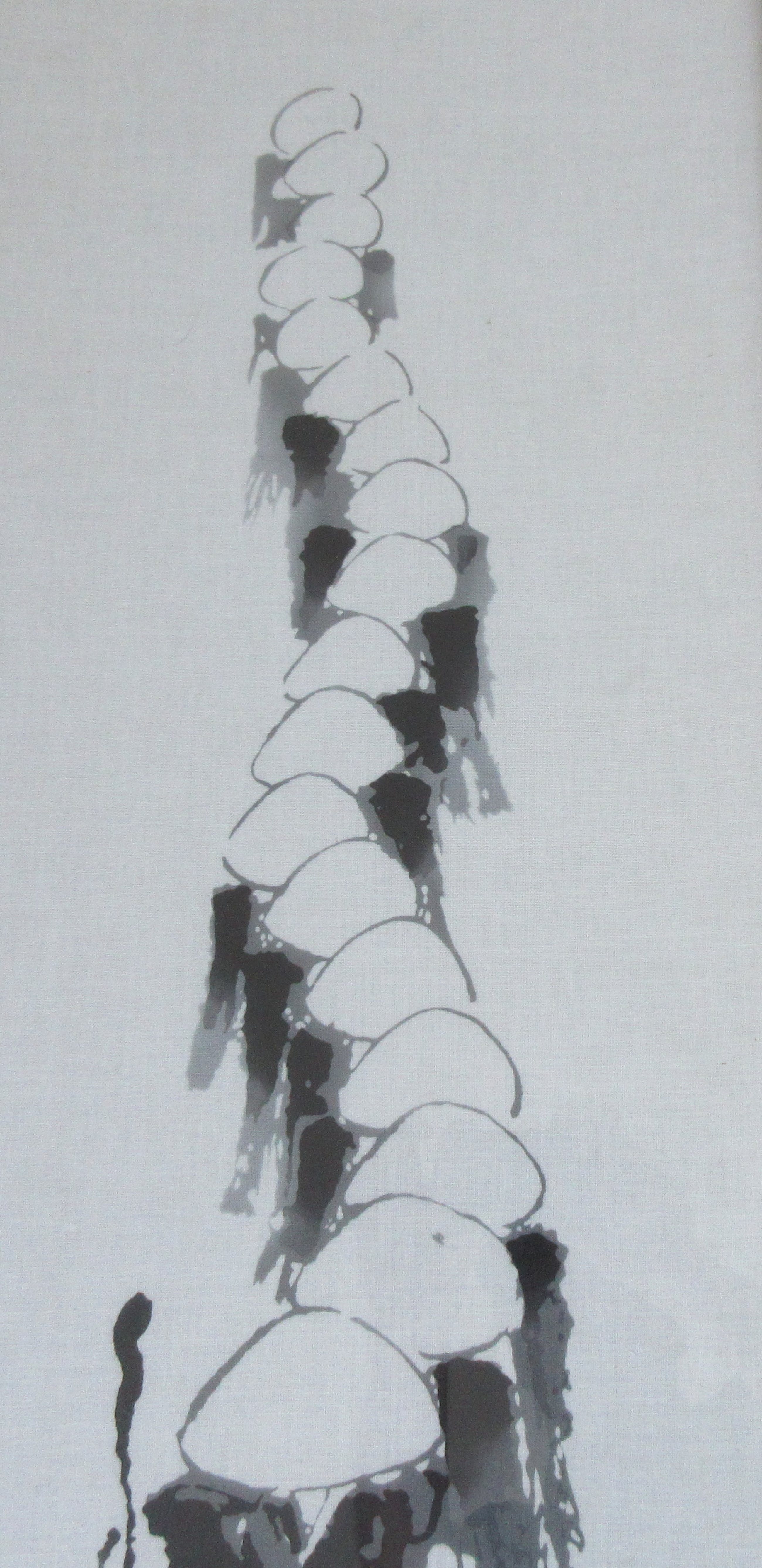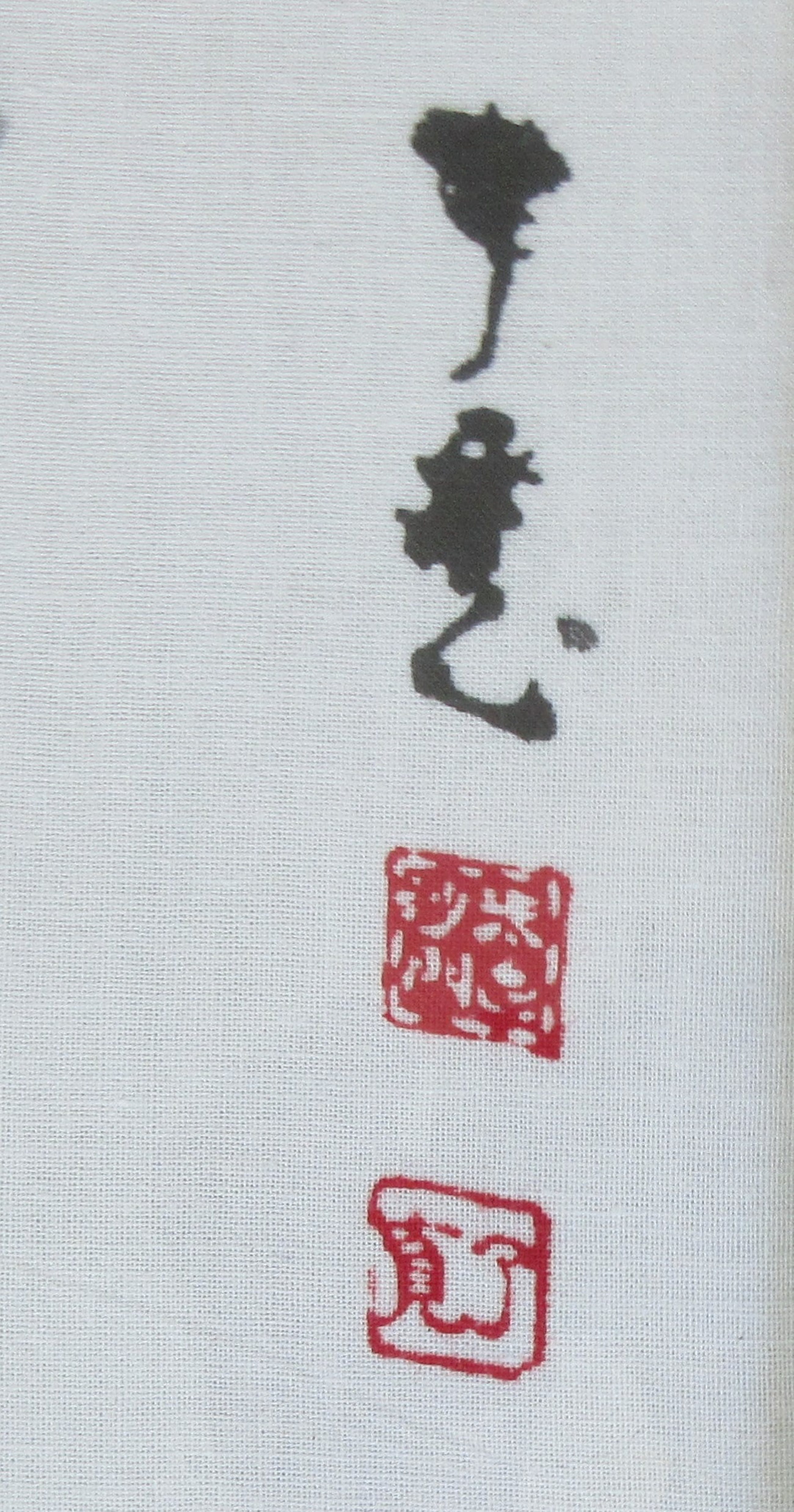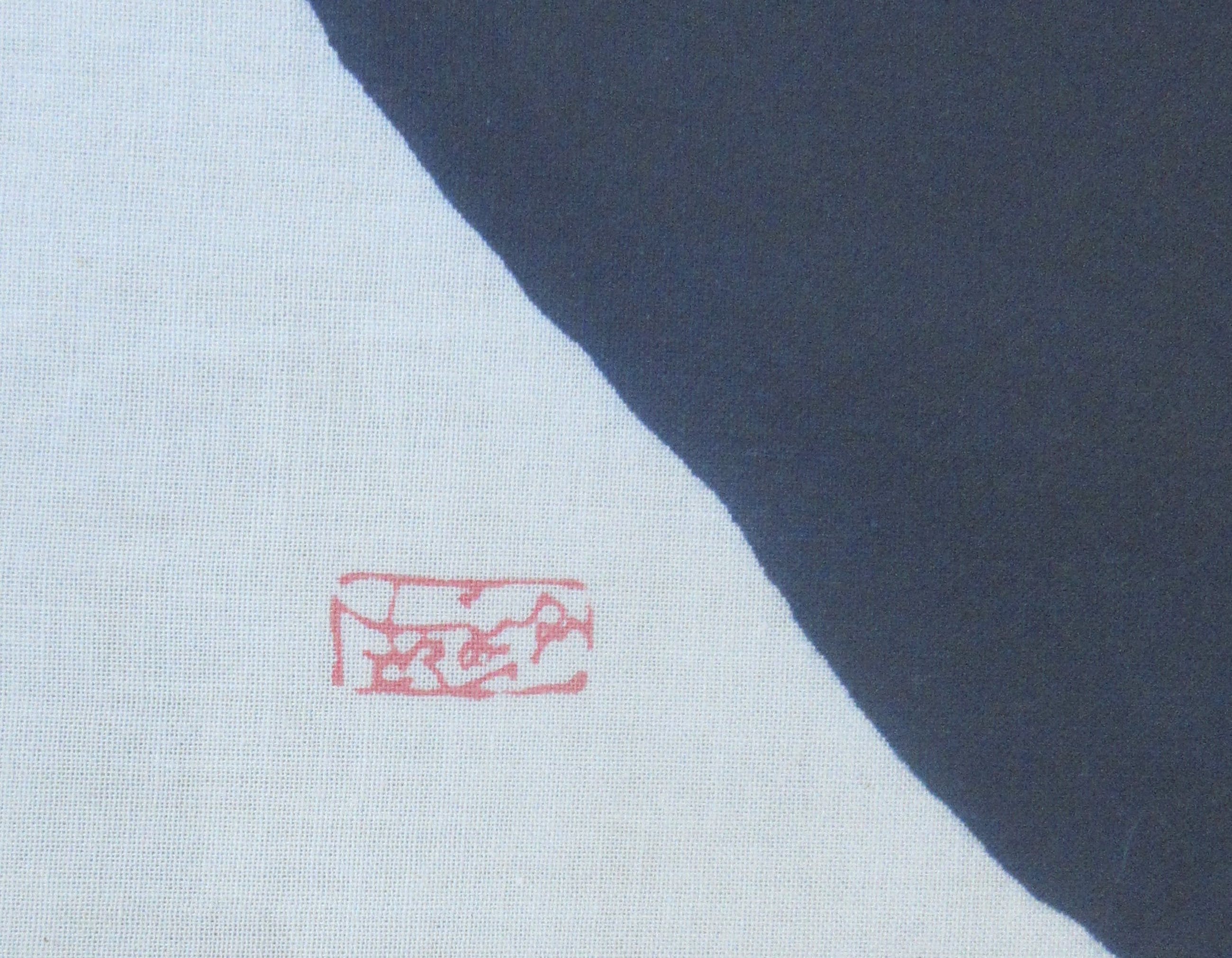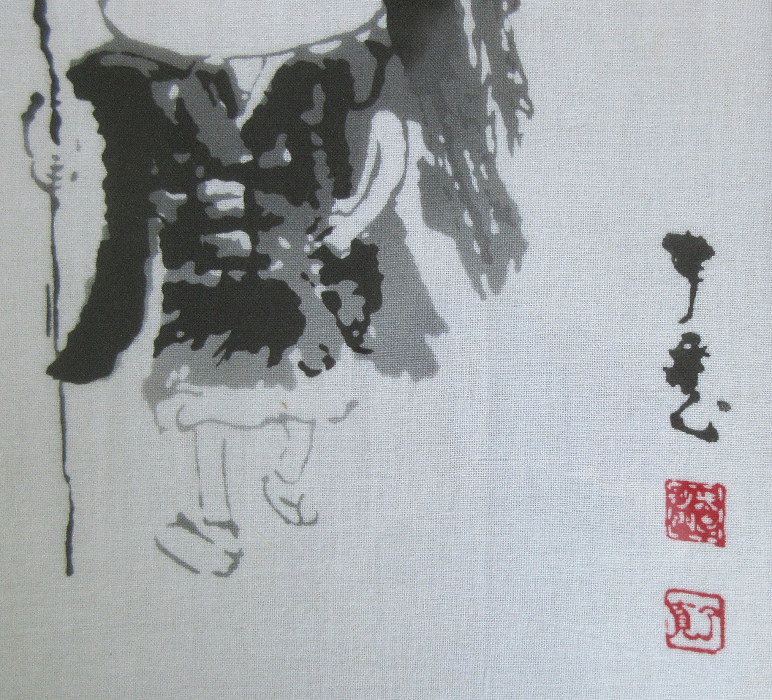 Een Japans drieluik van zijde schilderijen van figuren mogelijk monniken lopend met een stok (1e en 3e werk) en van een gesluierde vrouwengezicht (middelste werk). De werken zijn abstract uitgevoerd, vooral het 2e werk is erg mooi vanwege het diepe blauw gebruikt is. De werken zijn voorzien van zwart gelakte houten lijsten en een glazen plaat. Alle drie de werken zijn gesigneerd die van het 1e en 3e werk zijn hetzelfde. Het middelste werk is iets langer dan de andere twee en is ook in het werk gesigneerd. Helaas is de kunstenaar voor mij onbekend.