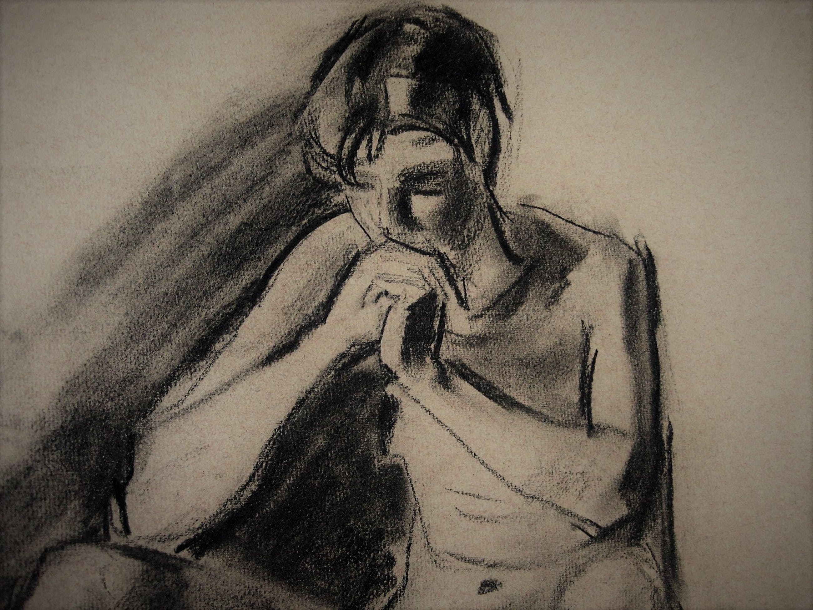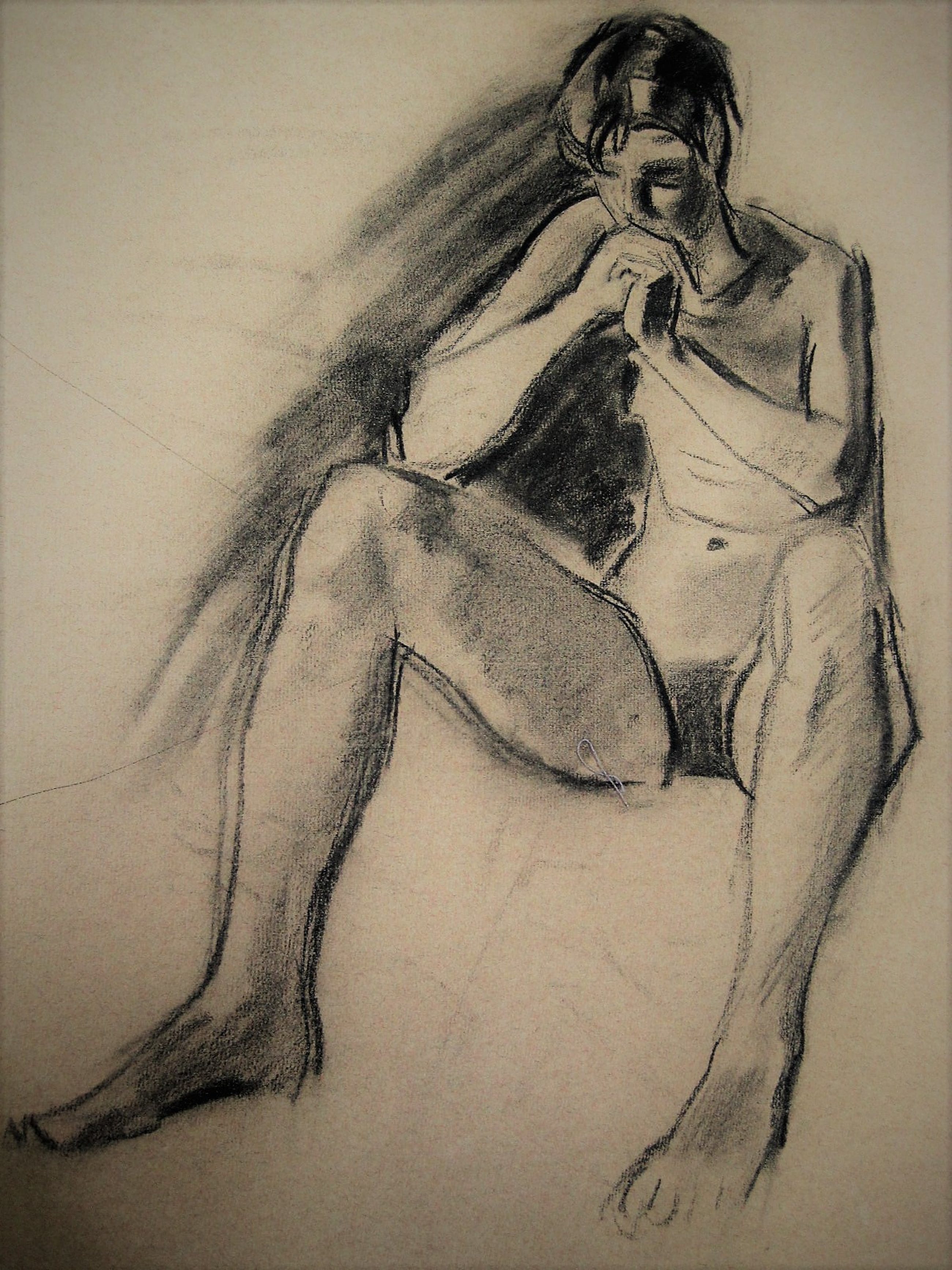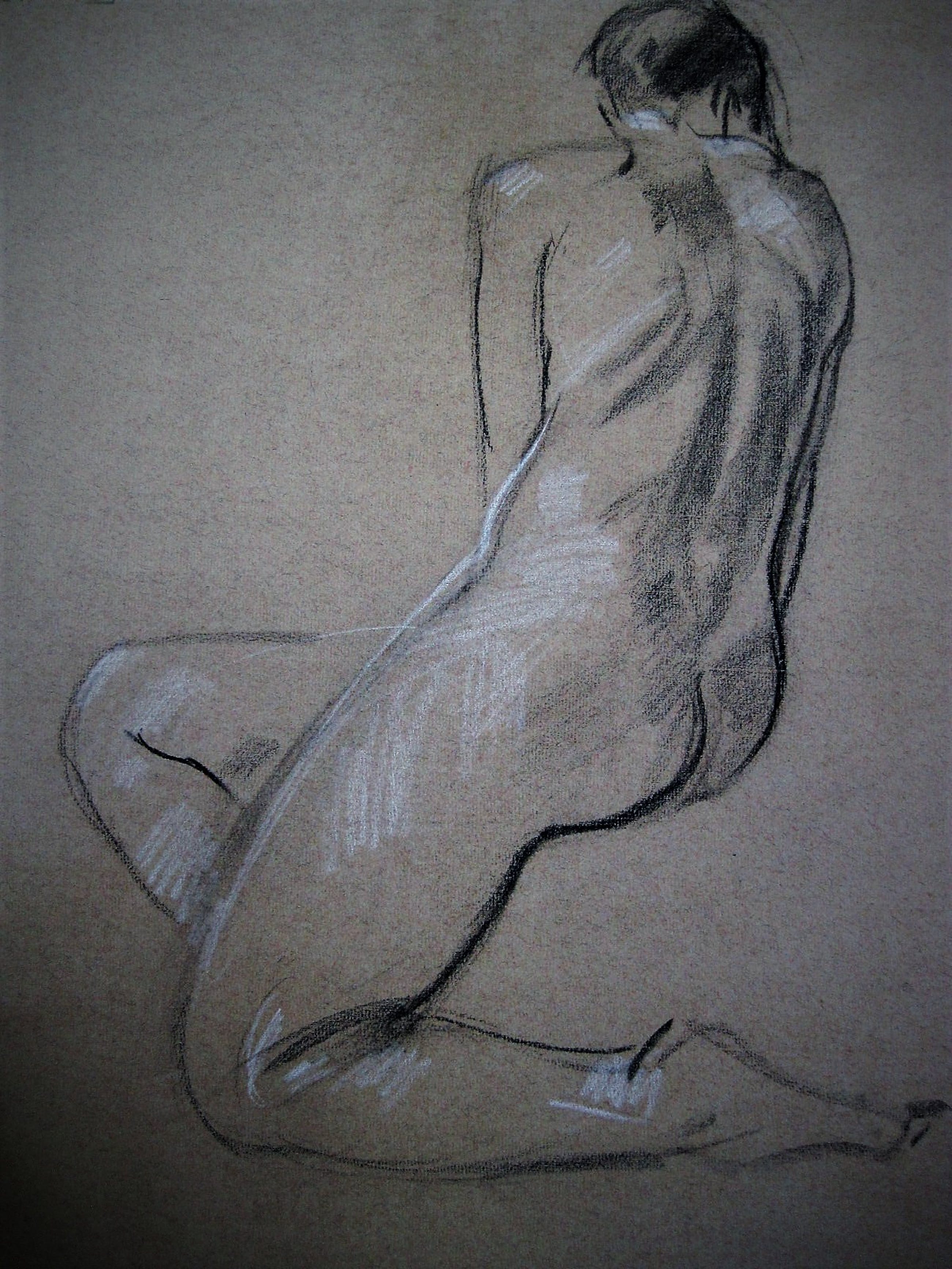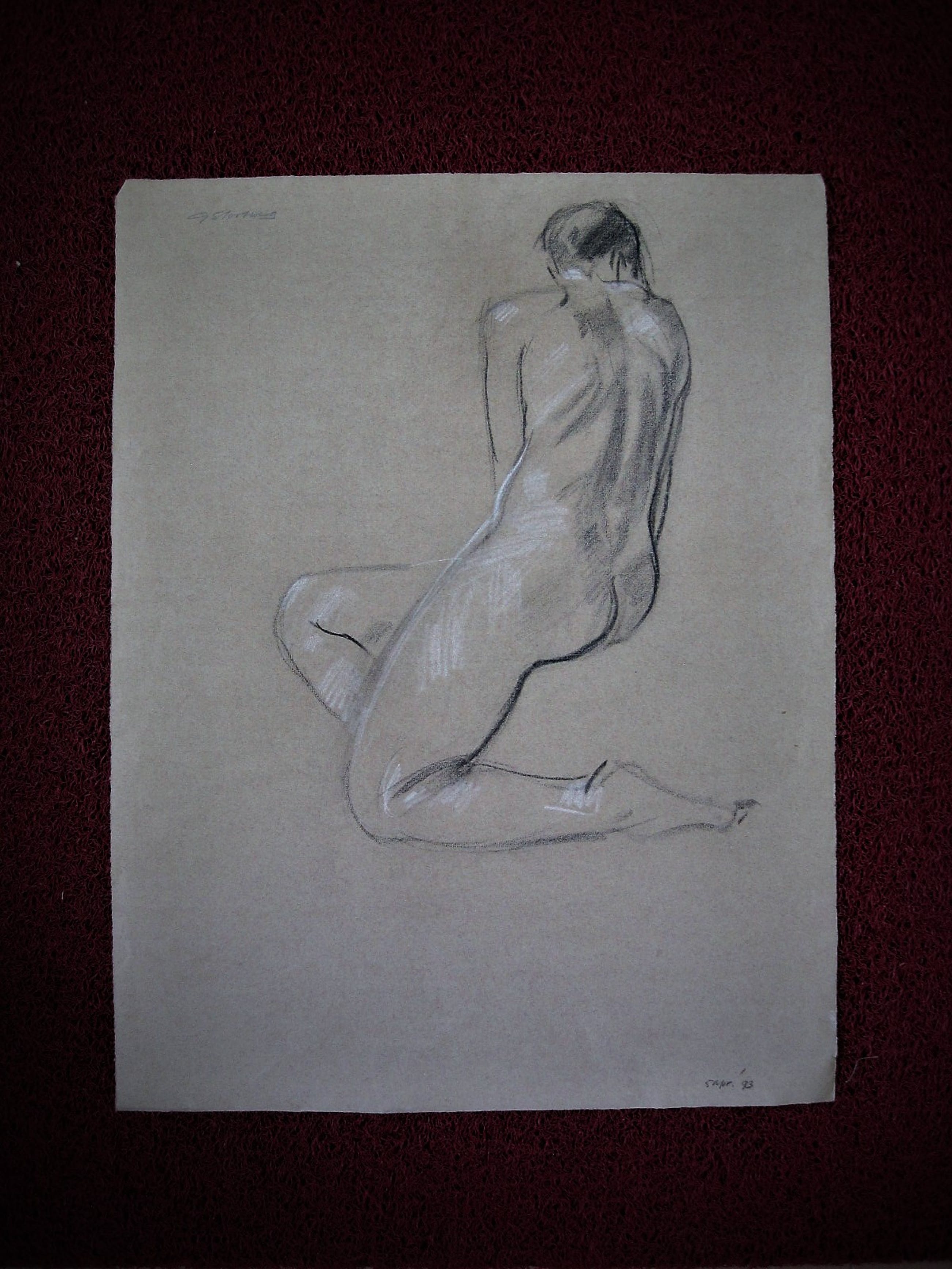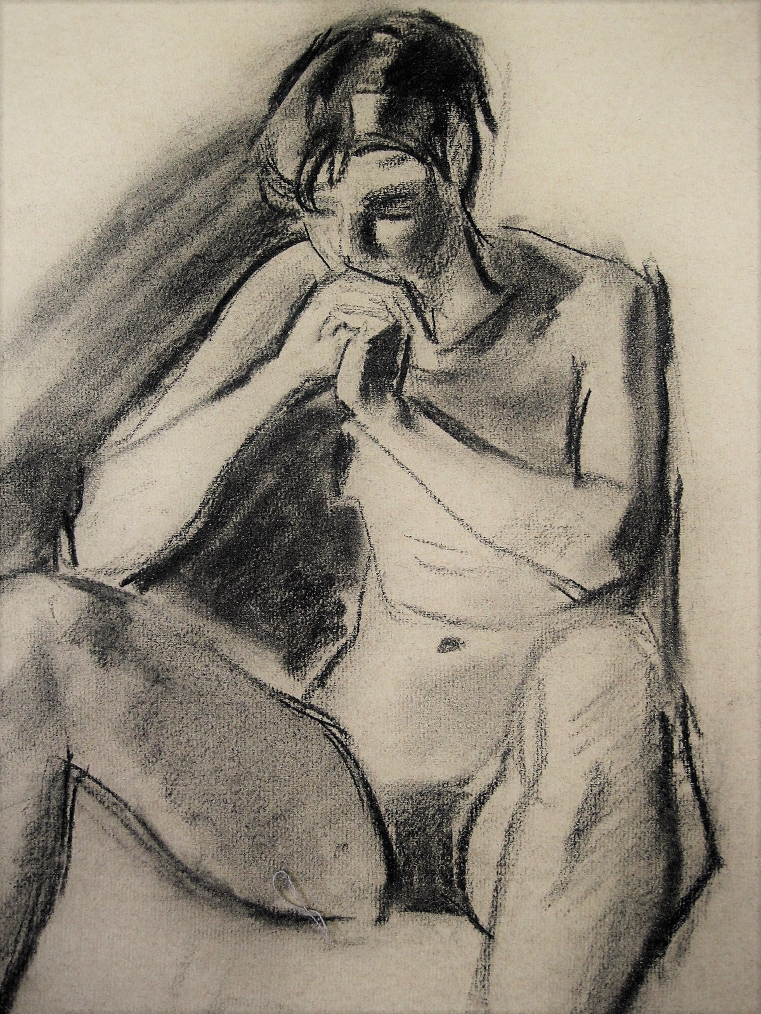 Fraaie, grote en dubbele houtskooltekening opgehoogd met wit (zowel aan voor als aan achterzijde) van een zittend vrouwelijk naakt. Gesigneerd Slootweg.