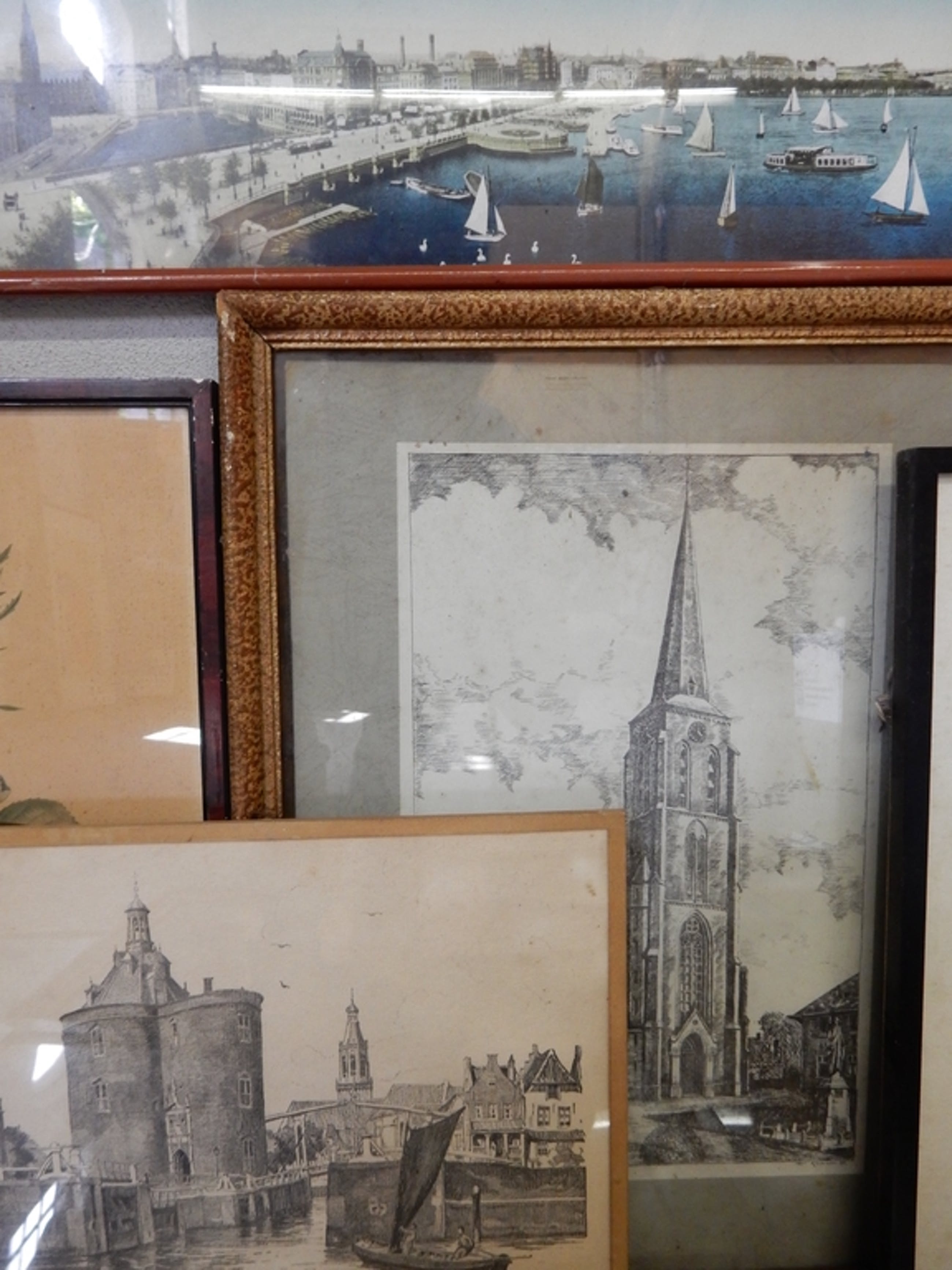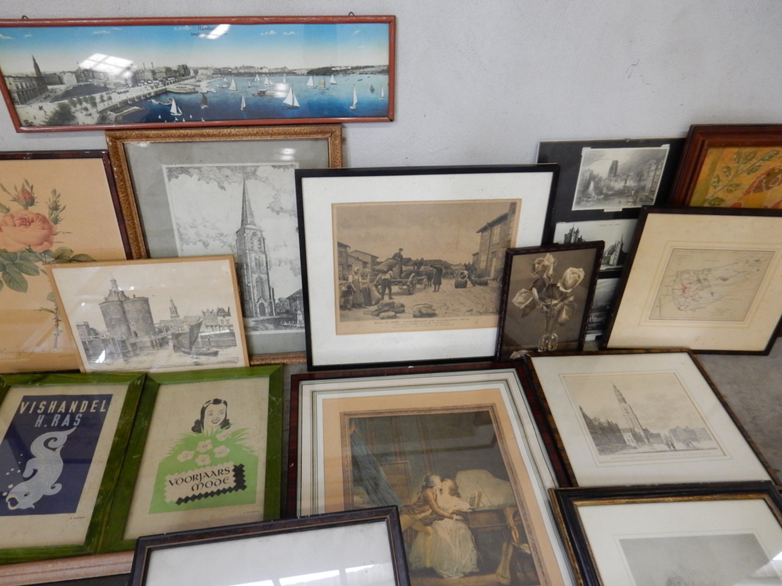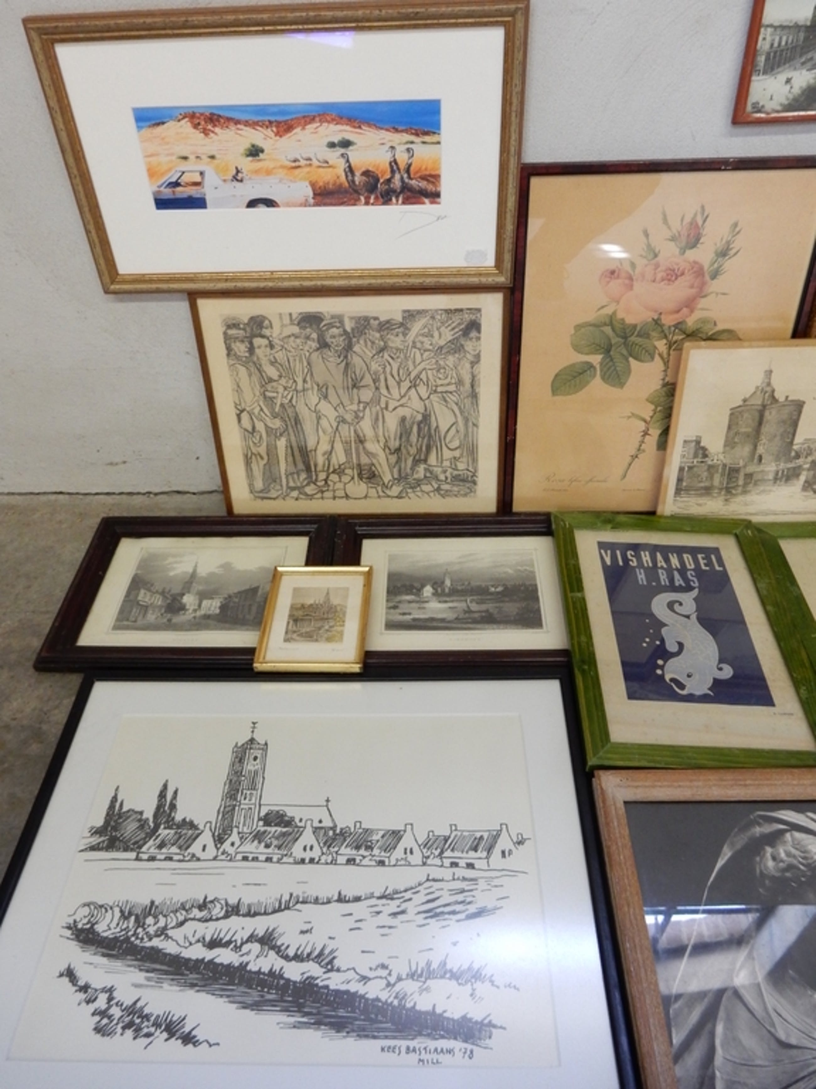 O.a.: oud landkaartje Boekel, 19e eeuwse staalgravure met voorstelling van een vrouw, diverse kerken (w.o. Kees Bastiaans), panoramaprent Hamburg (rond 1910), met potlood gesigneerde moderne litho, 2 vroeg 20e eeuwse reclameprenten en gezicht op Amsterdam.
