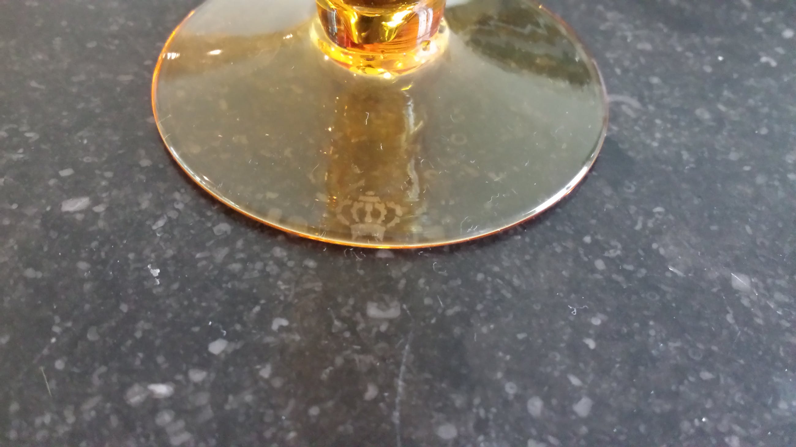 4 Duitse Roemer gegraveerde wijnglazen met vergulde stam, in perfect staat, nauwelijks gebruikt. Past goed bij dessert wijn, met een stempel van een kroon.