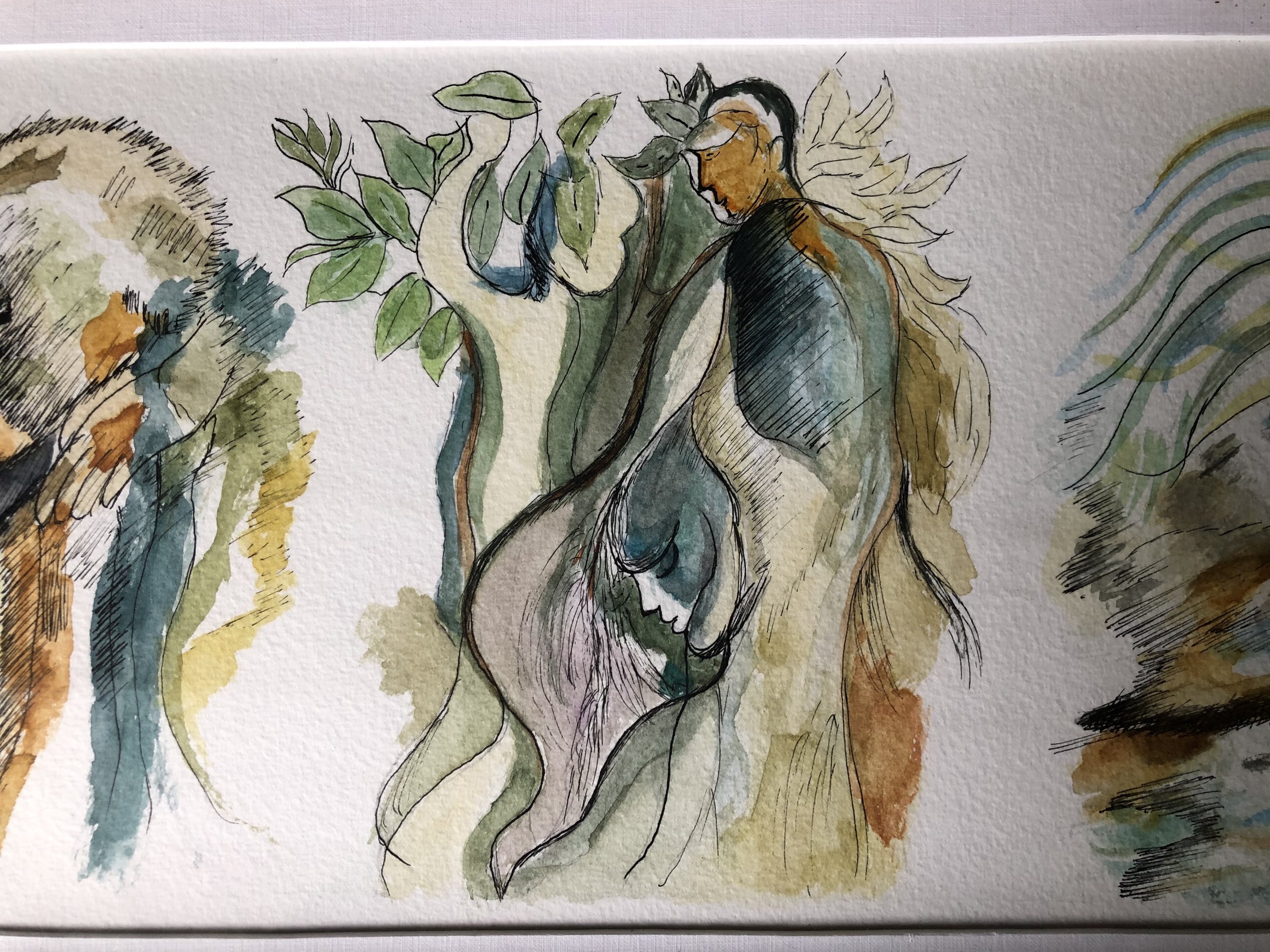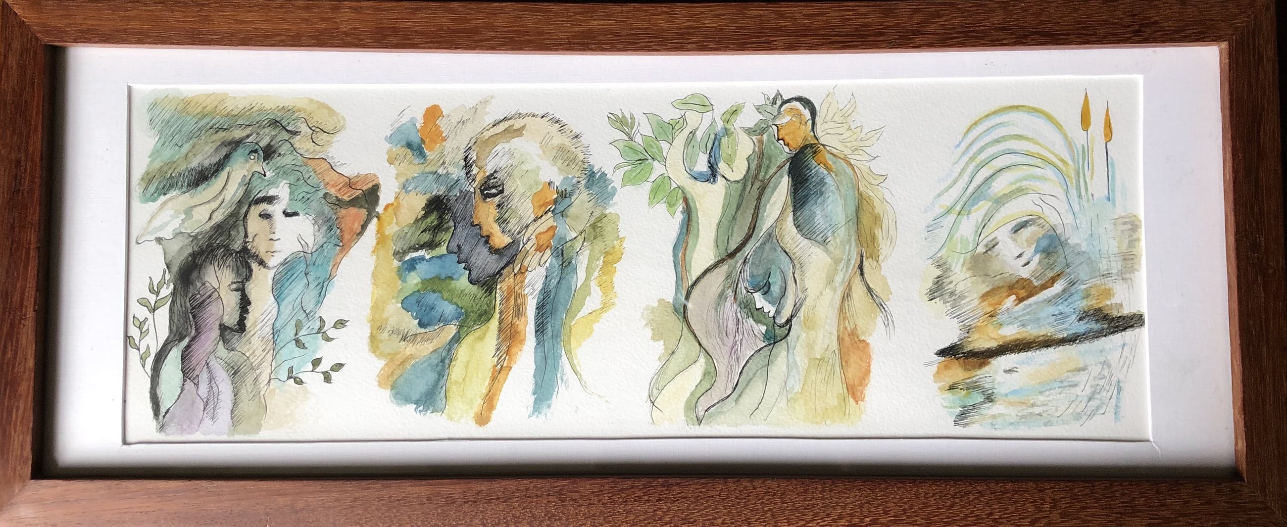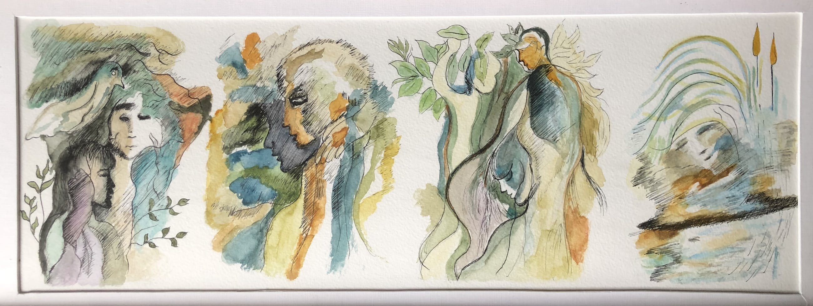Prachtige aquarel van verschillende figuren die "één zijn met de natuur".